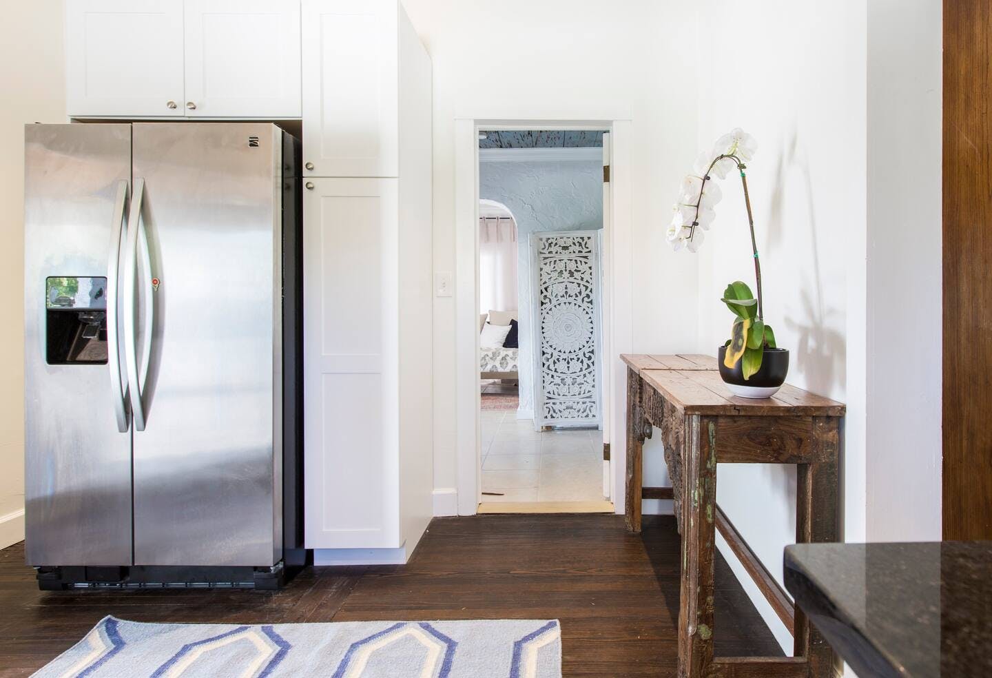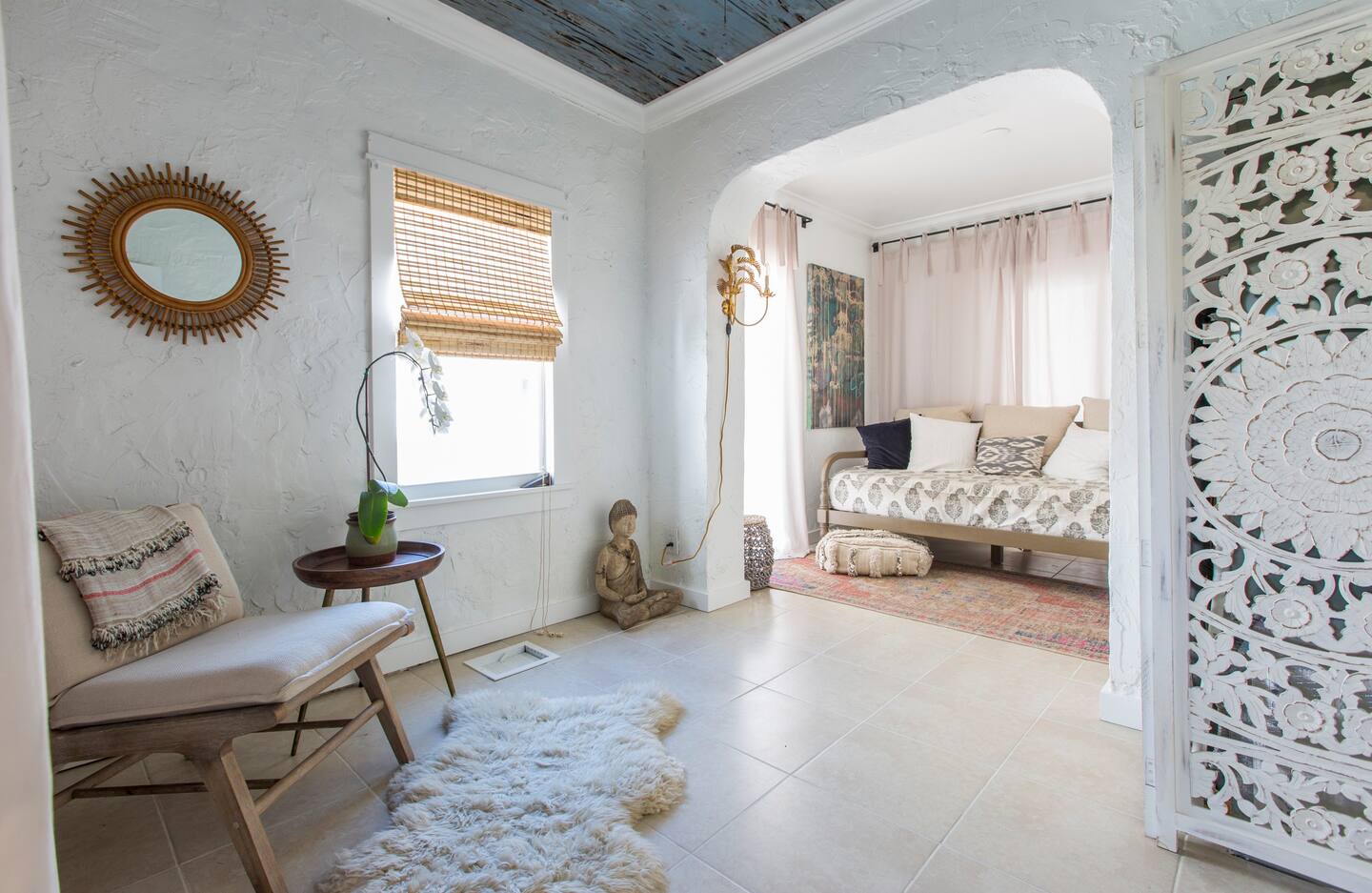 The "main house" consists of a living room with an original "Mizner" style fireplace, foyer with original pecky cypress ceilings, a bedroom, staircase, dining room a