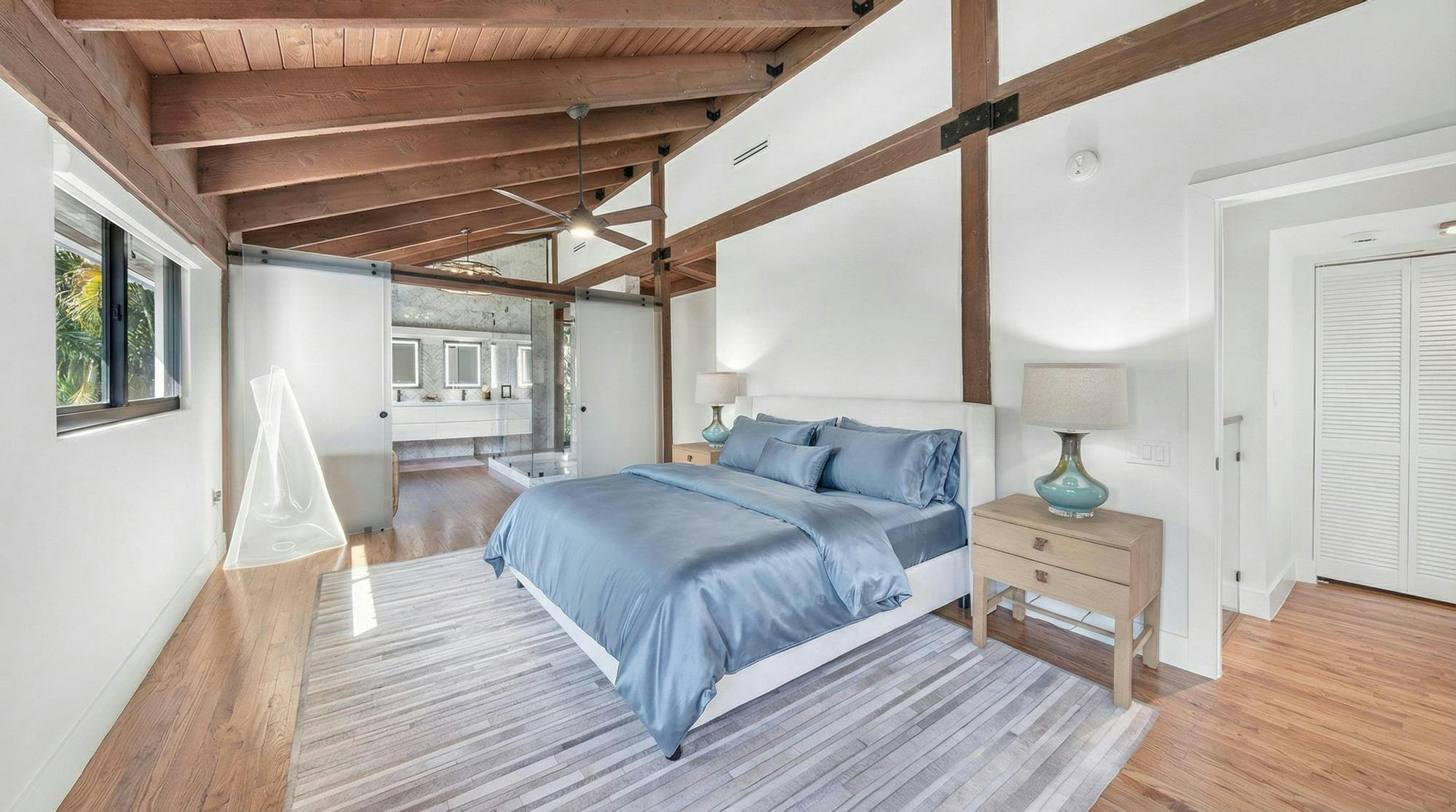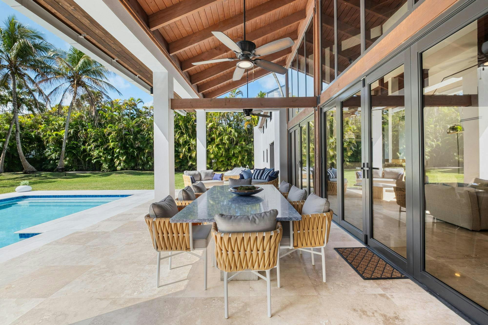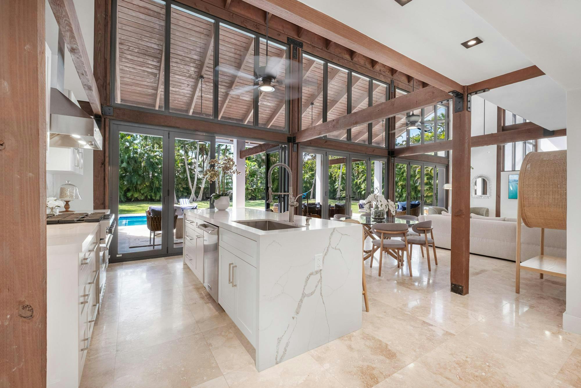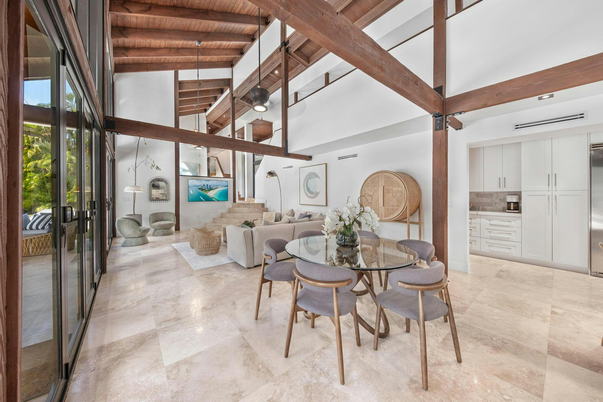 Las Palmas is one of Miami’s most photographable private residences, now available for productions. Set on half an acre of lush tropical landscape on a quiet dead-end street, this mid-century modern home offers privacy, natural light, and seamless indoor-outdoor flow. Soaring ceilings, glass walls, and an open living area overlook a resort-style pool framed by palms. With three bedrooms, a loft, den, and a spa-like primary suite, it’s a serene, cinematic retreat for modern productions.