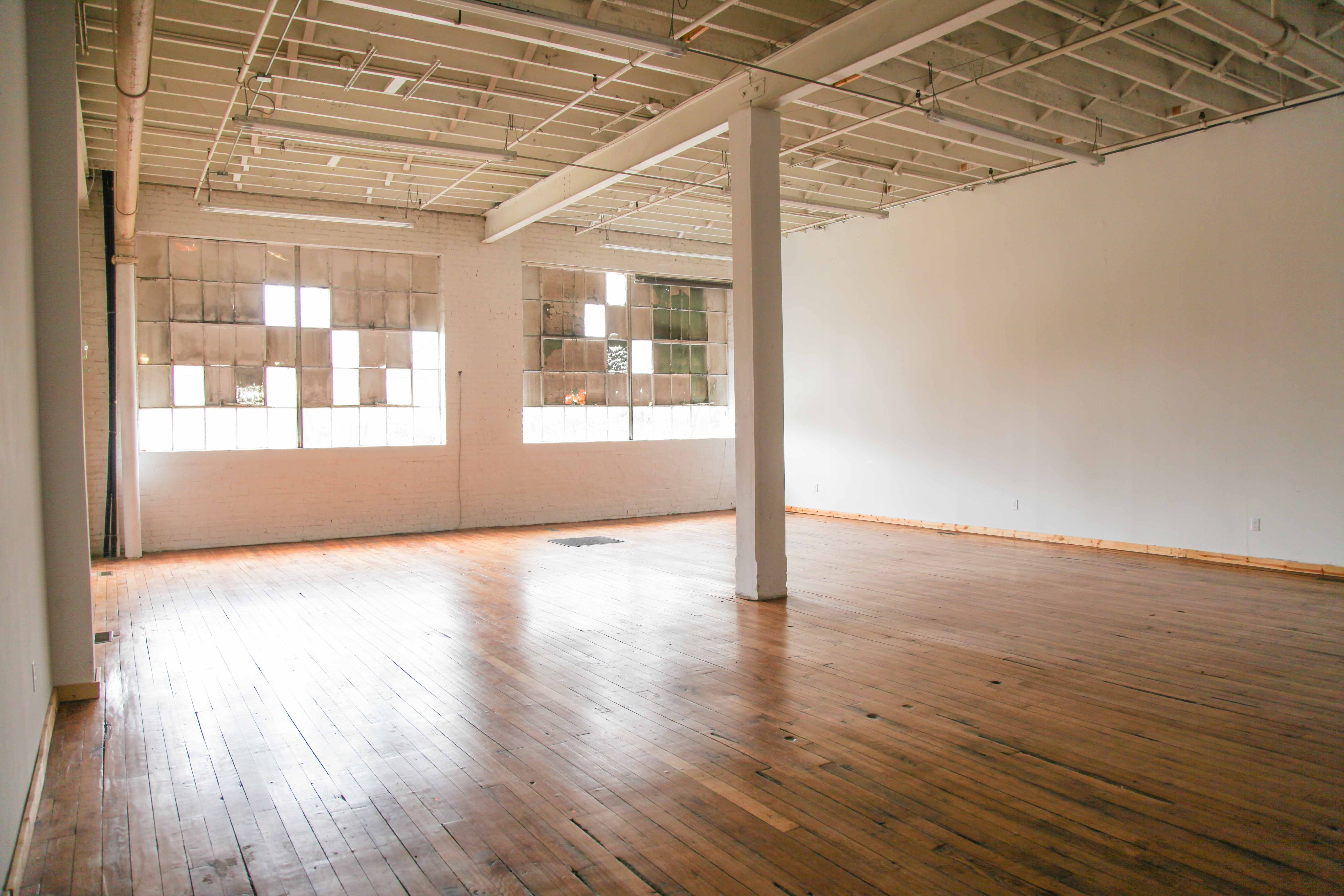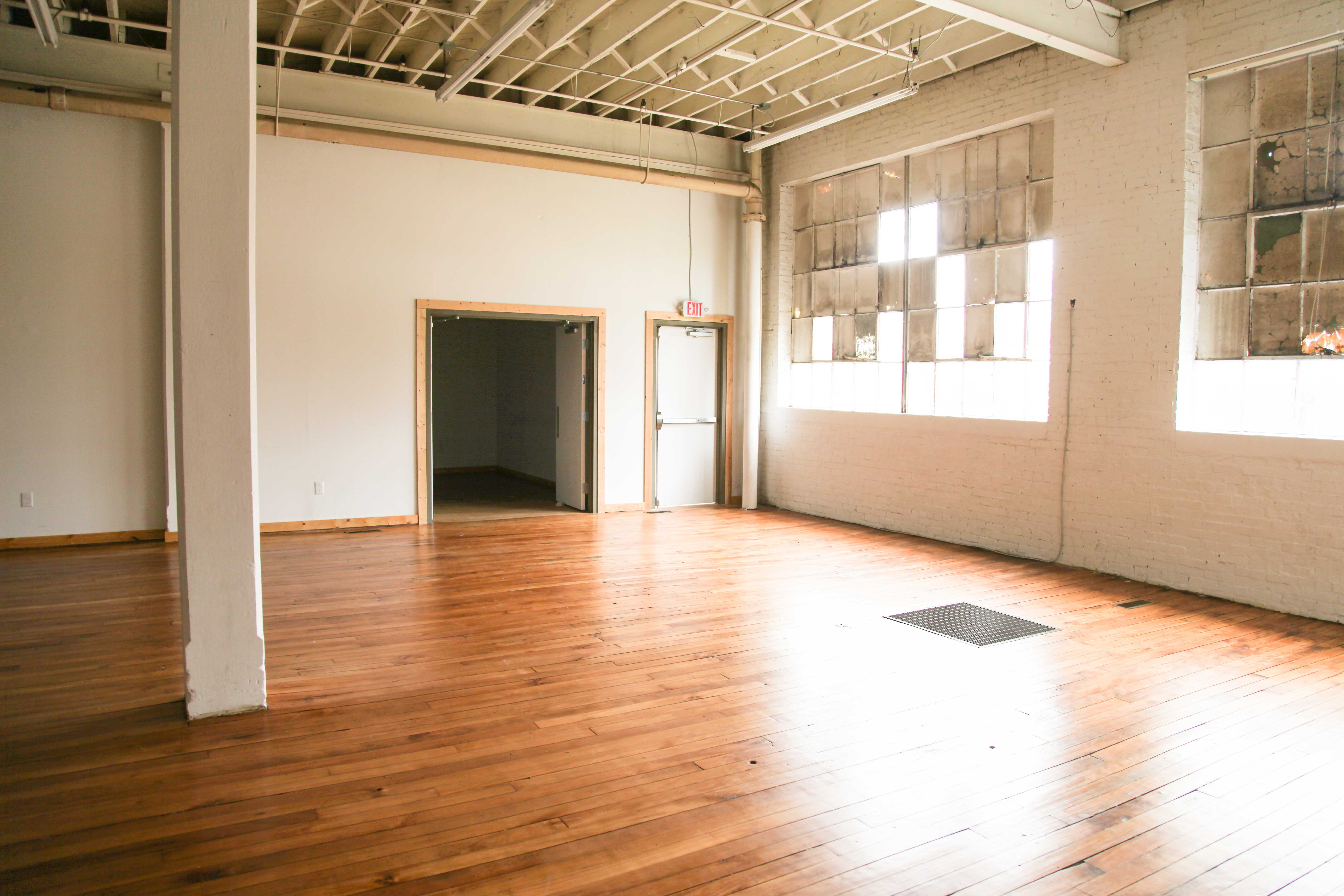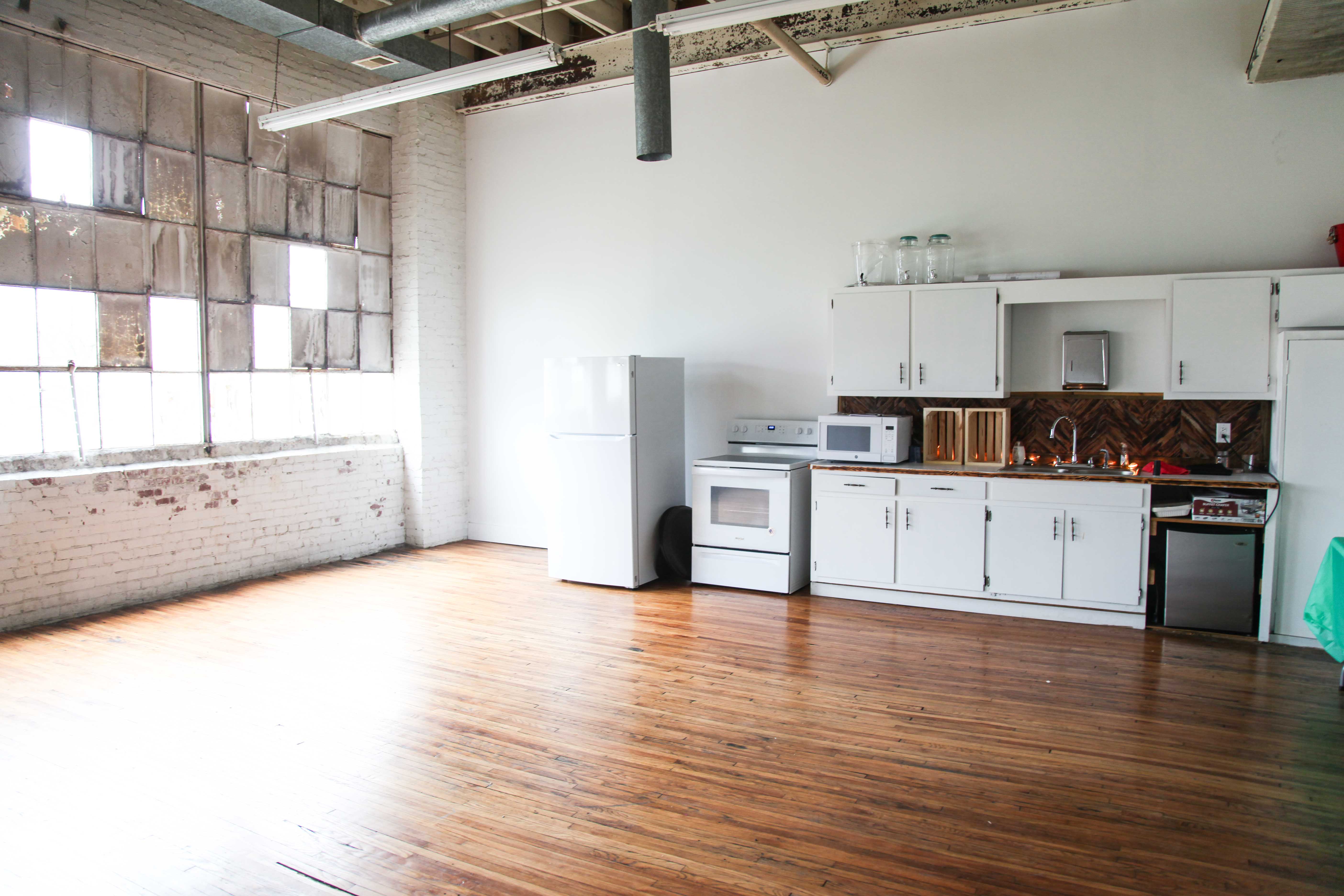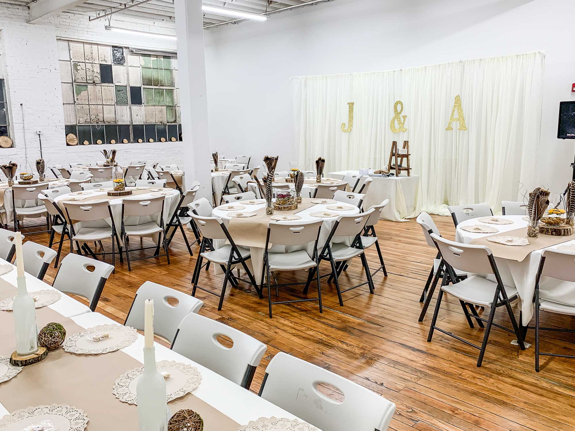 This bright and beautiful event space features rustic industrial elements, gorgeous wood floors, white brick, high ceilings, and large windows letting in tons of natural light!