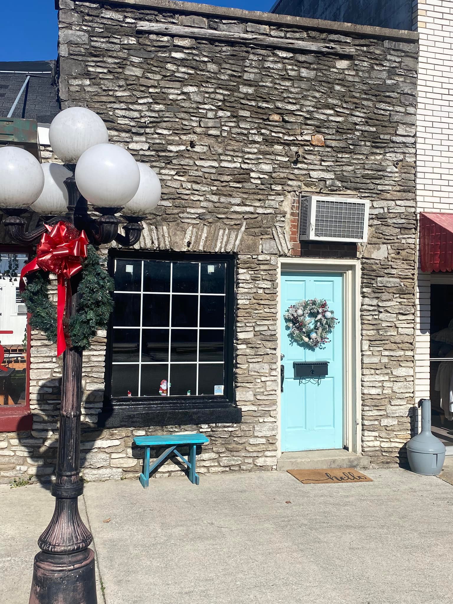 This cozy cafe with amazing exterior stonework features rustic decor and a warm, welcoming vibe throughout the space!