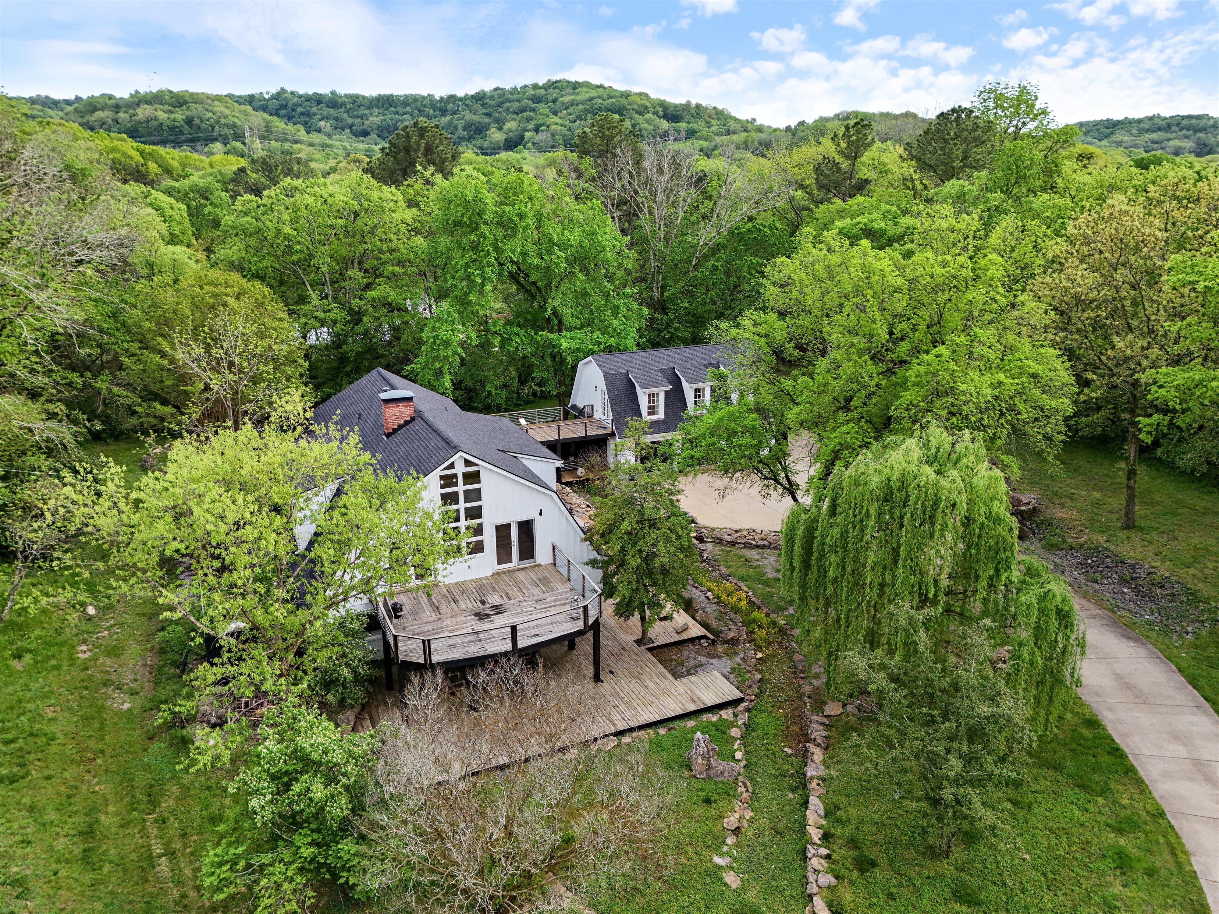Private and surrounded by woods, this large home and carriage house duo is a dream! Featuring almost 5,000 square feet of great indoor space, cozy decor, vaulted ceilings and plenty of property to explore, this amazing location could be the perfect backdrop for your next creative project!