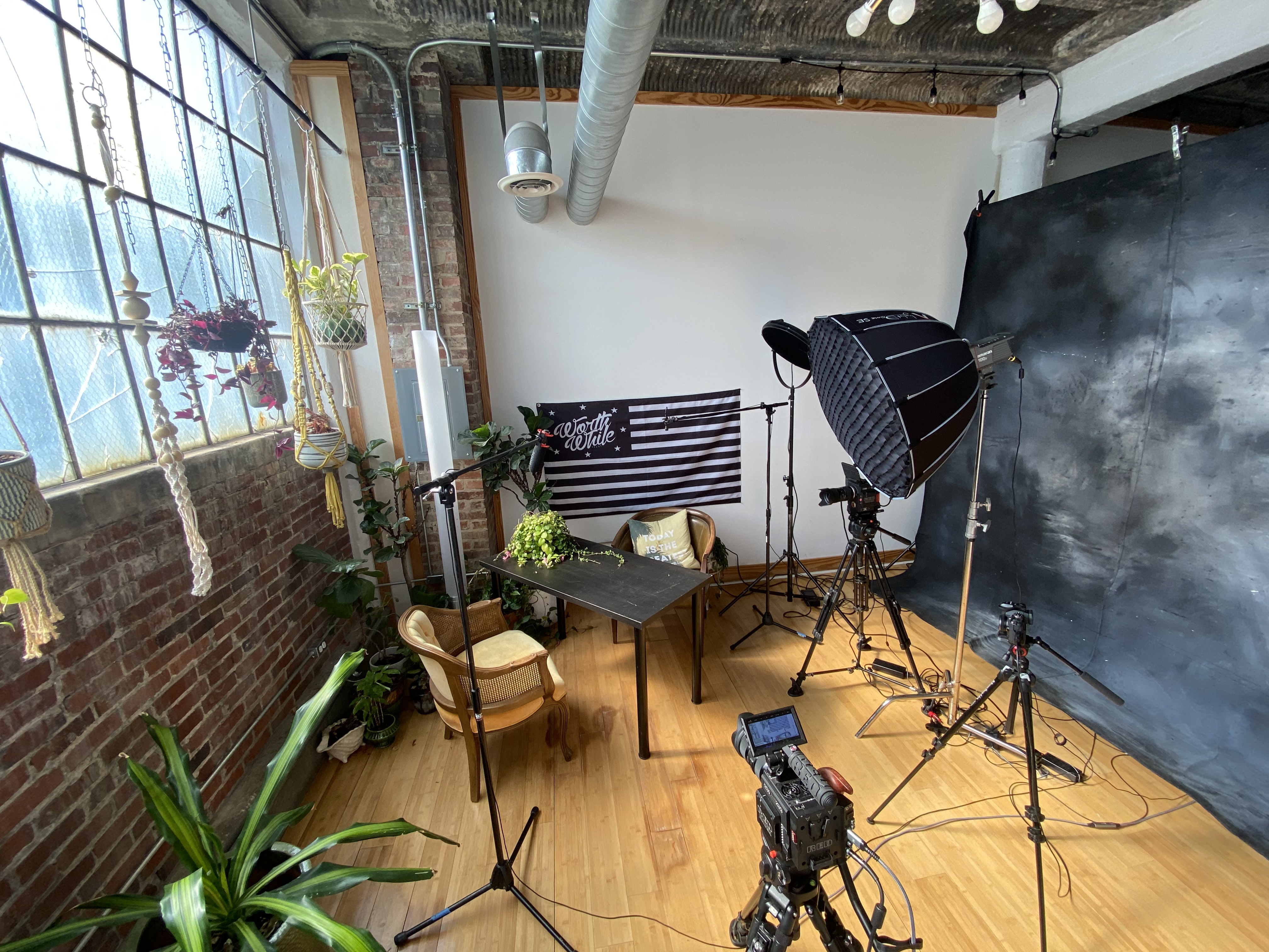 Studio location in the Columbia Arts Building with wonderful natural light and exposed brick. Great for photography and video. Can be set up for professional live stream or zoom call. Backdrops, lighting, gear and personnel available for a fee, just reach out and let us know what you are needing. Windows can be blocked for controlled lighting as well.