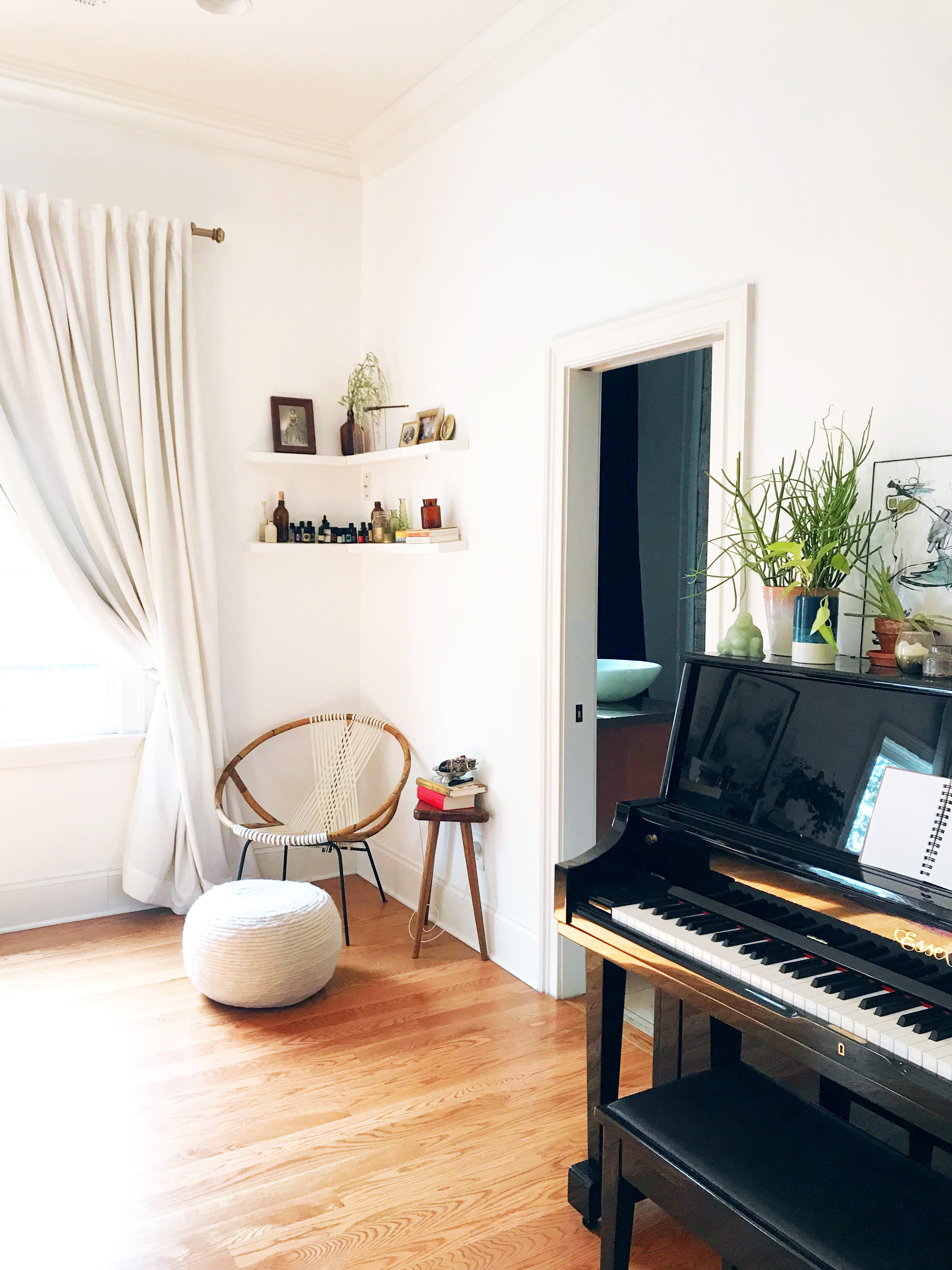 Brand-new Essex upright piano, ukulele, accordion, kalimbas (finger pianos), black-painted backdrop wall, built-in sound system throughout house, (non-functioning) brick fireplace in bathroom, large bathtub, hardwood floors, wrought iron canopy-style bed with white bedding, tall ceilings and windows, full kitchen.