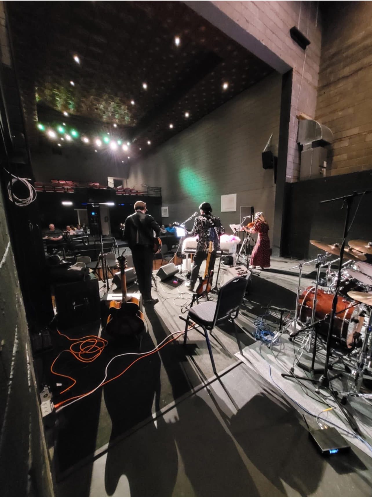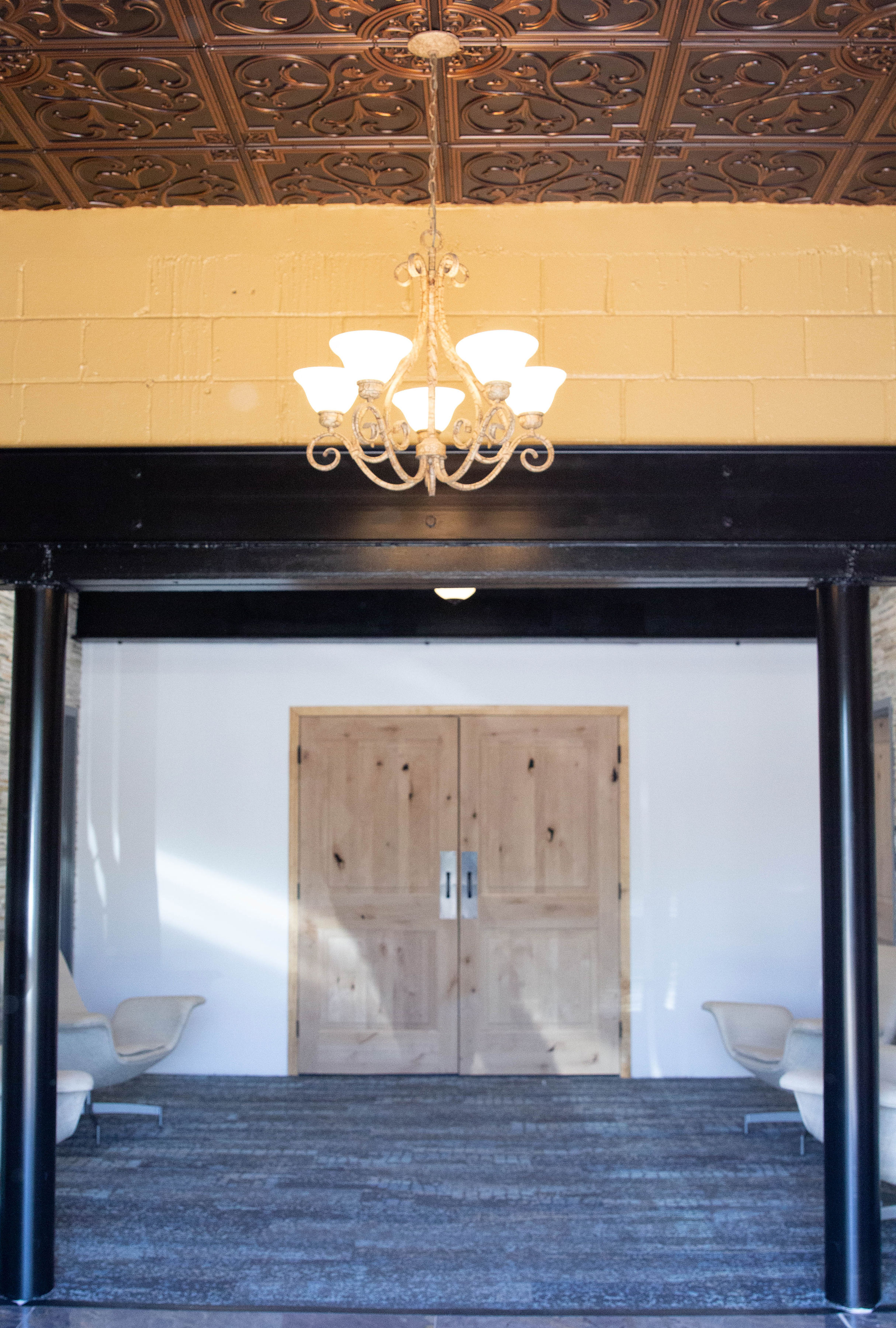 Historic movie theater converted to platforms for dinner theater or concerts. Has a stage in the front and room for up to 110 depending on rows or tables. Has dance floor in front of stage and three levels of platforms. Would be a great space to shoot a music video, album release, perform live or have a private get together. Also great for photography sessions. Has block original walls with metal ceiling and a great carpet pattern. Have a few spotlights mounted for extra stage lighting.