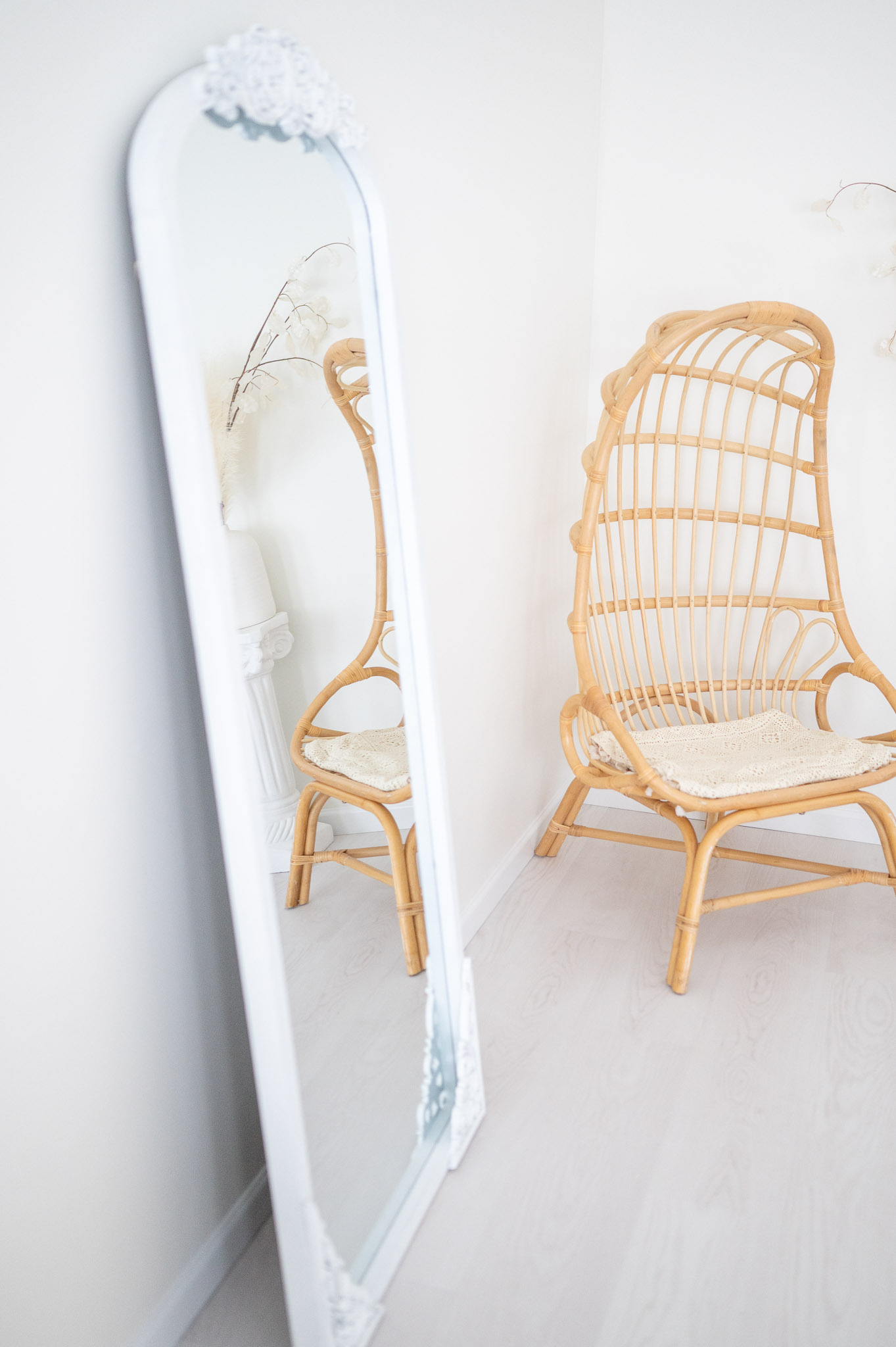 Modern couch, egg chair, mirror, posing bean bag (linens not provided), seamless backdrops, 86in PLM + Godox SL100D Daylight LED Continuous Light (available if needed)