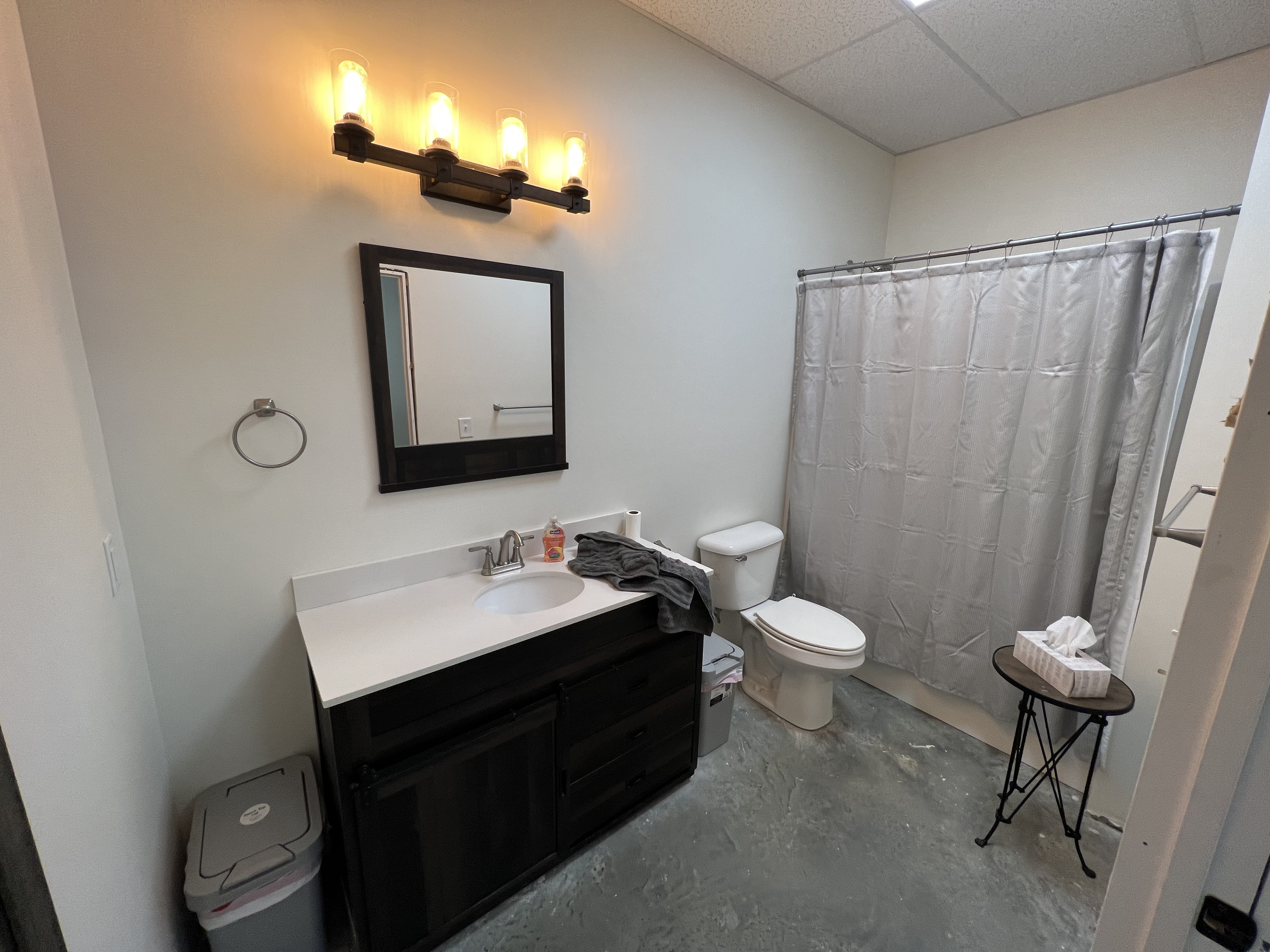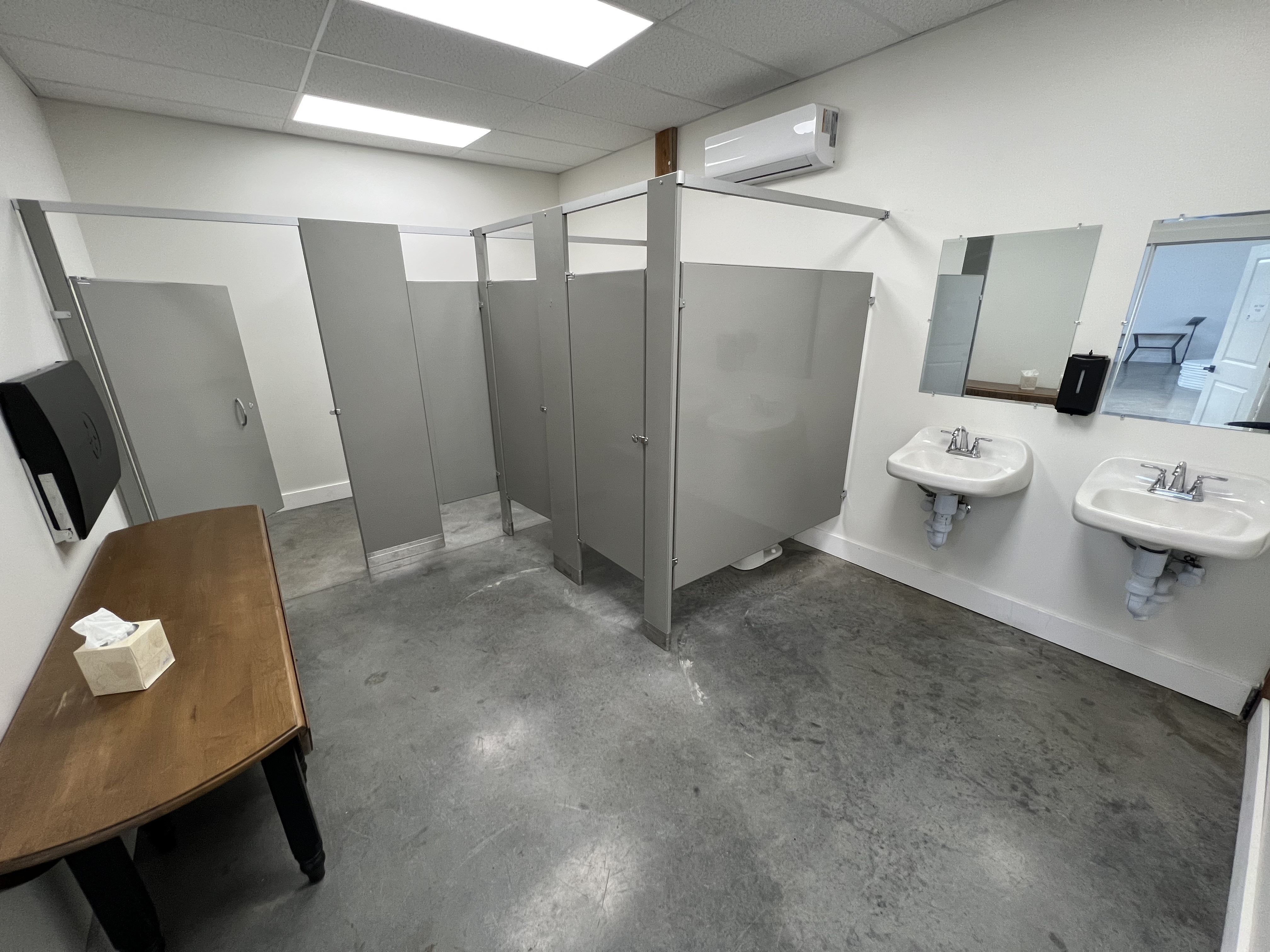 Women's Restroom has 3 stalls and 2 sinks. Men's Restroom has 2 stalls and urinal with 2 sinks. Private Bathroom has vanity, toilet and shower.