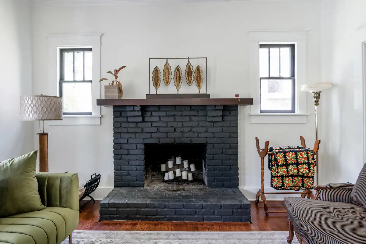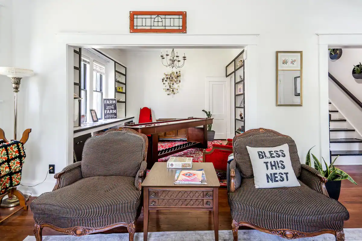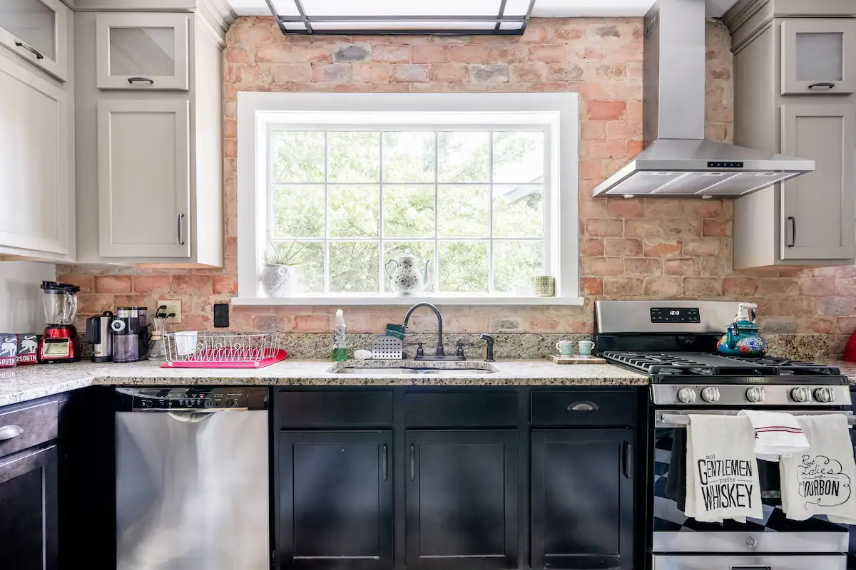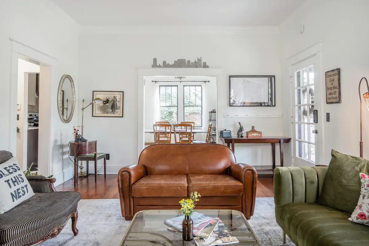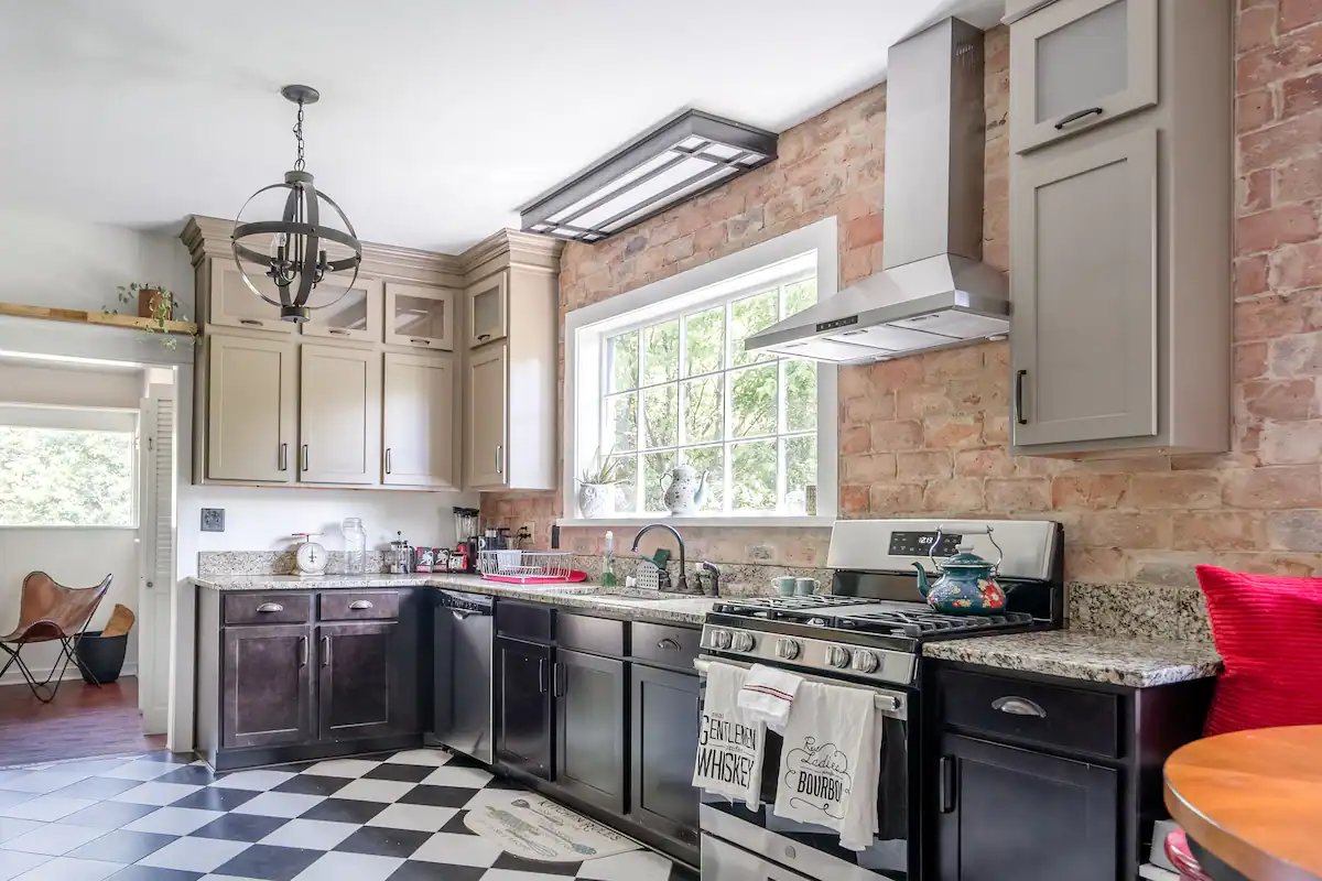 Exposed brick walls, black and white tiled kitchen floors, expressive wall paper, local and vintage art and a lush backyard complete with fruit trees, vegetable gardens and a fire-pit and well appointed deck create a perfect Southern Living atmosphere.