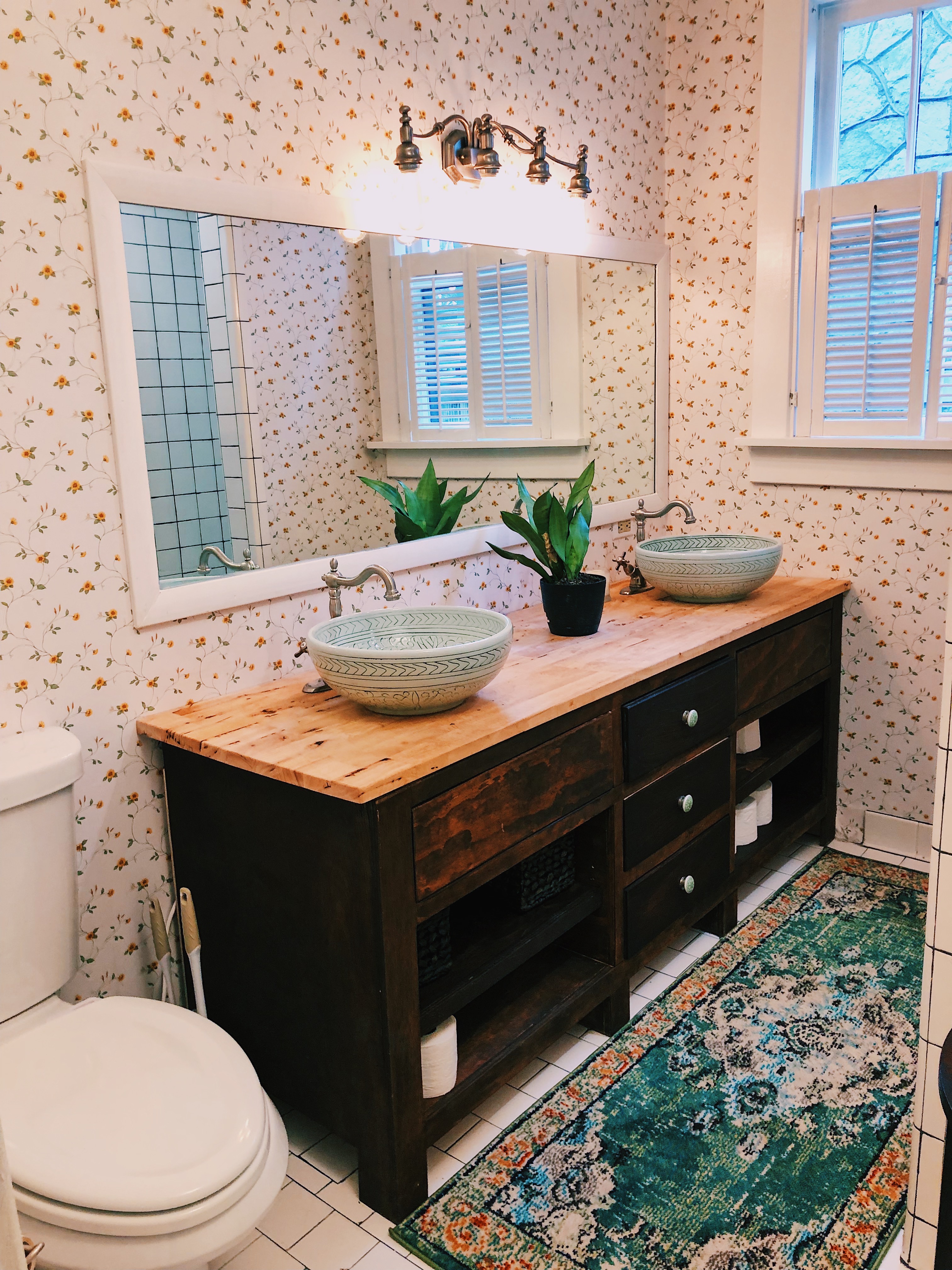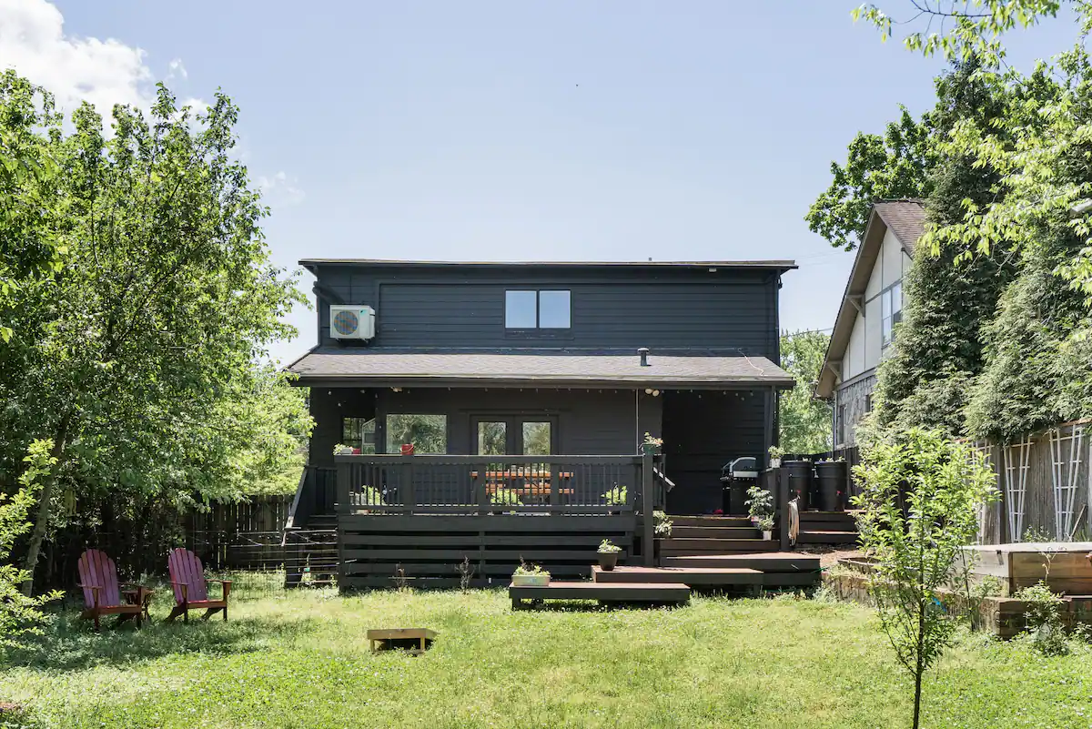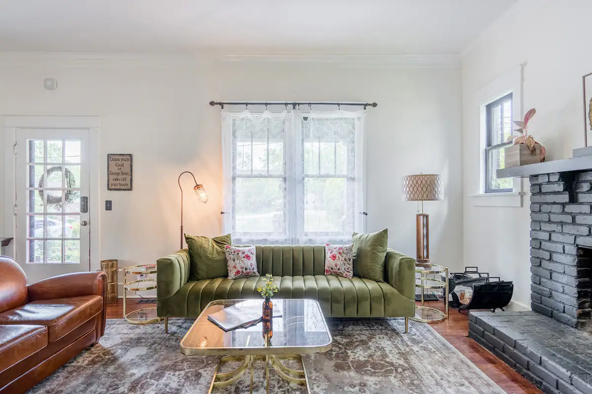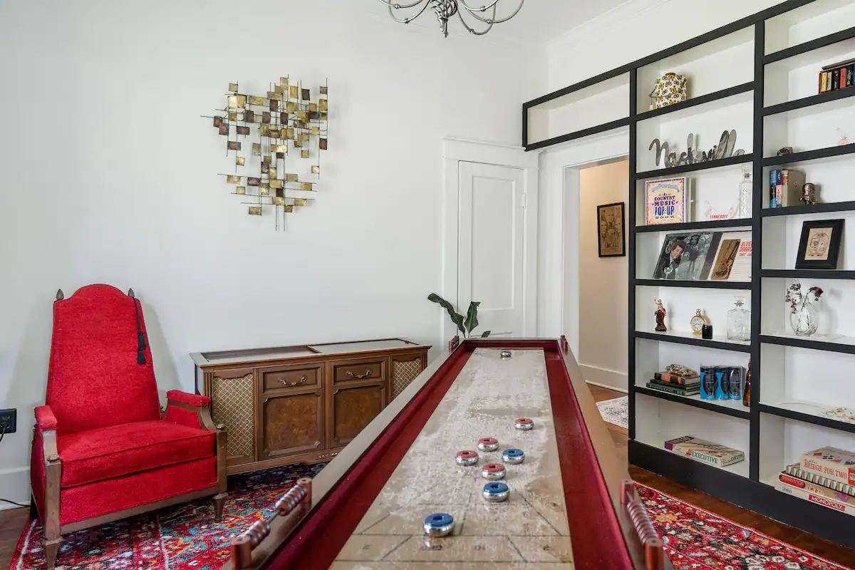 Exposed brick walls, black and white tiled kitchen floors, expressive wall paper, local and vintage art and a lush backyard complete with fruit trees, vegetable gardens and a fire-pit and well appointed deck create a perfect Southern Living atmosphere.