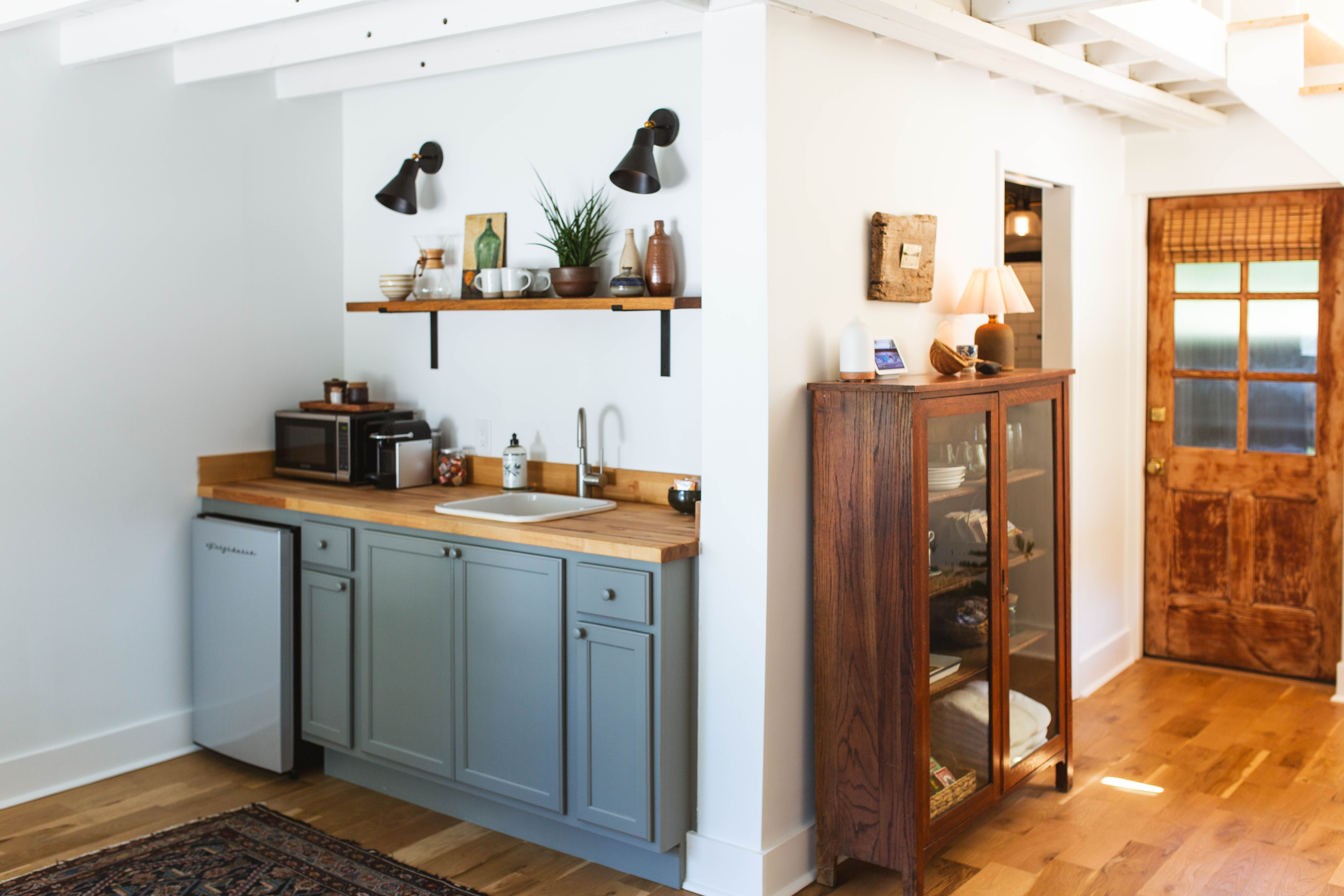 This thoughtfully curated Guest Suite is ideal for writing sessions, podcasts, interviews, product shoots & smaller productions. At 700 sq ft, this space packs a punch featuring a kitchenette, bathroom, lofted bedroom & living/dining area. A carefully styled library wall makes for the perfect backdrop. Lots of natural light throughout & the floating staircase is a beautiful feature during golden hour! Note: this space is attached to our main house which is also available for booking!