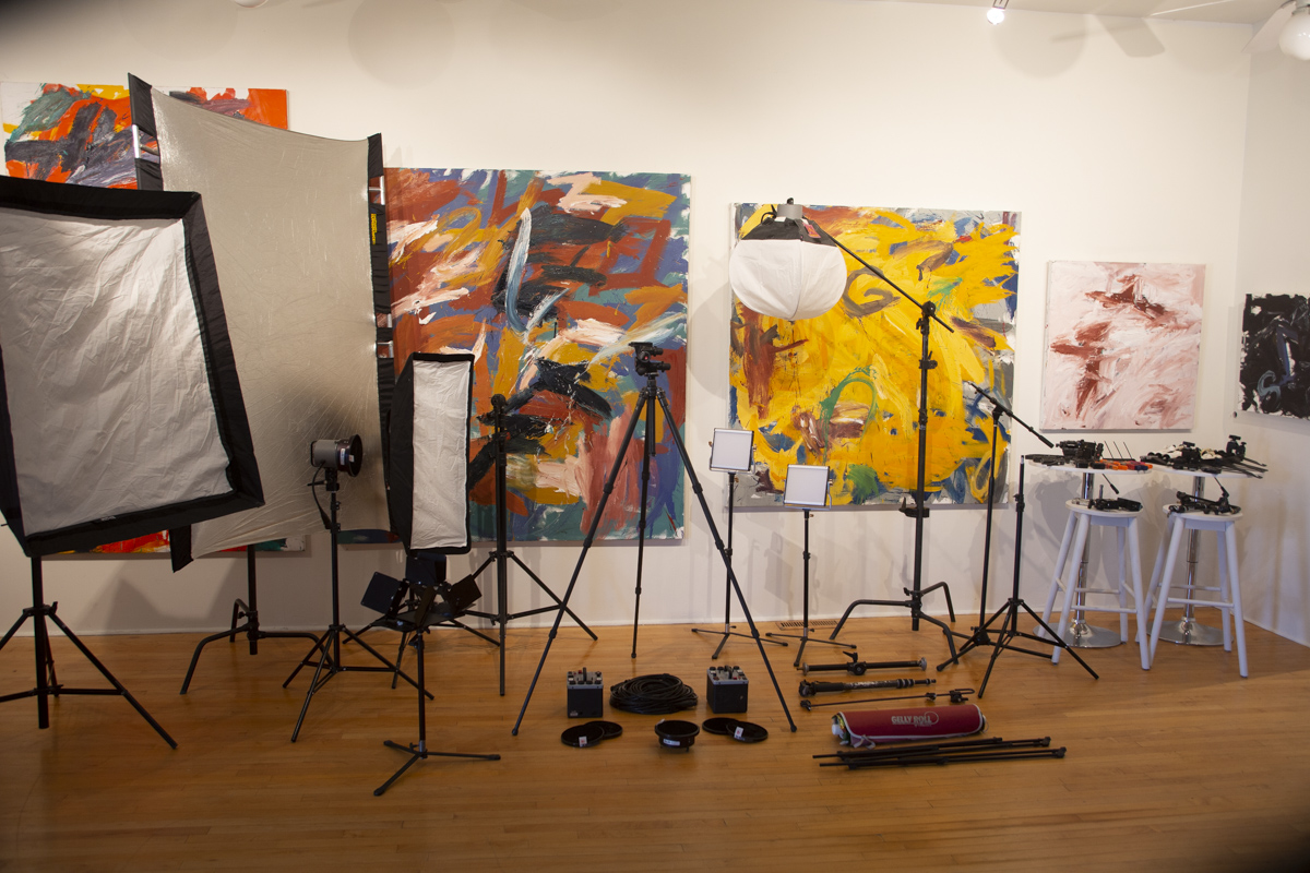 Tons of grip, soft boxes, huge reflector, stands, Dynamite strobes and heads, seamless system.