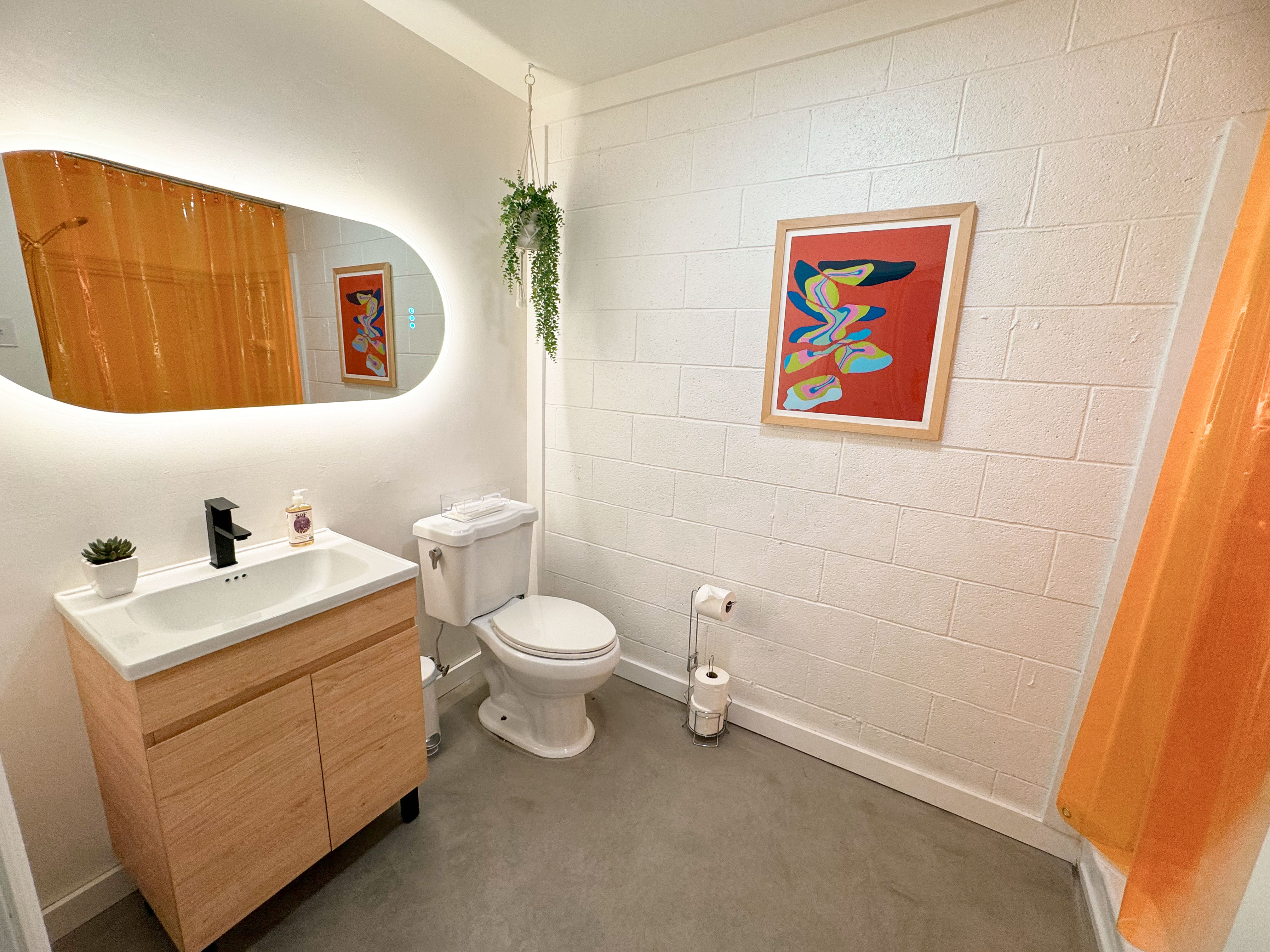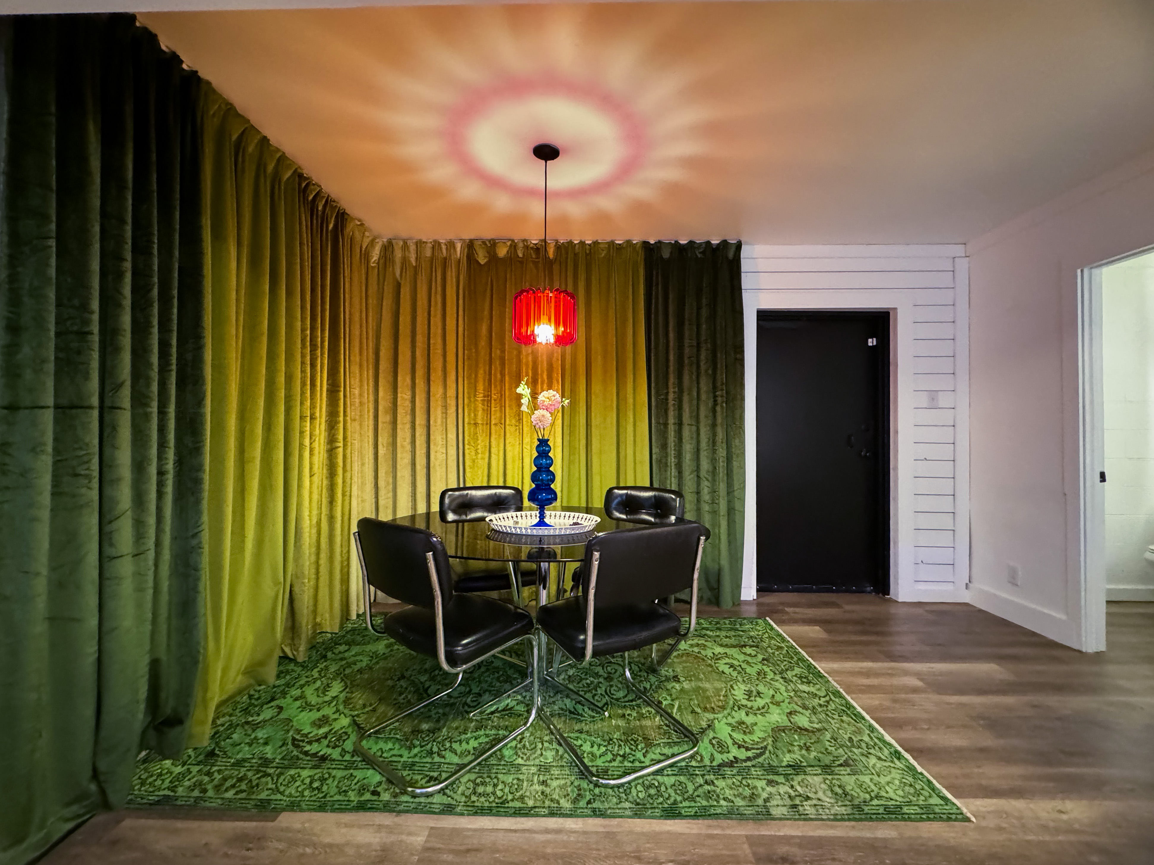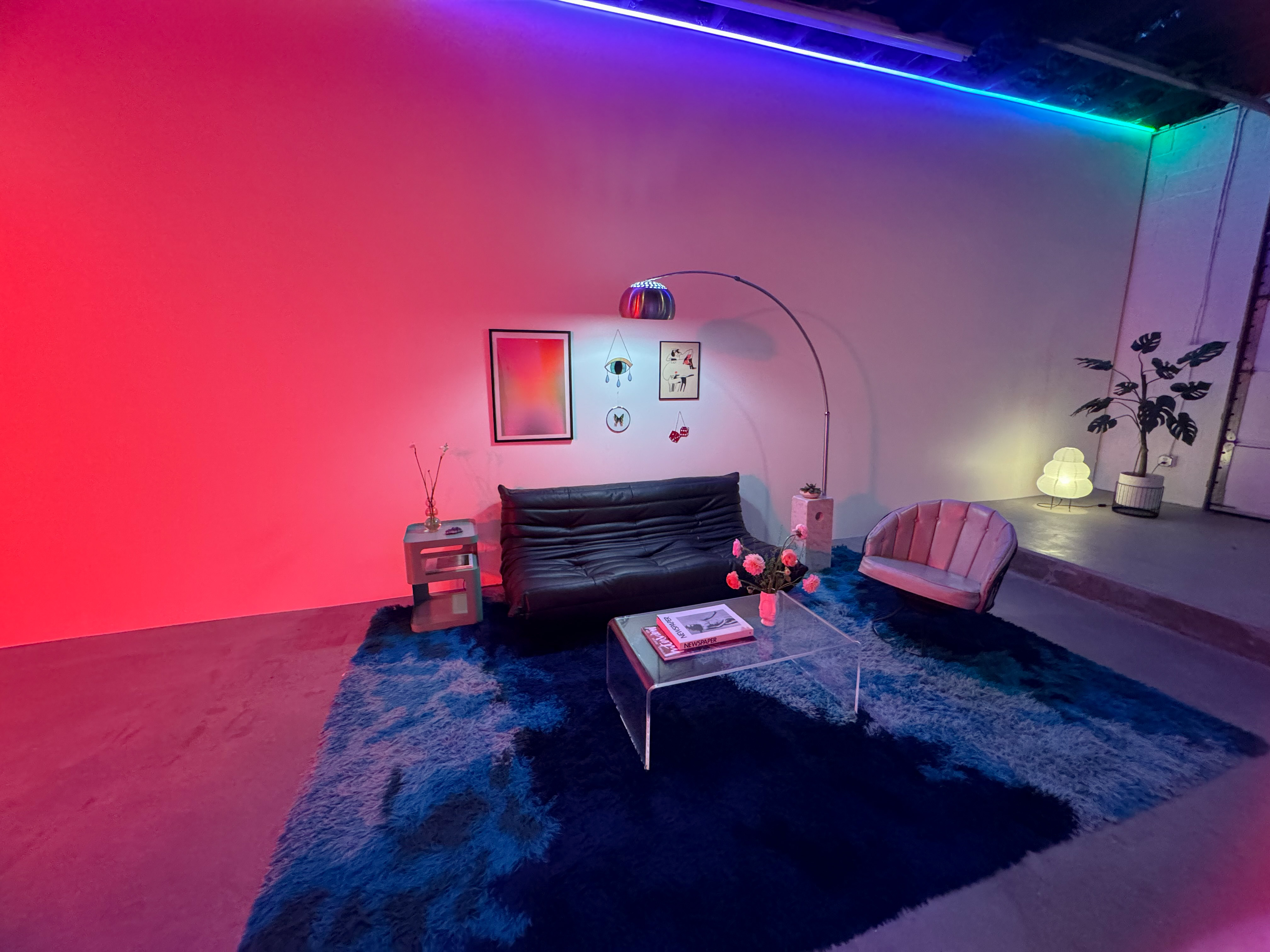 Expansive indoor and outdoor production studio complete with large cyc wall (17'x14'), lighting grid, a playful fusion of postmodern and mid-century styled rooms, and gorgeous natural light or RGB controlled studio lighting throughout. The creative space also features a private changing room, glam area, and two bathrooms!