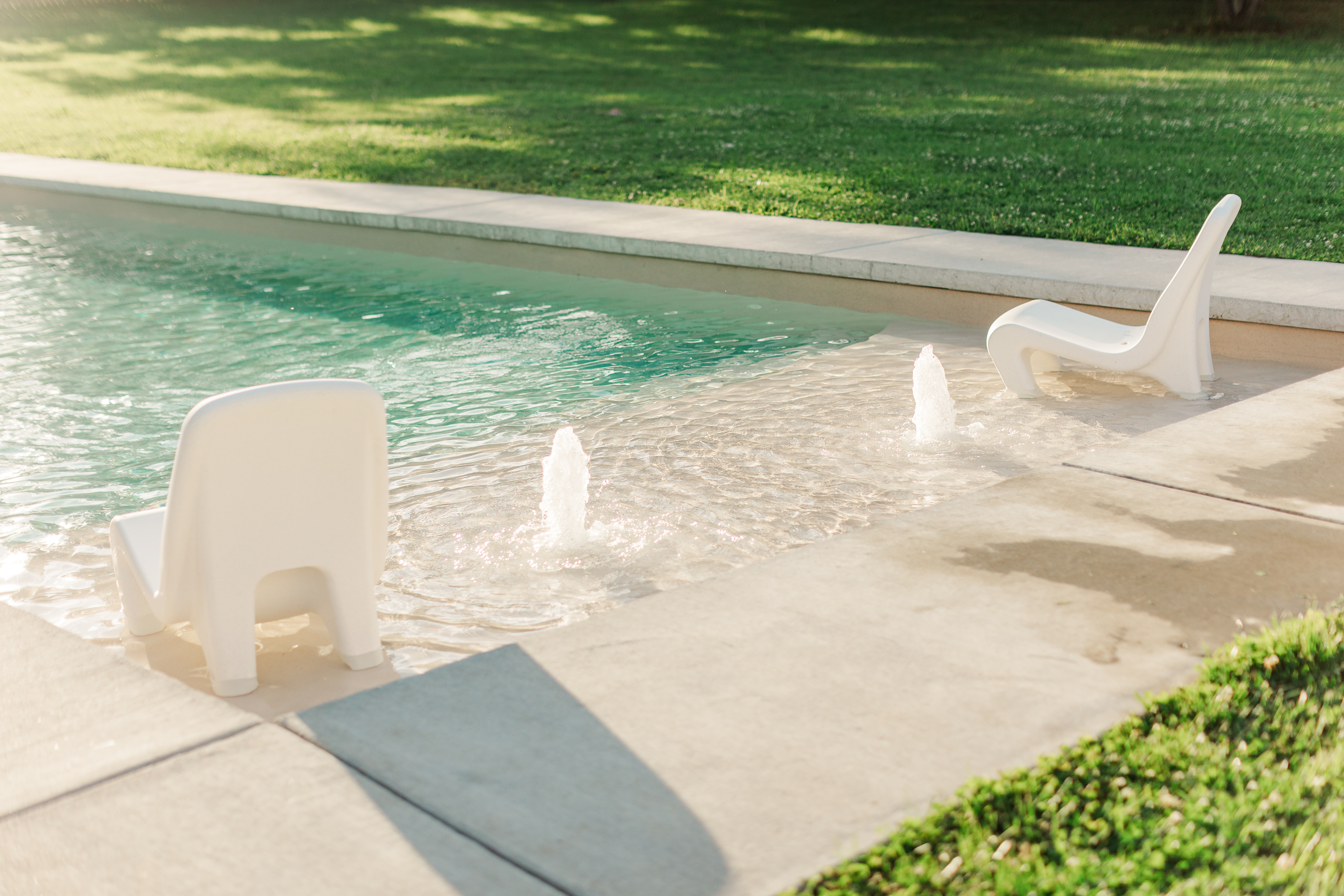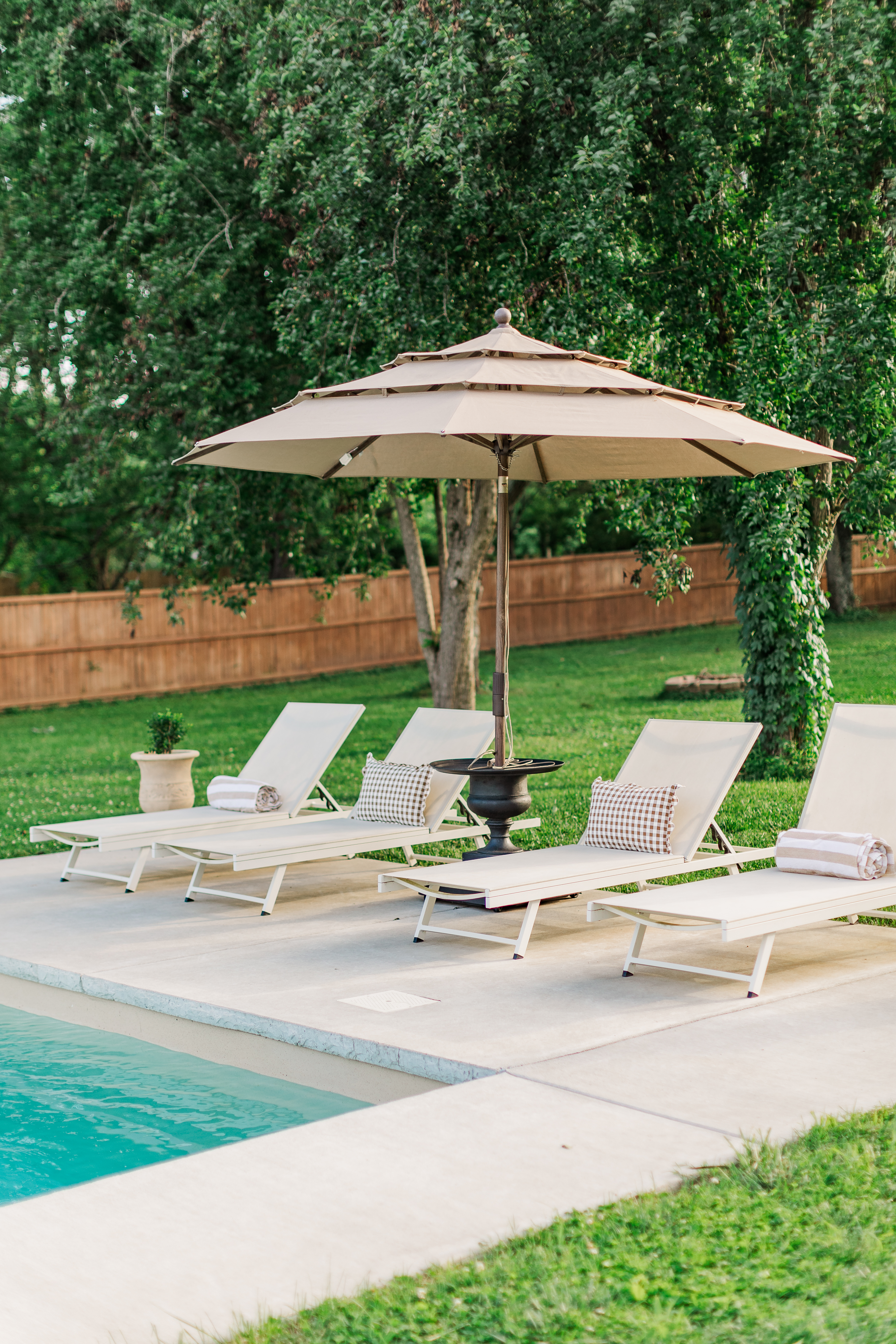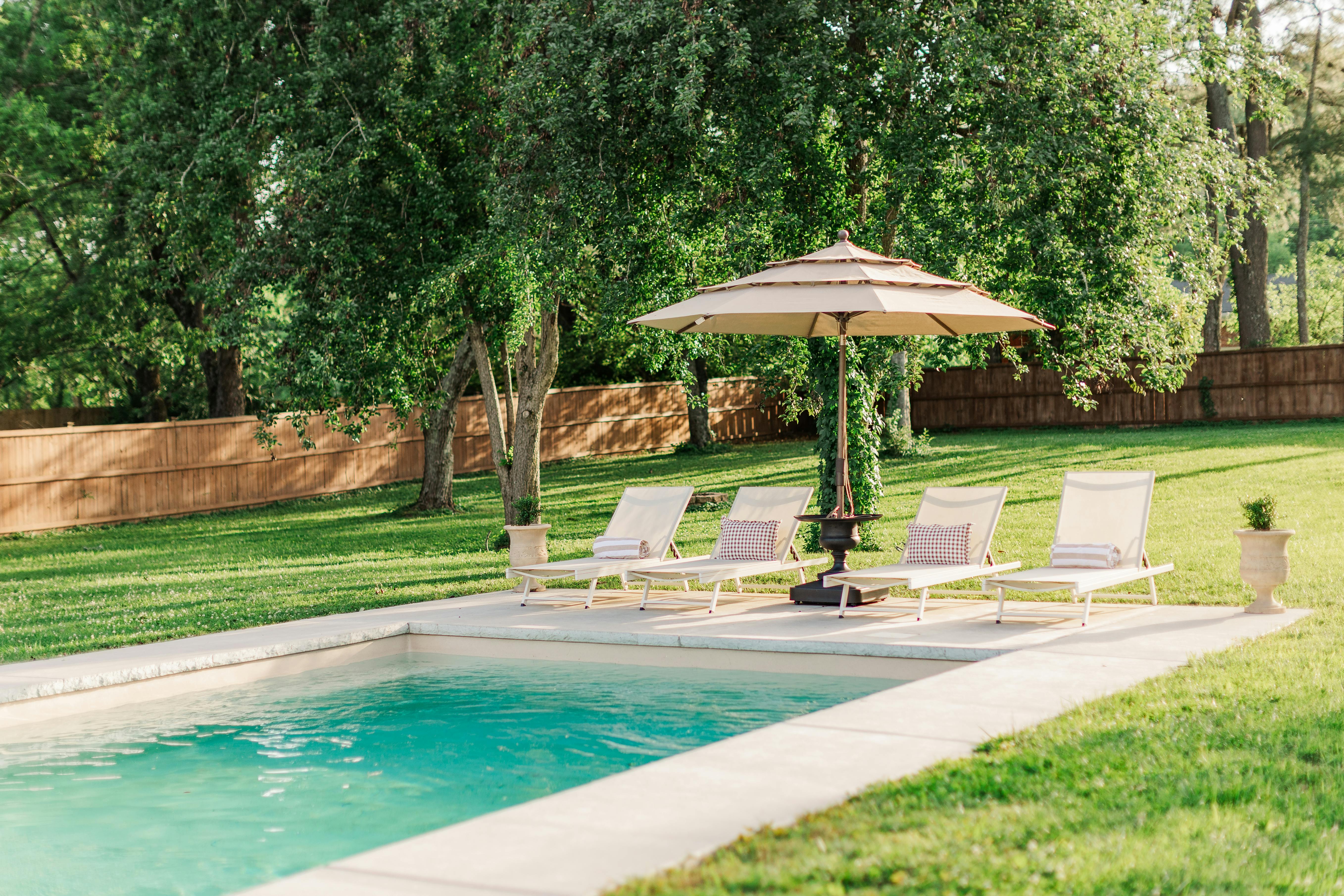 • White pool loungers and umbrella for a classic resort feel