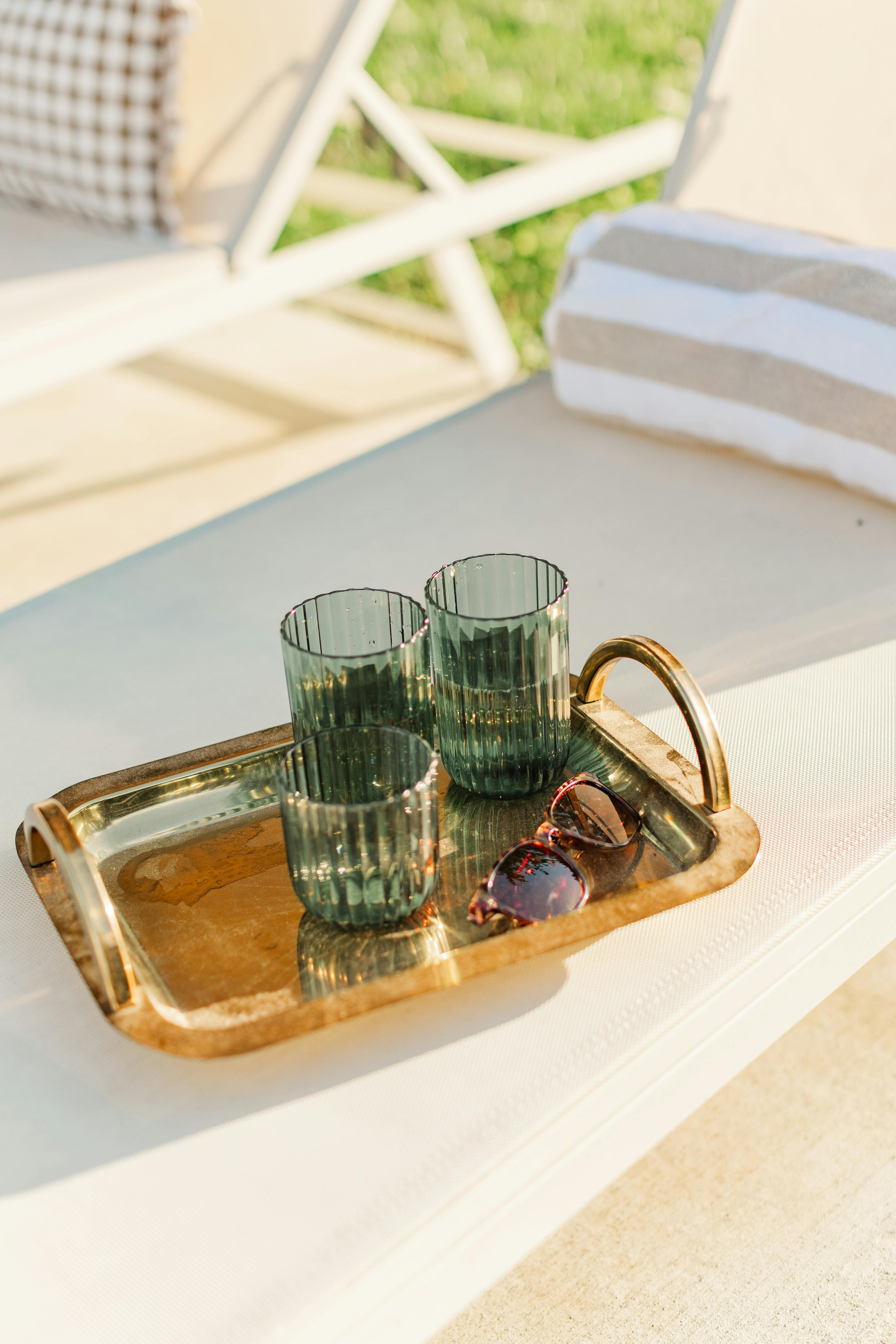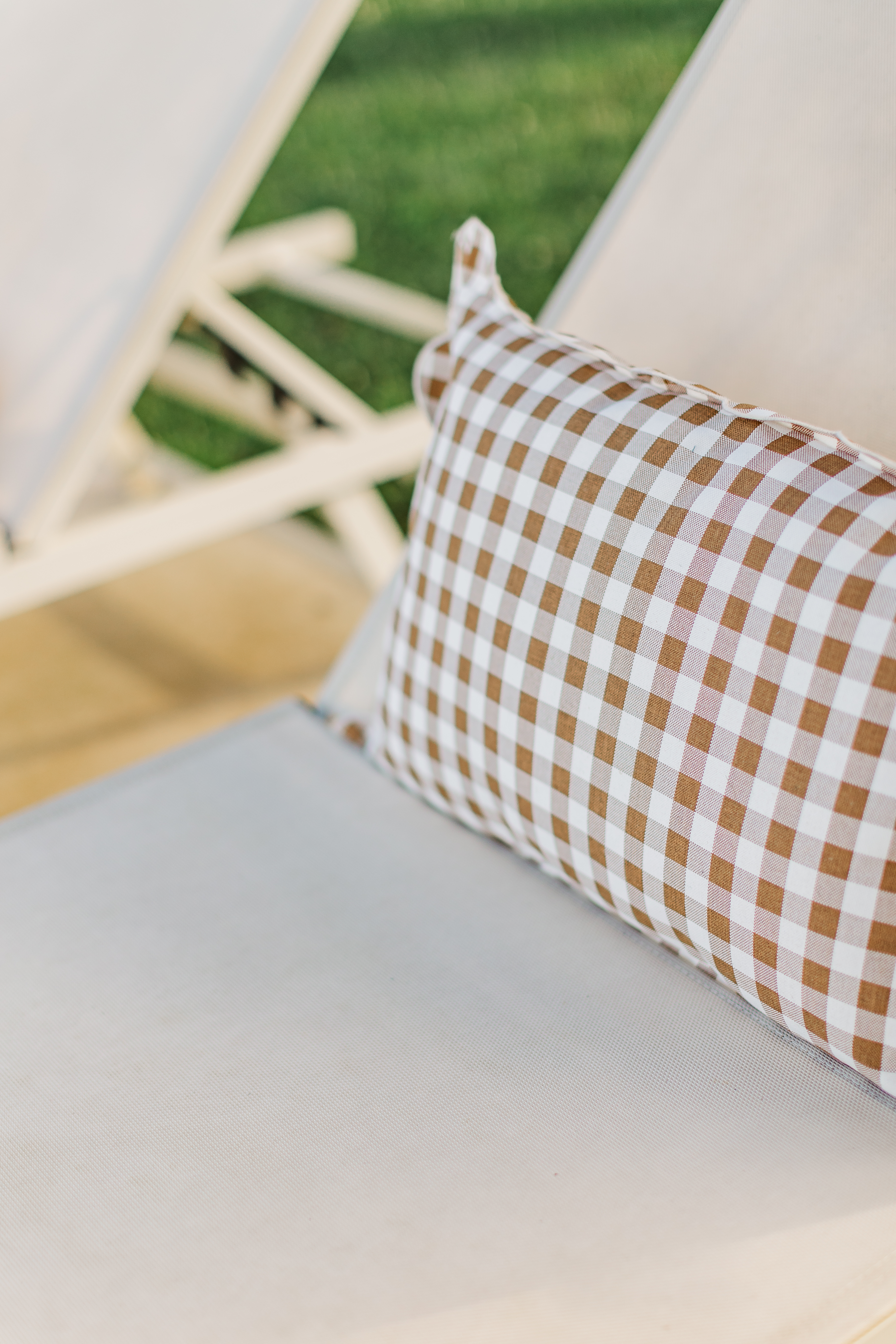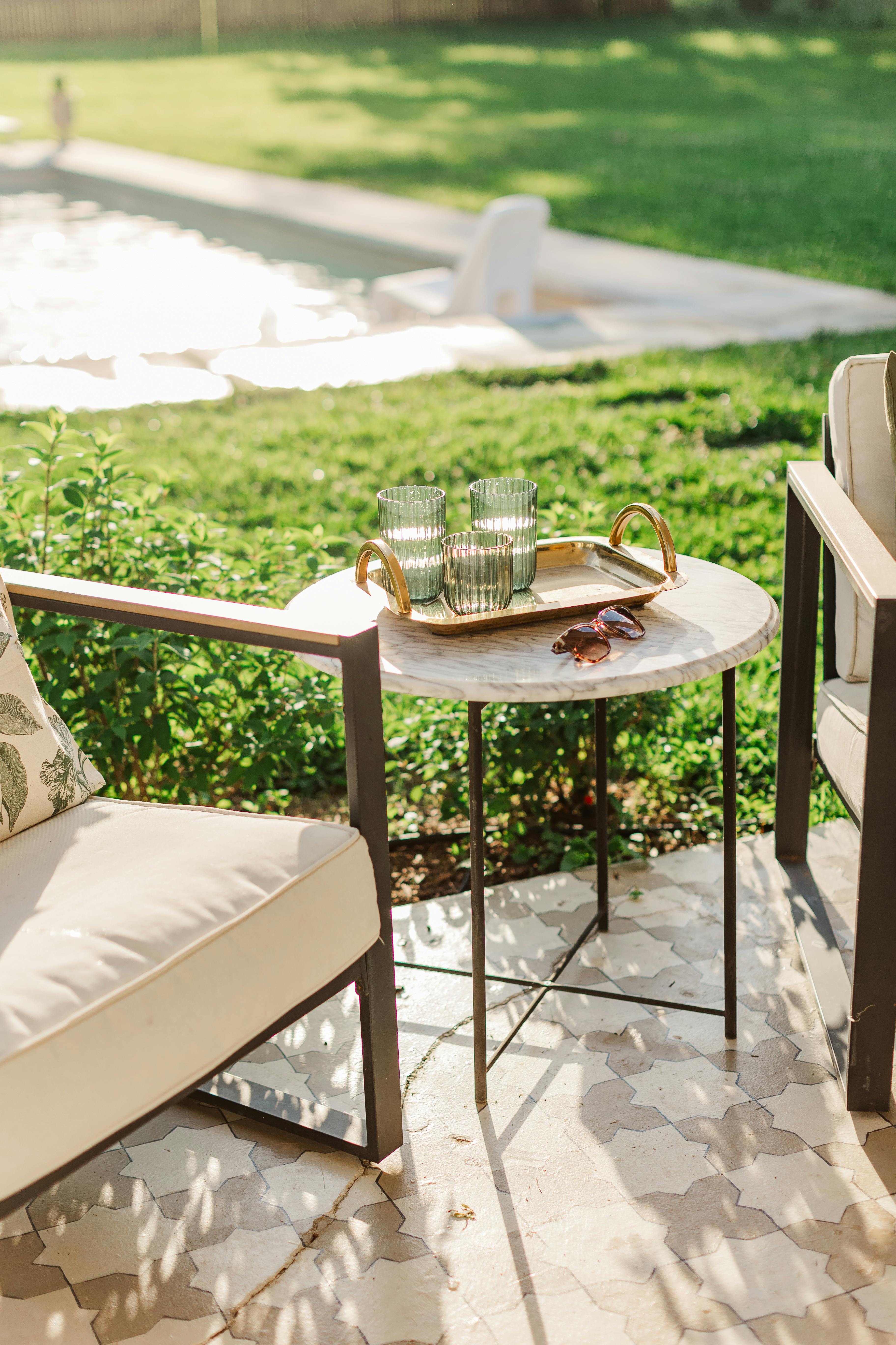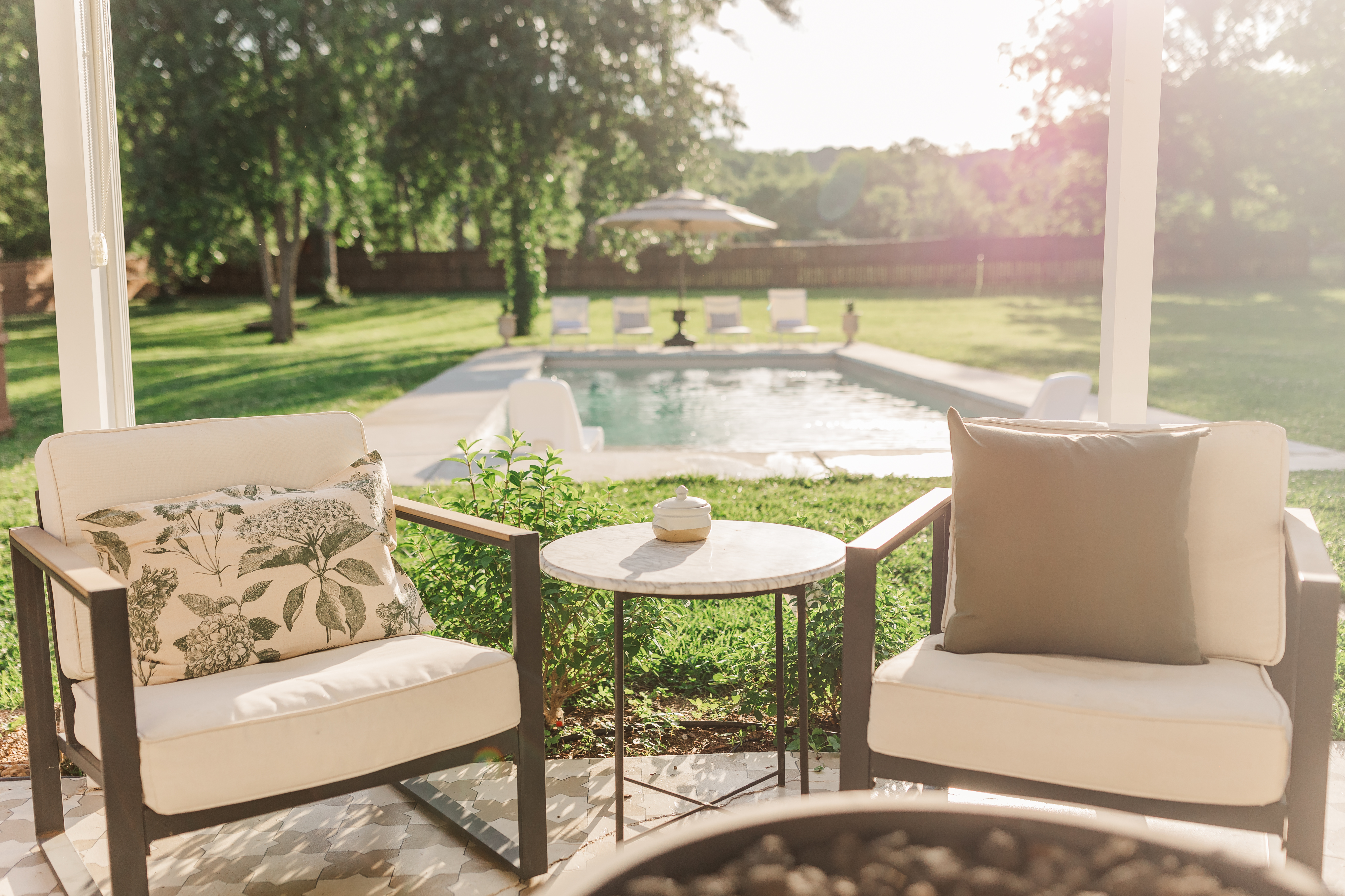 • White pool loungers and umbrella for a classic resort feel