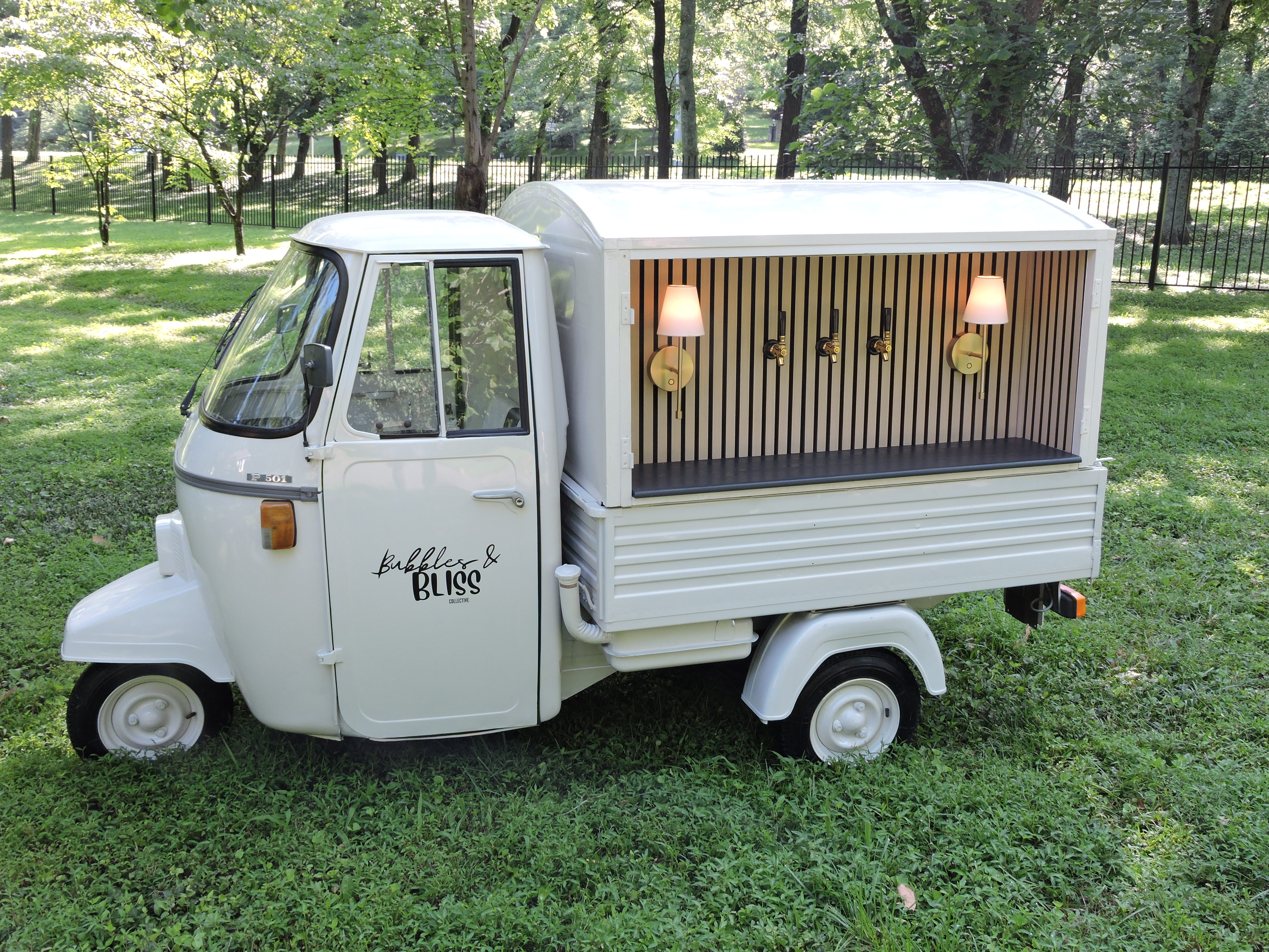 Bubbles and Bliss Collective is a vintage Italian Piaggio. This Piaggio has been customized to serve as a the stylish mobile service that adds a unique touch to any occasion! Whether you're hosting a wedding, birthday, or corporate event, our mobile experience is designed to elevate your celebration. Bubbles and Bliss is a dry hire that offers 3 taps serving beer or cider. It can also be used as a display table.