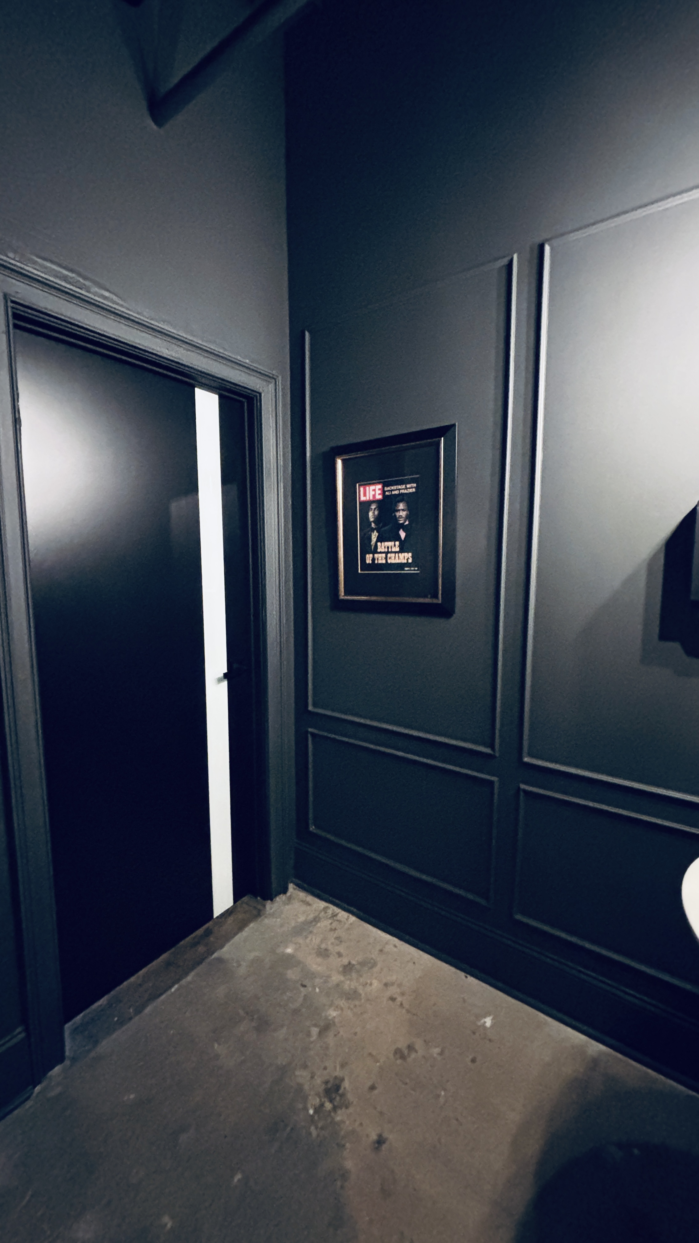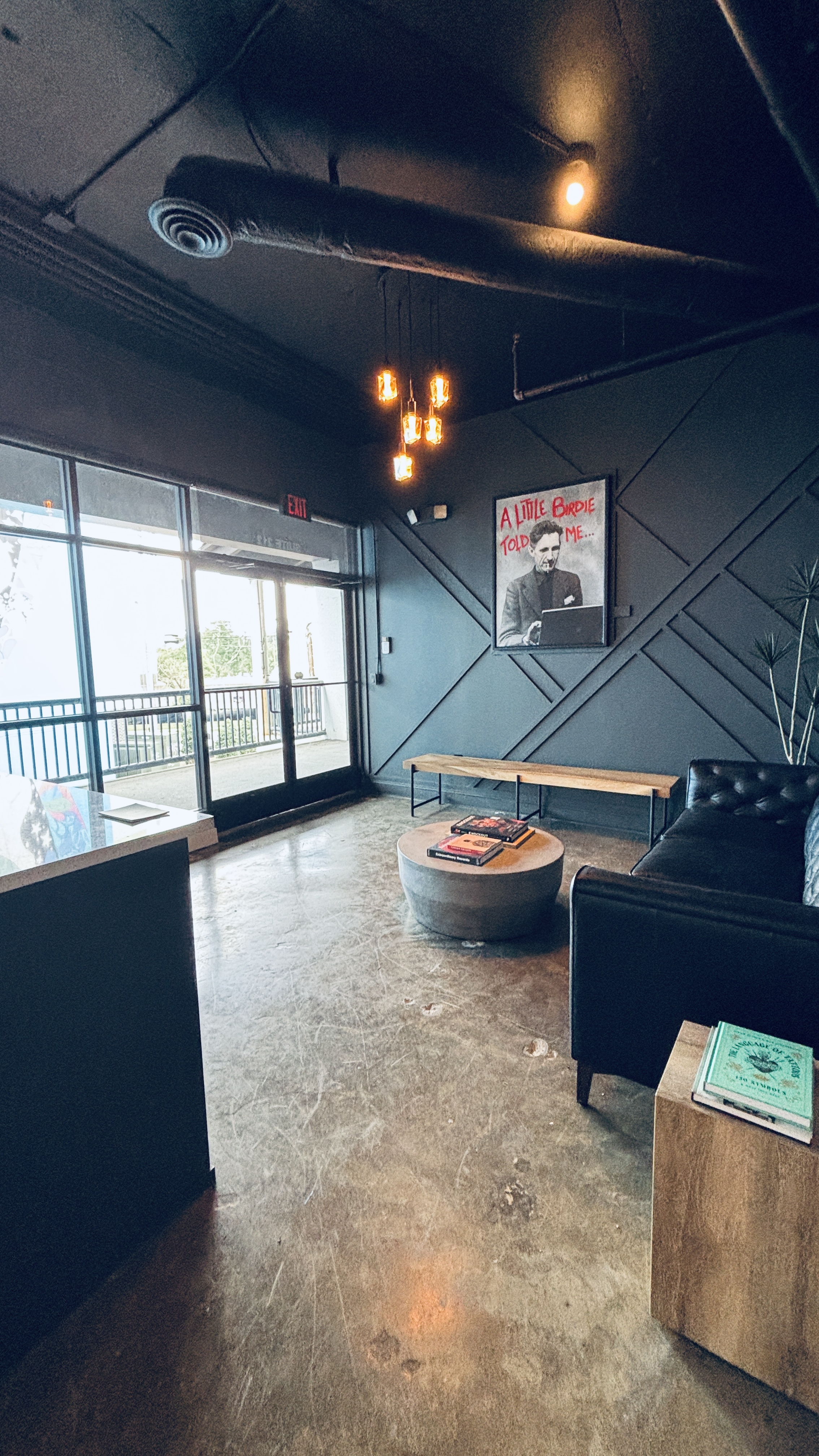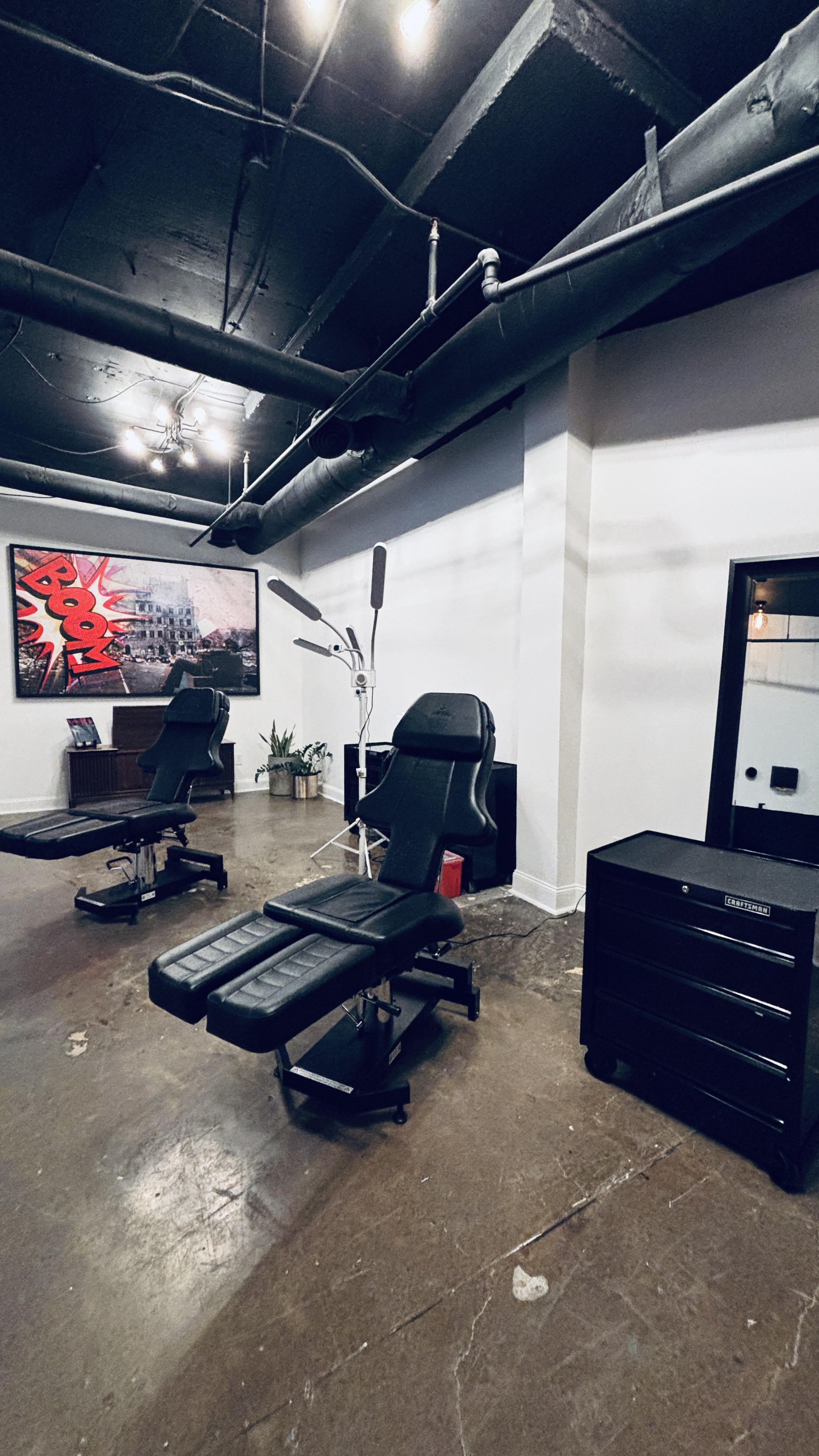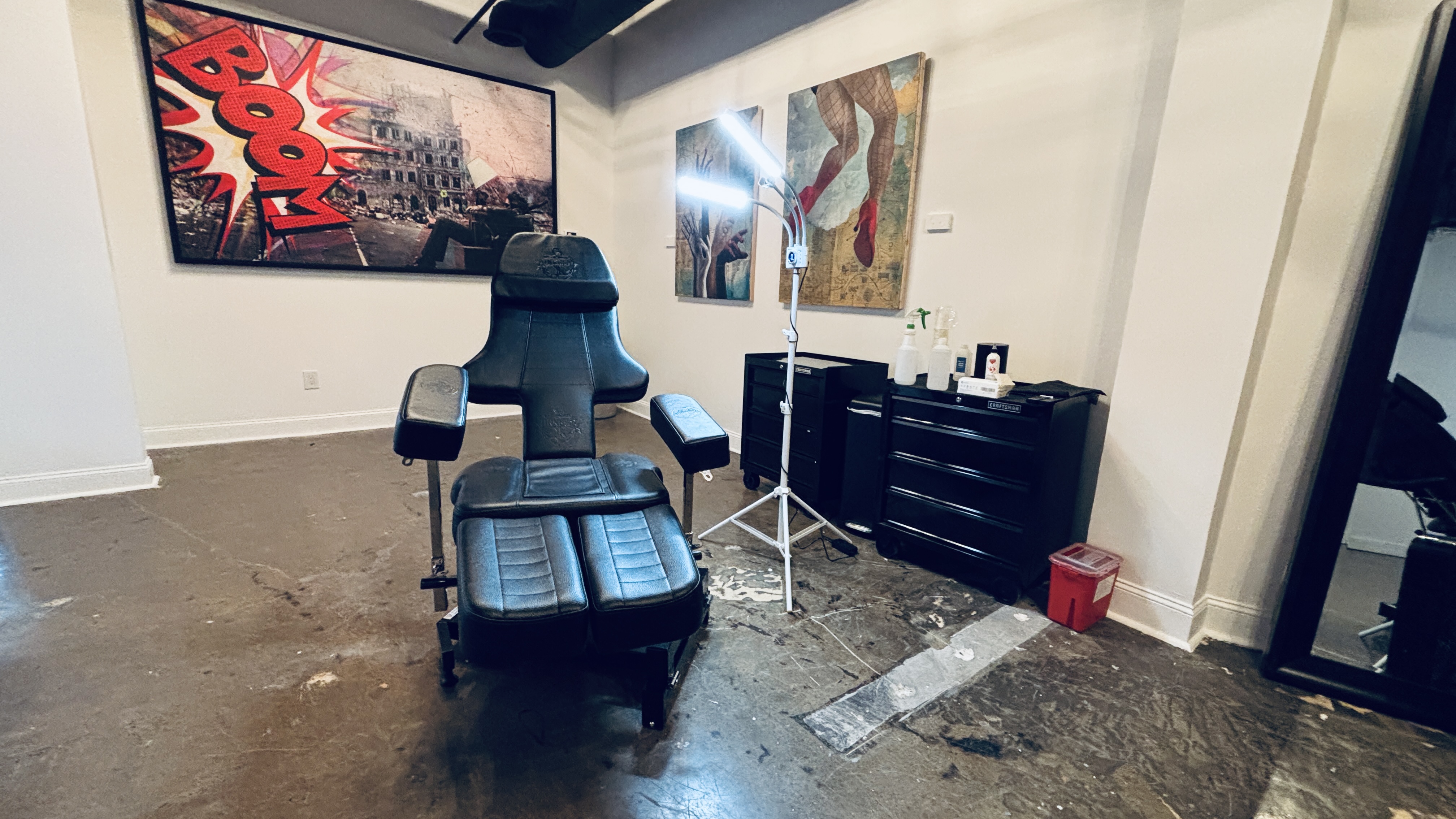 This tattoo studio has an elevated, industrial vibe with concrete floors and dark paneled walls. The space in the back provides depth, symmetry and texture, making it a a great option for small interview shoots!