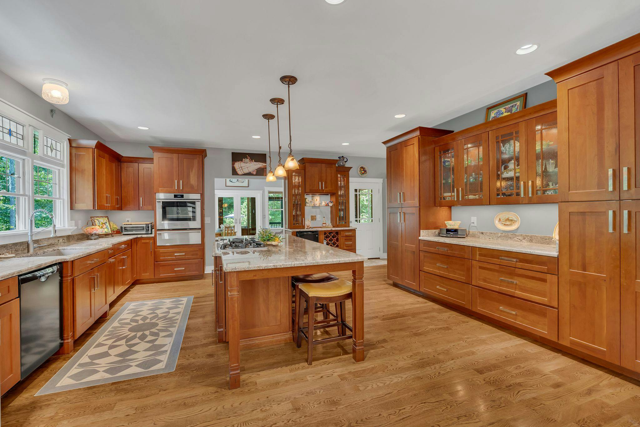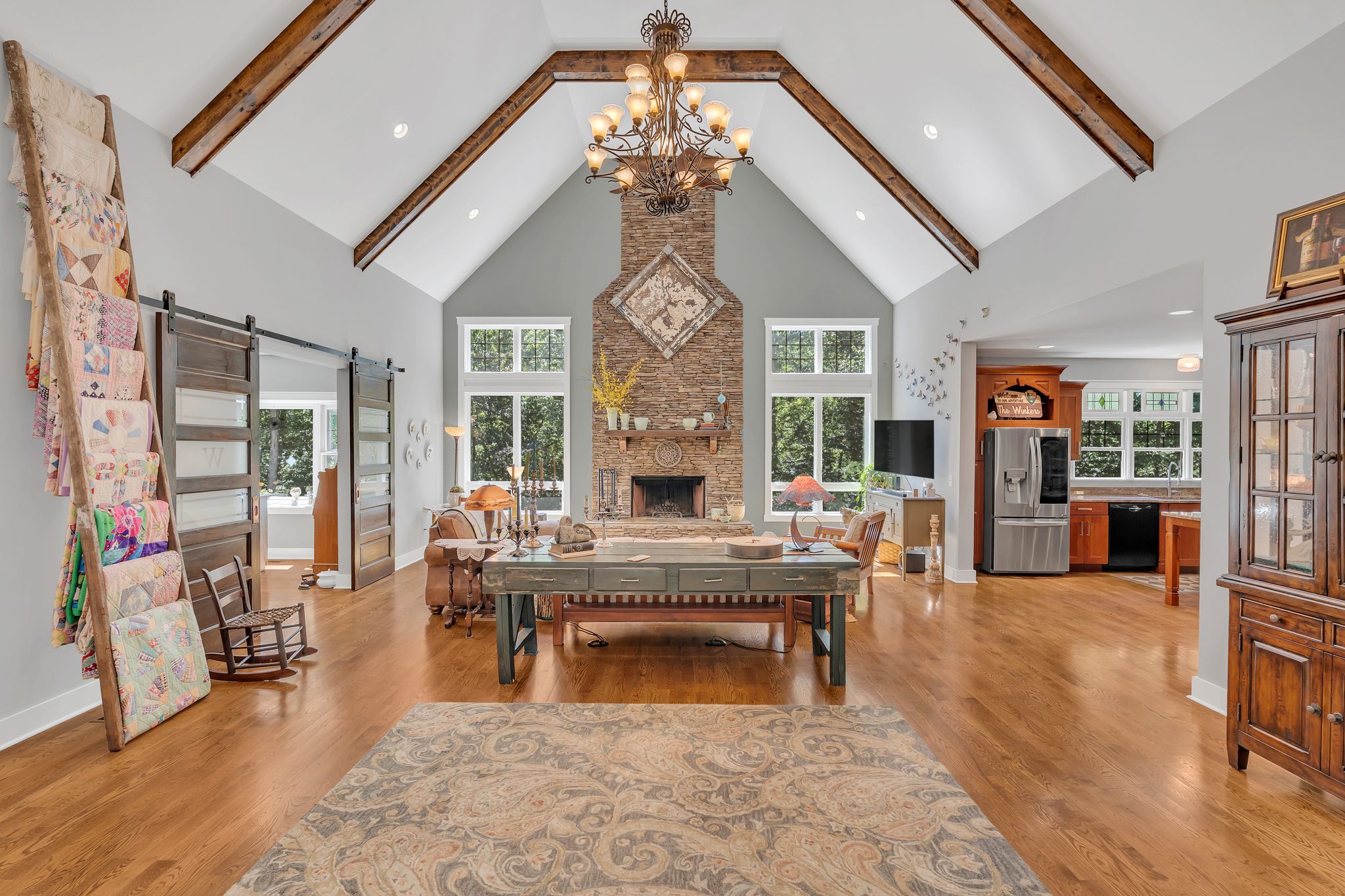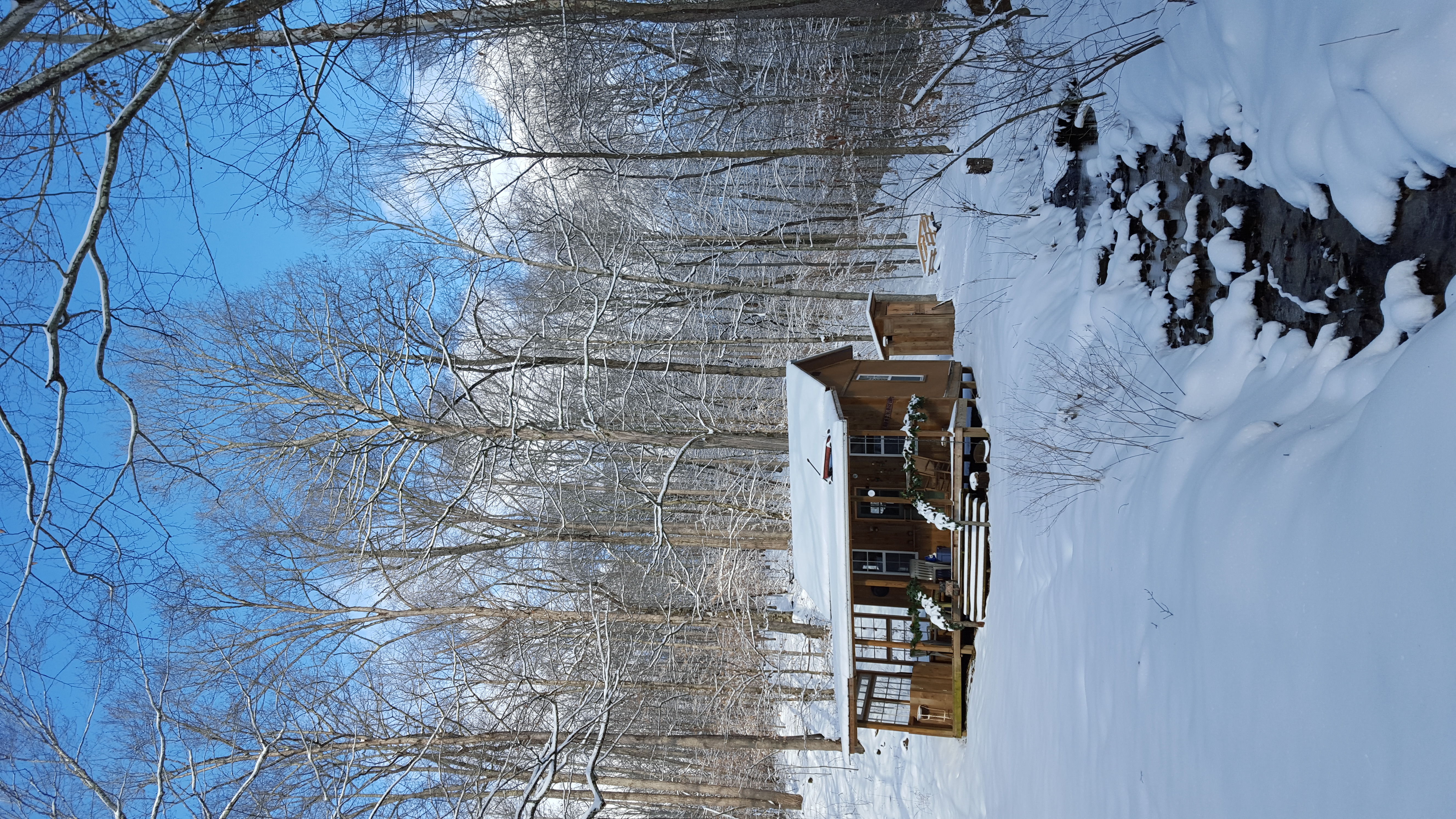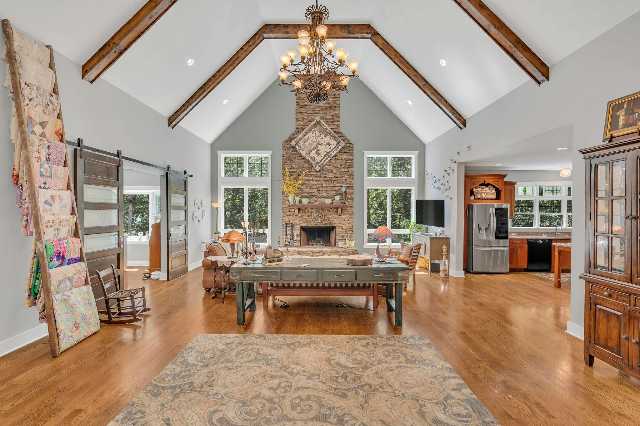 The secluded home sits back from the road on a forested 12 acres. Though the main home is modern, this location still offers a rural ambience with its many cabins, outbuildings and backdrops.
