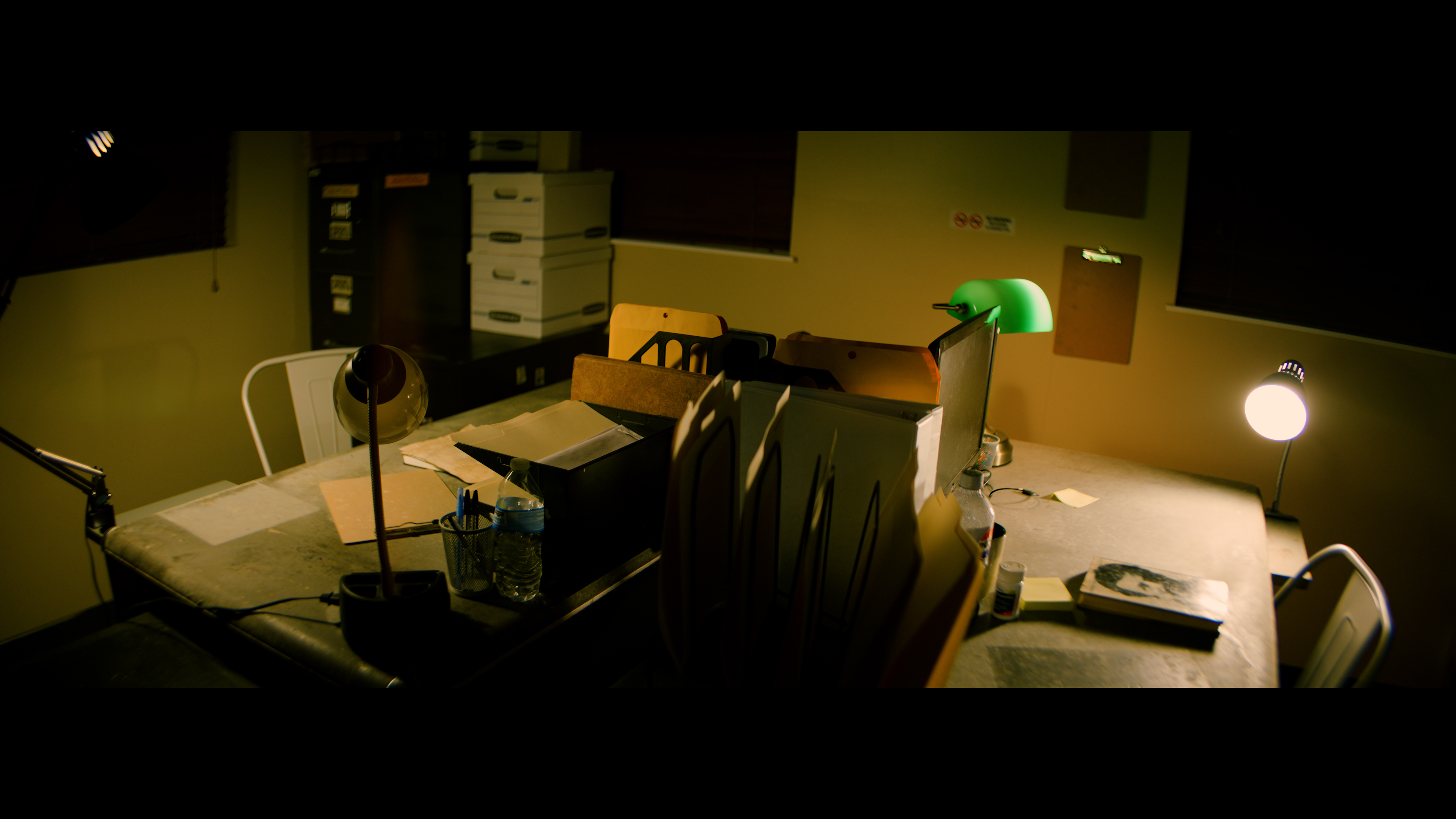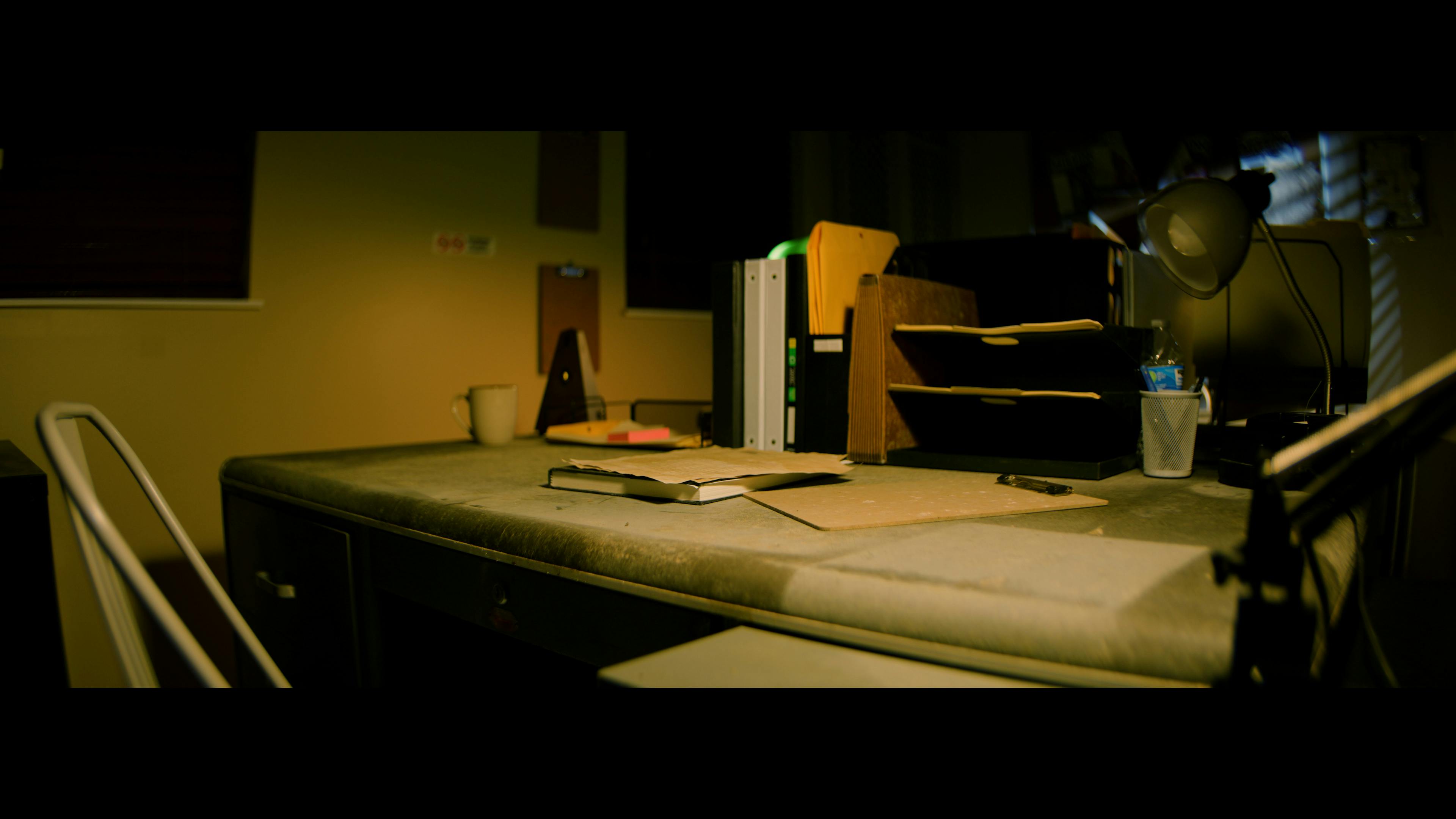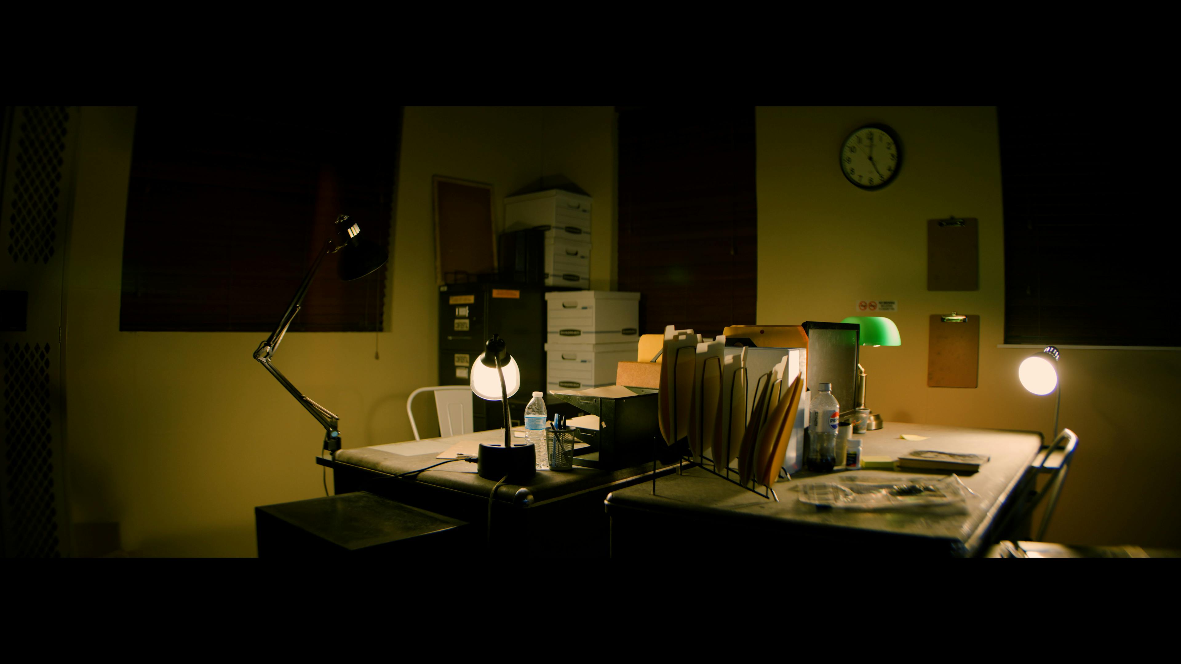 This moody office set features two detectives desks facing each other, perfect for capturing dialogue scenes. The studio is also located on a rural road, providing a set-up for capturing exterior driving shots!