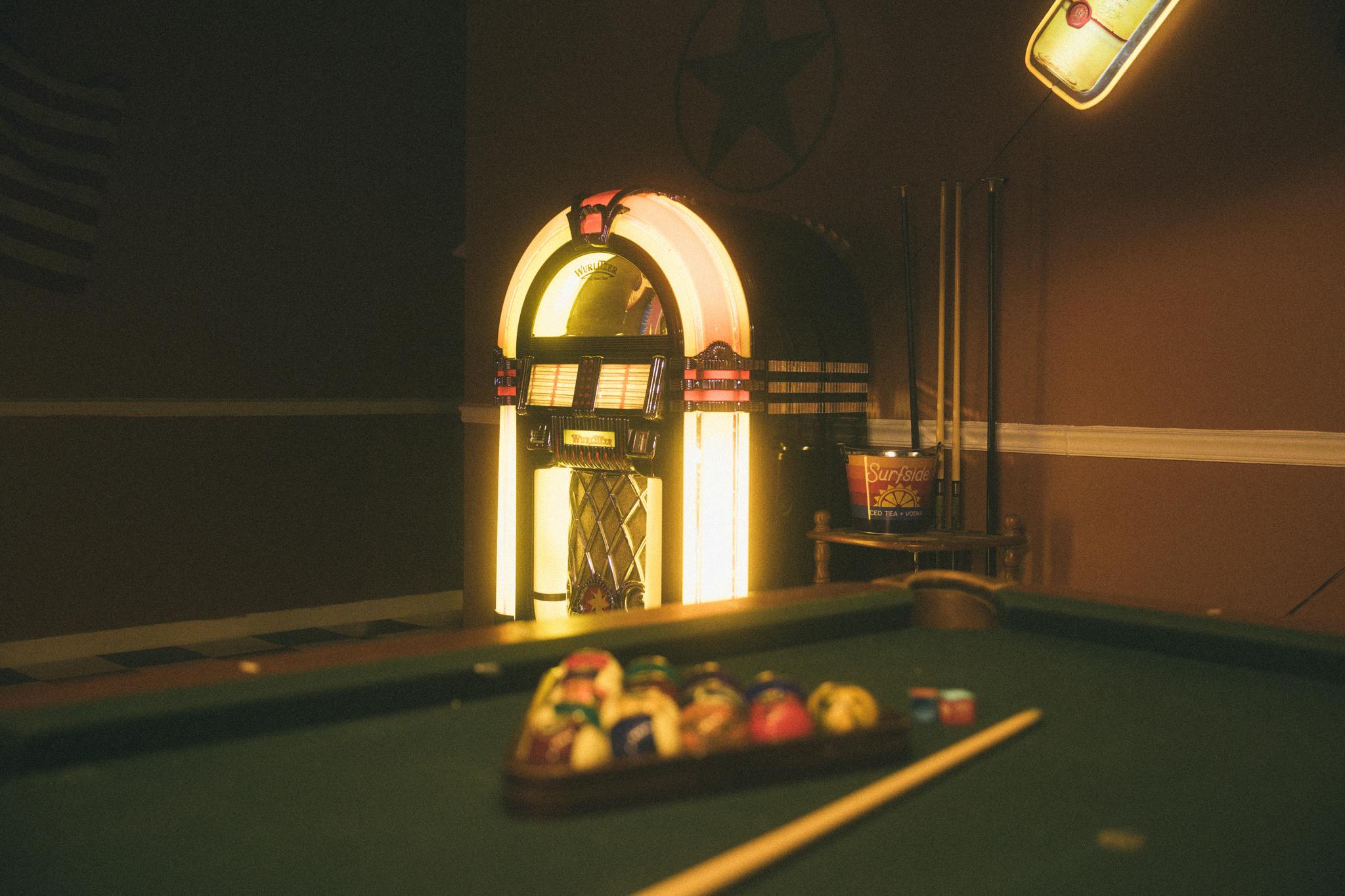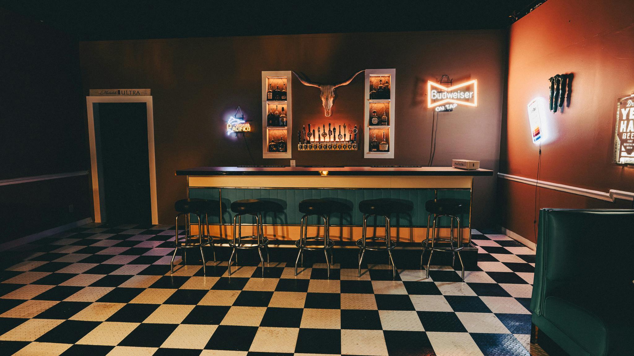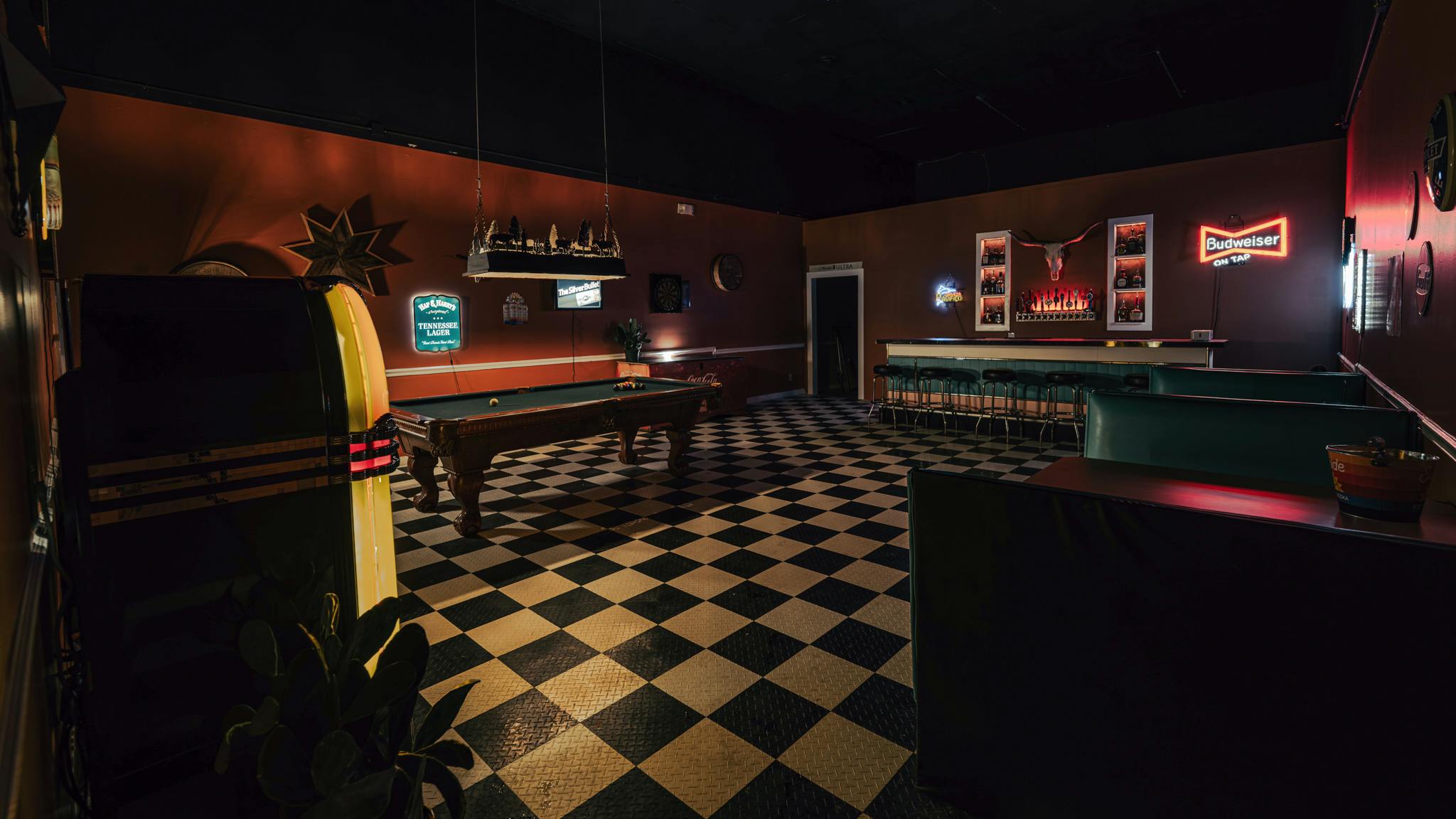 Step into our fully built bar + motel set, Shooter’s Saloon — a moody, western-inspired dive bar located inside City Limit Studios. This immersive space features a 12ft bar and backlit shelving, chrome barstools, teal booths, and a pool table with saloon-style overhead lighting. The checkered floors, longhorn skull, dartboard, glowing jukebox, and wall of tap handles bring gritty realism to the scene — while the warm tones, neon glow, and scattered cactuses keep the western aesthetic strong.