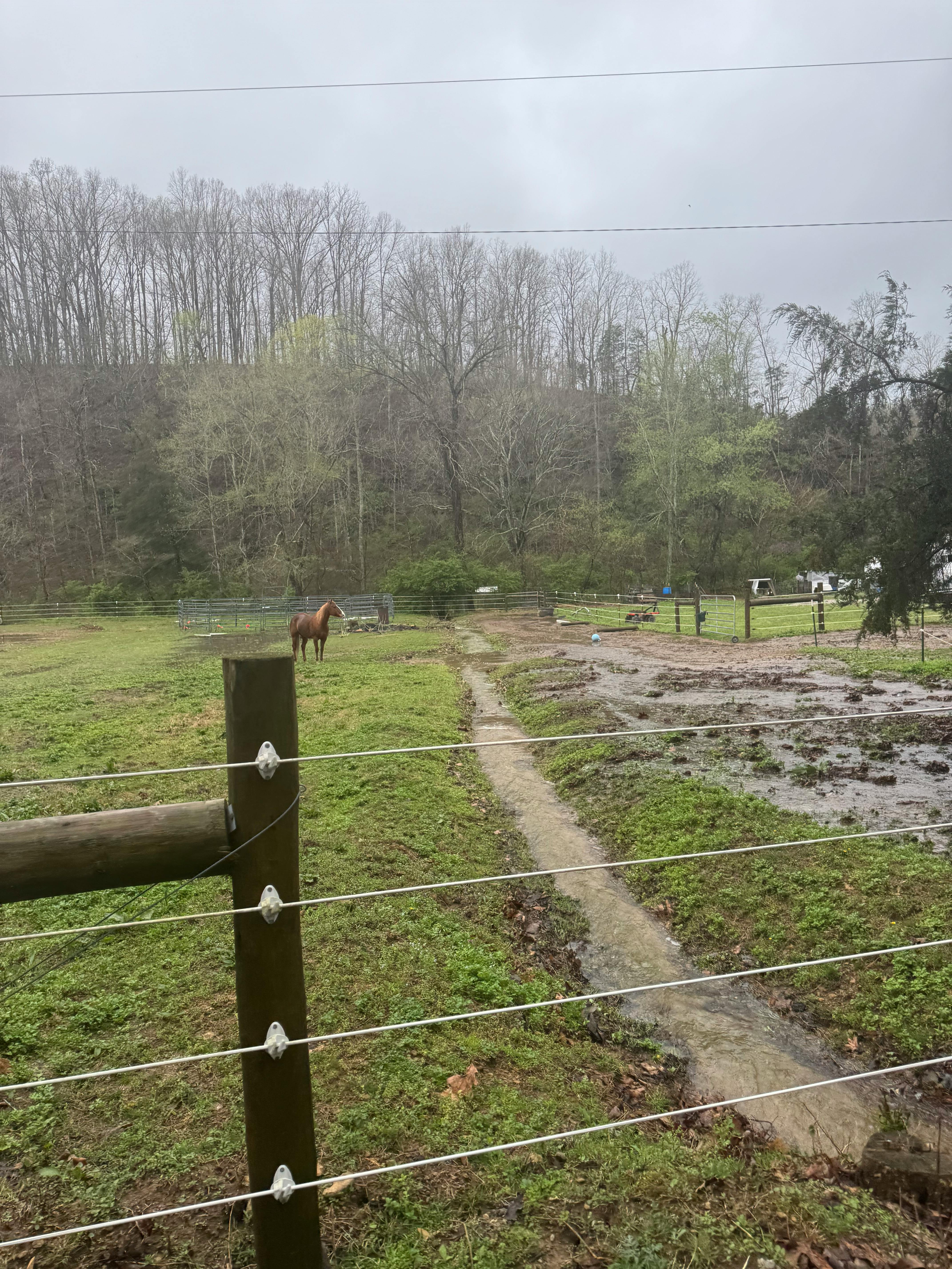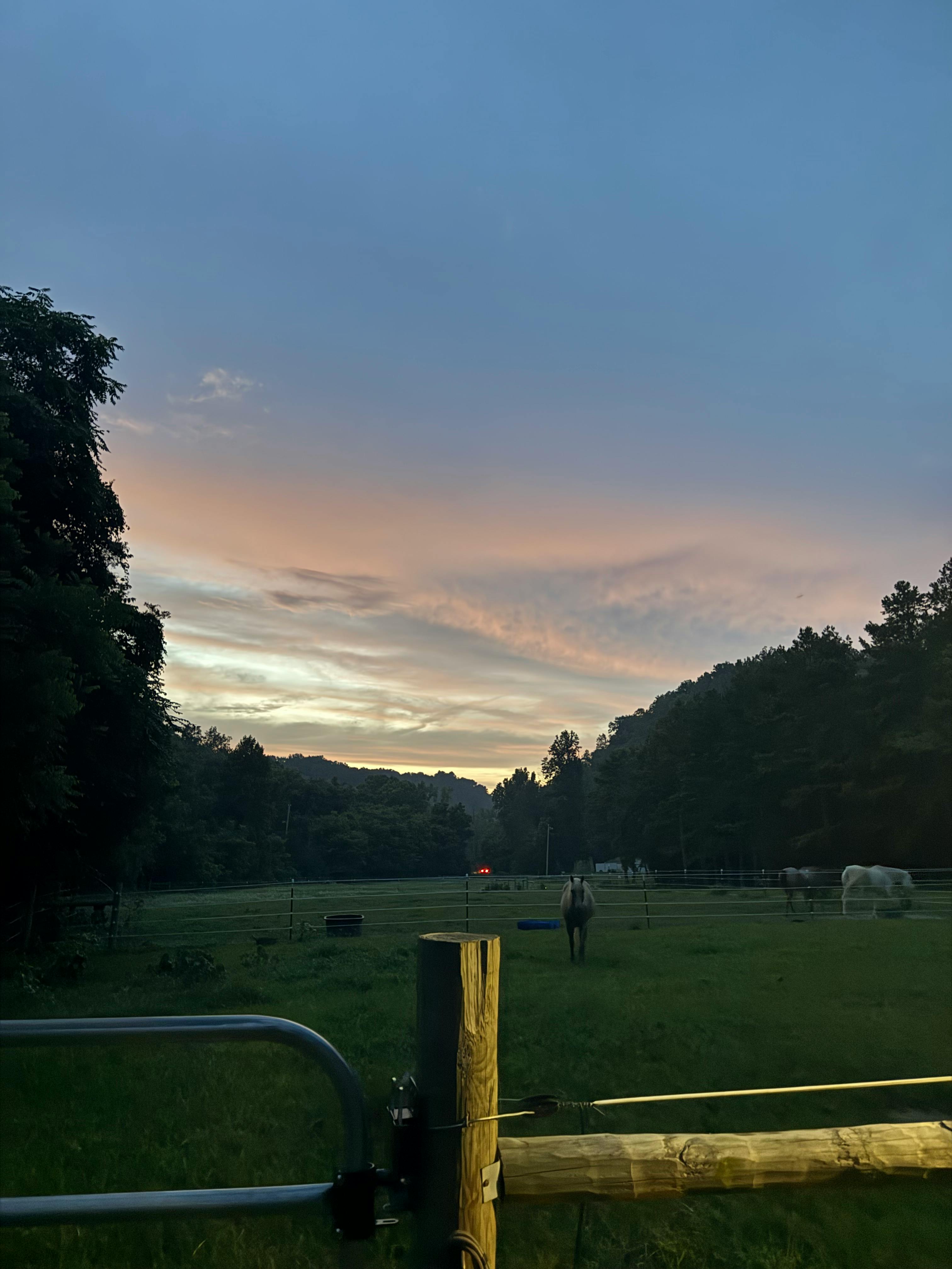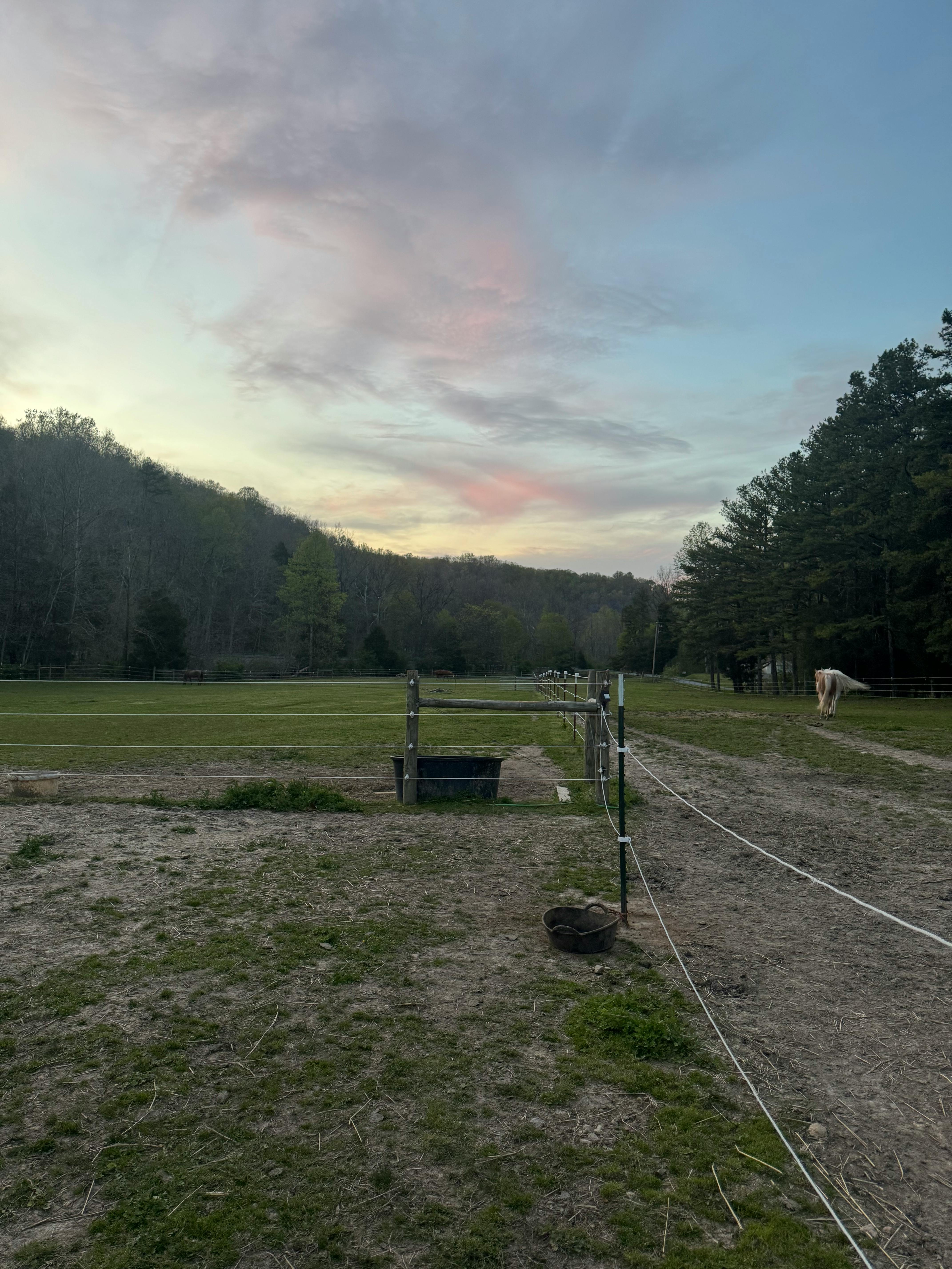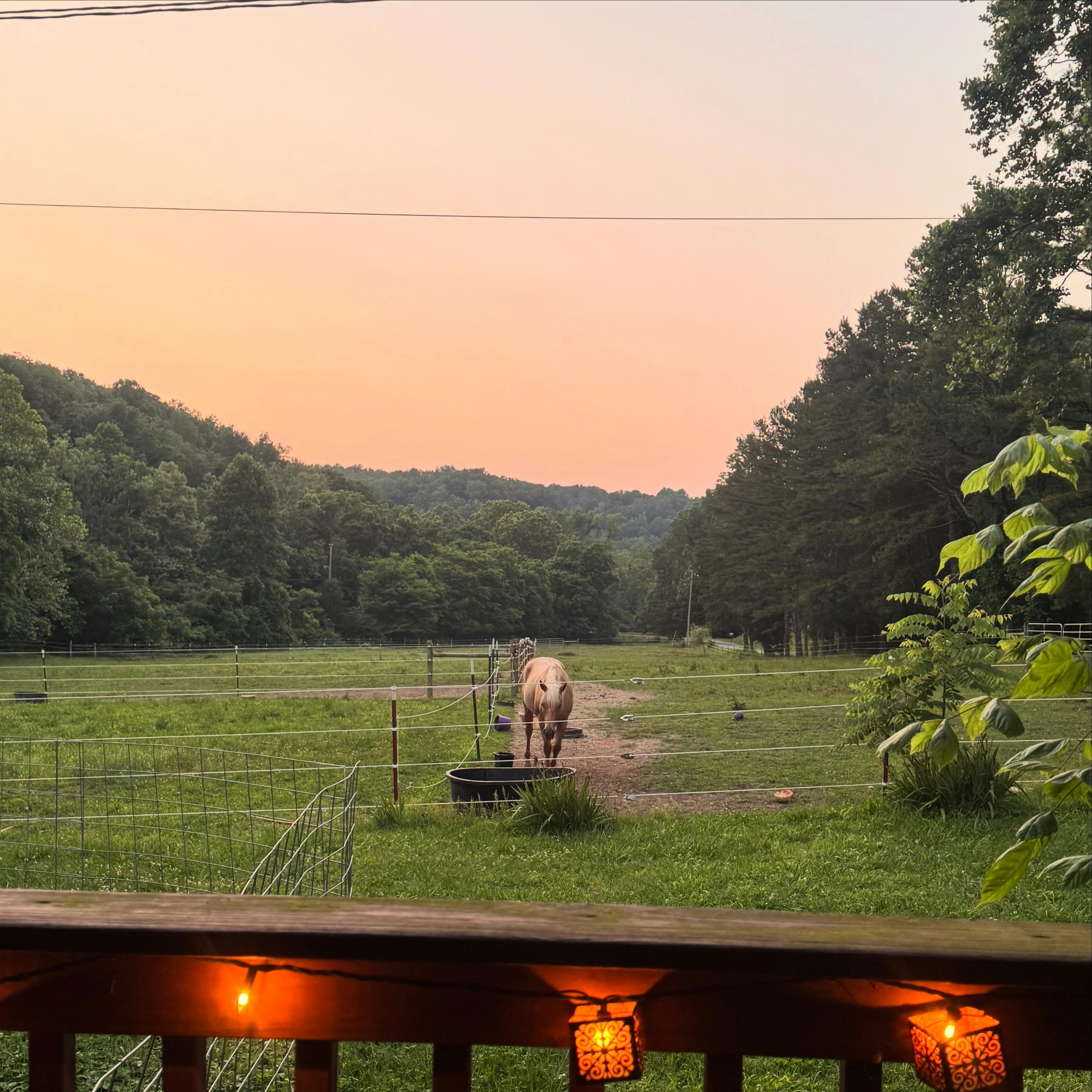 We have 7 acres with a variety of settings: open pastures, woods, treehouse, shallow creek. On our property, we have pet pigs, horses and chickens.