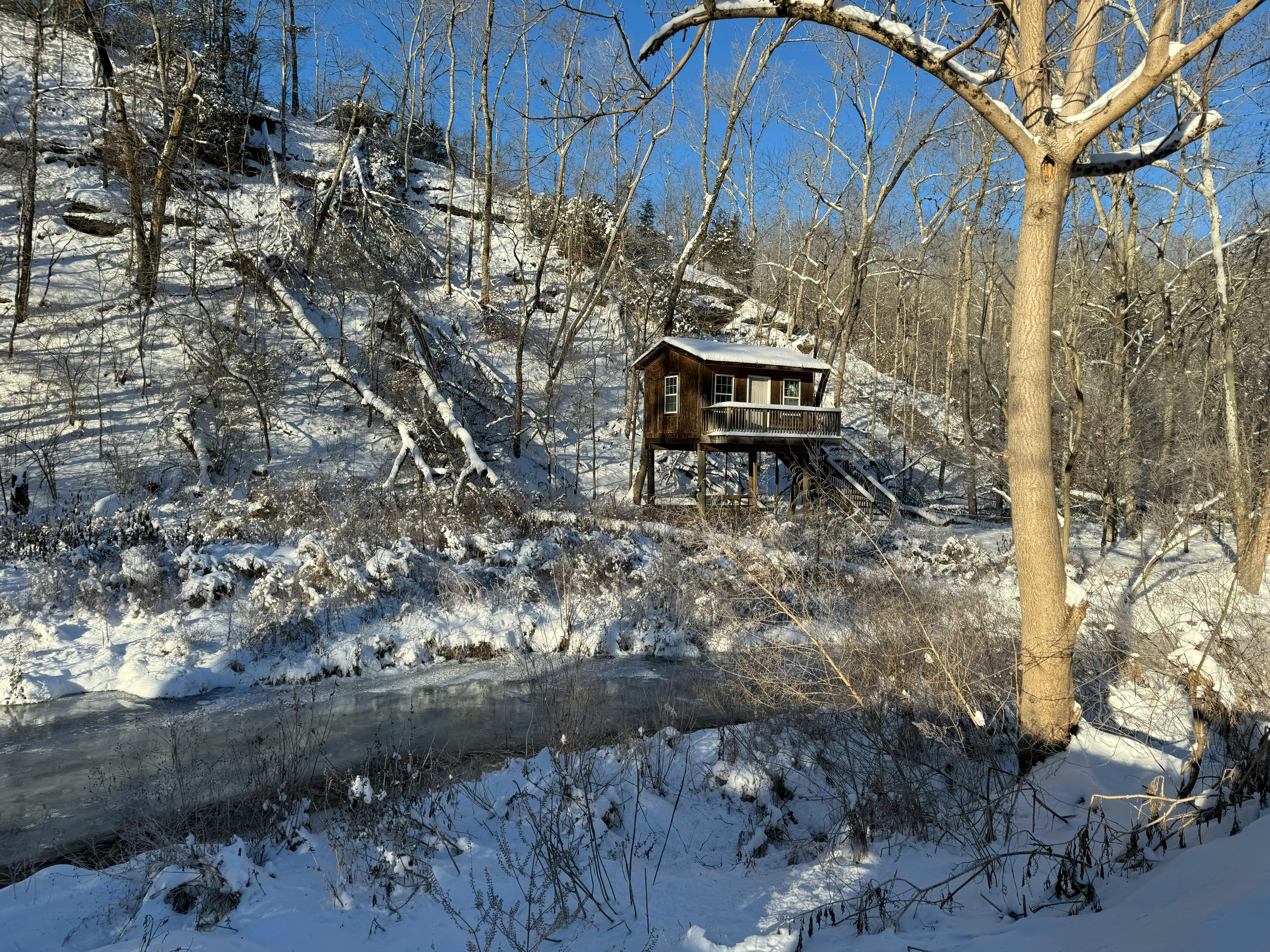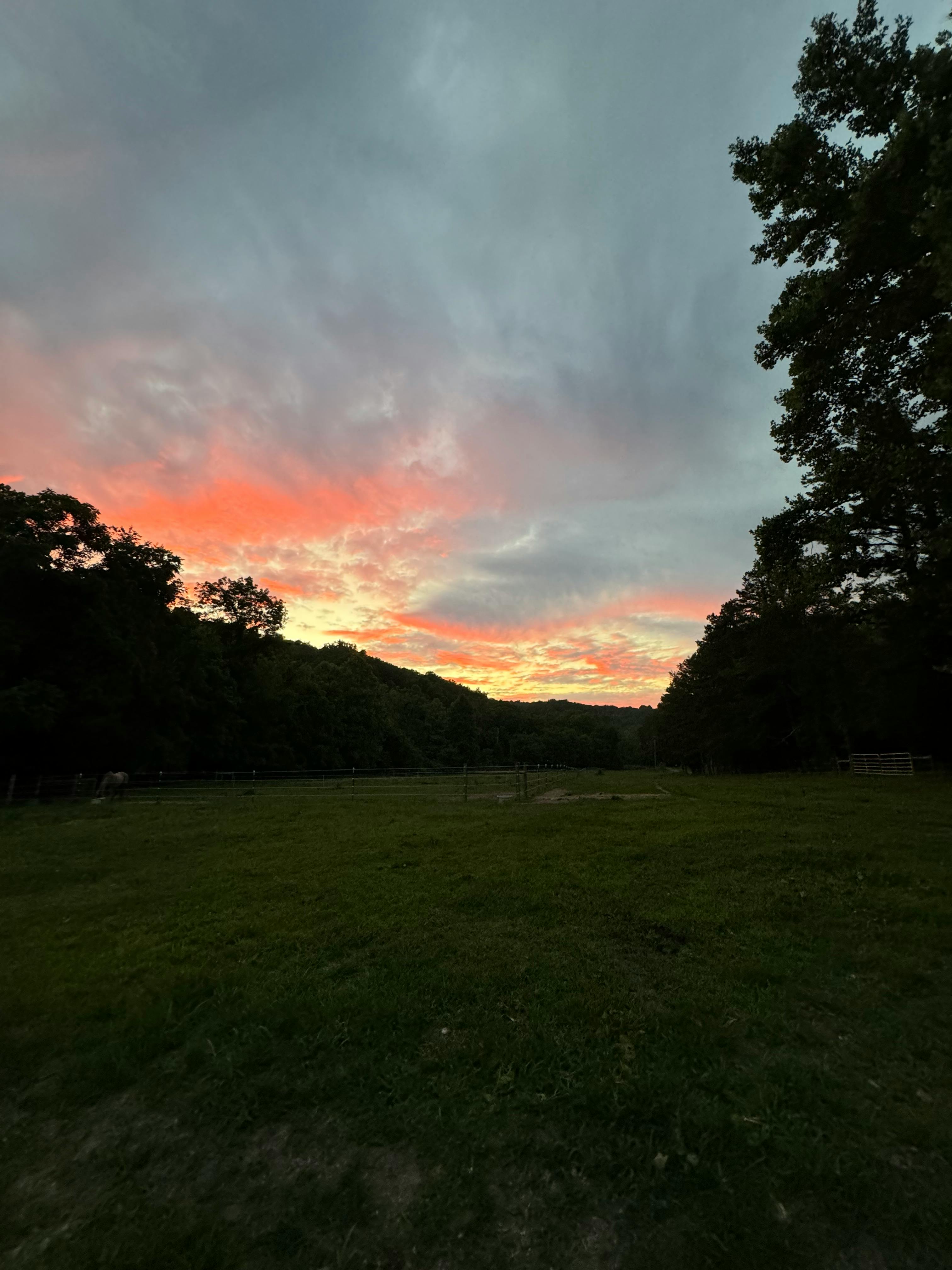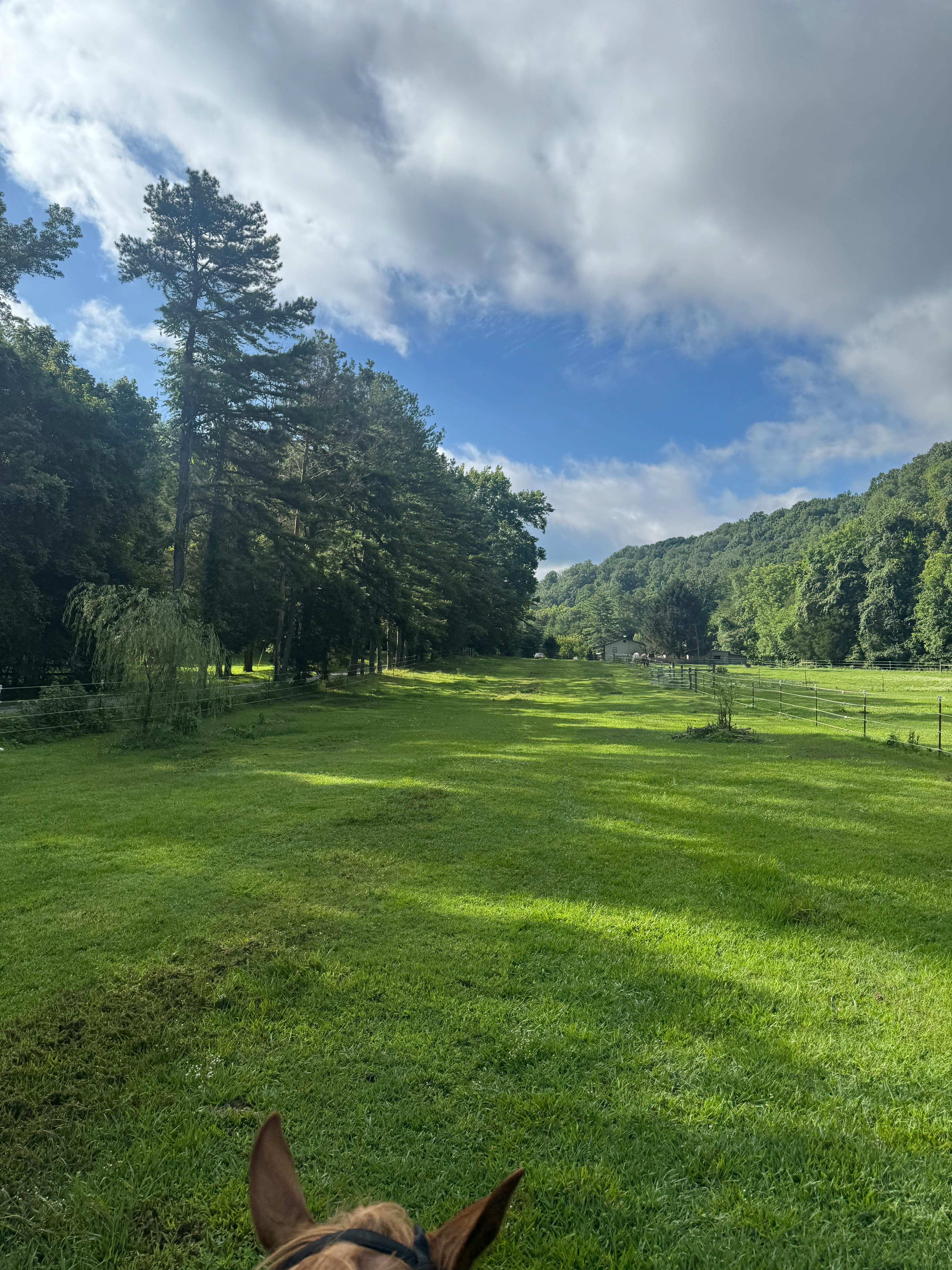 We have 7 acres with a variety of settings: open pastures, woods, treehouse, shallow creek. On our property, we have pet pigs, horses and chickens.