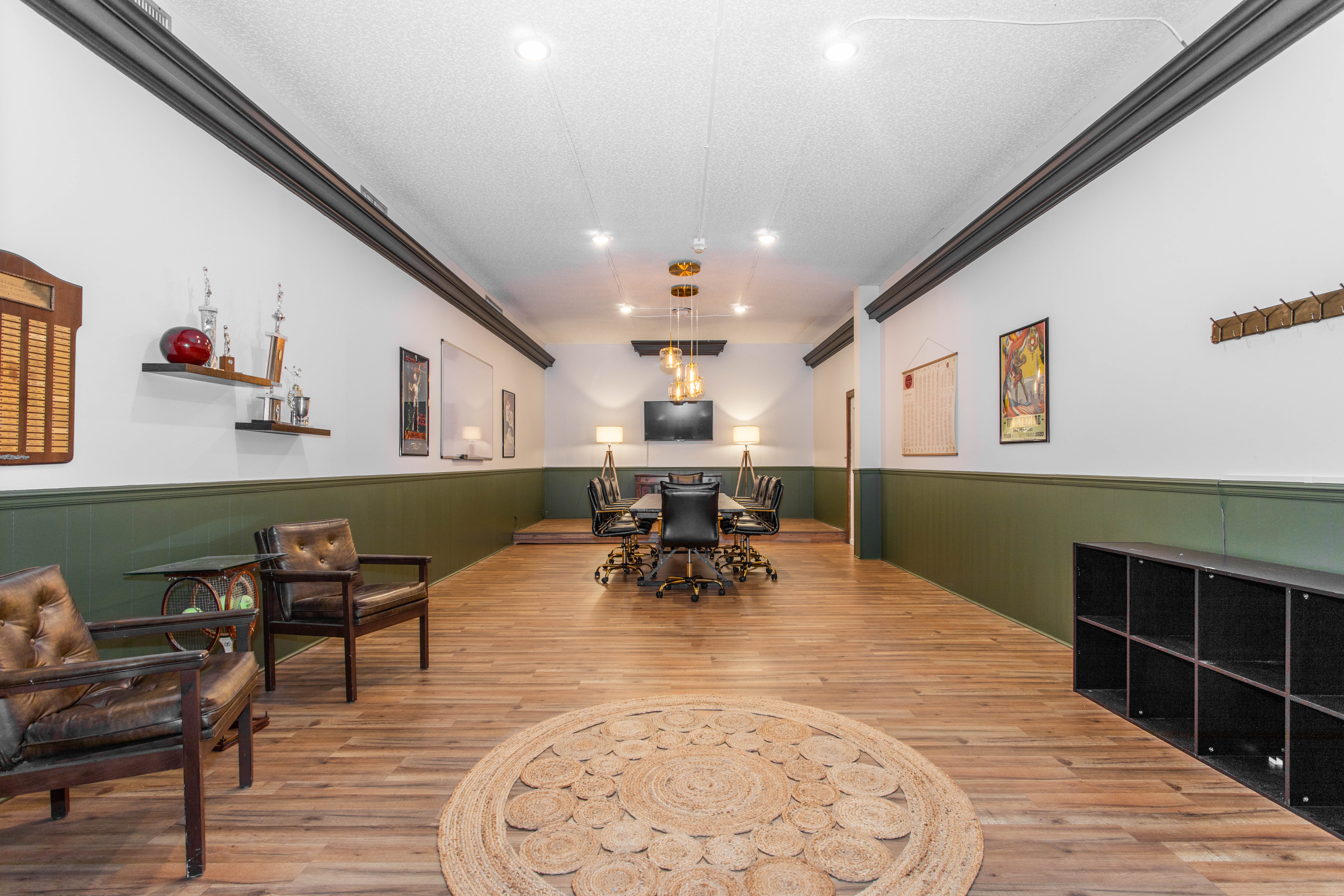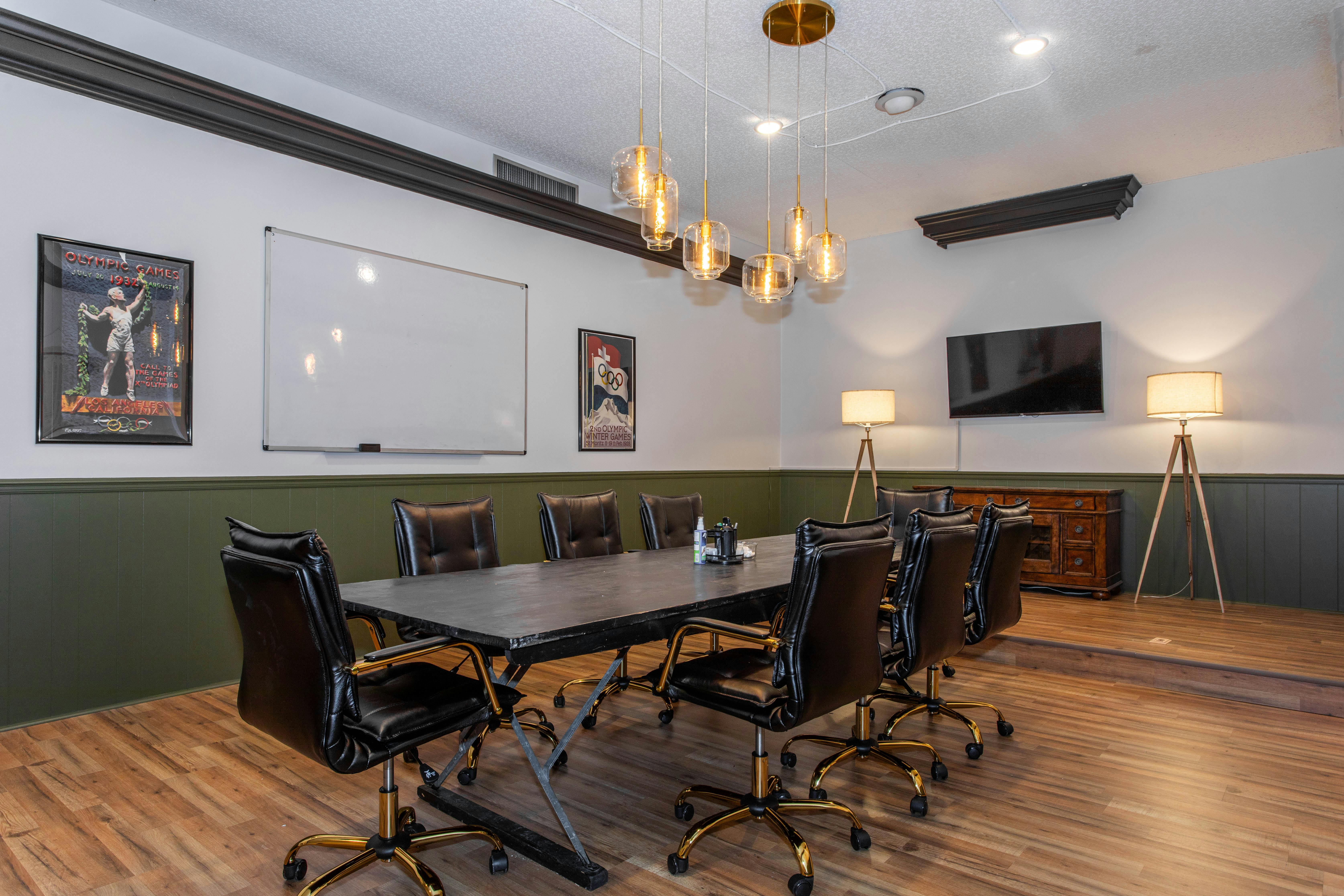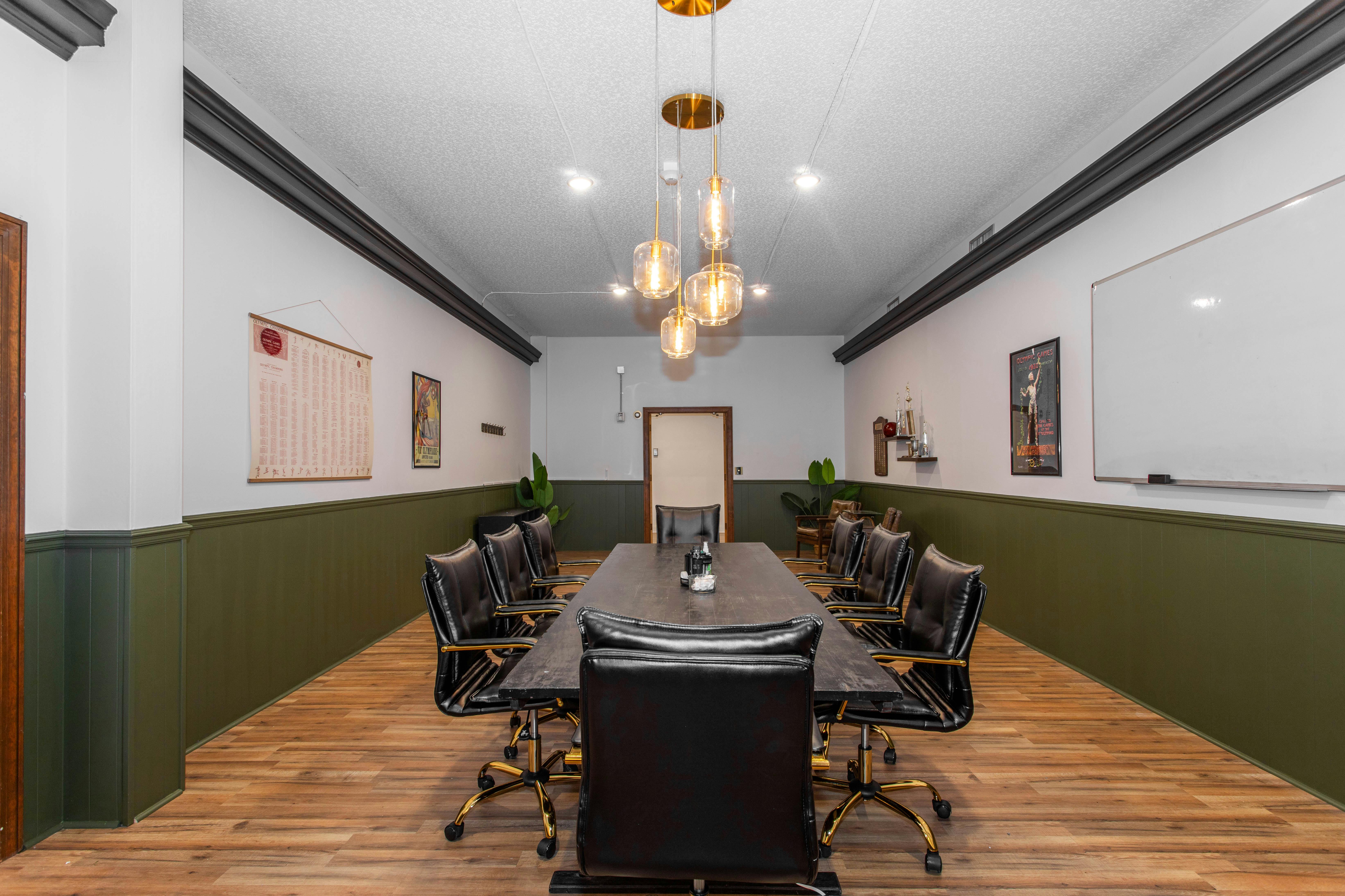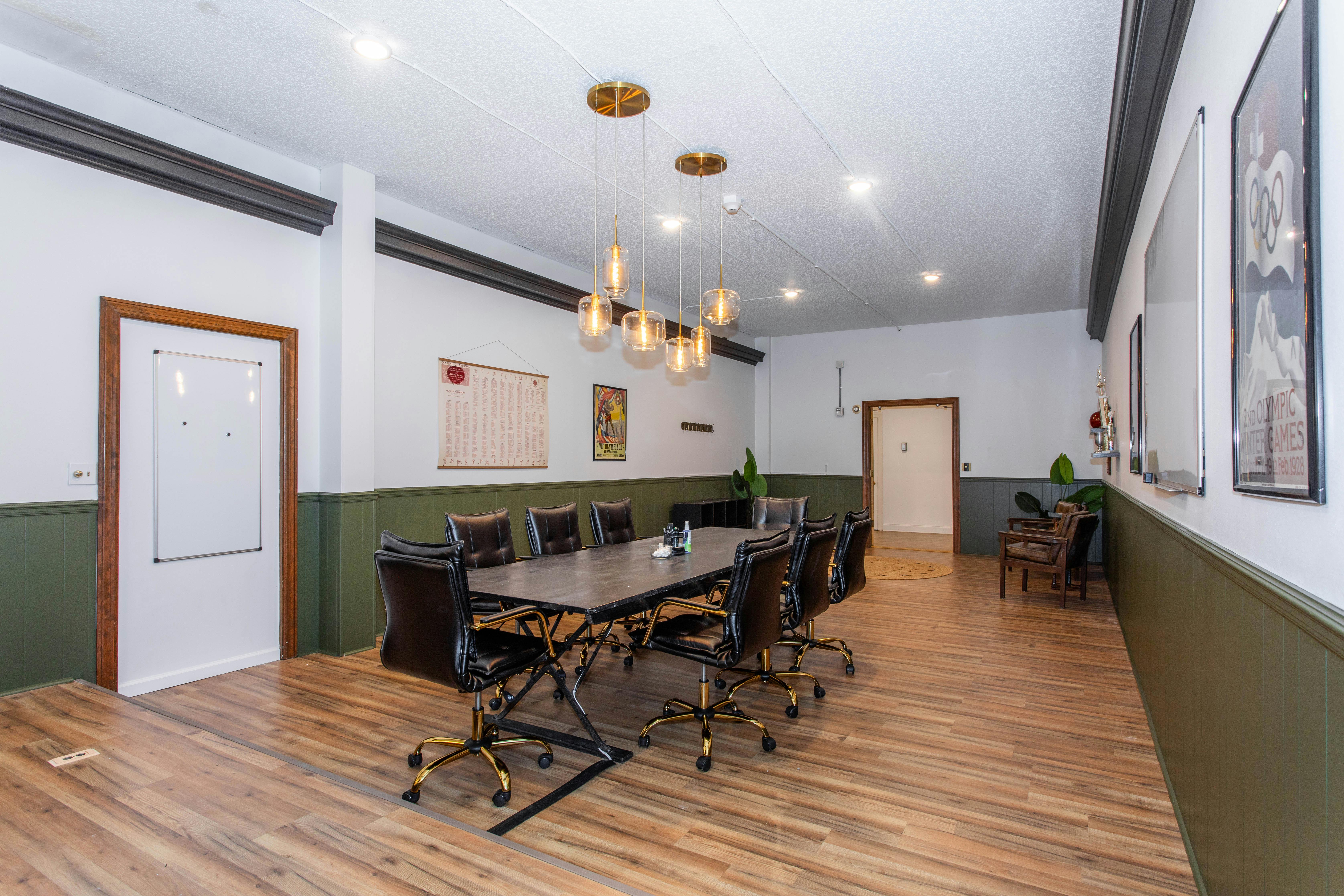 This 8-person conference room offers a professional setting that feels modern and polished, with wood floors and hunter green beadboard adding texture. The space also has great depth and symmetry, making it a great option for shooting interviews or corporate content.