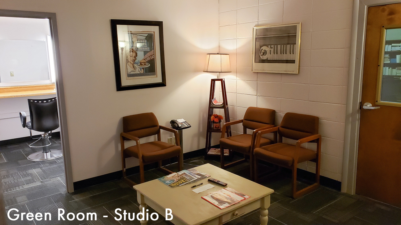 This is our 30’ x 40’ studio that includes a 15’ grid as well as an attached green room. Backdrops and green screen are available upon request. There is a large set-up area with kitchenette.