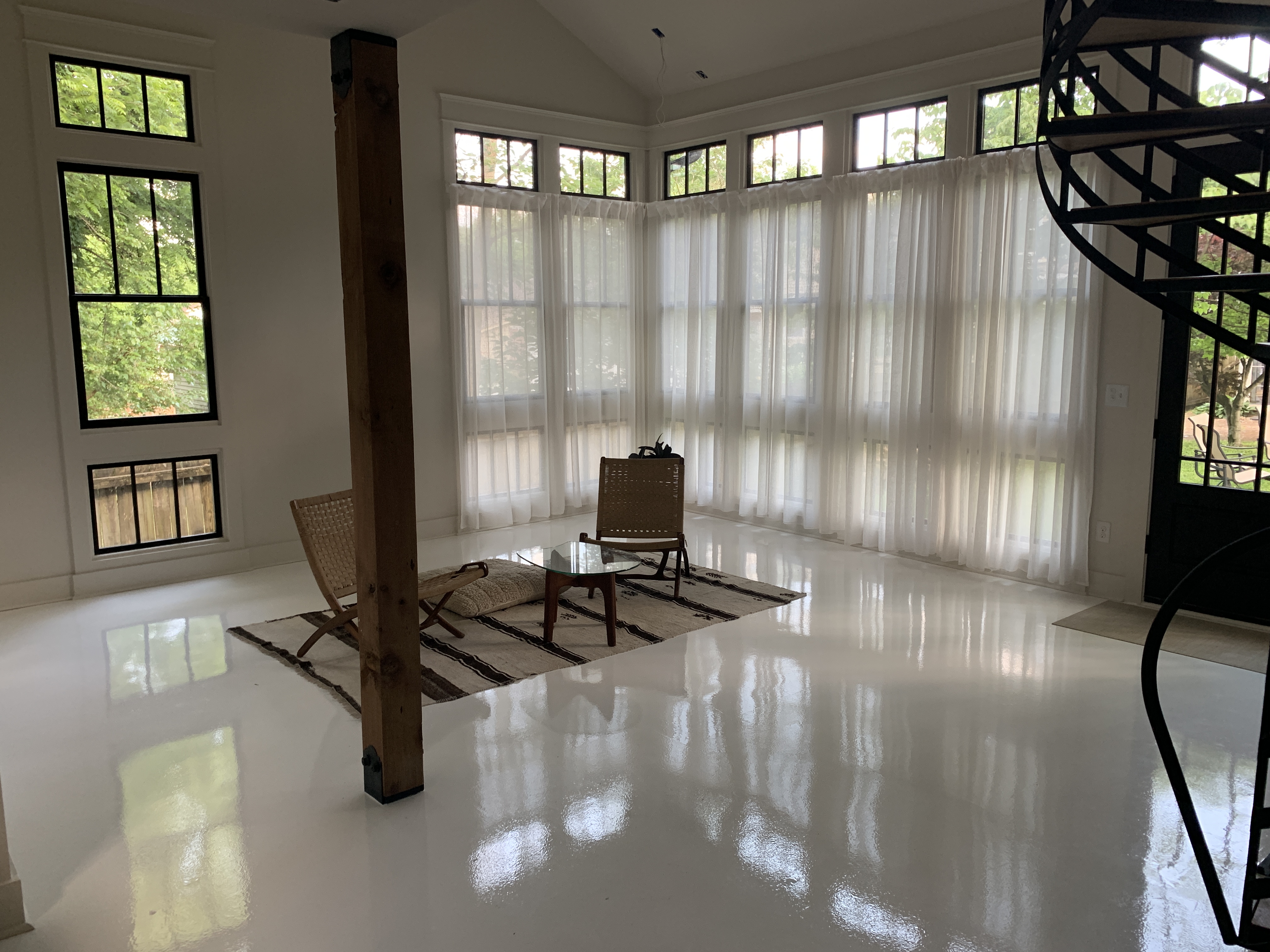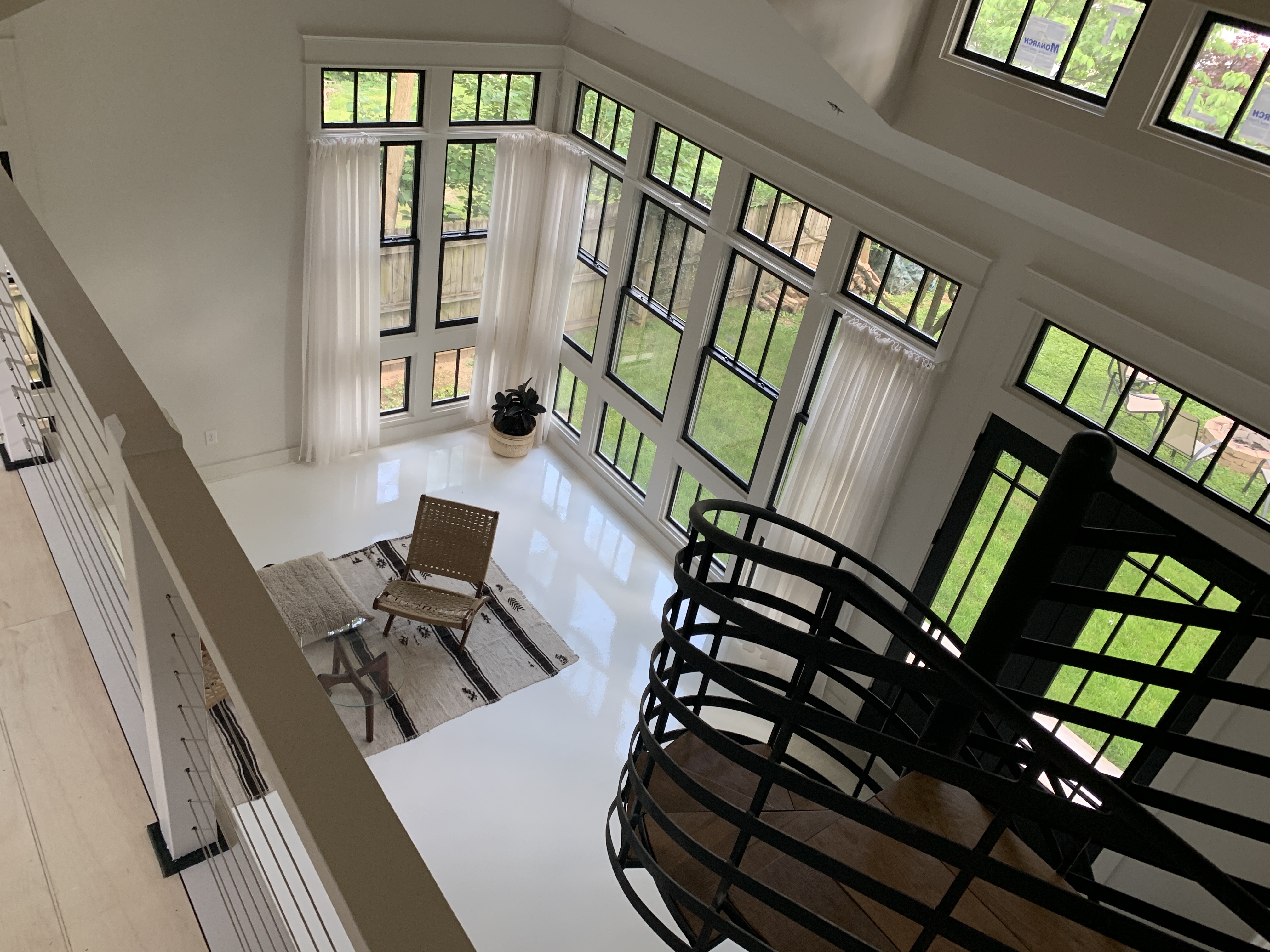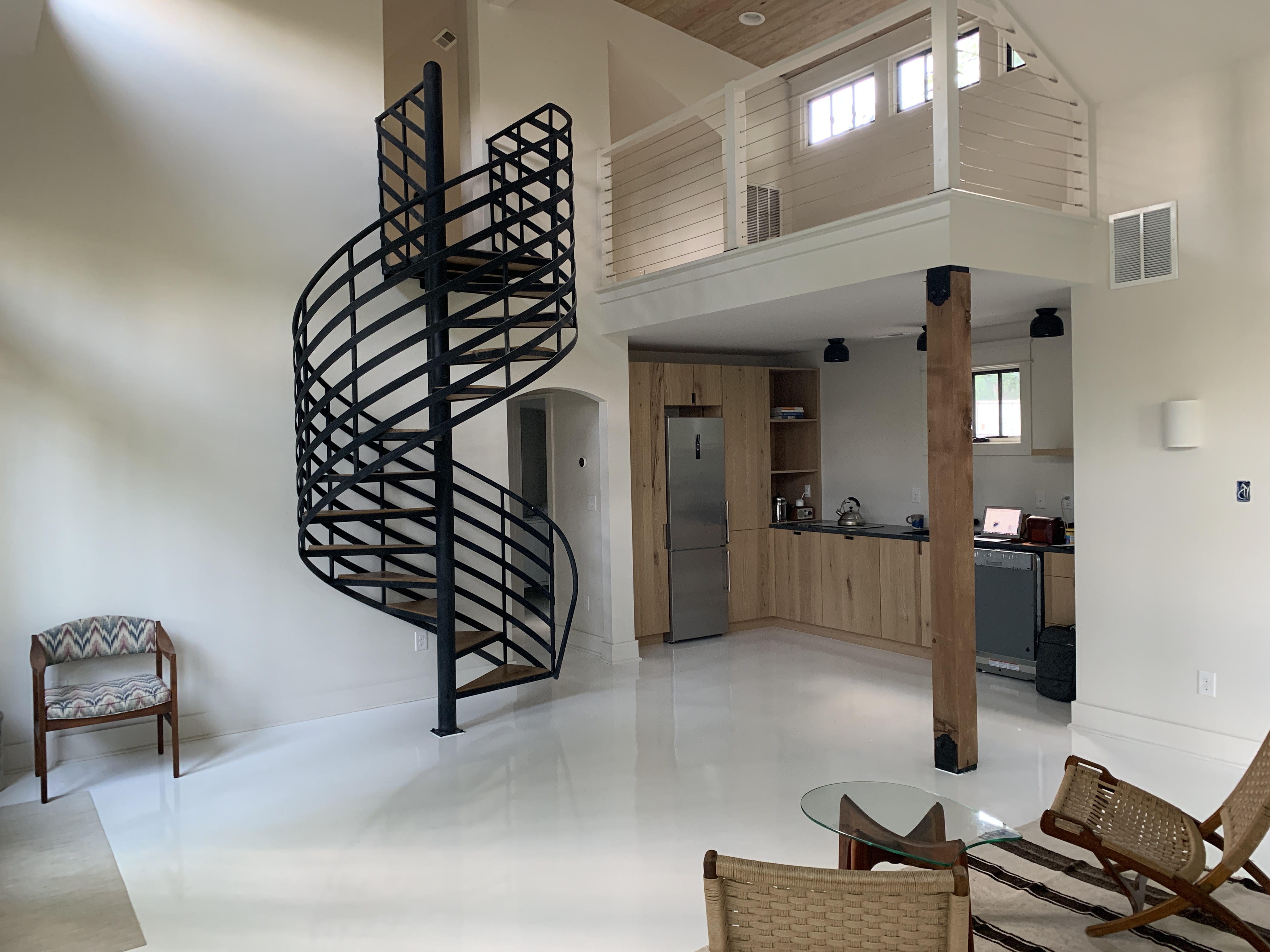 Located in the heart of Lockland Springs our Modern Loft Casita is an interior designed space w/ 18 foot ceilings & beautiful white epoxy floors. The corner wall of windows allows for a ton of natural light & is a perfect location for photo / video shoots. The casita also includes a full kitchen, bedroom, bathroom & spiral staircase leading up to the loft space / balcony. Fire pit outside is also available for use :-)
