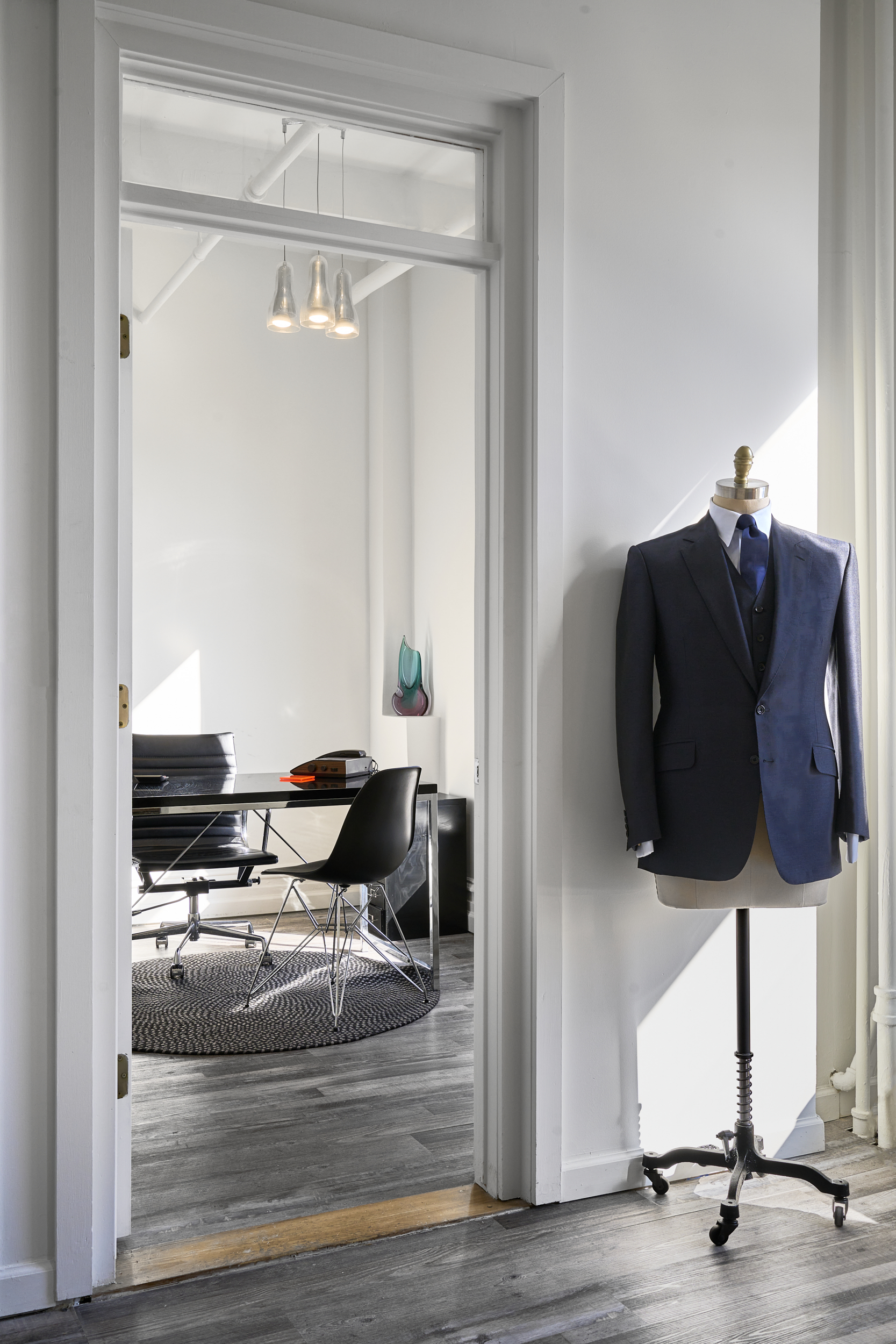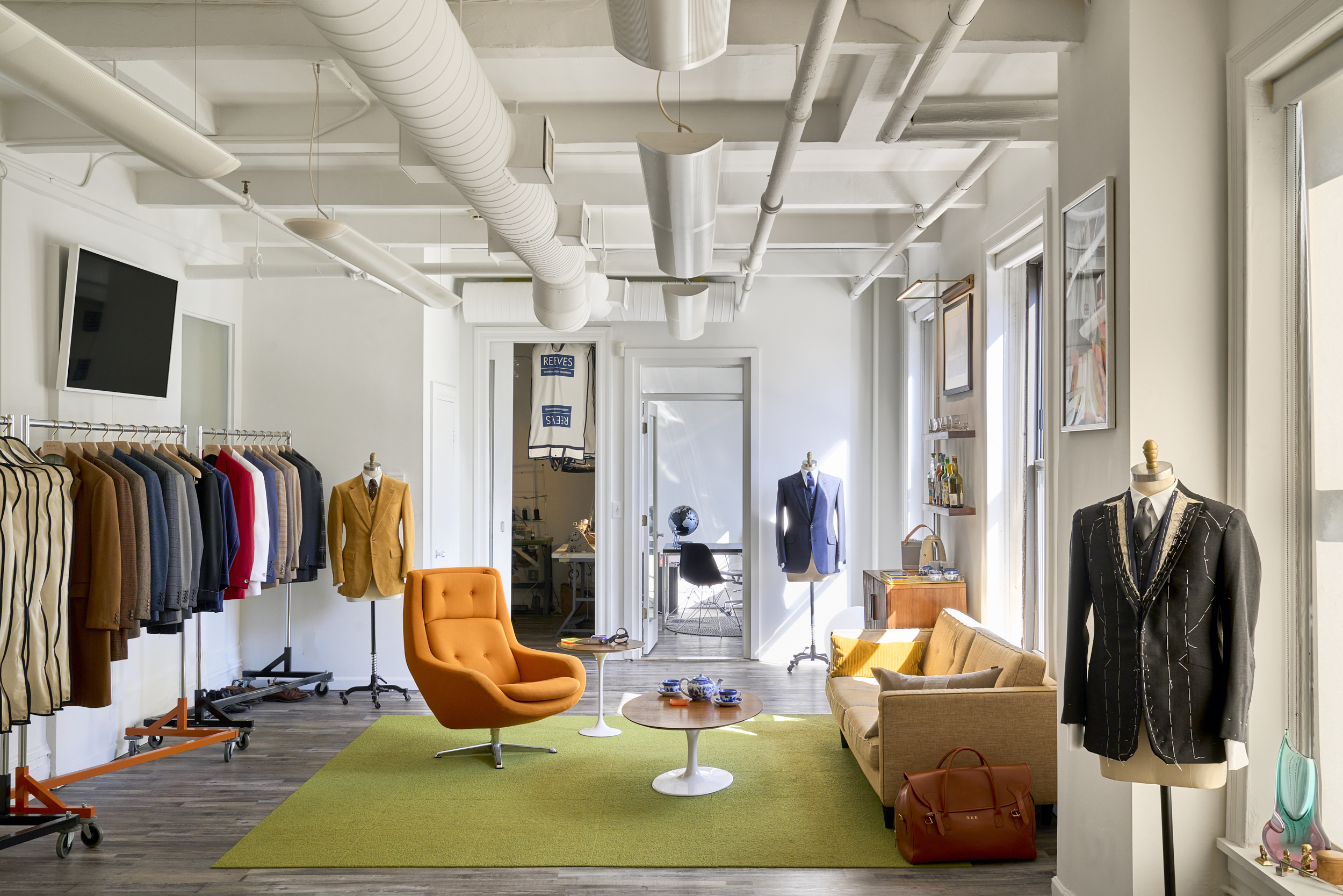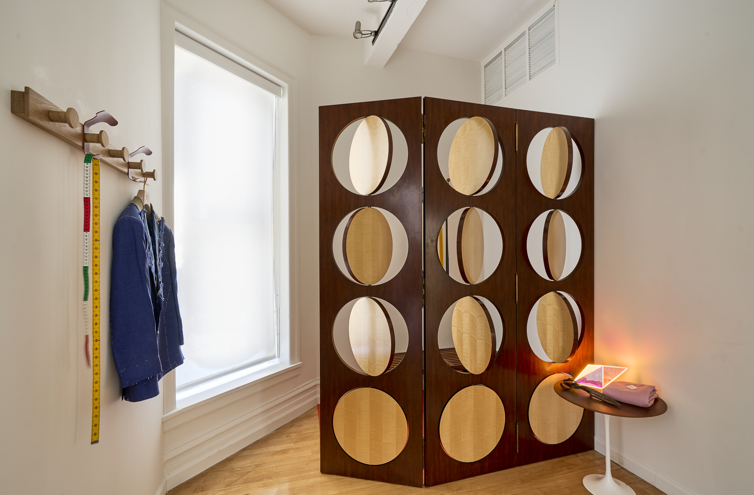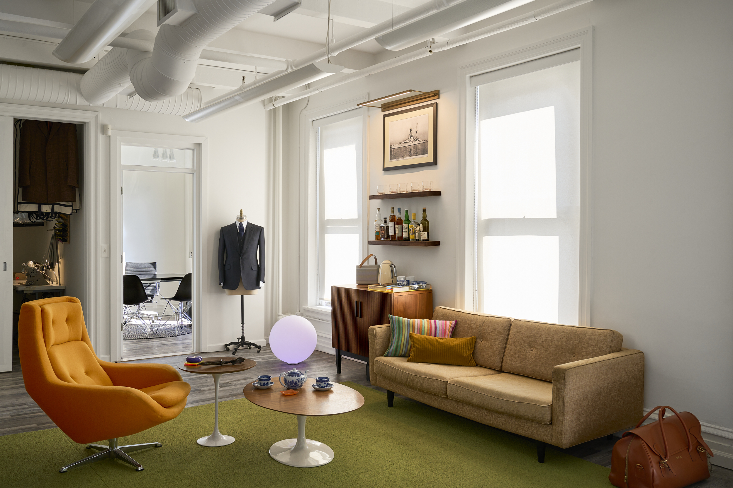 This mid-century-modern tailoring showroom with high-end retro flair boasts high ceilings and plenty of natural light making it a great choice for film productions, editorial photo shoots, celebrity interviews and more.
