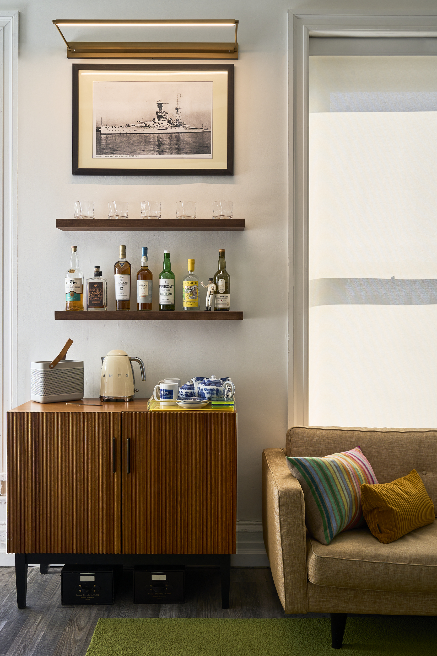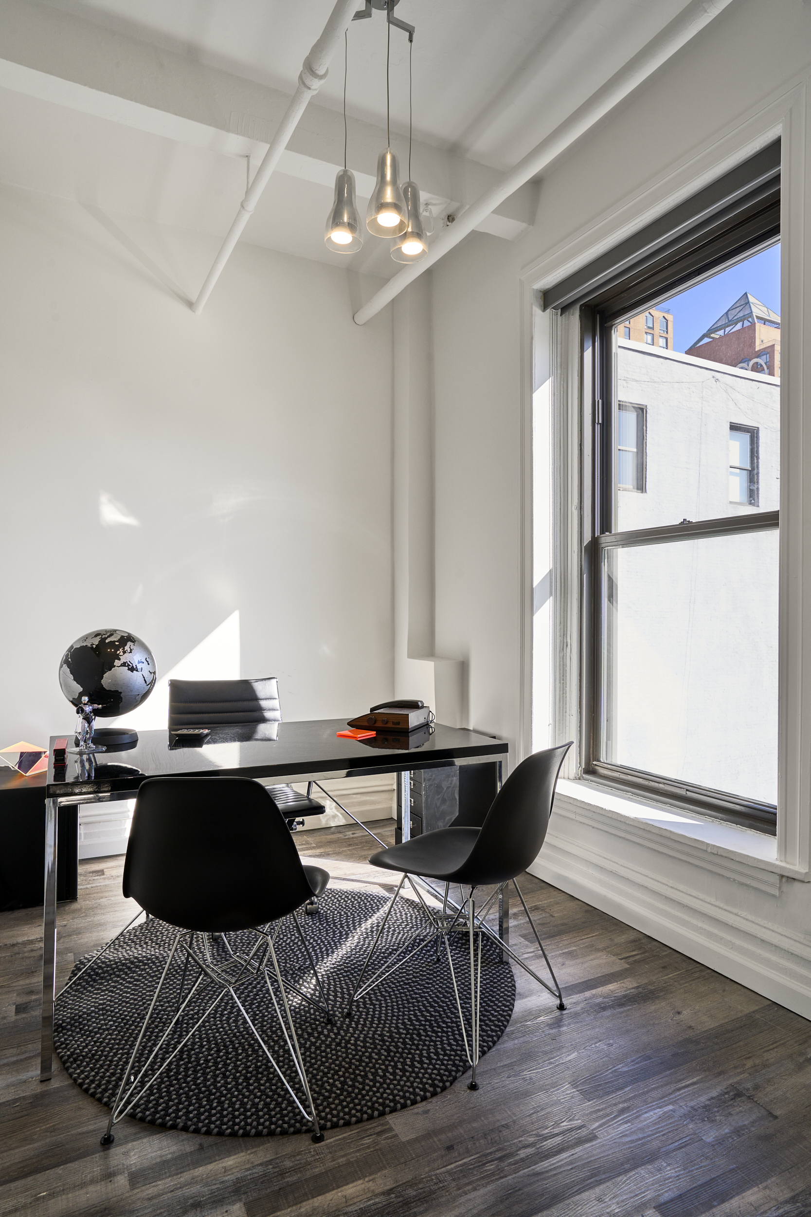 Modernist/retro future themed showroom/design studio with small tailor shop, large changing room, small office and large open central space with excellent lighting and six large windows. Furniture has a french modernist look.