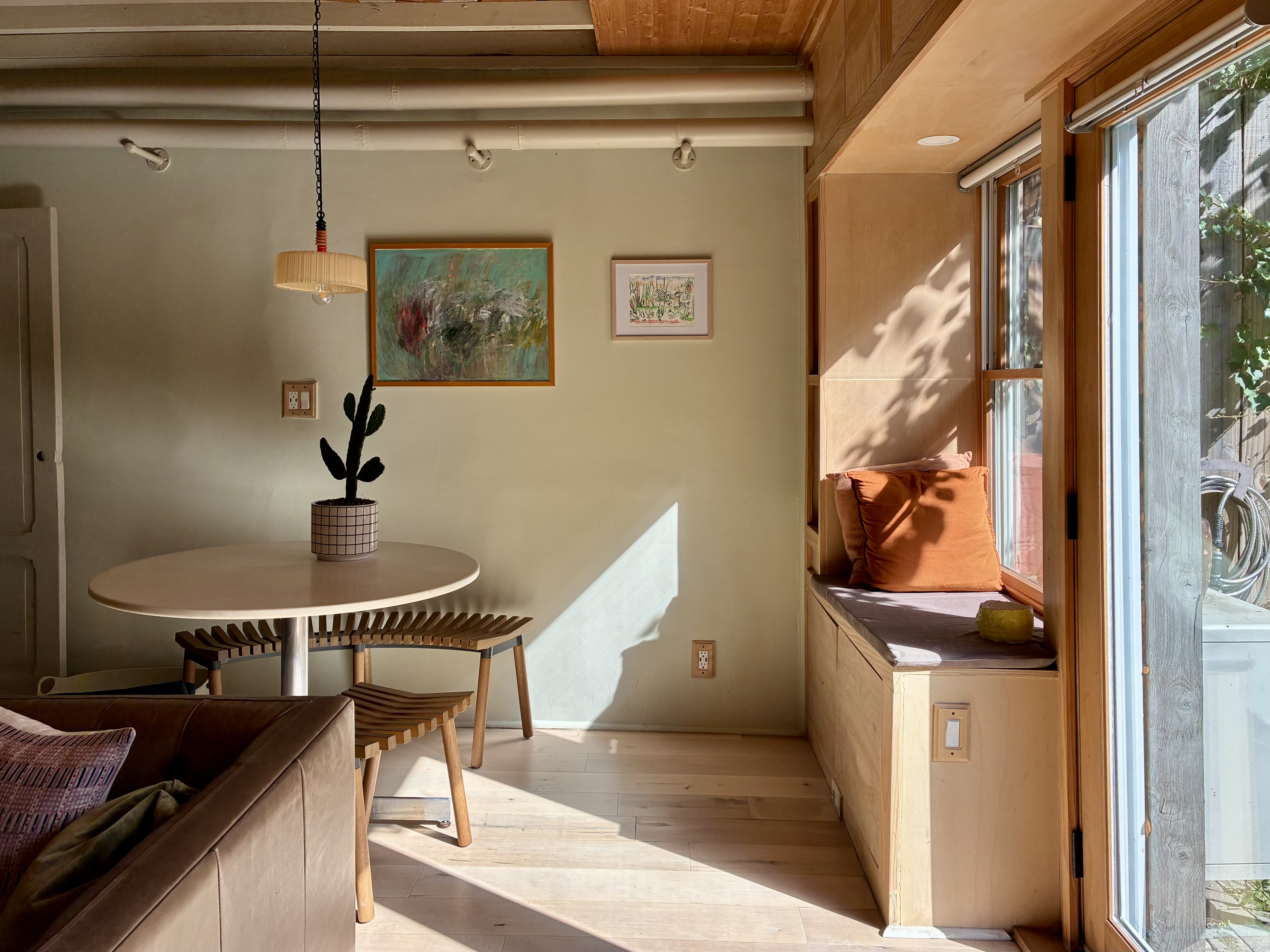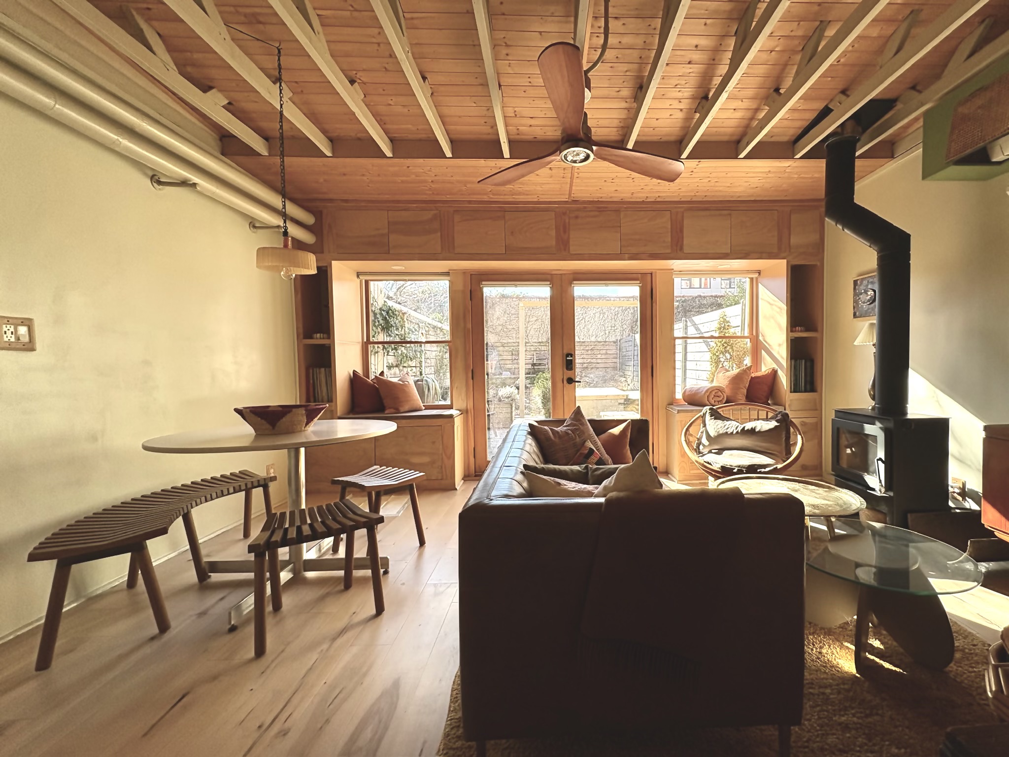 The back of the house faces directly South and gets beautiful natural light throughout the day through a large window. The amount of light can be controlled with the pocket doors that separate the North Parlor from the South Parlor, and the light that comes in through that windows in the North Parlor can be blocked out with the drop-down backdrop that is mounted on the ceiling.