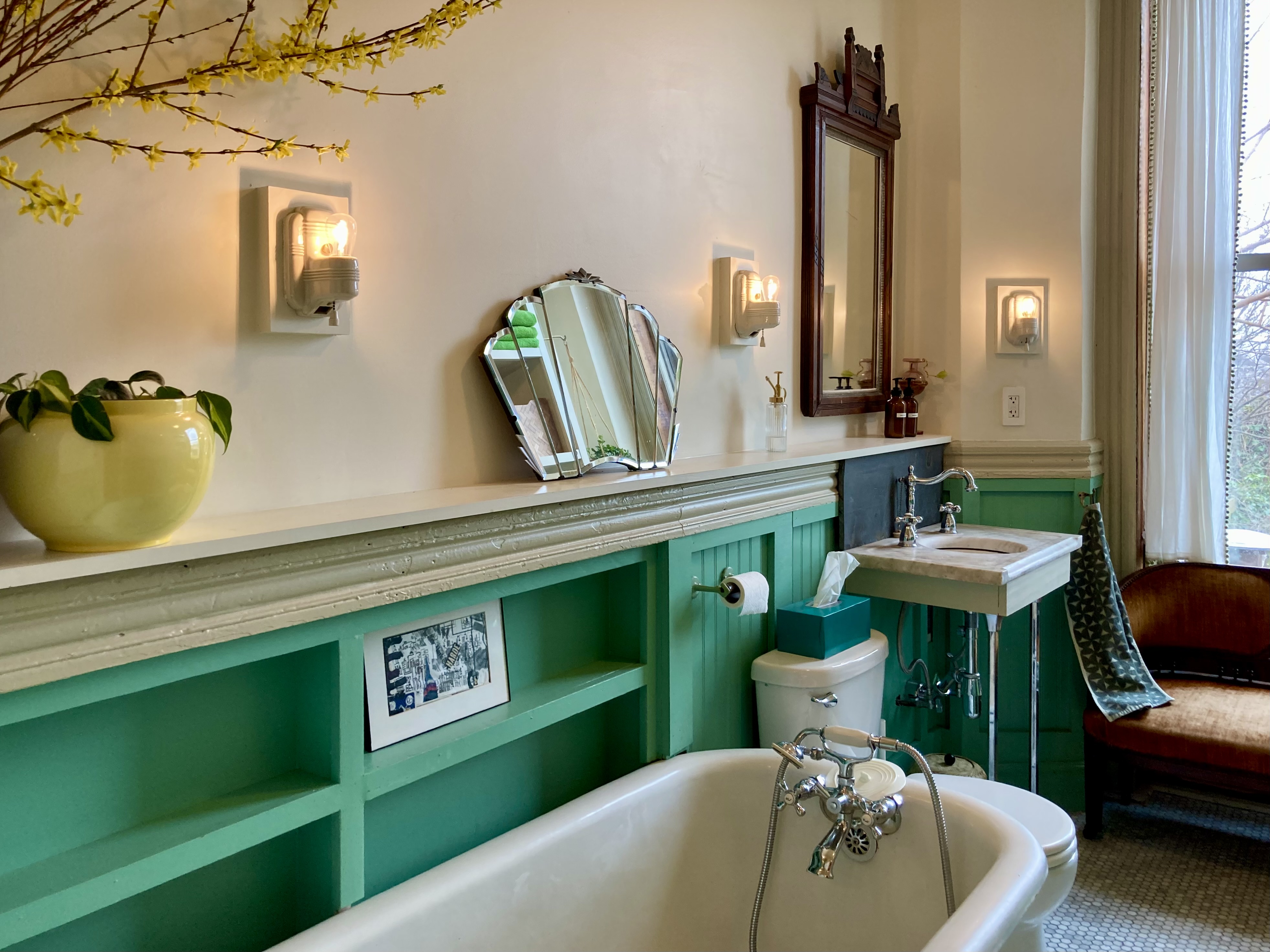 There is a bathroom on each floor. The bathroom on the Parlor Floor has a clawfoot tub.