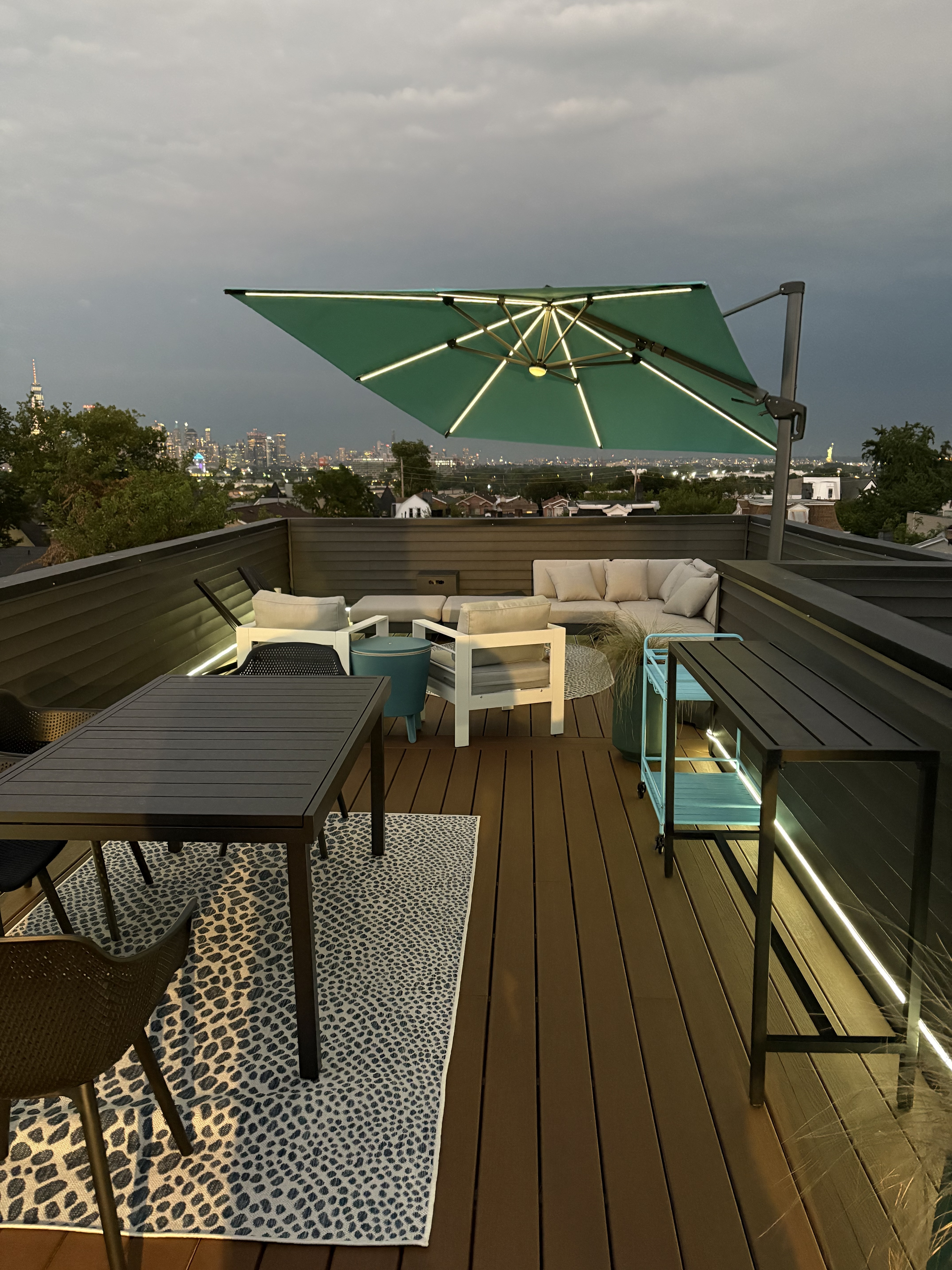 The space features abundant natural light throughout the day, especially in the open-concept living, dining, and kitchen areas. Large windows allow for soft, even daylight ideal for photography and video. The primary bedroom includes blackout curtains for light control. Standard overhead lighting is available in each room, with warm, ambient tones. Rooftop area includes linear light strip and lighted umbrellas for evening shoots.