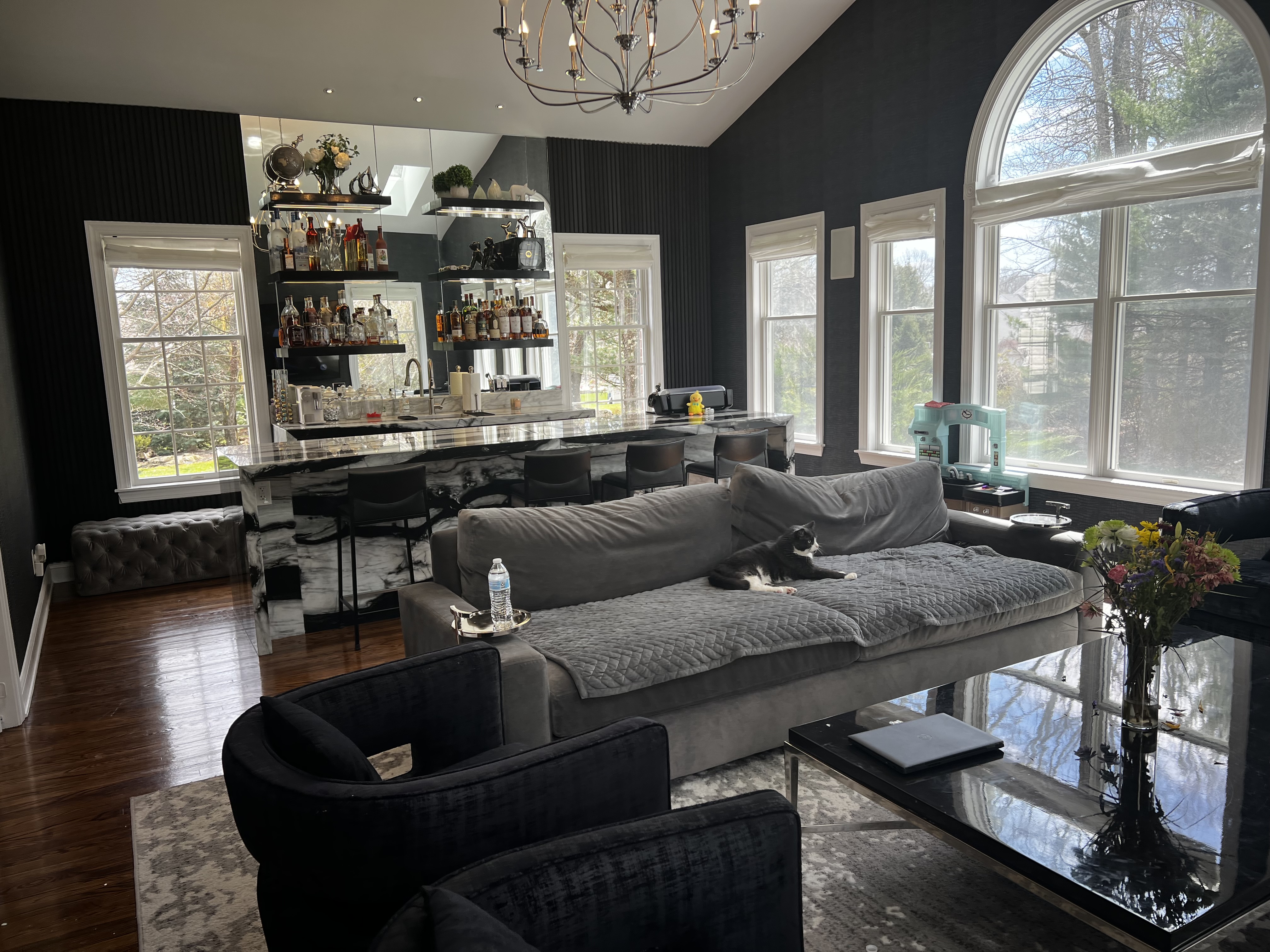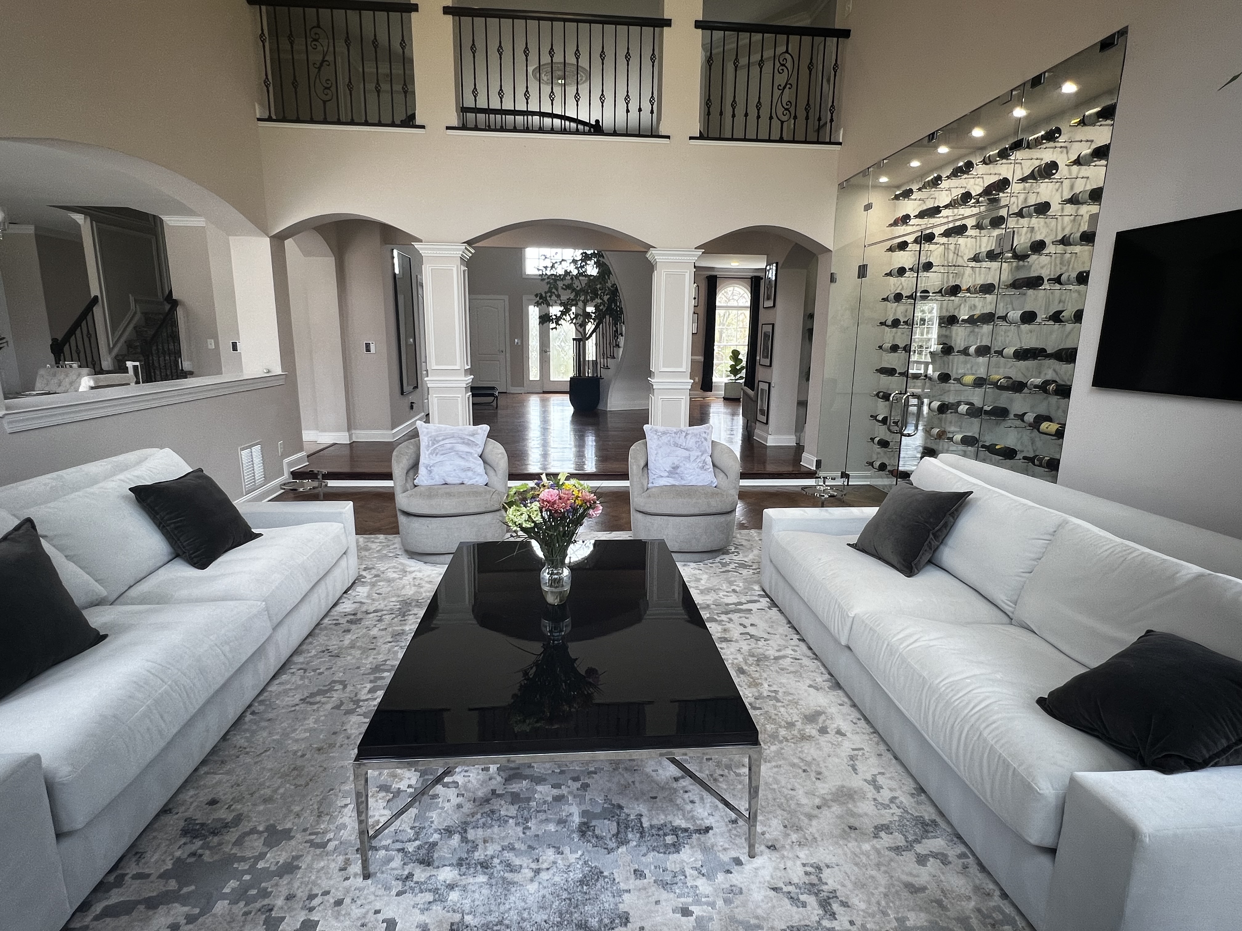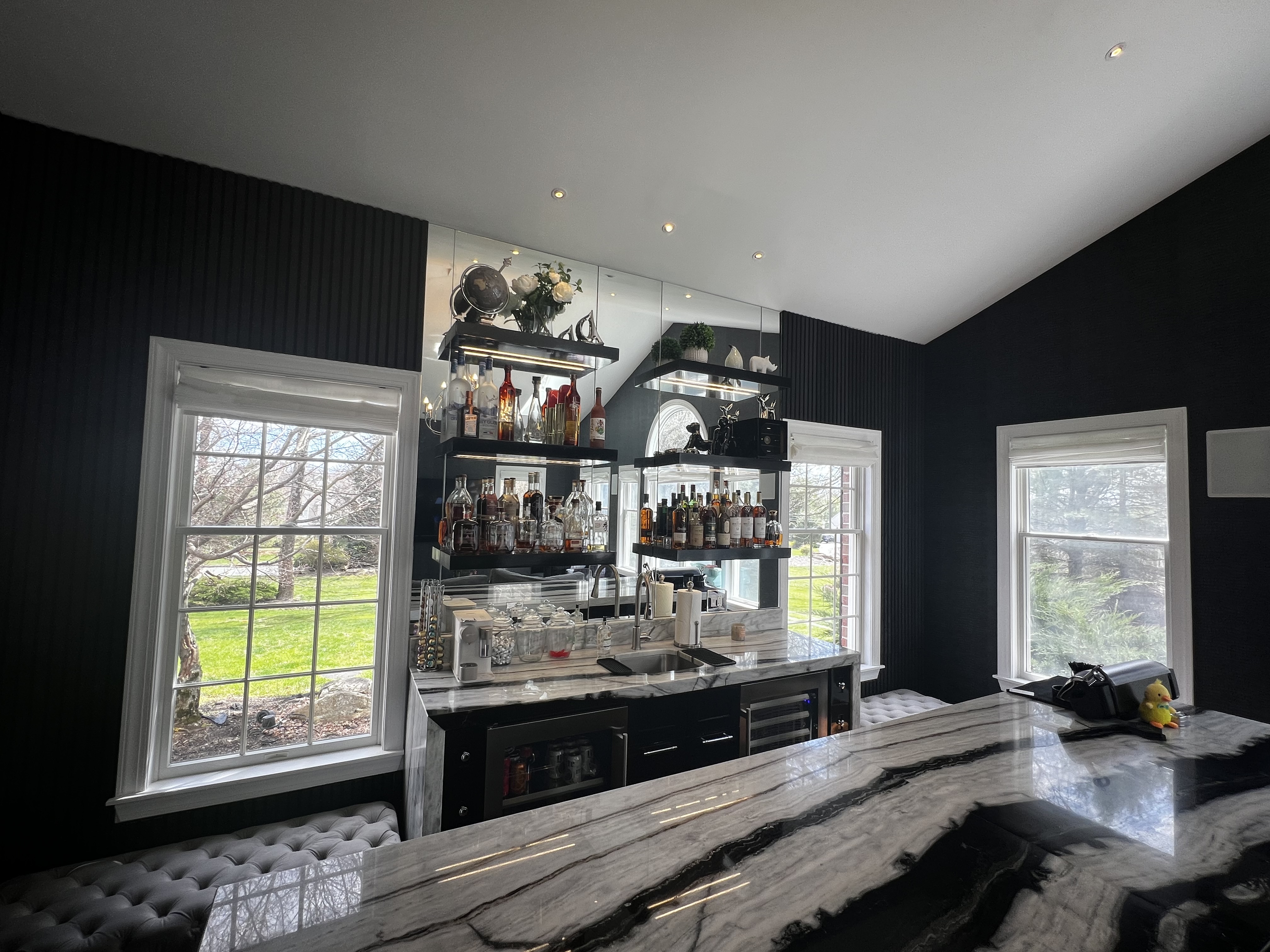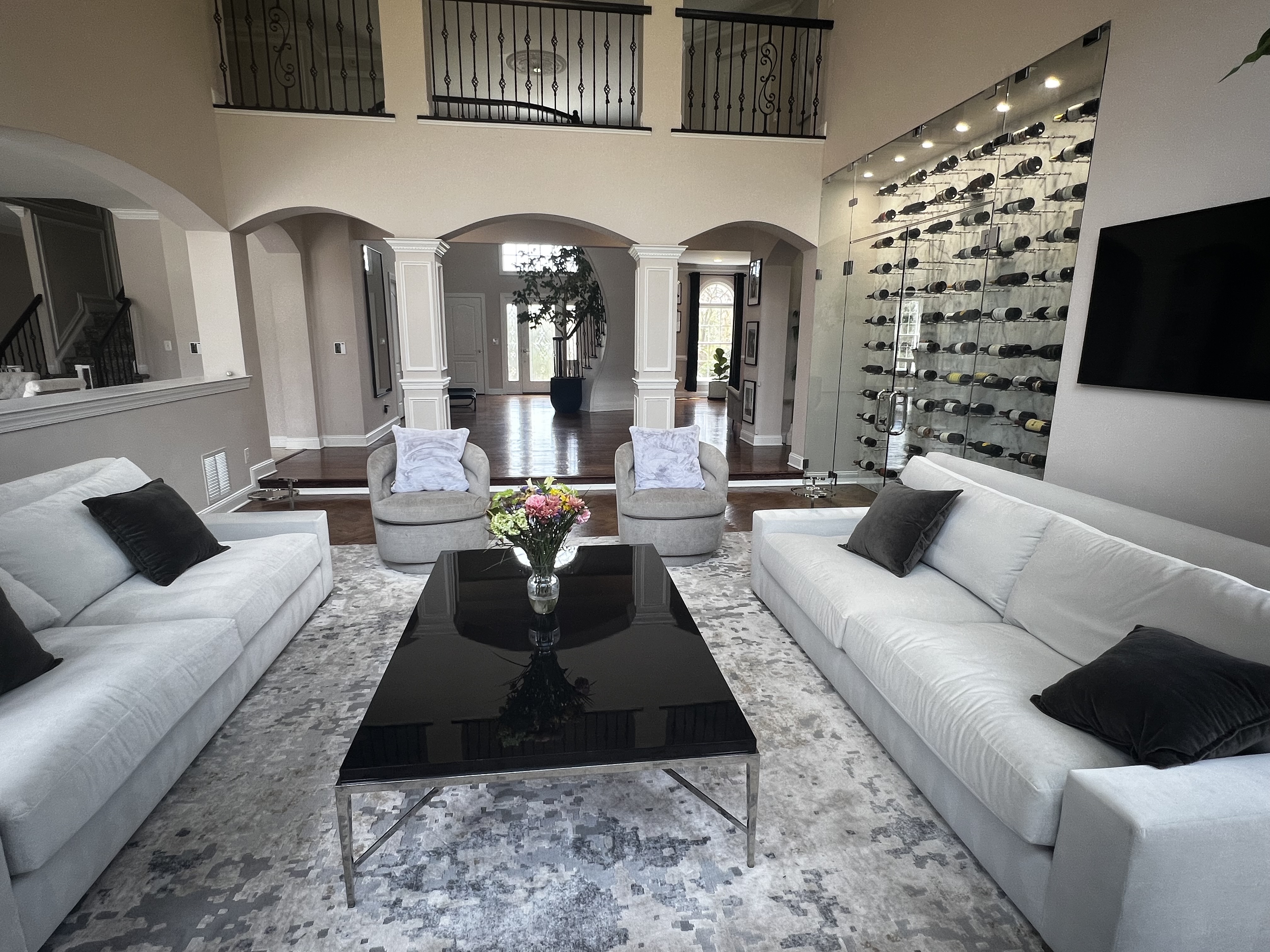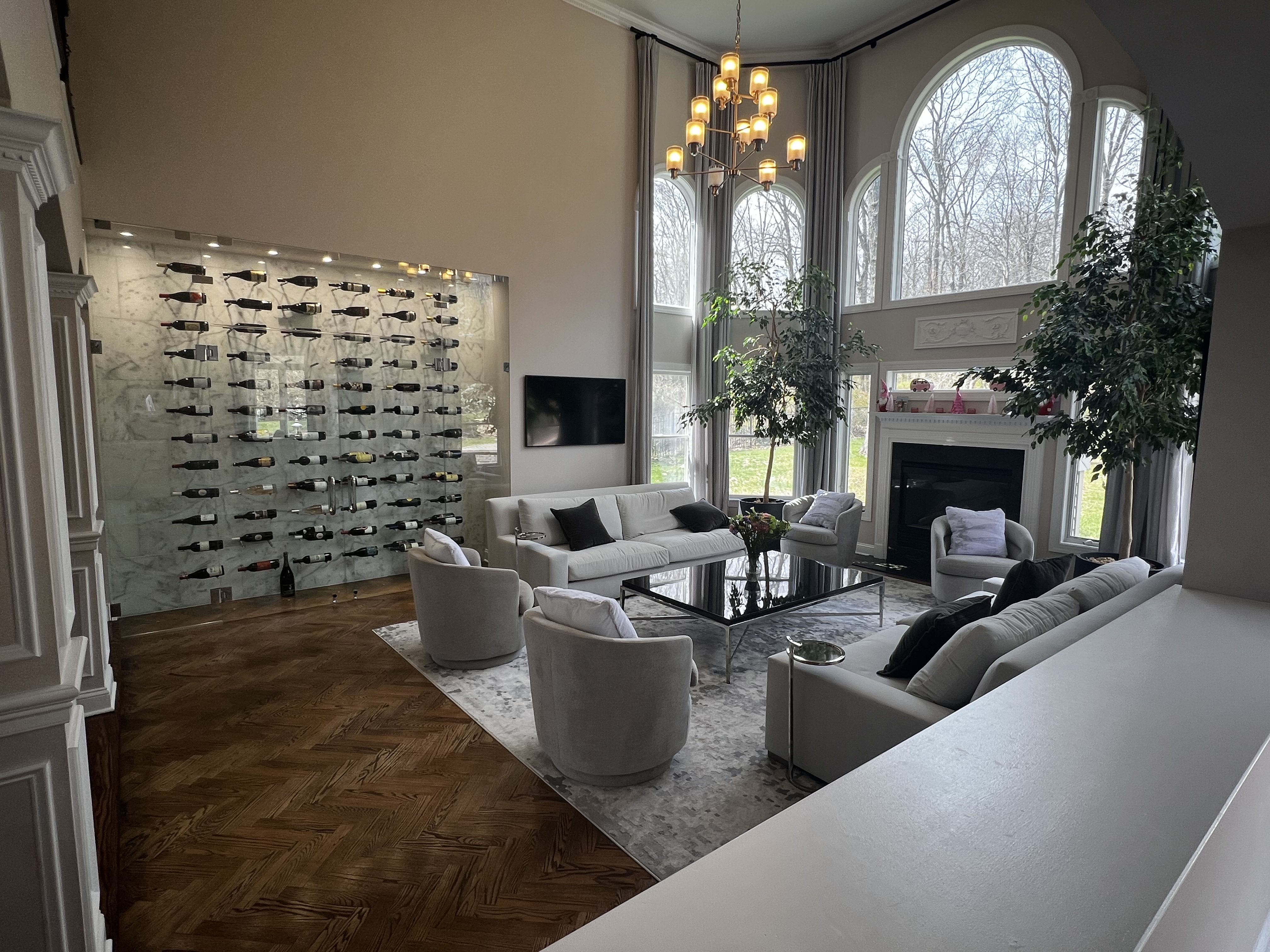 5600 square foot home with custom marble waterfall bar room, glass wine wall with formal living room and fireplace, piano room with baby grand piano, seating for 50 on first floor. First floor is open layout.