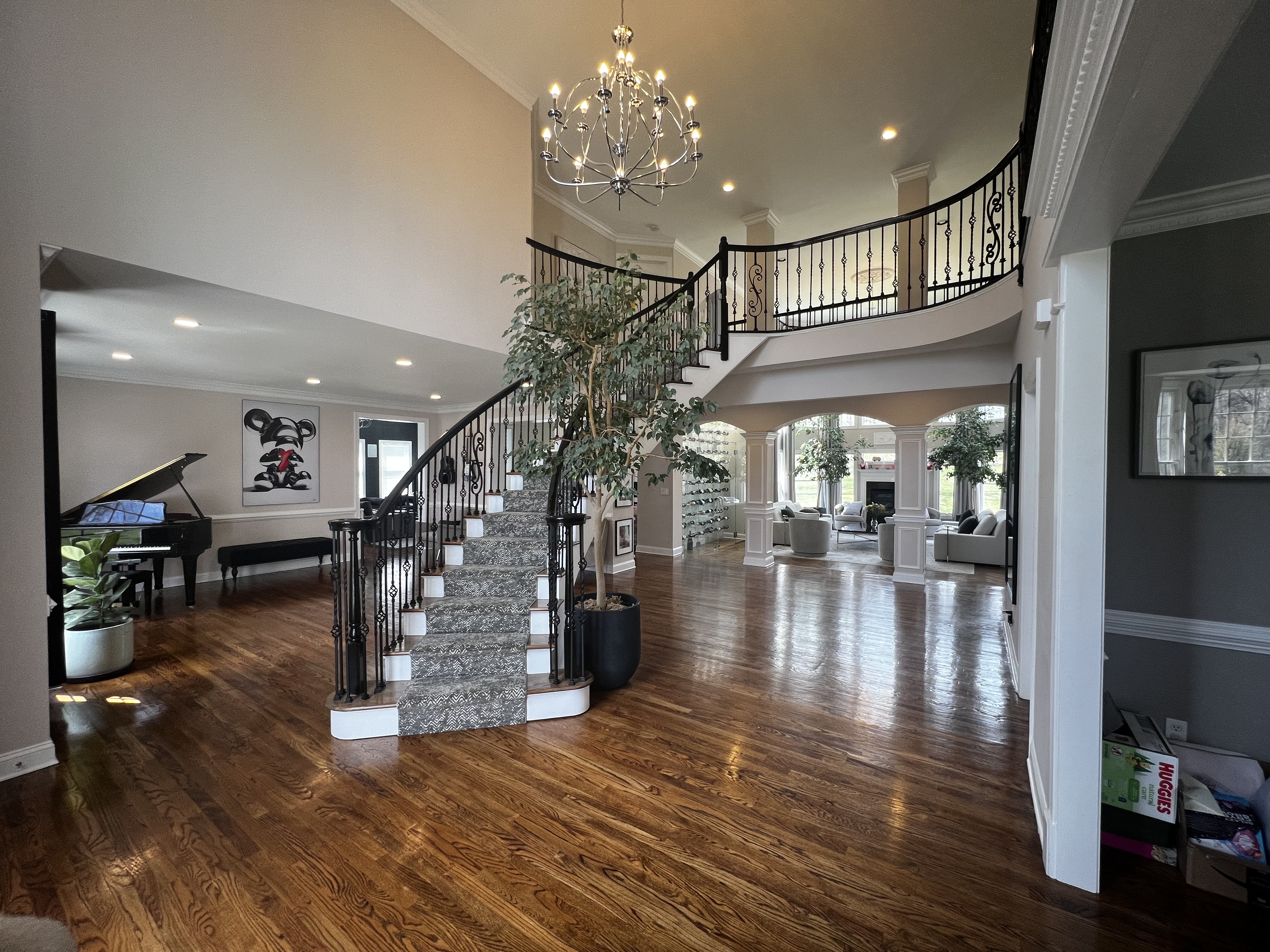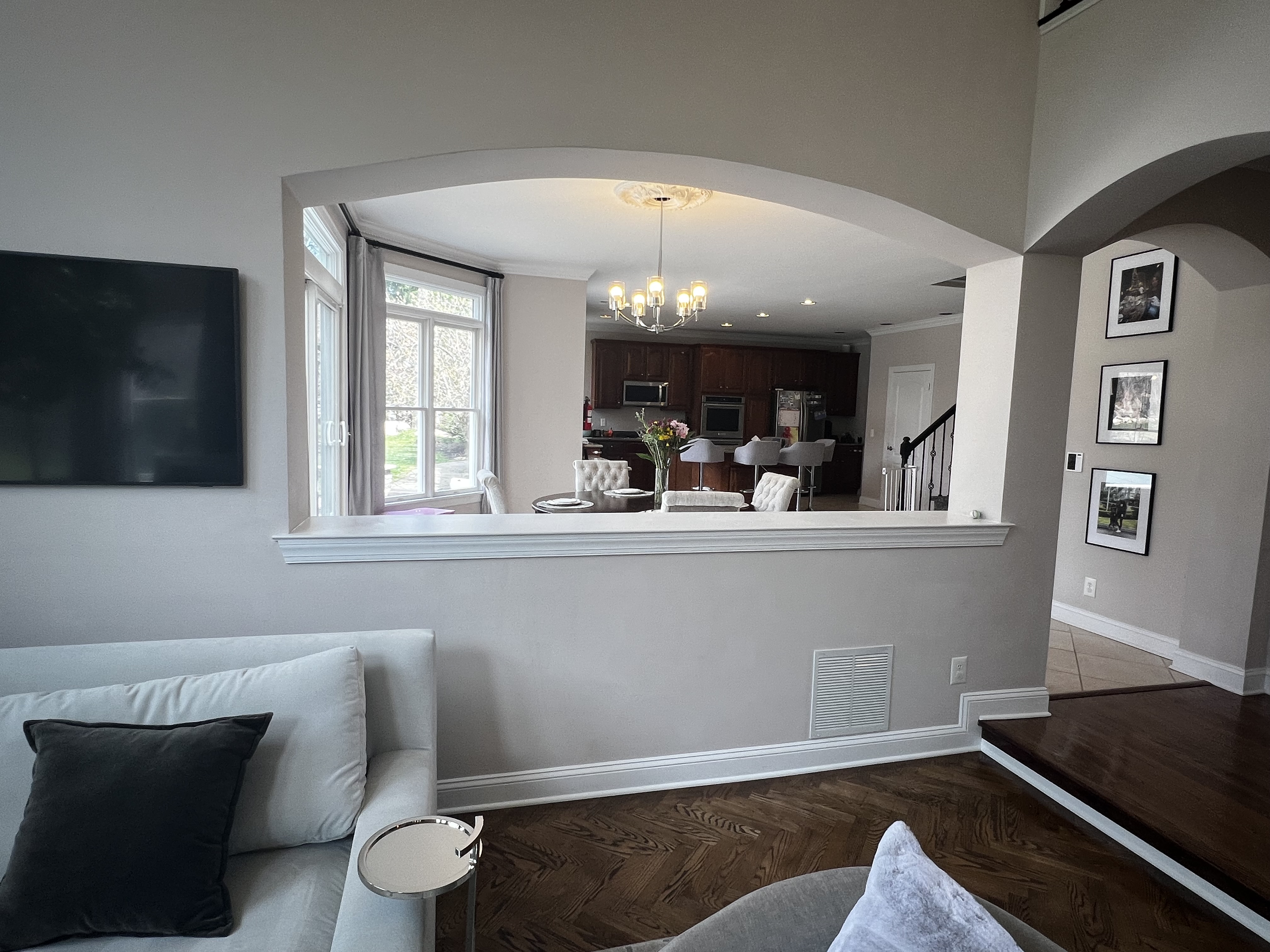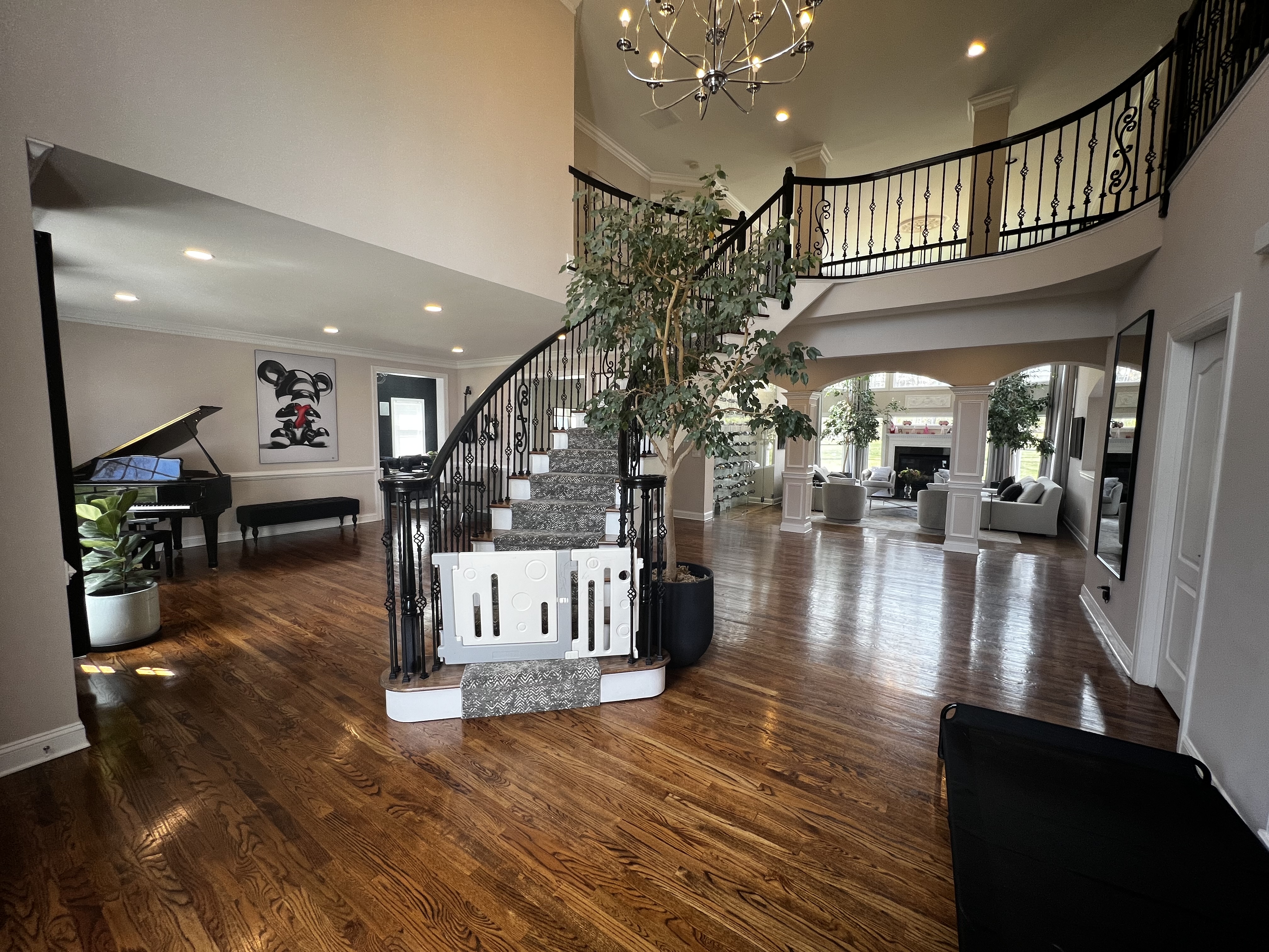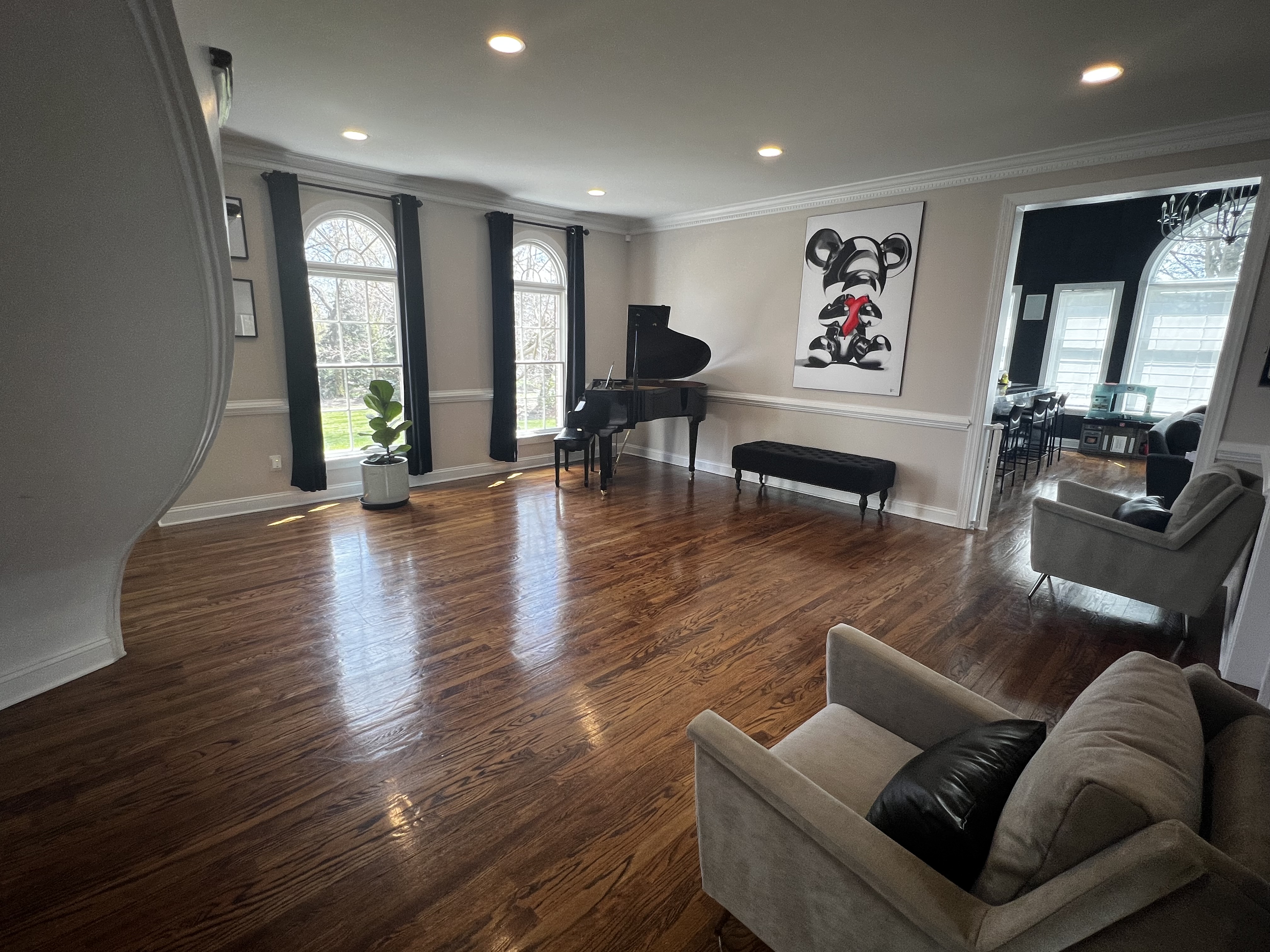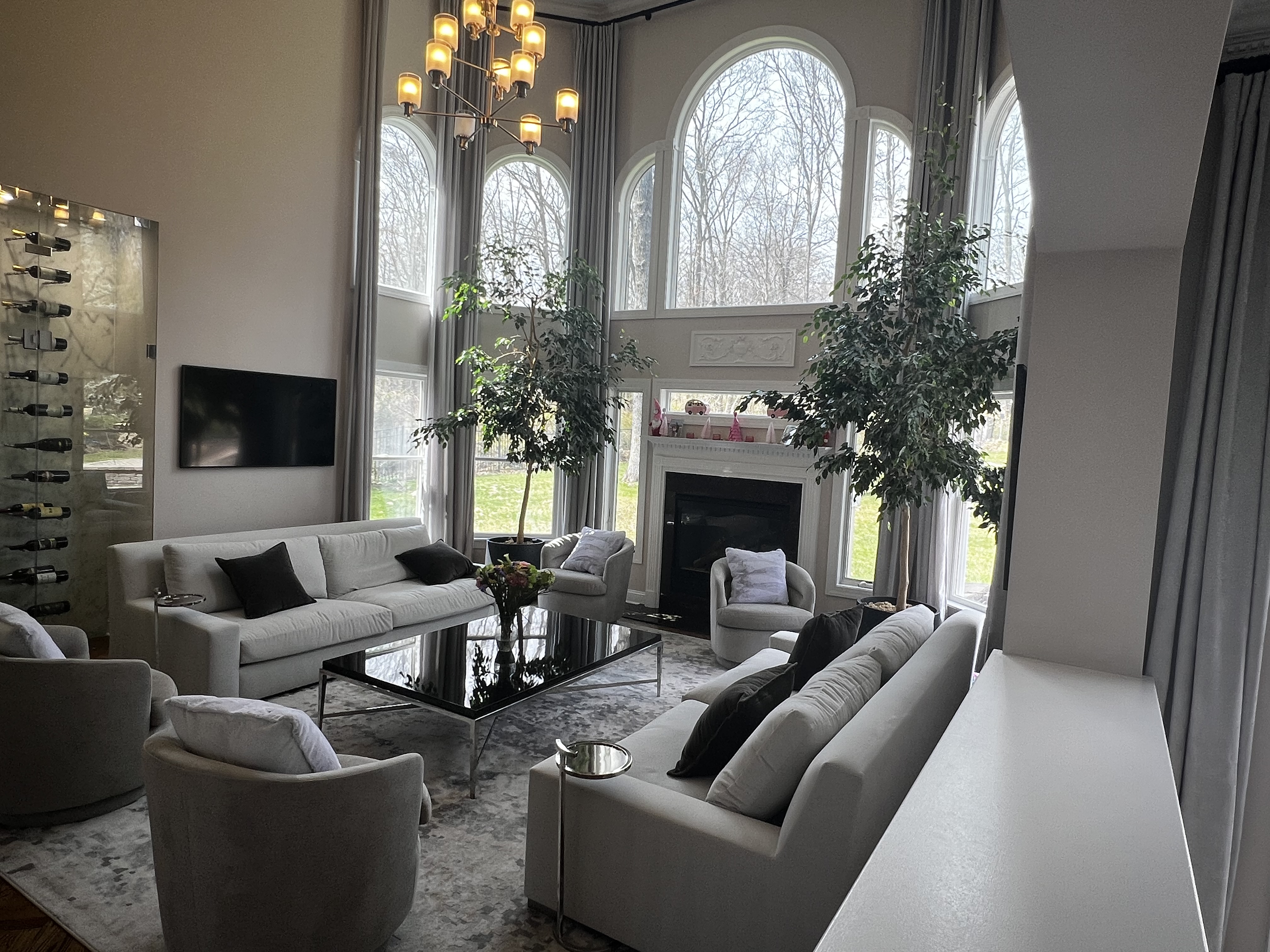 5600 square foot home with custom marble waterfall bar room, glass wine wall with formal living room and fireplace, piano room with baby grand piano, seating for 50 on first floor. First floor is open layout.
