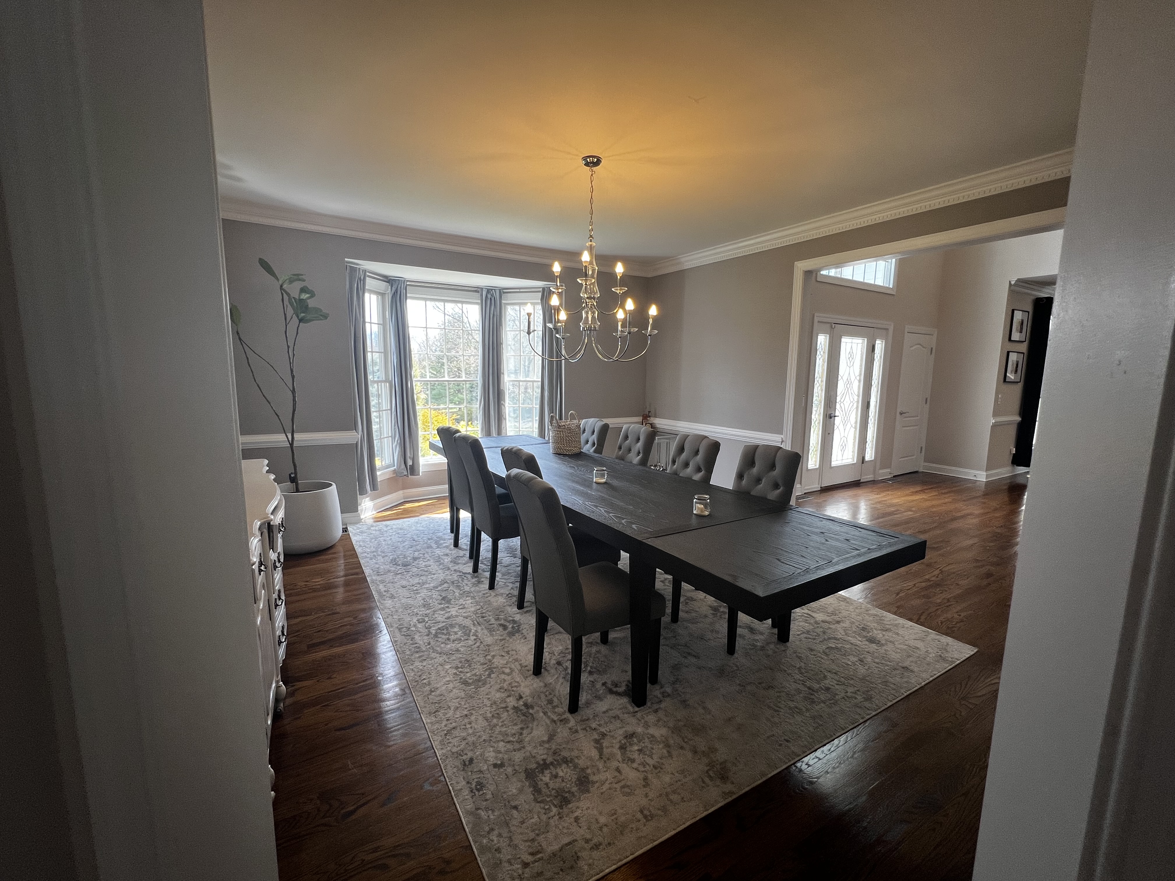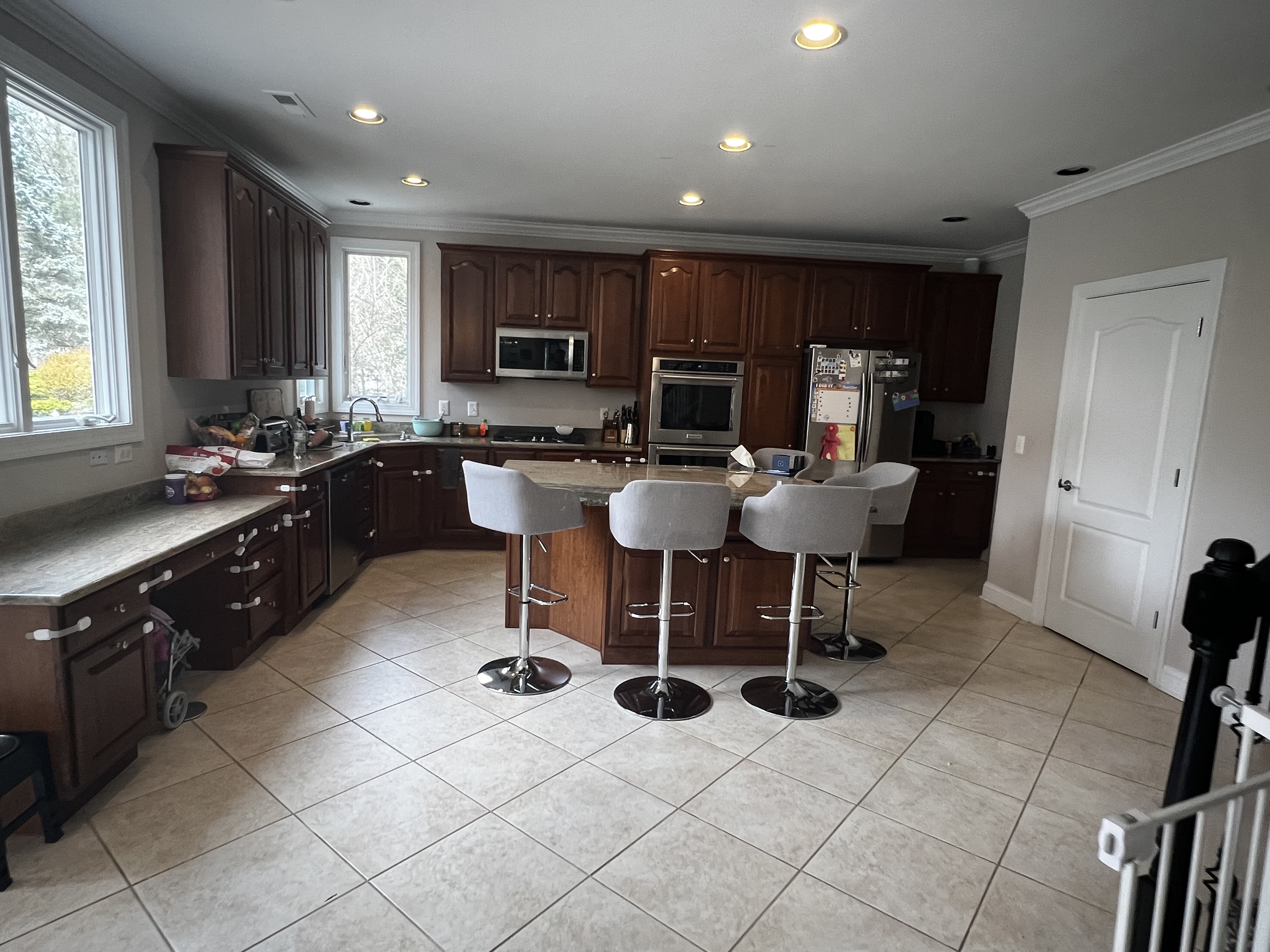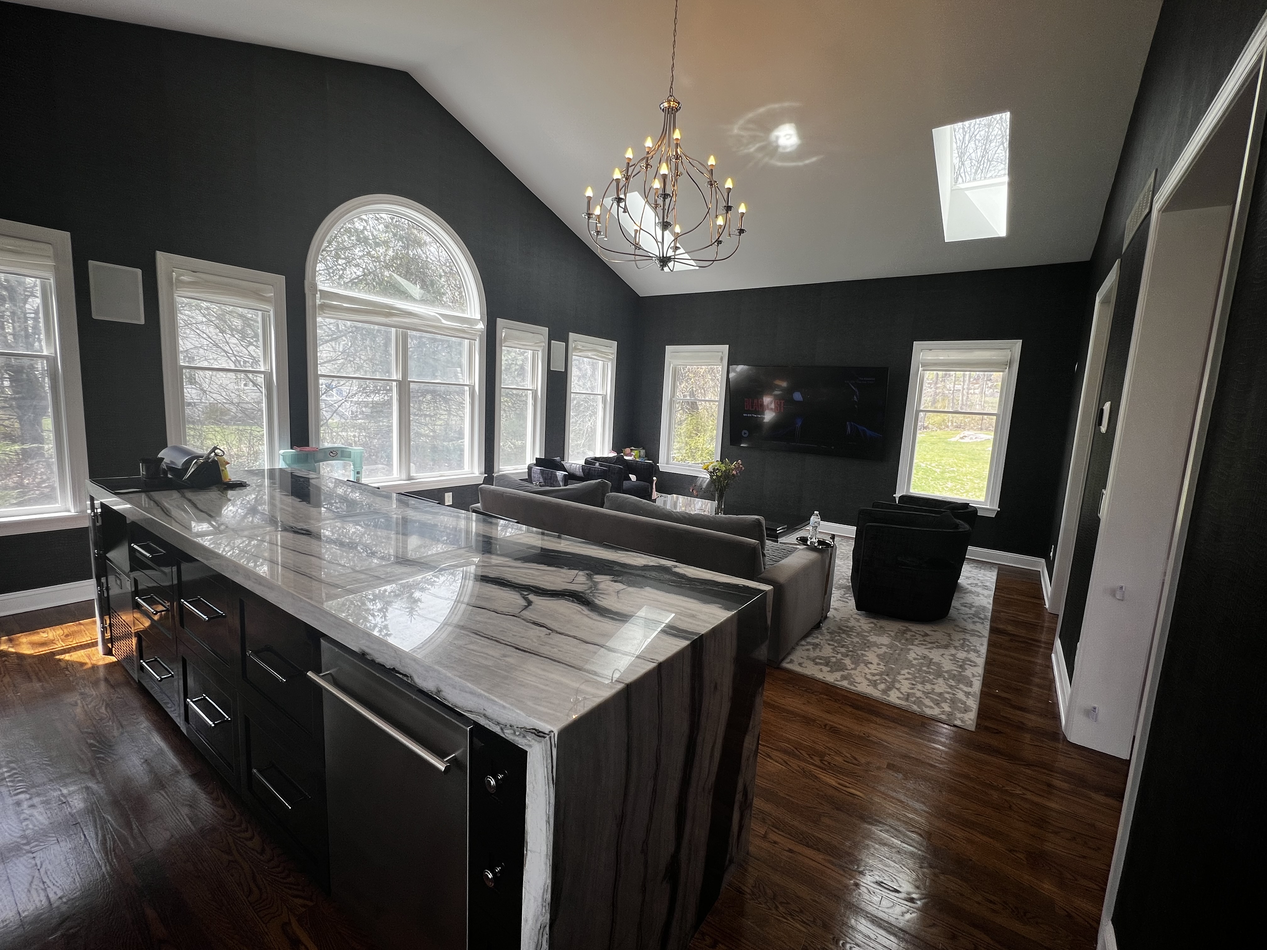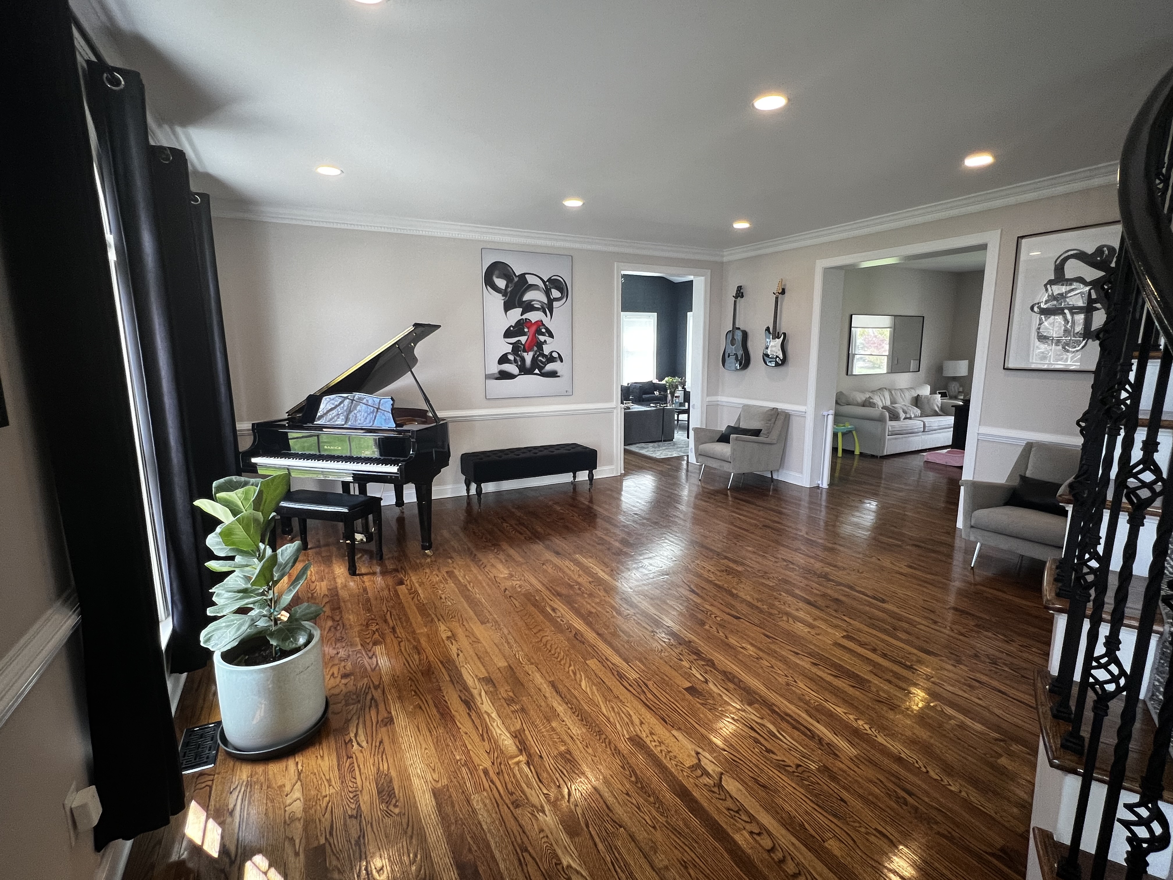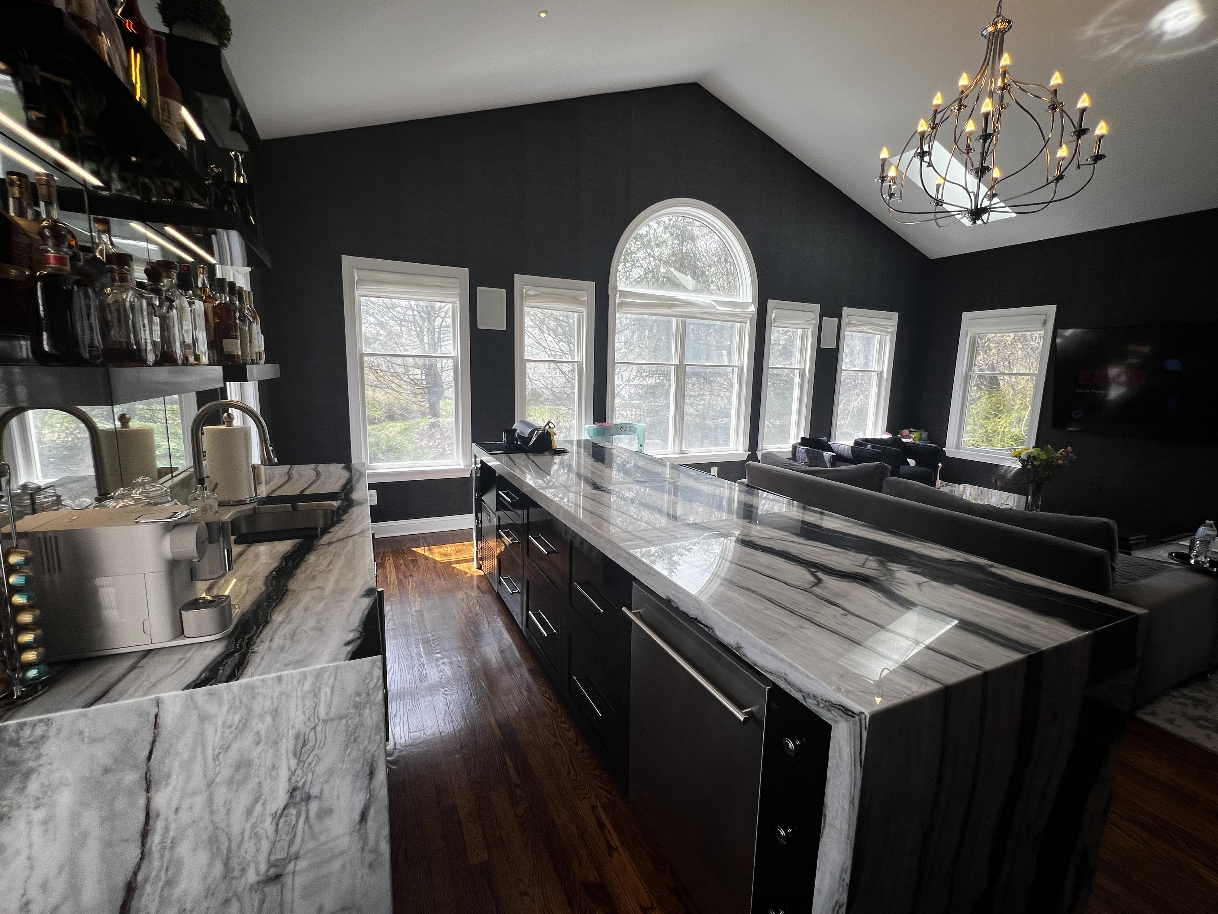 5600 square foot home with custom marble waterfall bar room, glass wine wall with formal living room and fireplace, piano room with baby grand piano, seating for 50 on first floor. First floor is open layout.