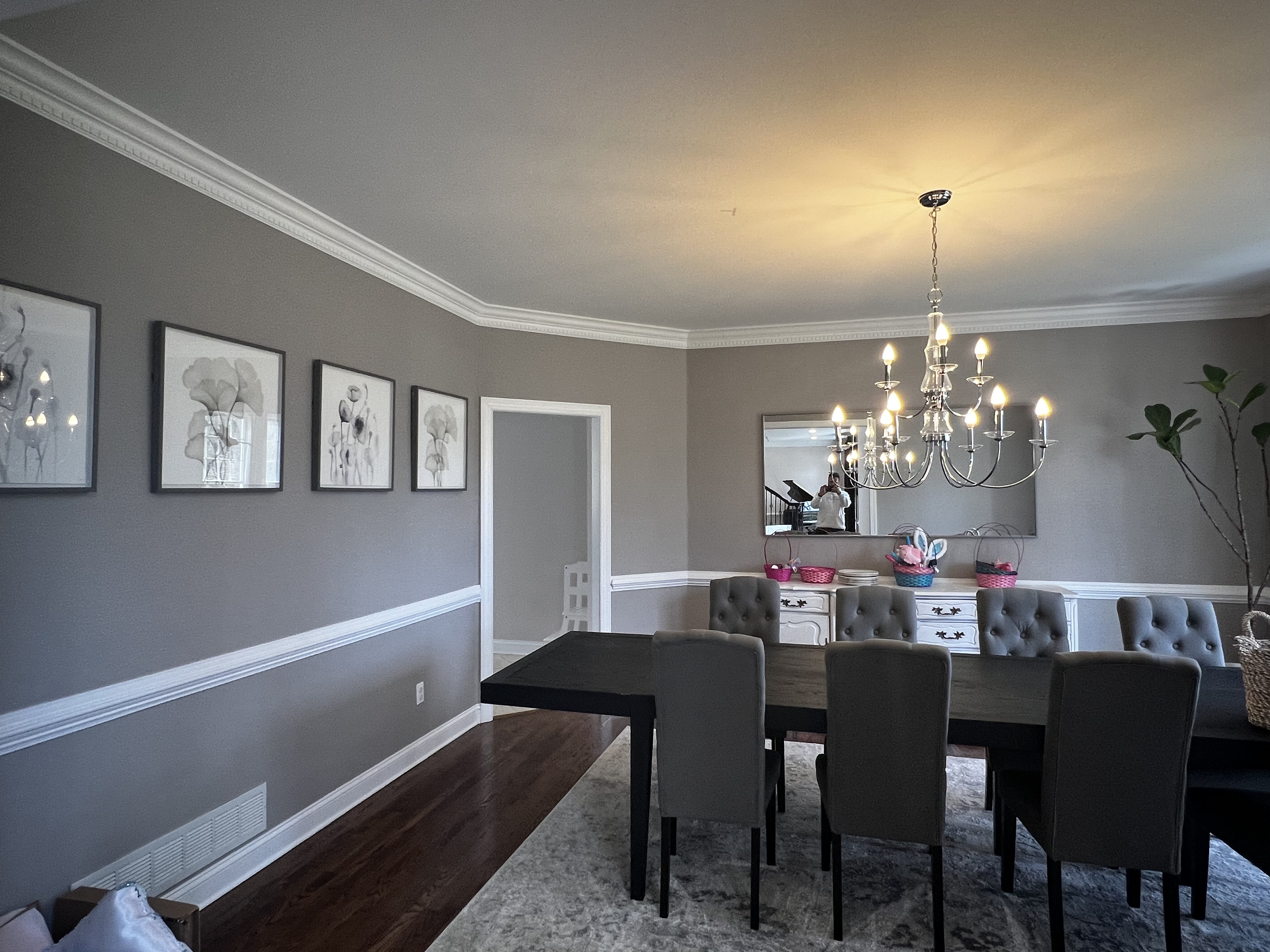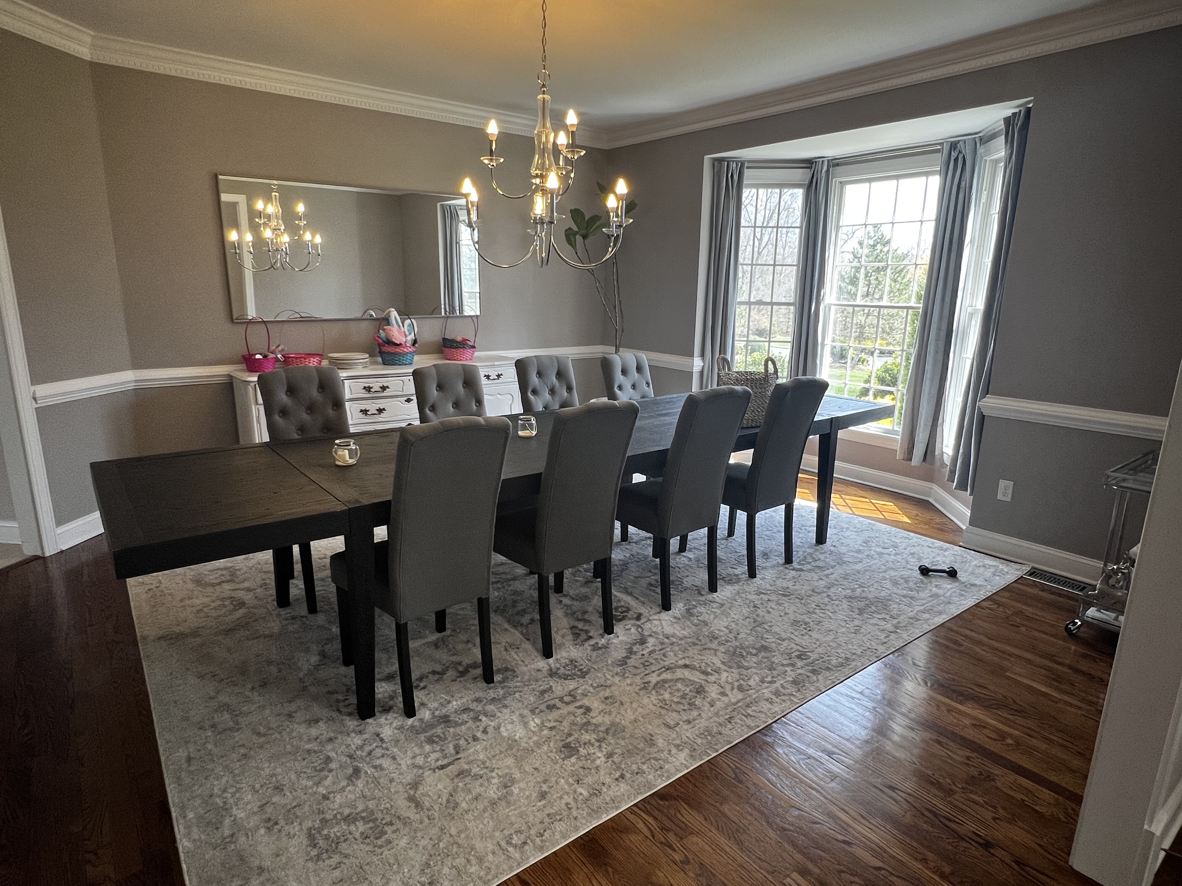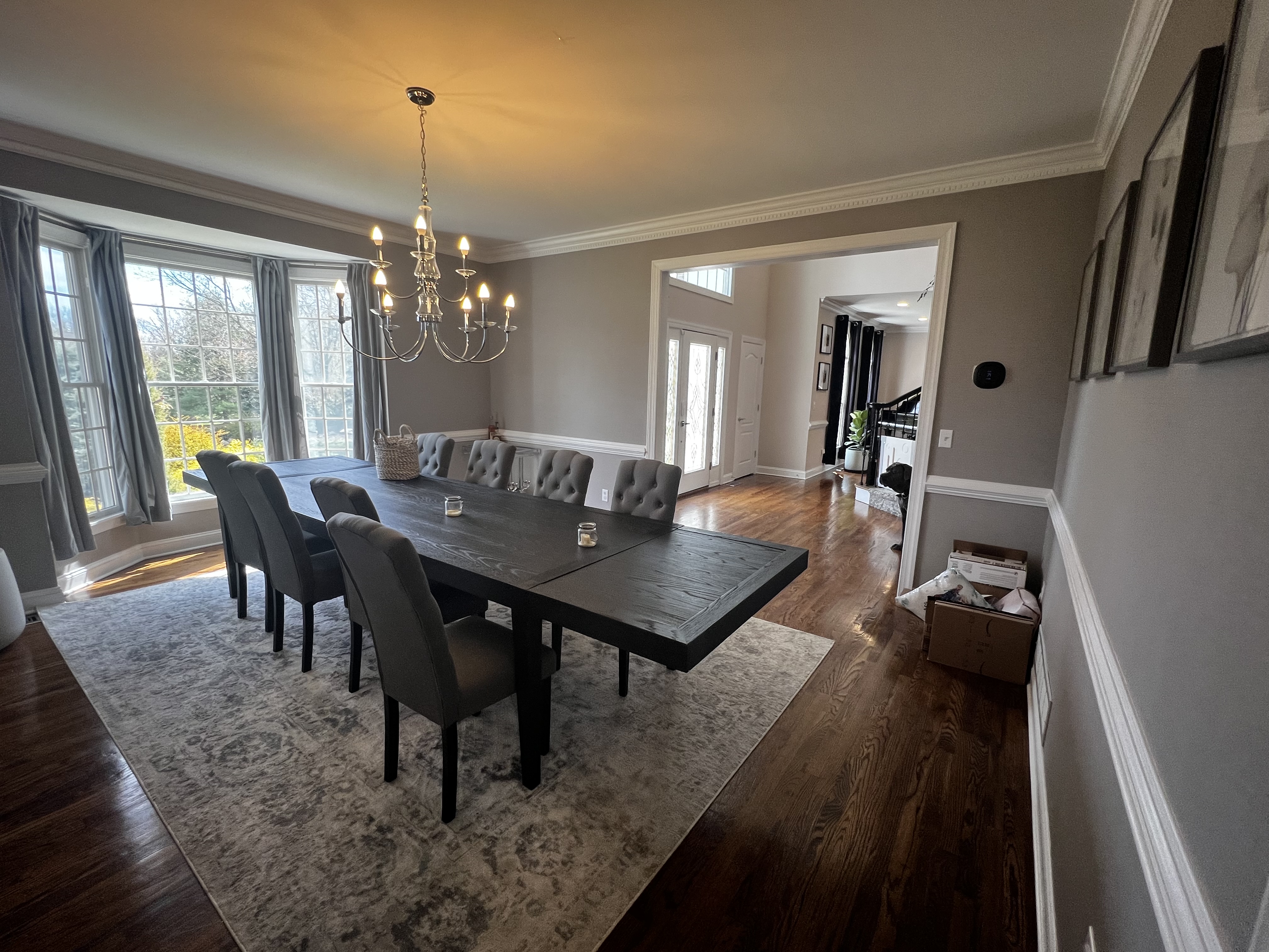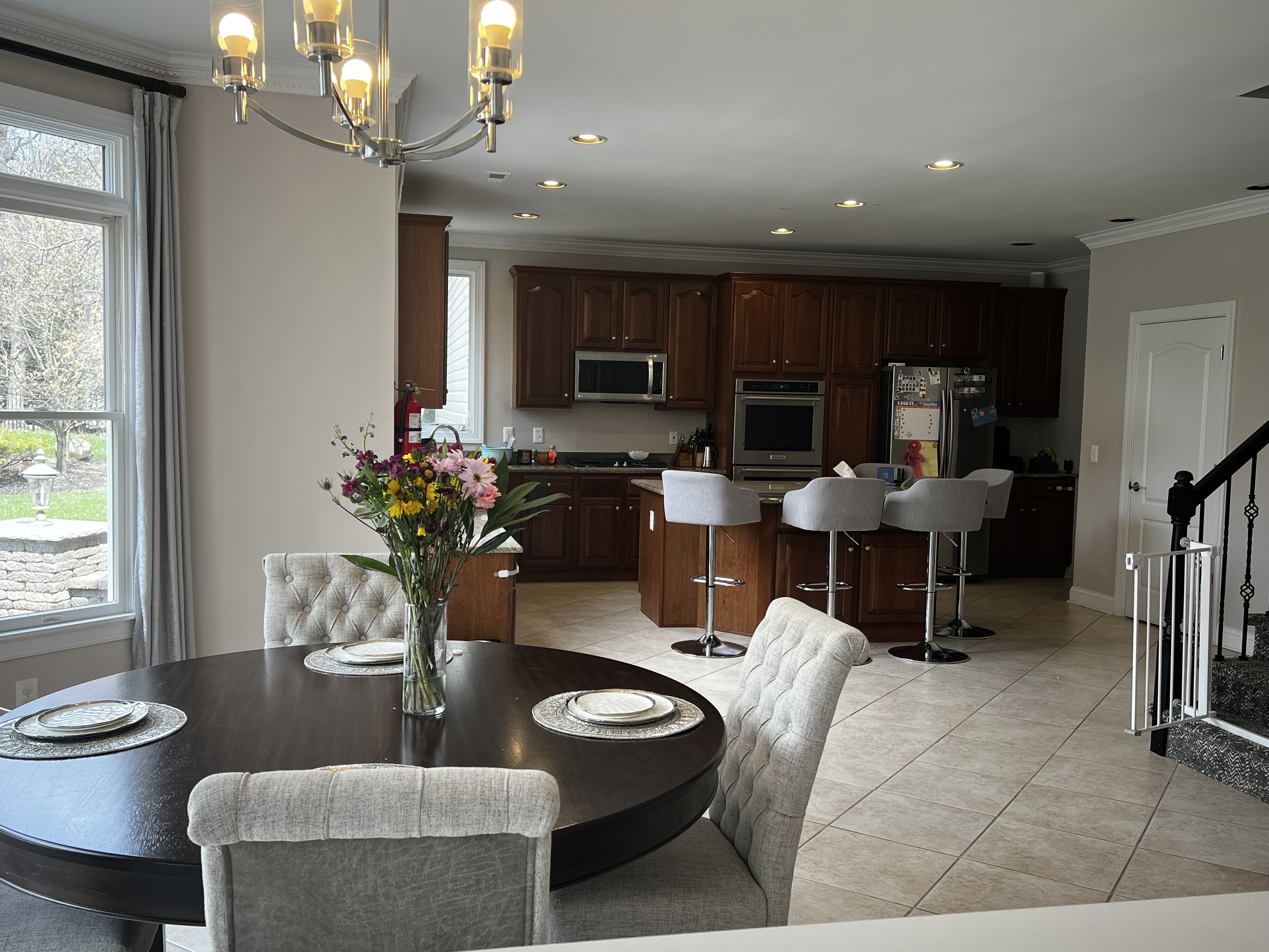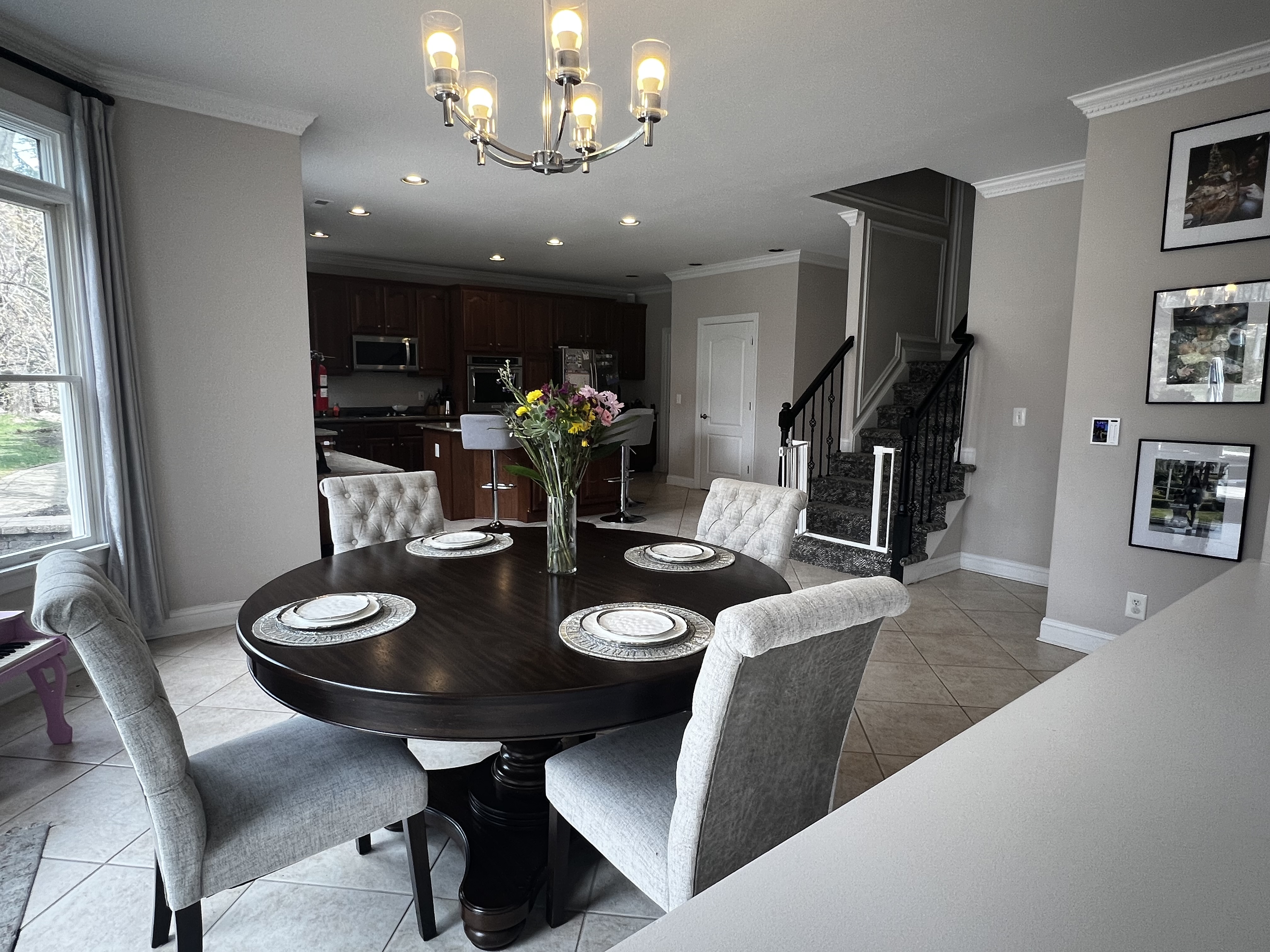 5600 square foot home with custom marble waterfall bar room, glass wine wall with formal living room and fireplace, piano room with baby grand piano, seating for 50 on first floor. First floor is open layout.