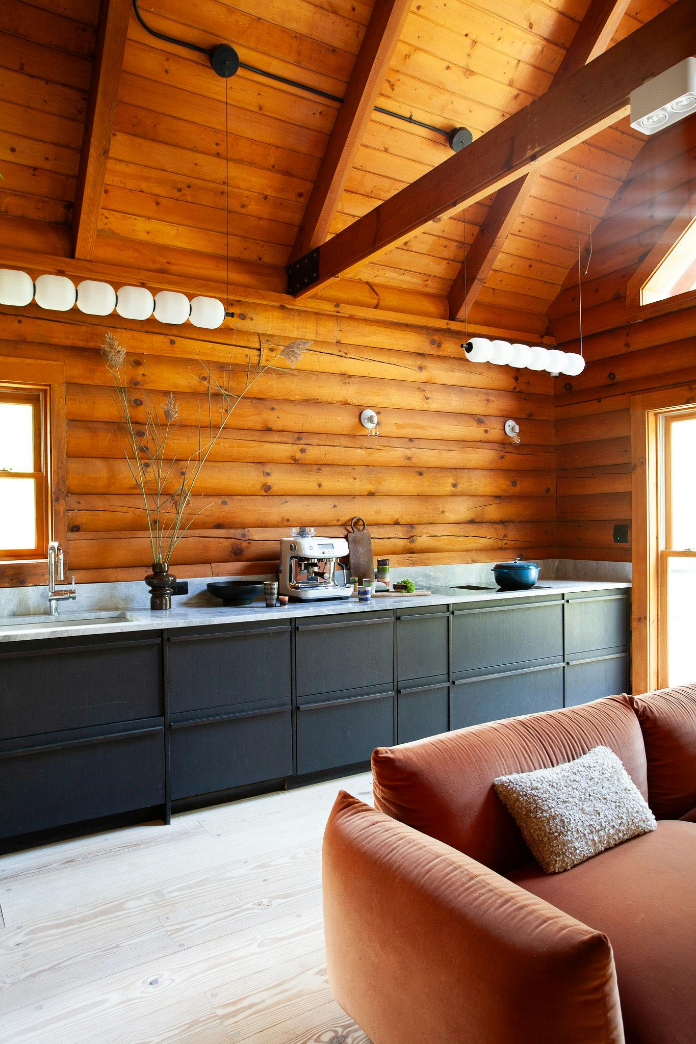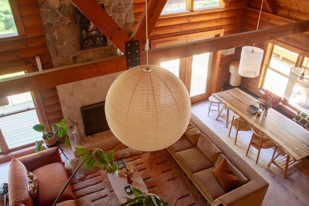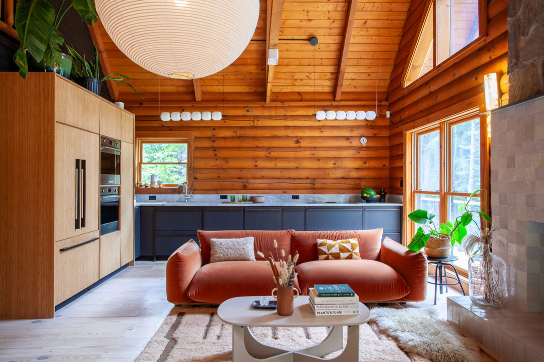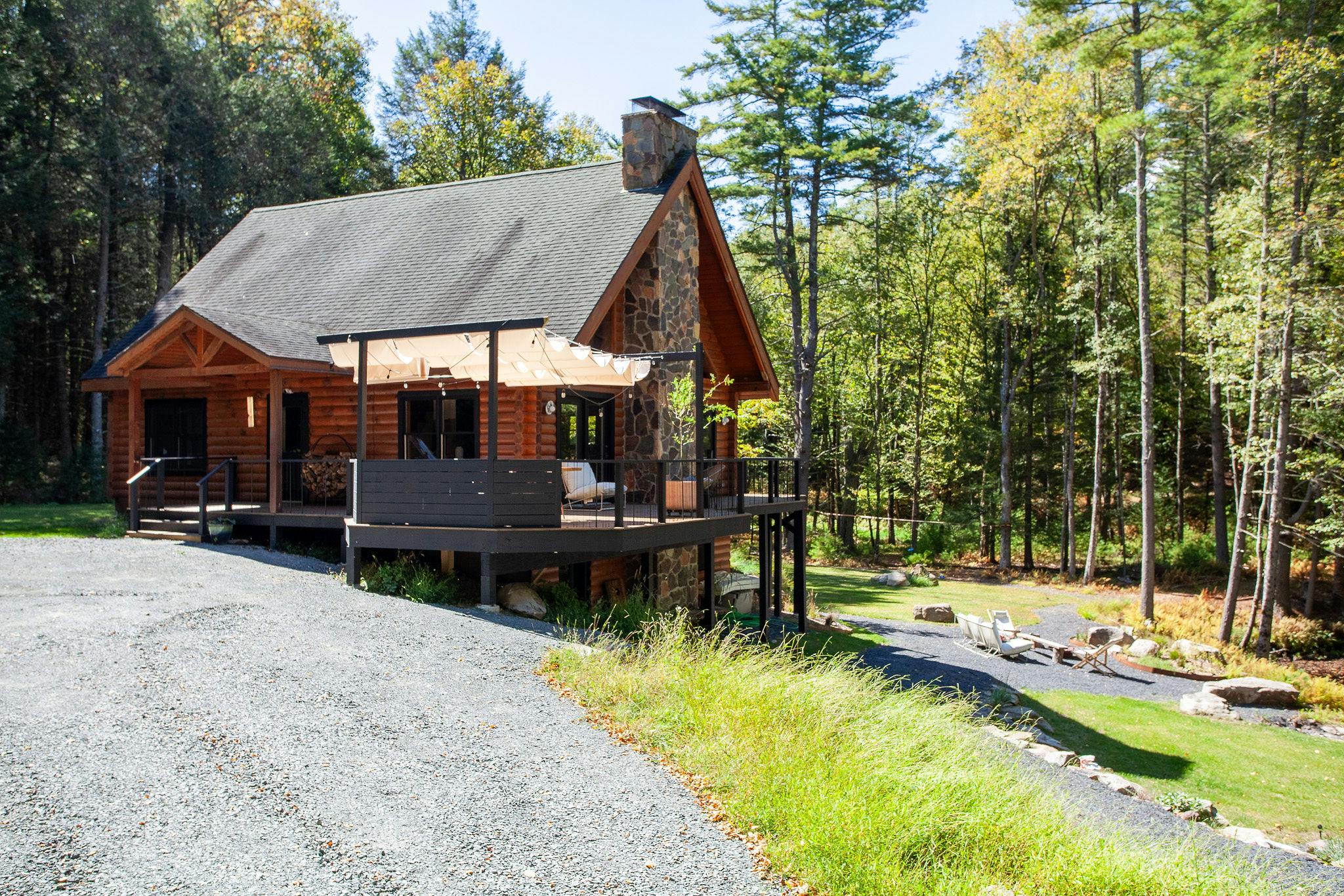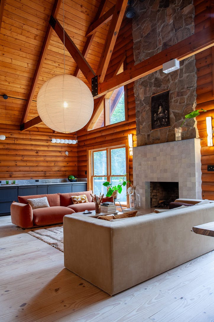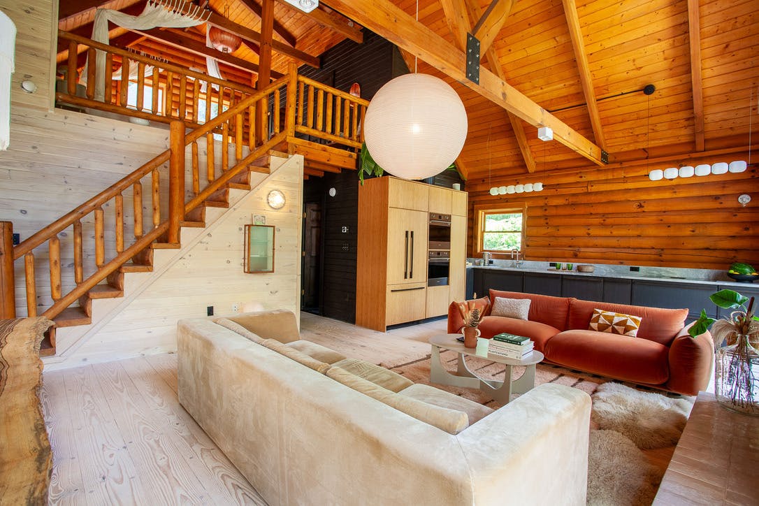 Hidden amongst 2 acres of lush forest, this stunning cabin juxtaposes its classic log exterior with modern black decking. The reimagined interior's use of luxurious design materials (e.g. bamboo, Moroccan tile and marble) create an elevated aesthetic with gorgeous of warmth and texture.