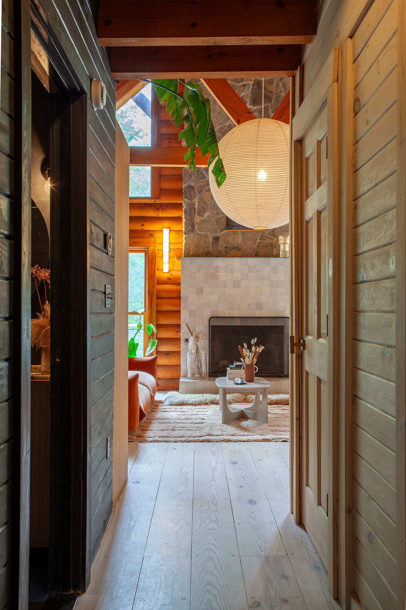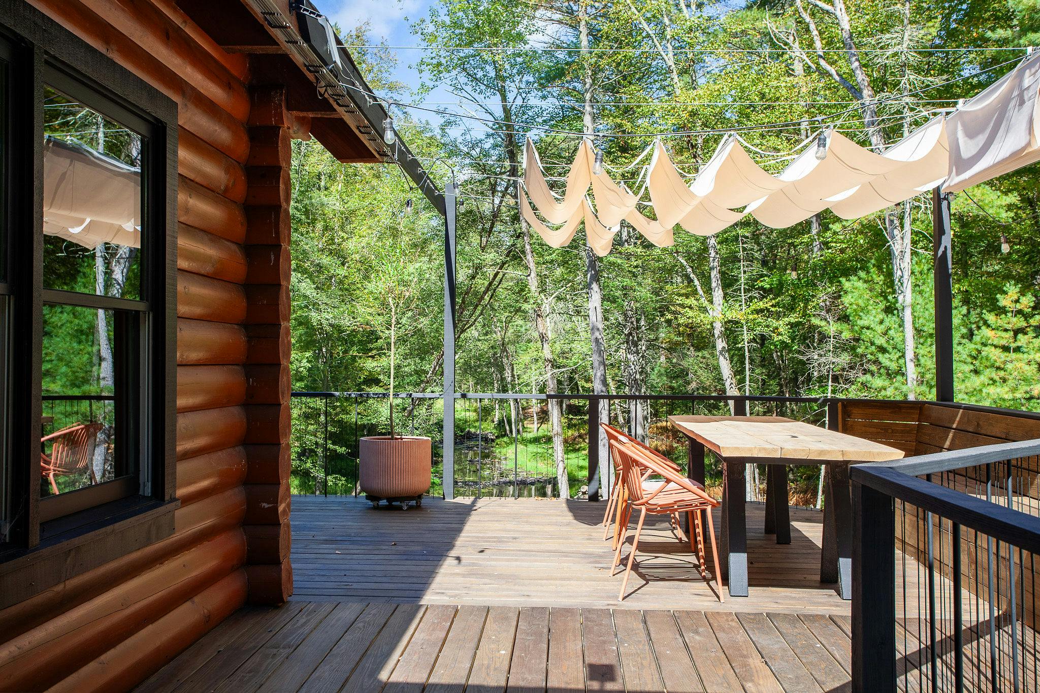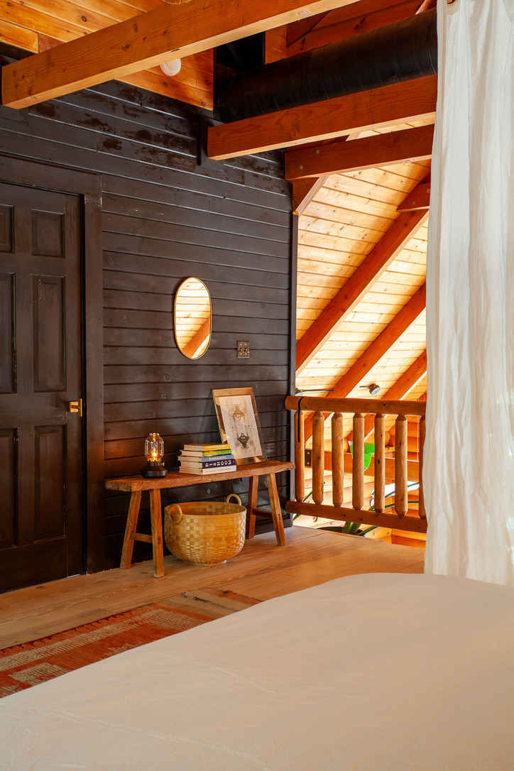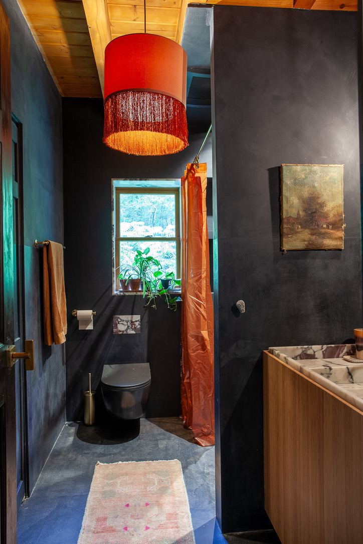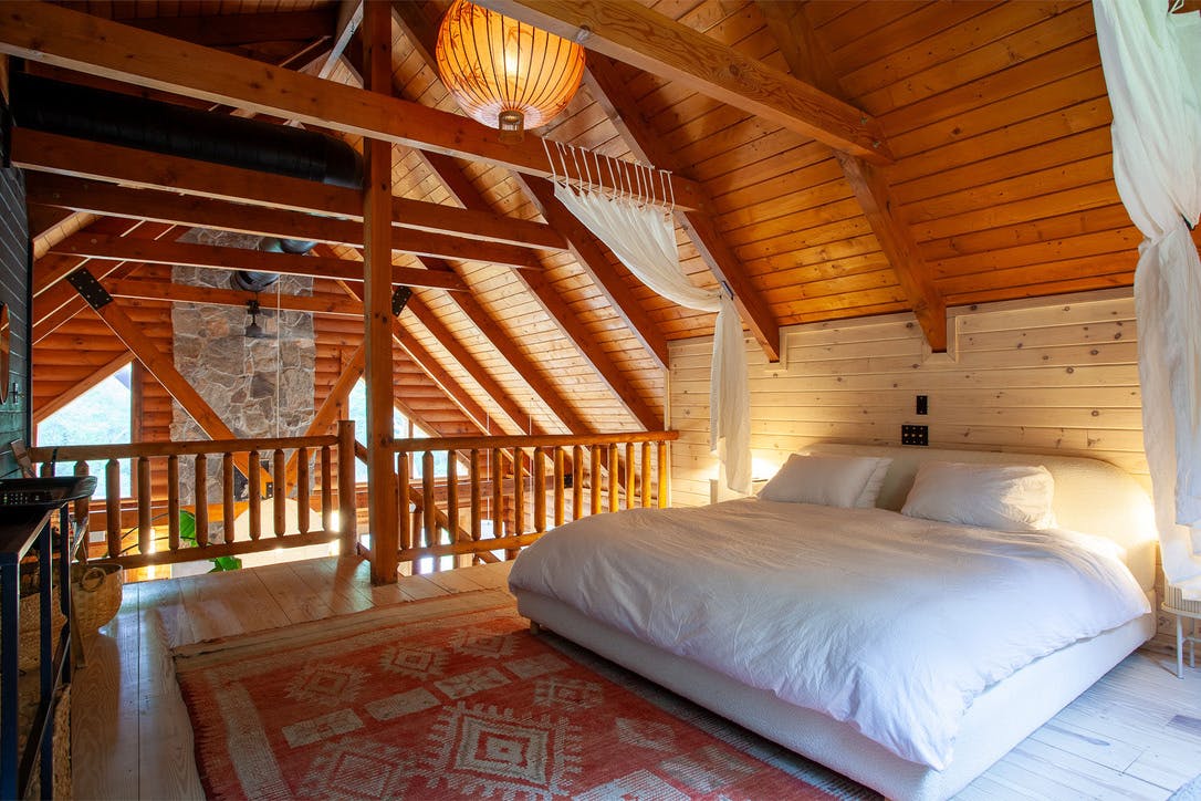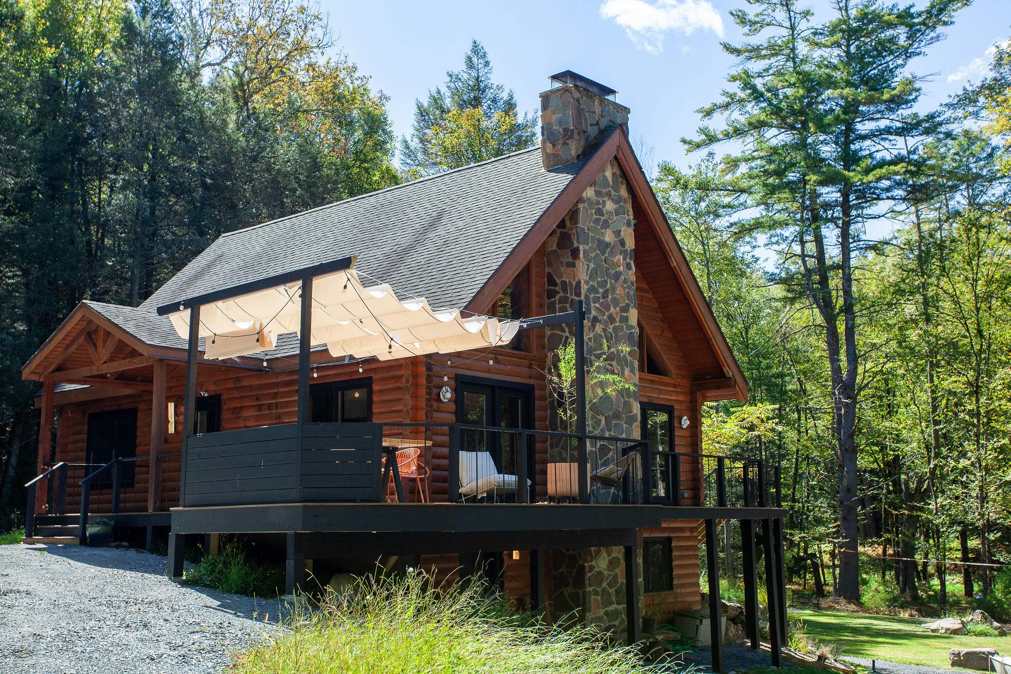 Hidden amongst 2 acres of lush forest, this stunning cabin juxtaposes its classic log exterior with modern black decking. The reimagined interior's use of luxurious design materials (e.g. bamboo, Moroccan tile and marble) create an elevated aesthetic with gorgeous of warmth and texture.