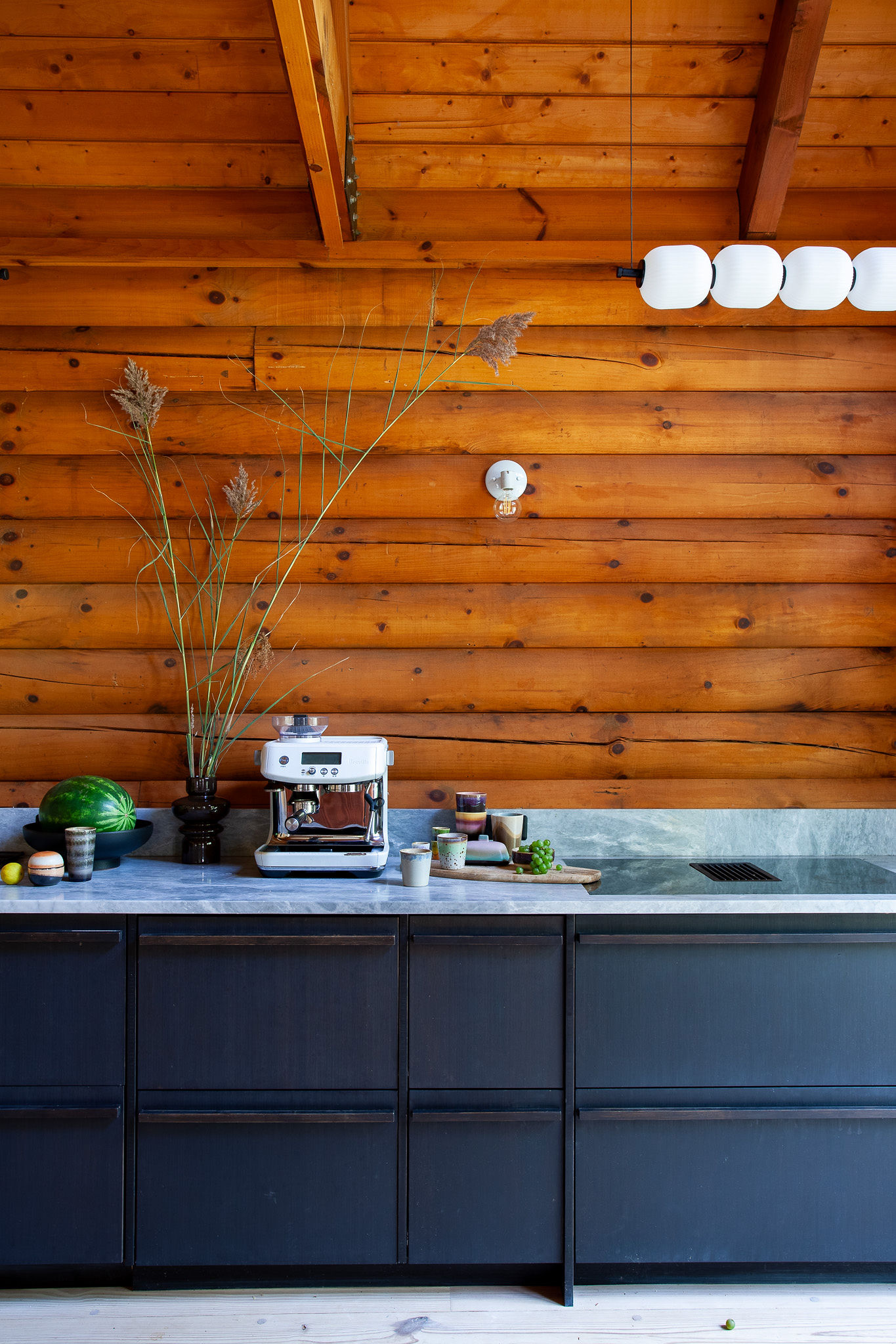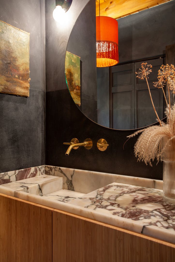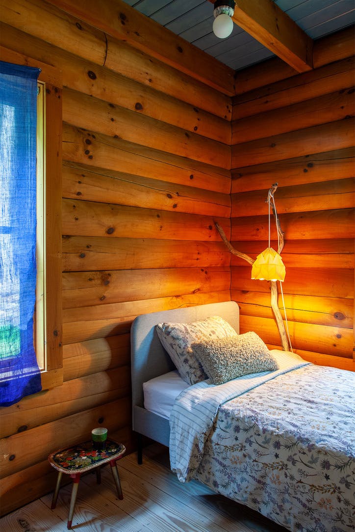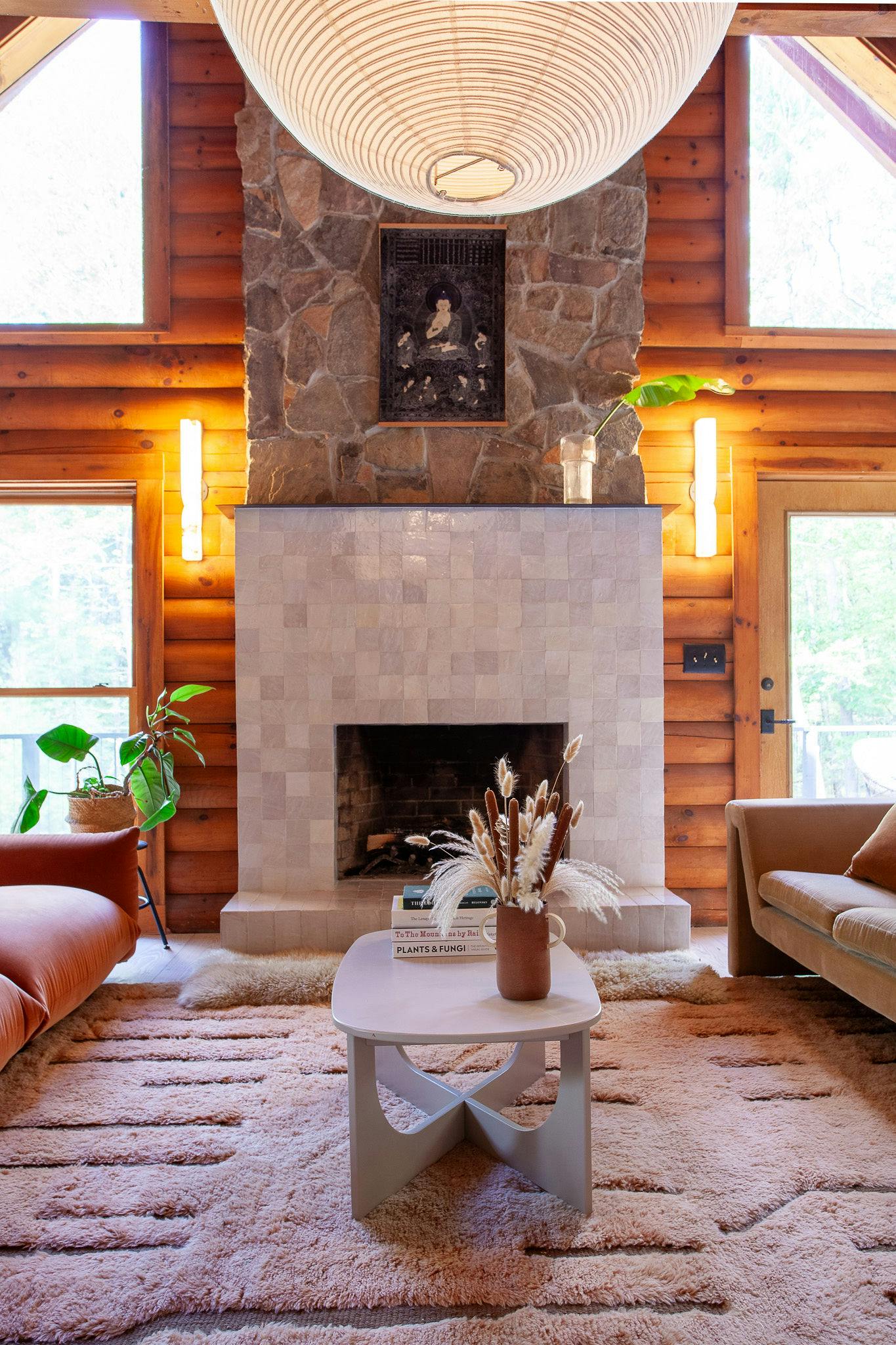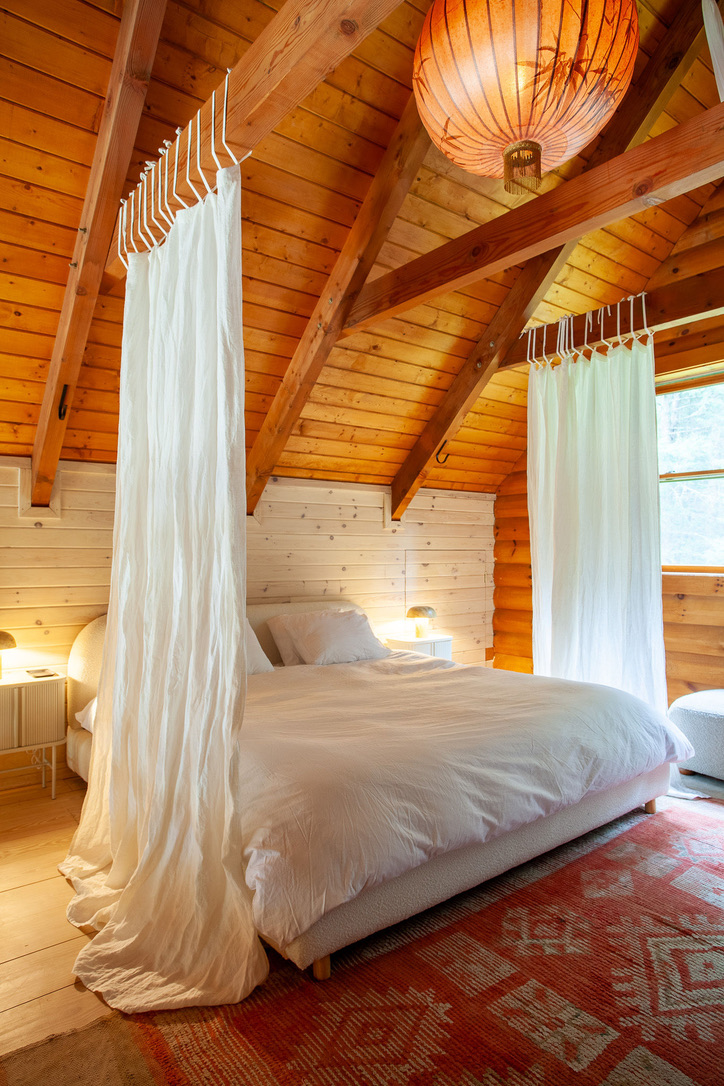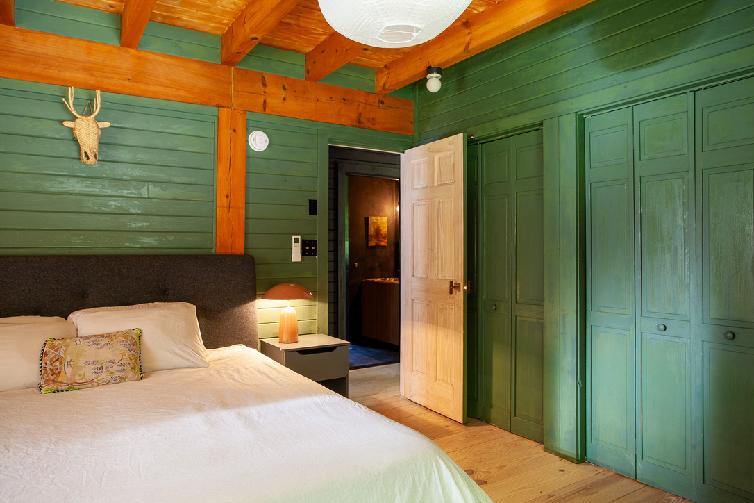 Hidden amongst 2 acres of lush forest, this stunning cabin juxtaposes its classic log exterior with modern black decking. The reimagined interior's use of luxurious design materials (e.g. bamboo, Moroccan tile and marble) create an elevated aesthetic with gorgeous of warmth and texture.