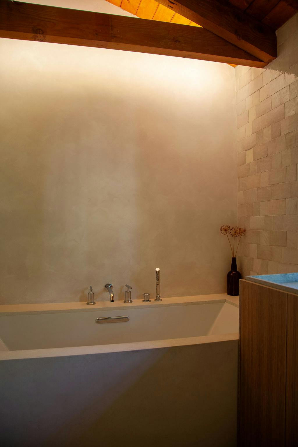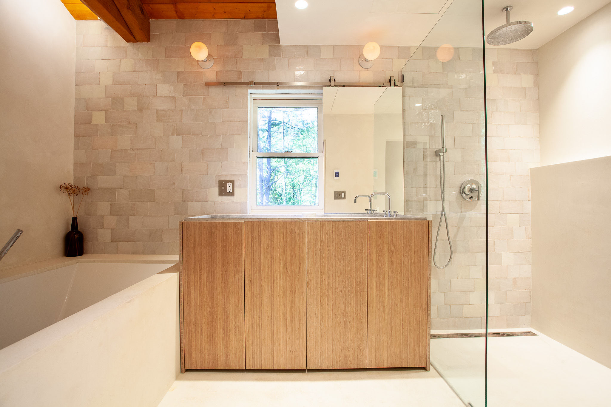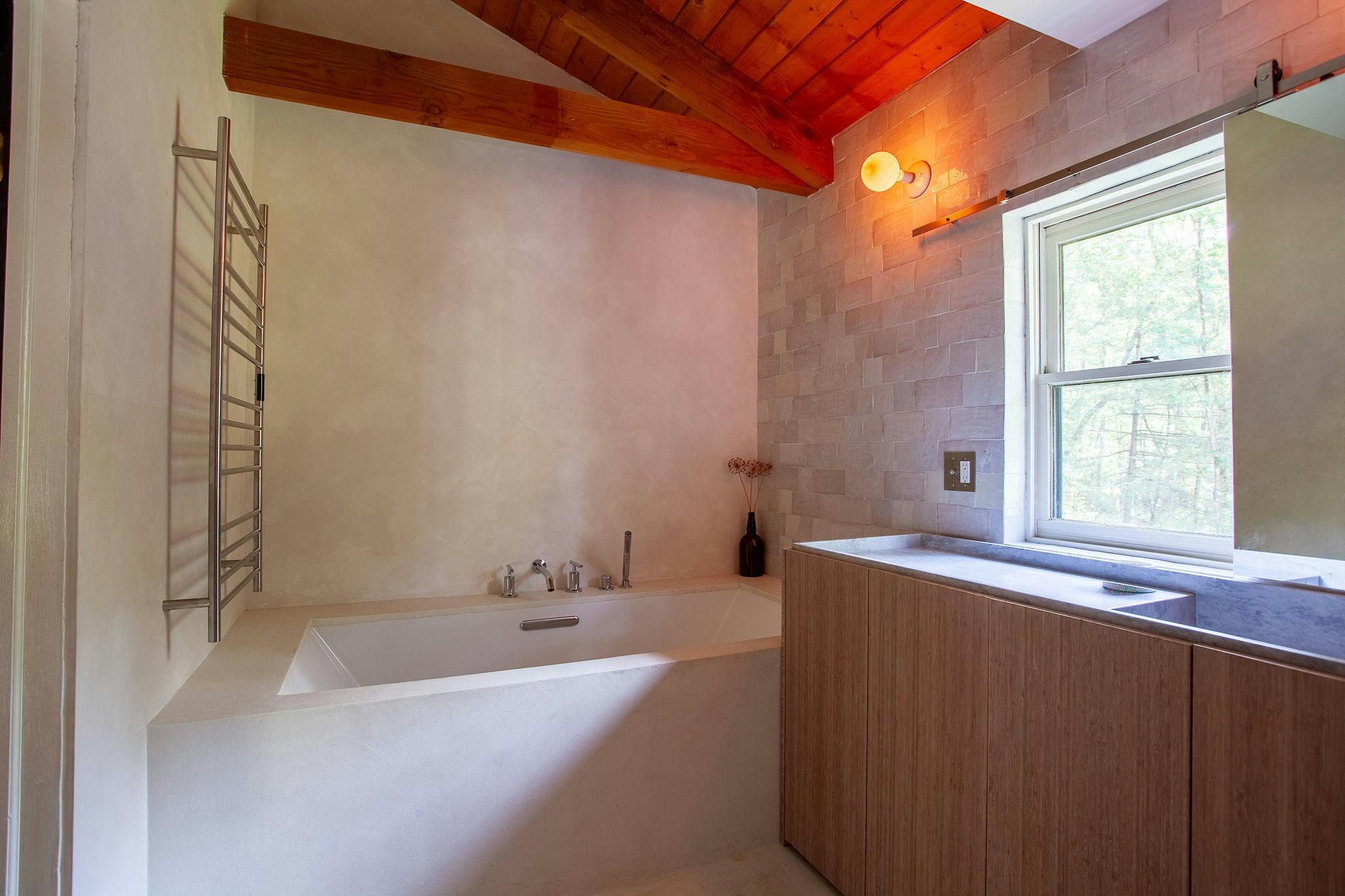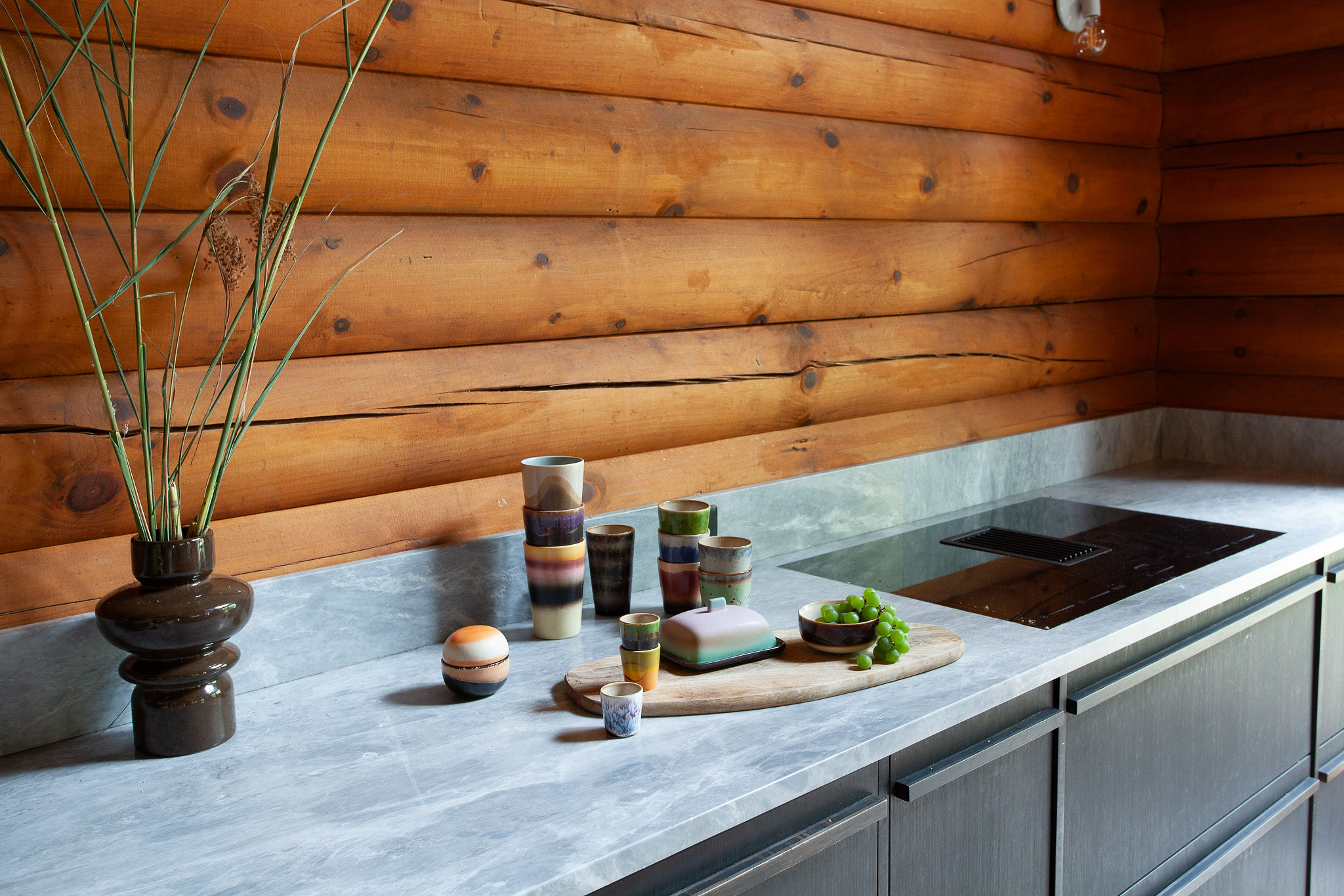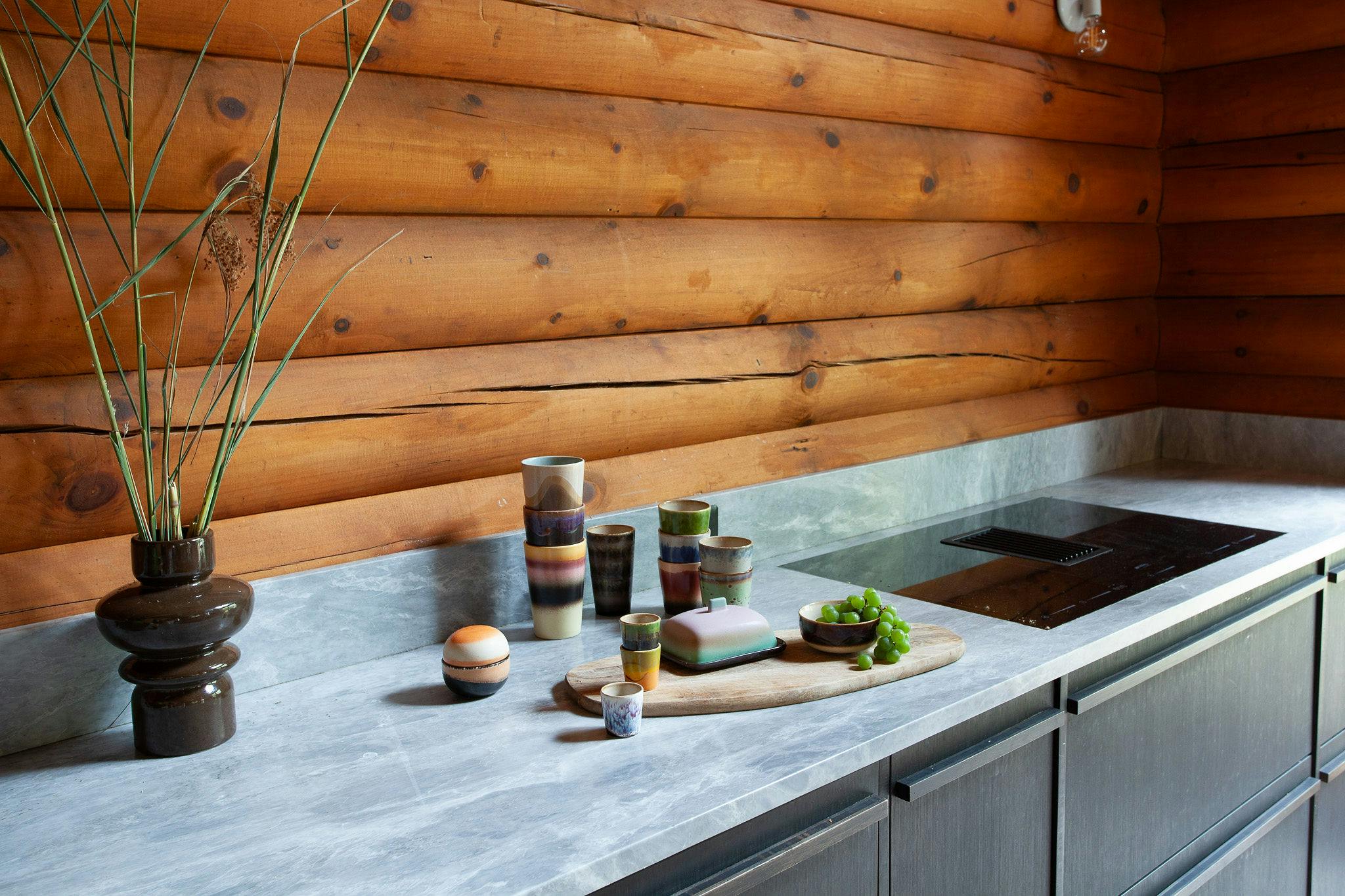 Hidden amongst 2 acres of lush forest, this stunning cabin juxtaposes its classic log exterior with modern black decking. The reimagined interior's use of luxurious design materials (e.g. bamboo, Moroccan tile and marble) create an elevated aesthetic with gorgeous of warmth and texture.