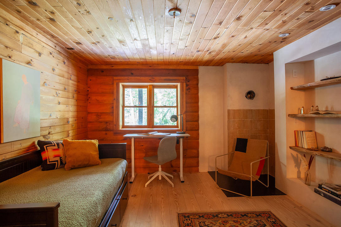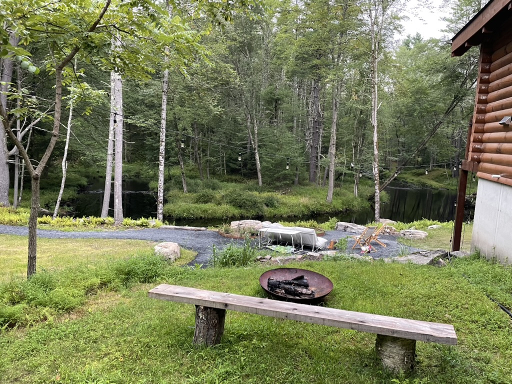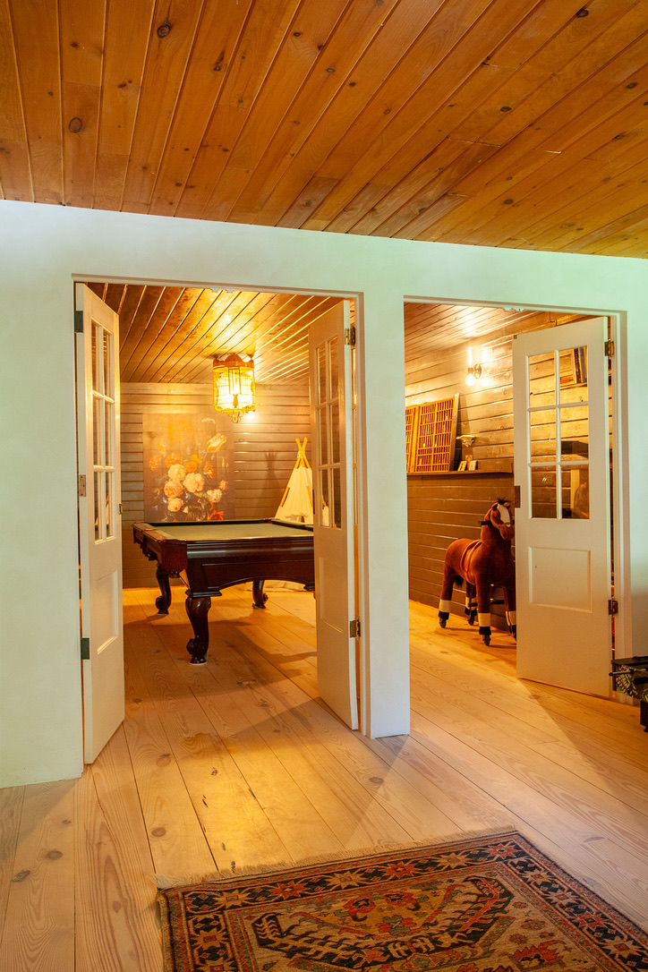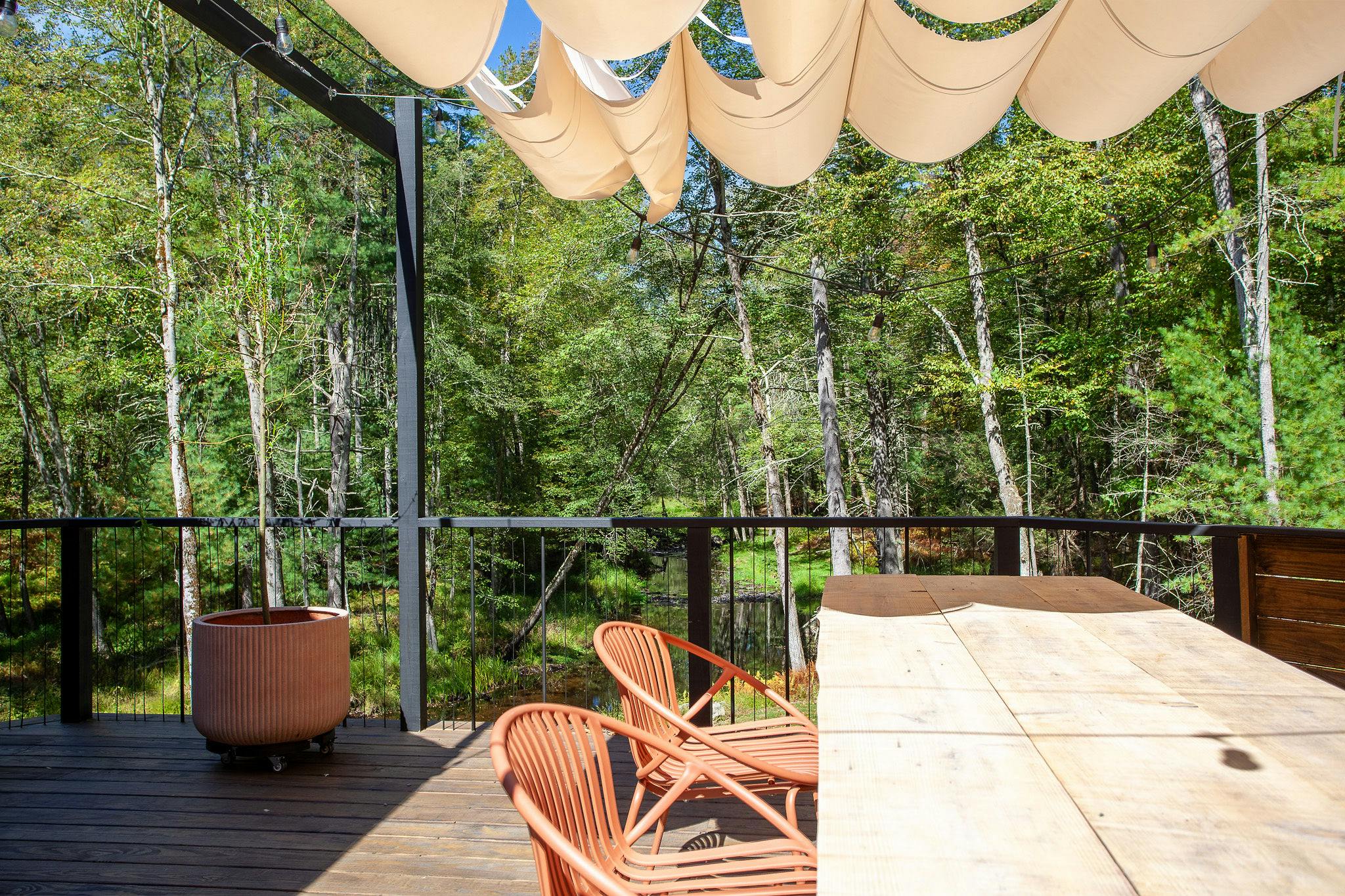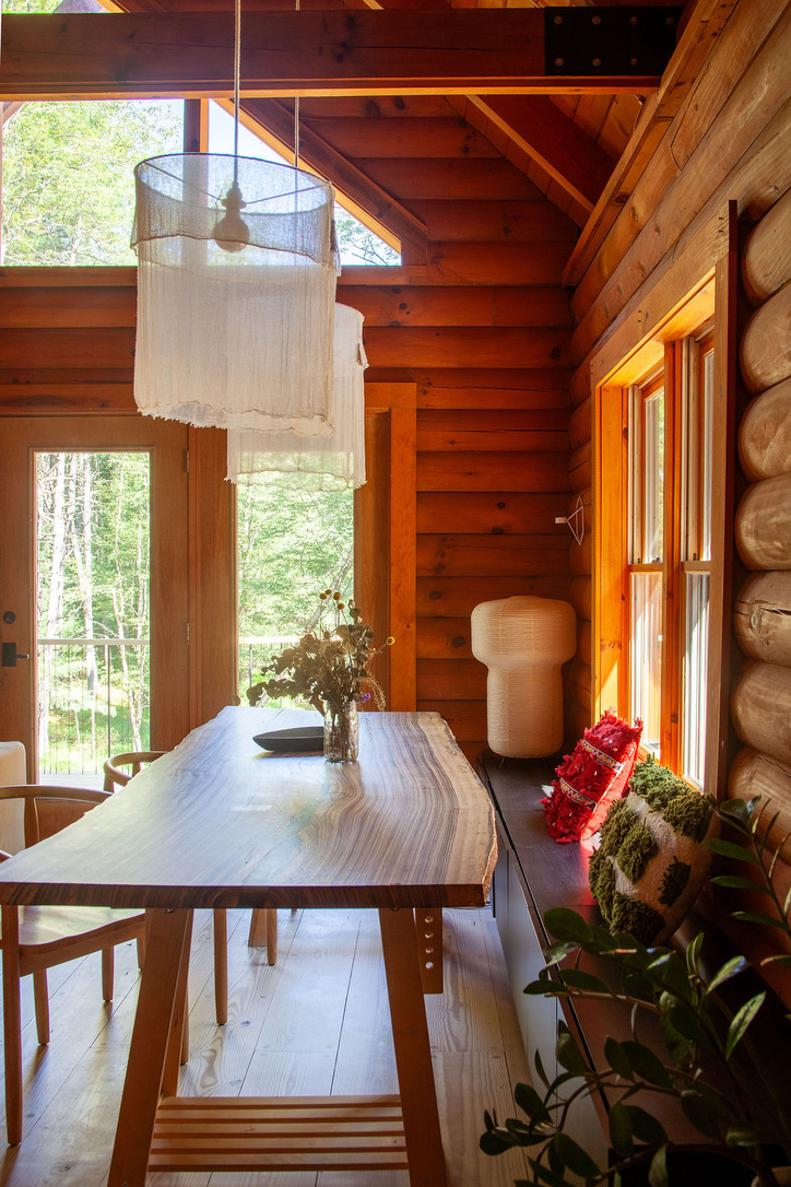 This private home is a modern spin on the classic American log cabin, leaning into its warmth, yet refreshed with custom design and beautiful materials. The modernized 3 bed, 3 bath cabin with separate office space and private-lounge style game room, is nestled on the banks of a meandering mountain stream, perfect for kayaking and swimming. Beautifully landscaped grounds, large deck, and interior furnished with design classics like the 70s Marenco sofa, it offers a unique and poetic backdrop.