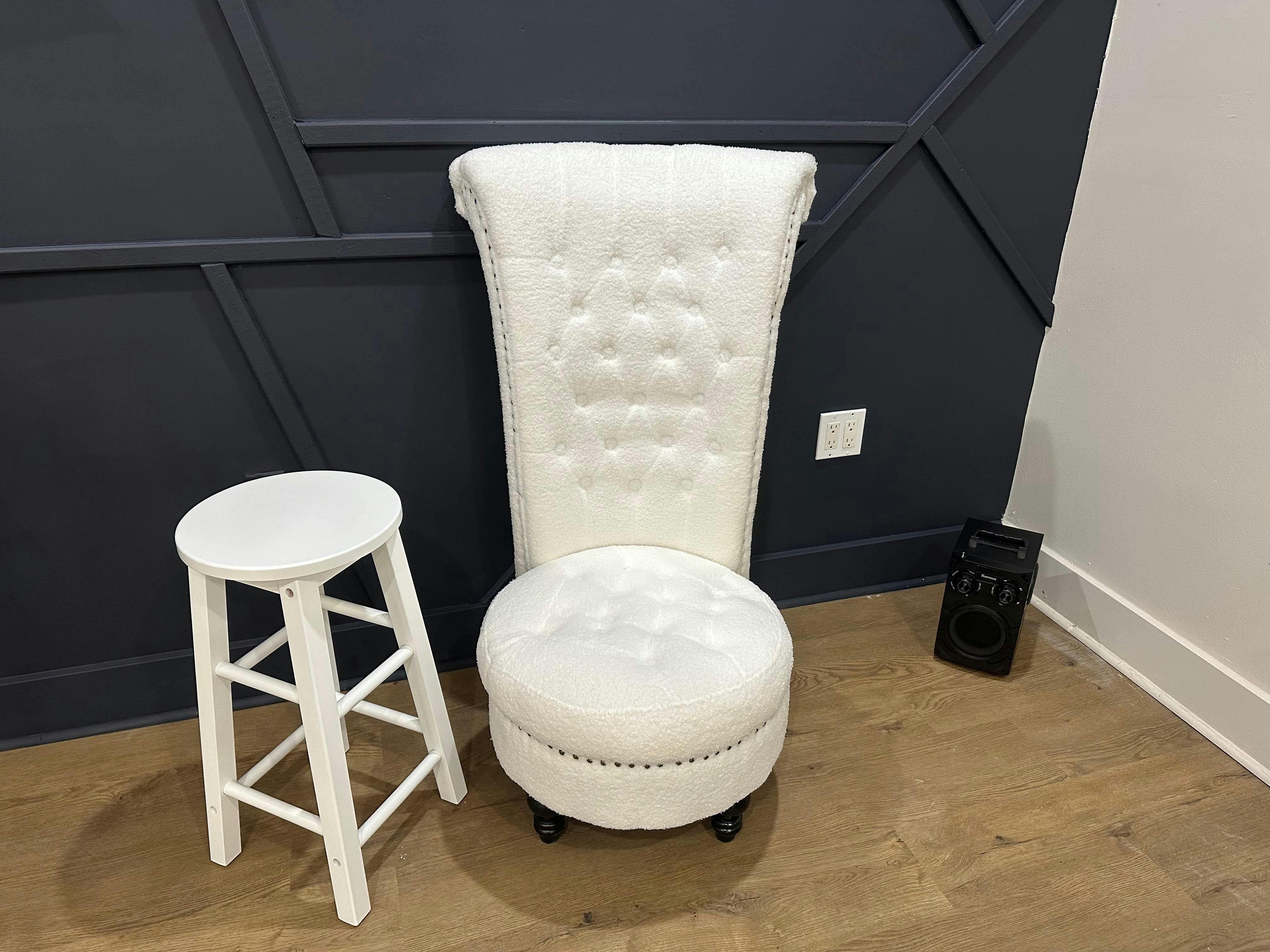 - Chair props such as white stool, grey couch, white royalty chair, small white chair