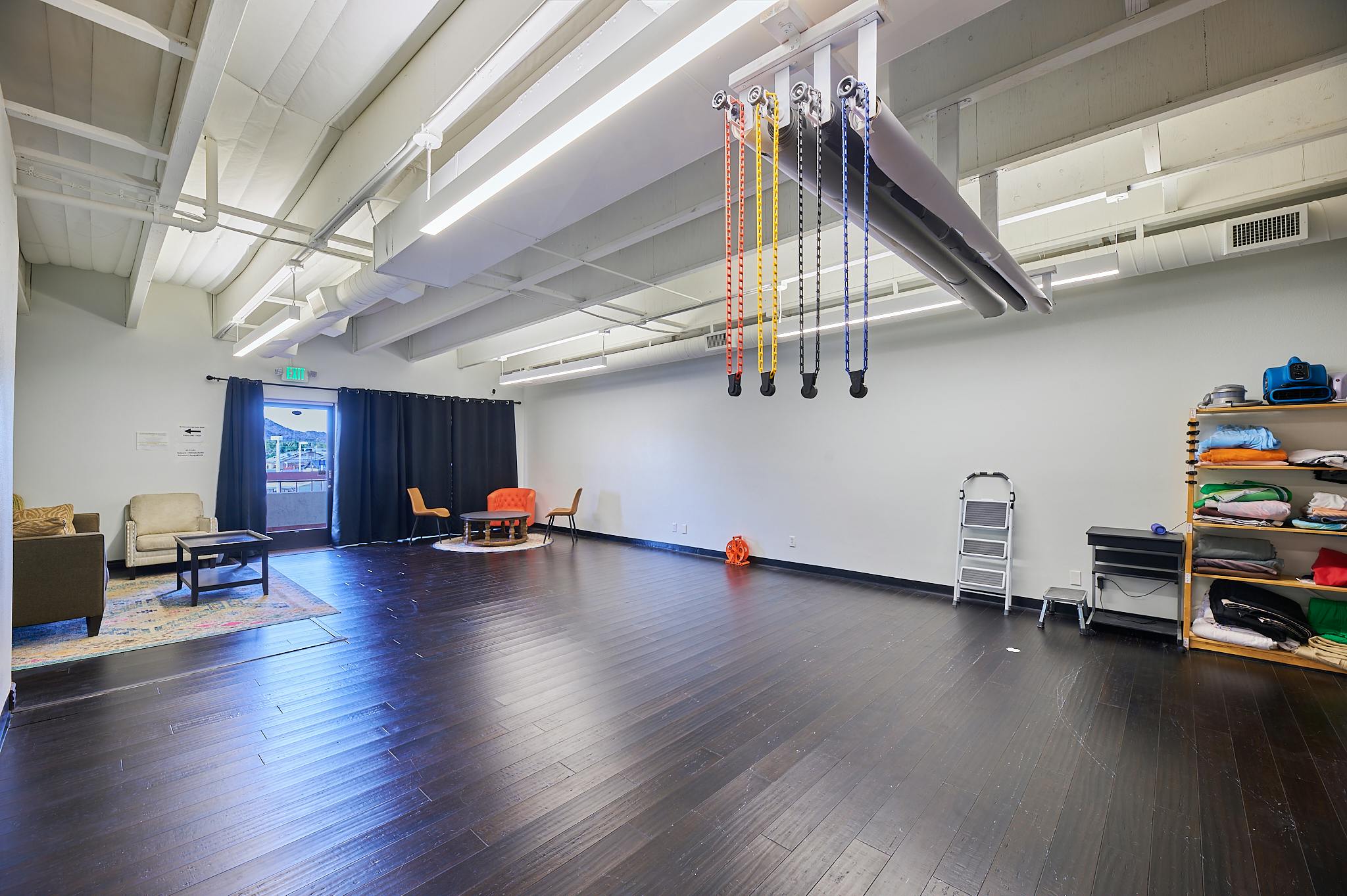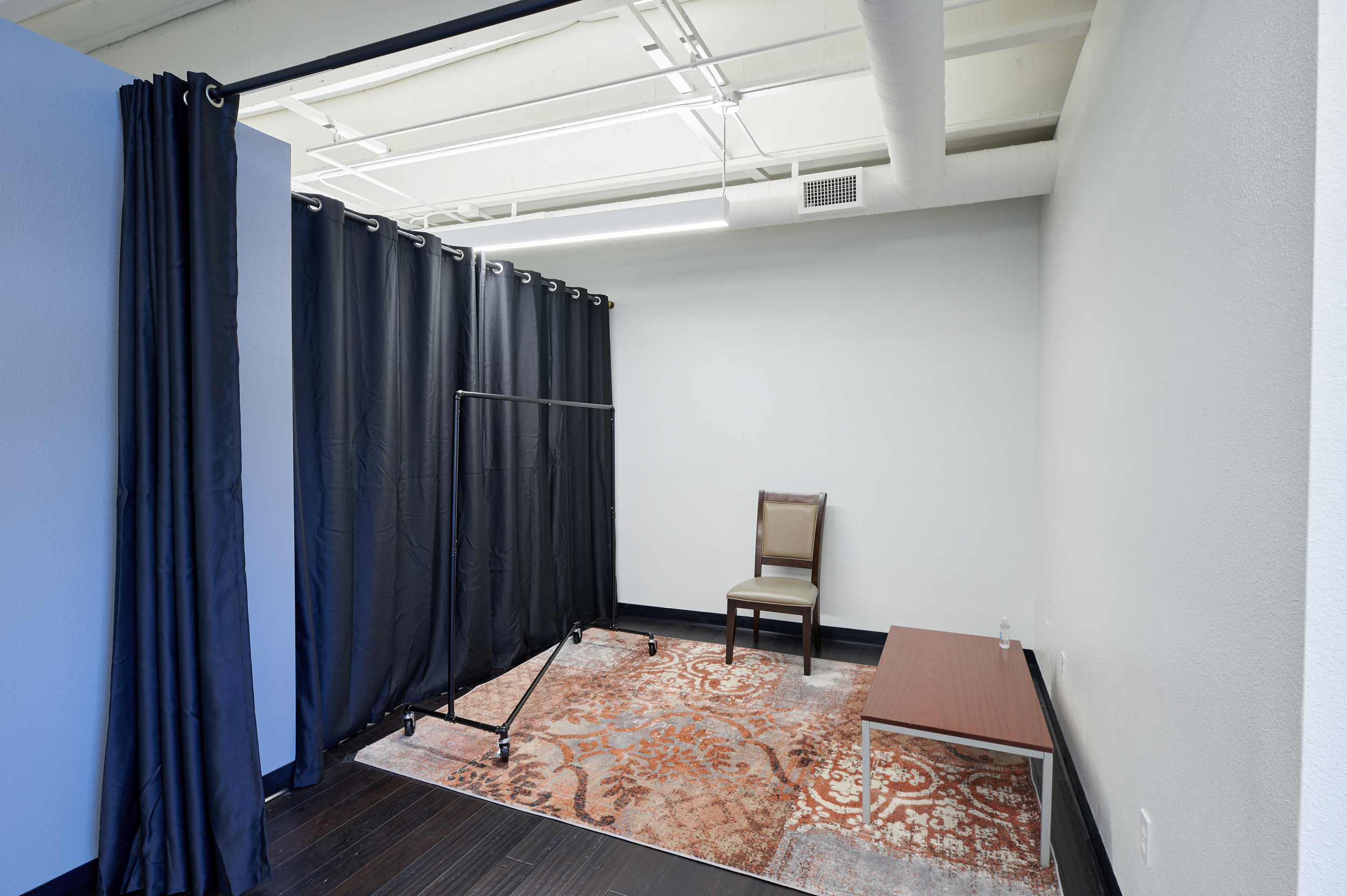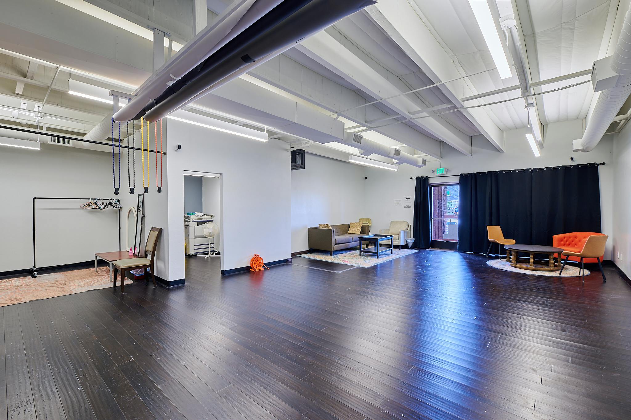 Fourth Wall Studio is a large, open creative space in North Central Phoenix with high ceilings and flexible layout options for photography and small productions. The main shooting area offers ample floor space for portraits, commercial work, boudoir, and video. Furniture can be rearranged as needed. The studio includes a private changing area, nearby restrooms, kitchenette, and privacy shades for light control.