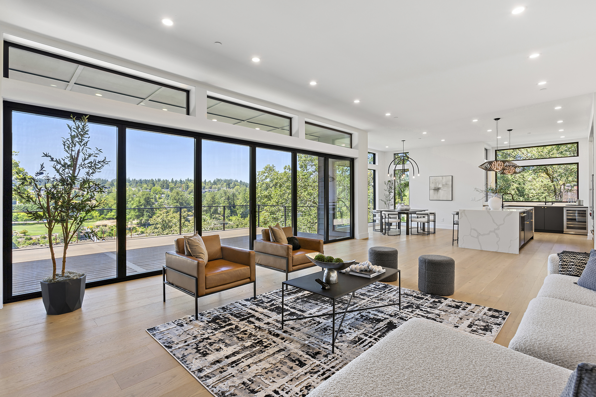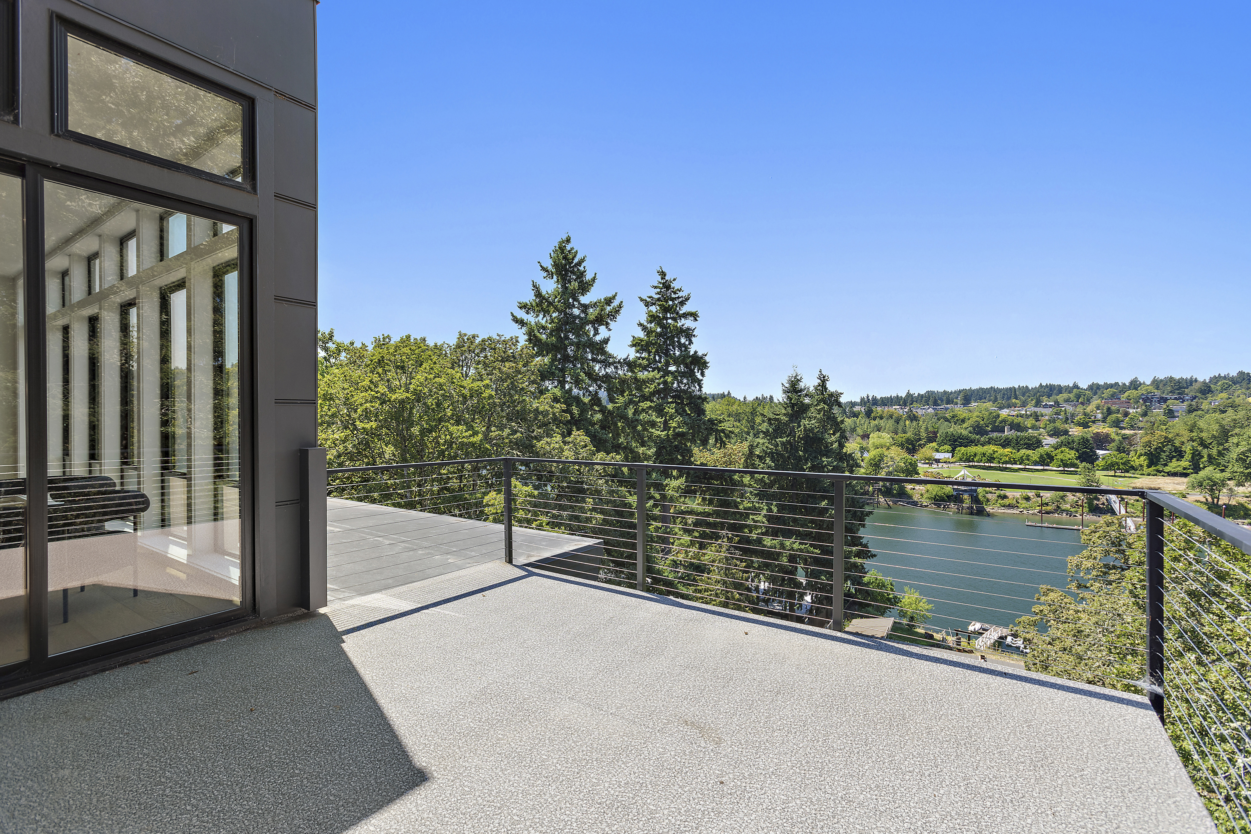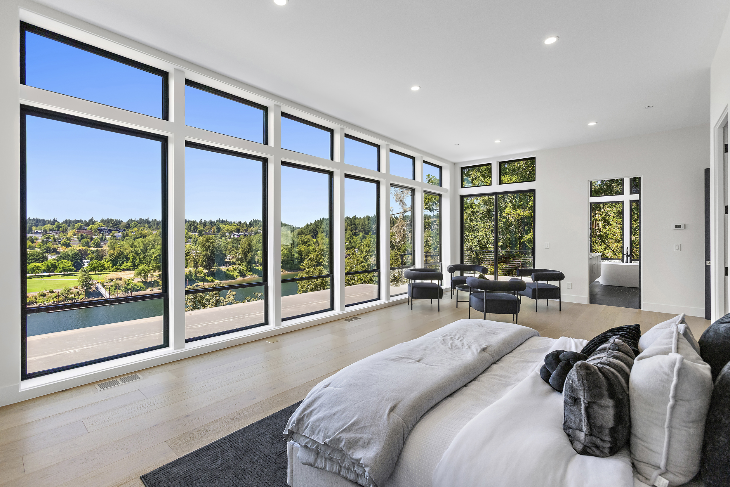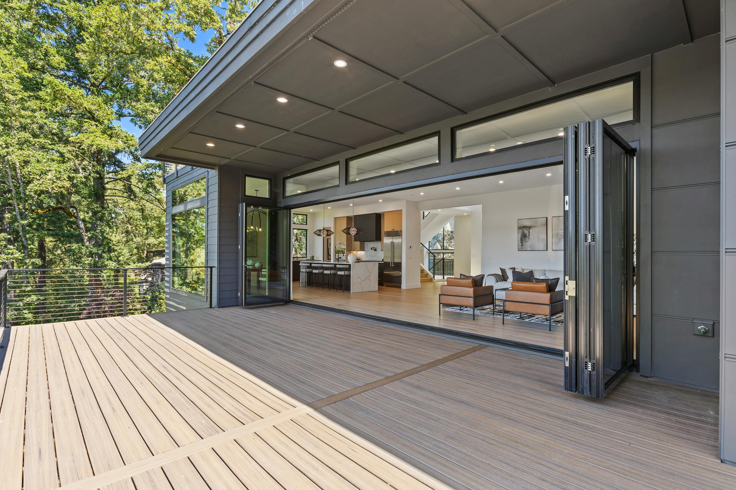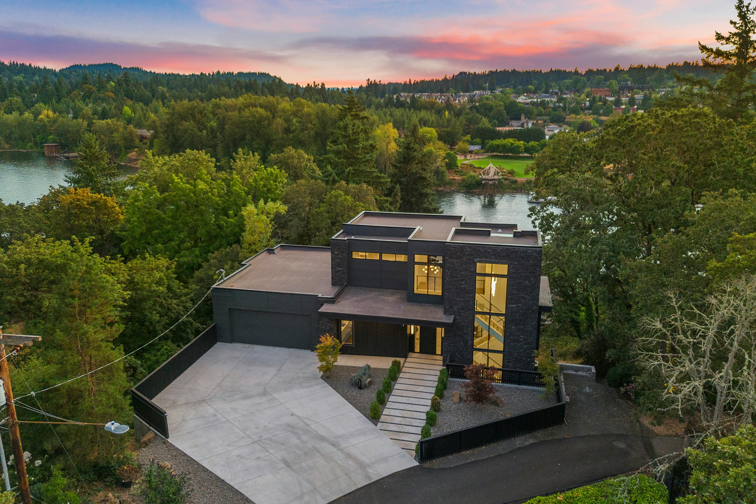 4 BEDROOM, 3BATH (+ PARTIAL), 3 LEVEL MODERN HOME. 5477sqf home with a 2 giant pations, harmonica door. Plenty of space for film crew, this home offers elegant design, modern custom features and appliances. It also has a secret/panic room, 4 car spacious garage (with access to patio) and a huge drive way. The home features beatiful sunset views, river and prestigous Lake Oswego neighborhood. House is not furnished, does have a large white modern couch.