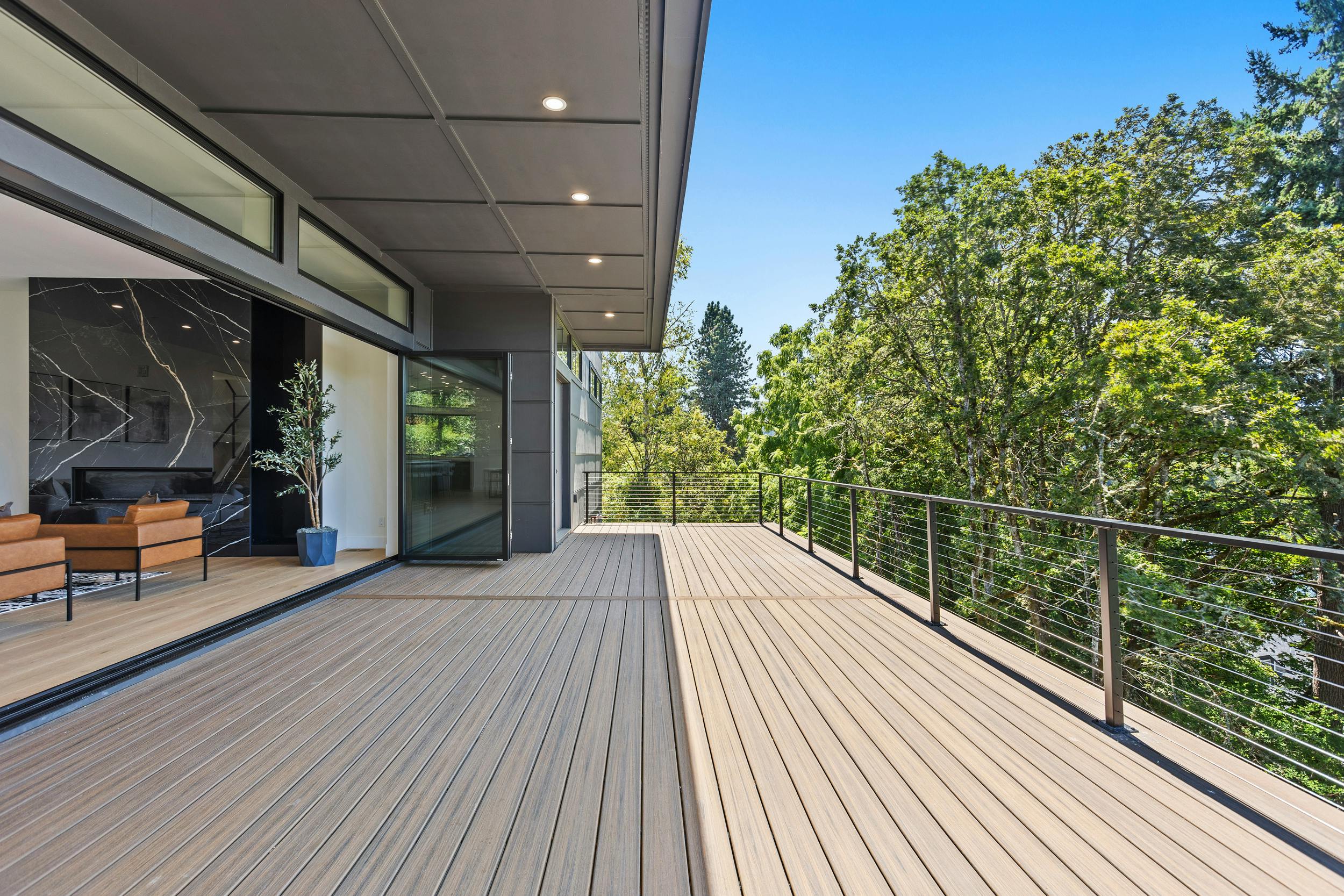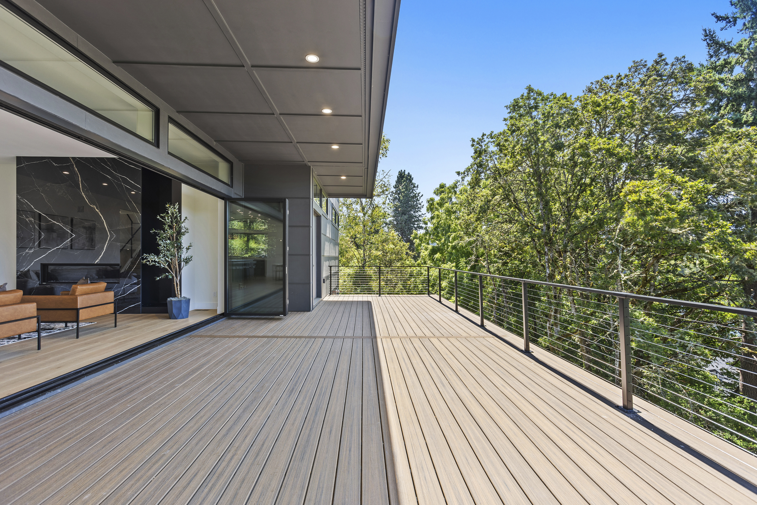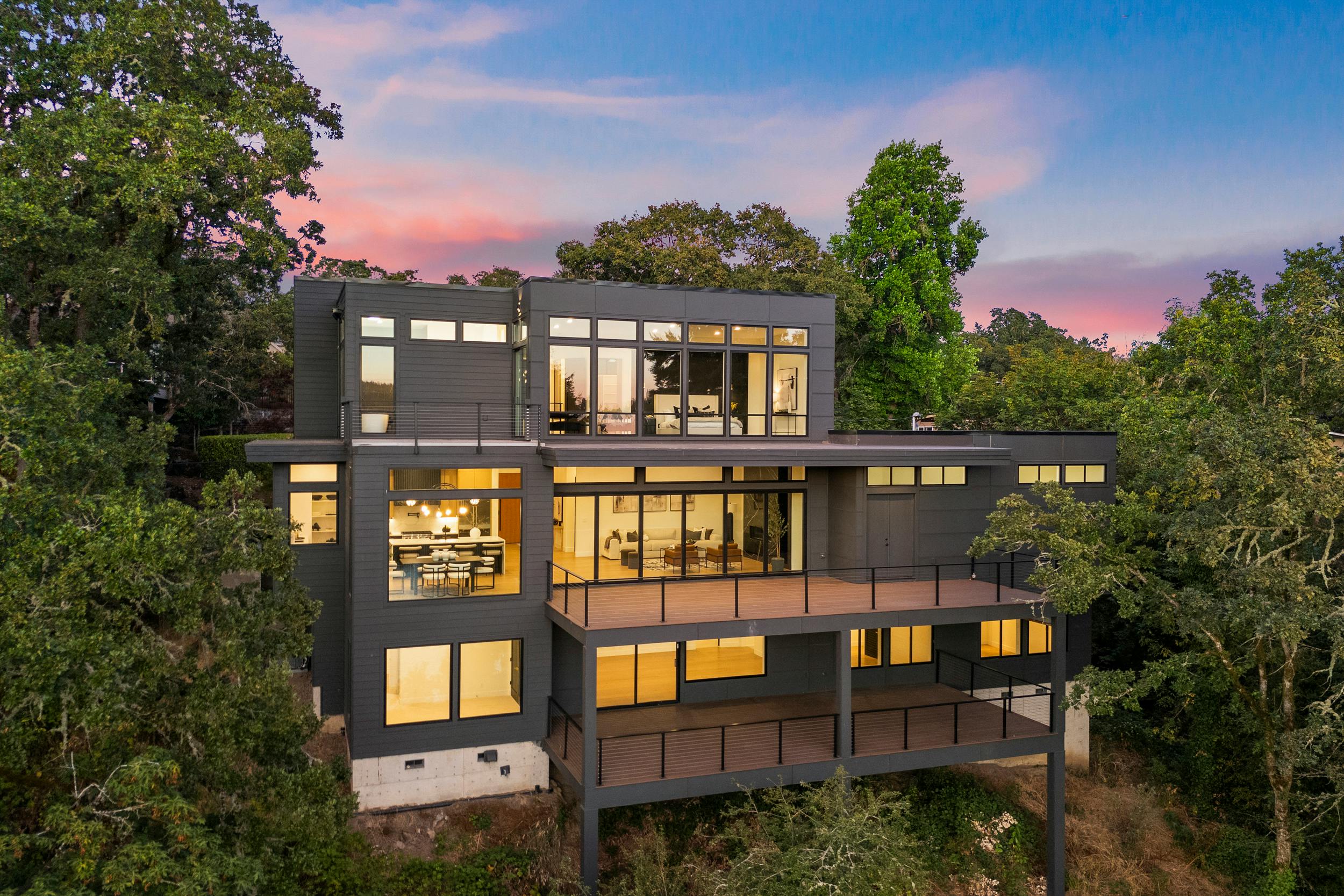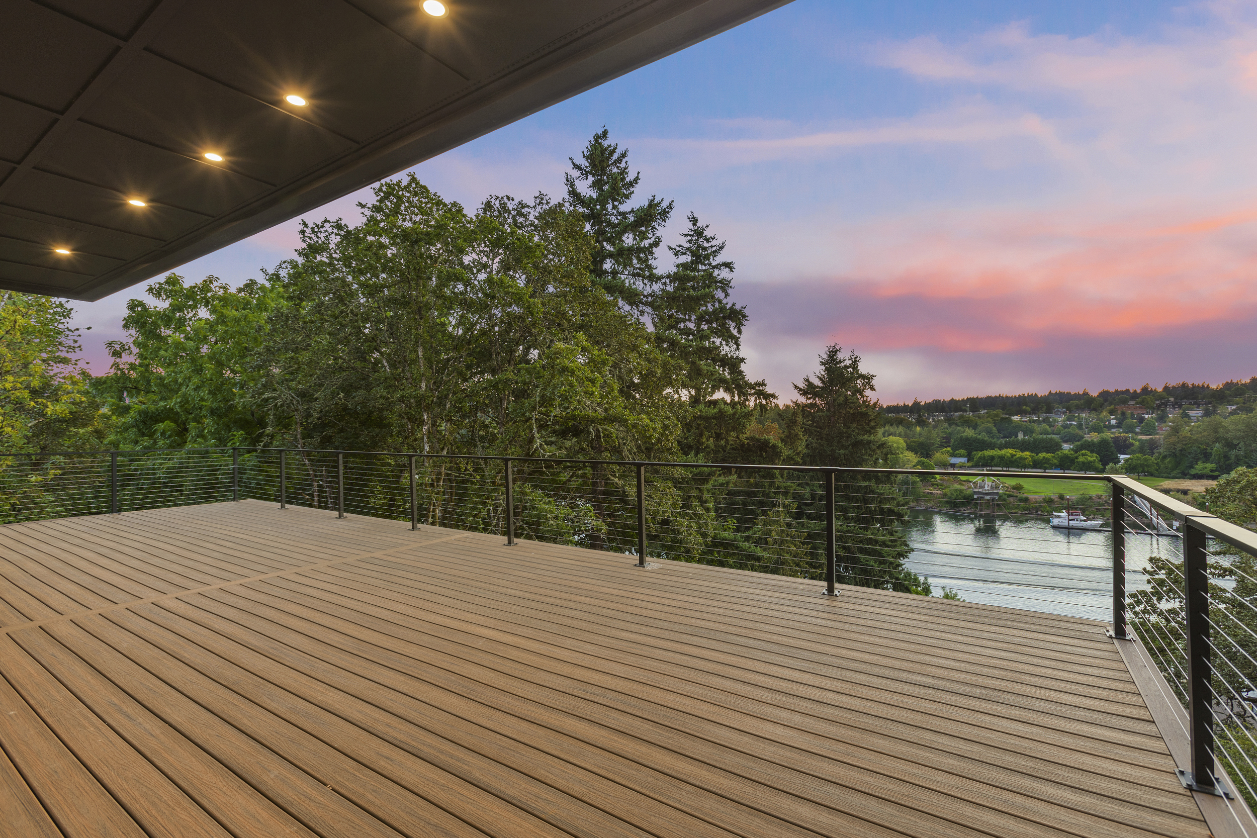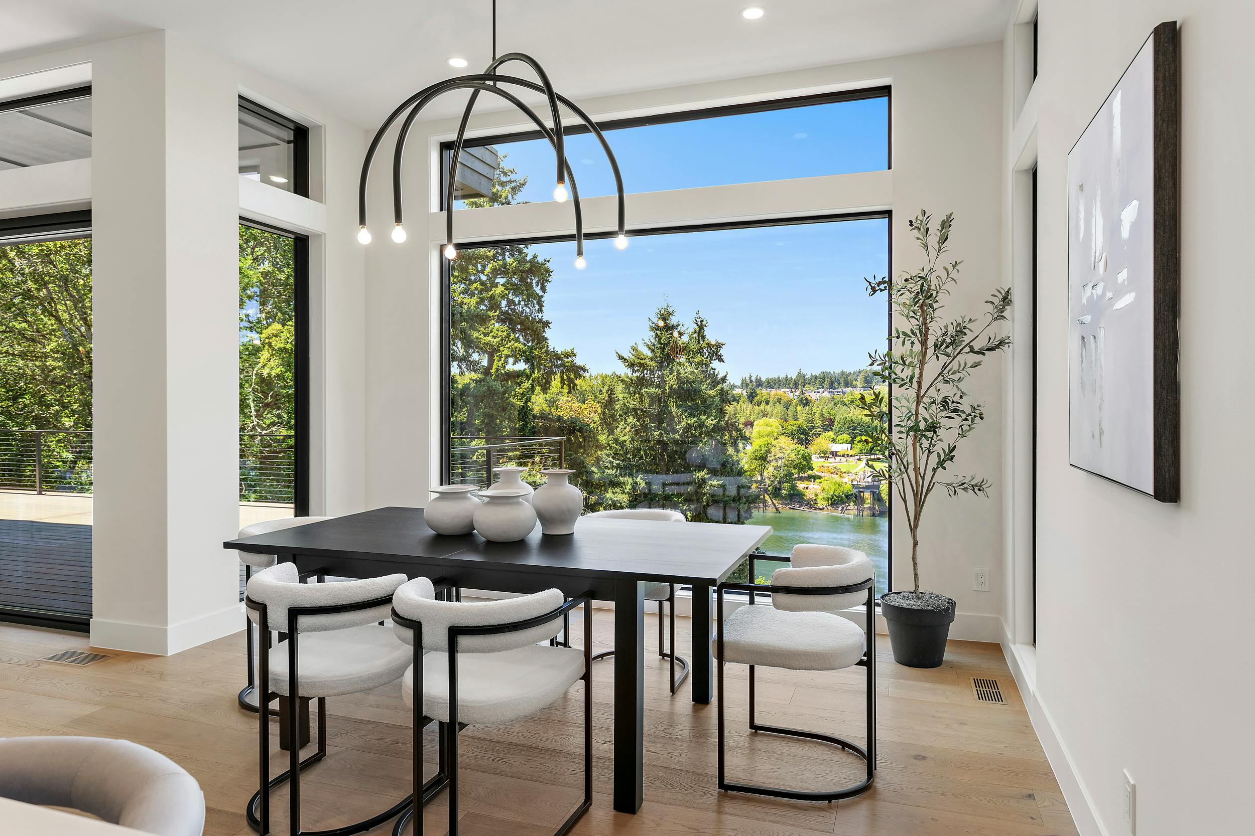 4 BEDROOM, 3BATH (+ PARTIAL), 3 LEVEL MODERN HOME. 5477sqf home with a 2 giant pations, harmonica door. Plenty of space for film crew, this home offers elegant design, modern custom features and appliances. It also has a secret/panic room, 4 car spacious garage (with access to patio) and a huge drive way. The home features beatiful sunset views, river and prestigous Lake Oswego neighborhood. House is not furnished, does have a large white modern couch.