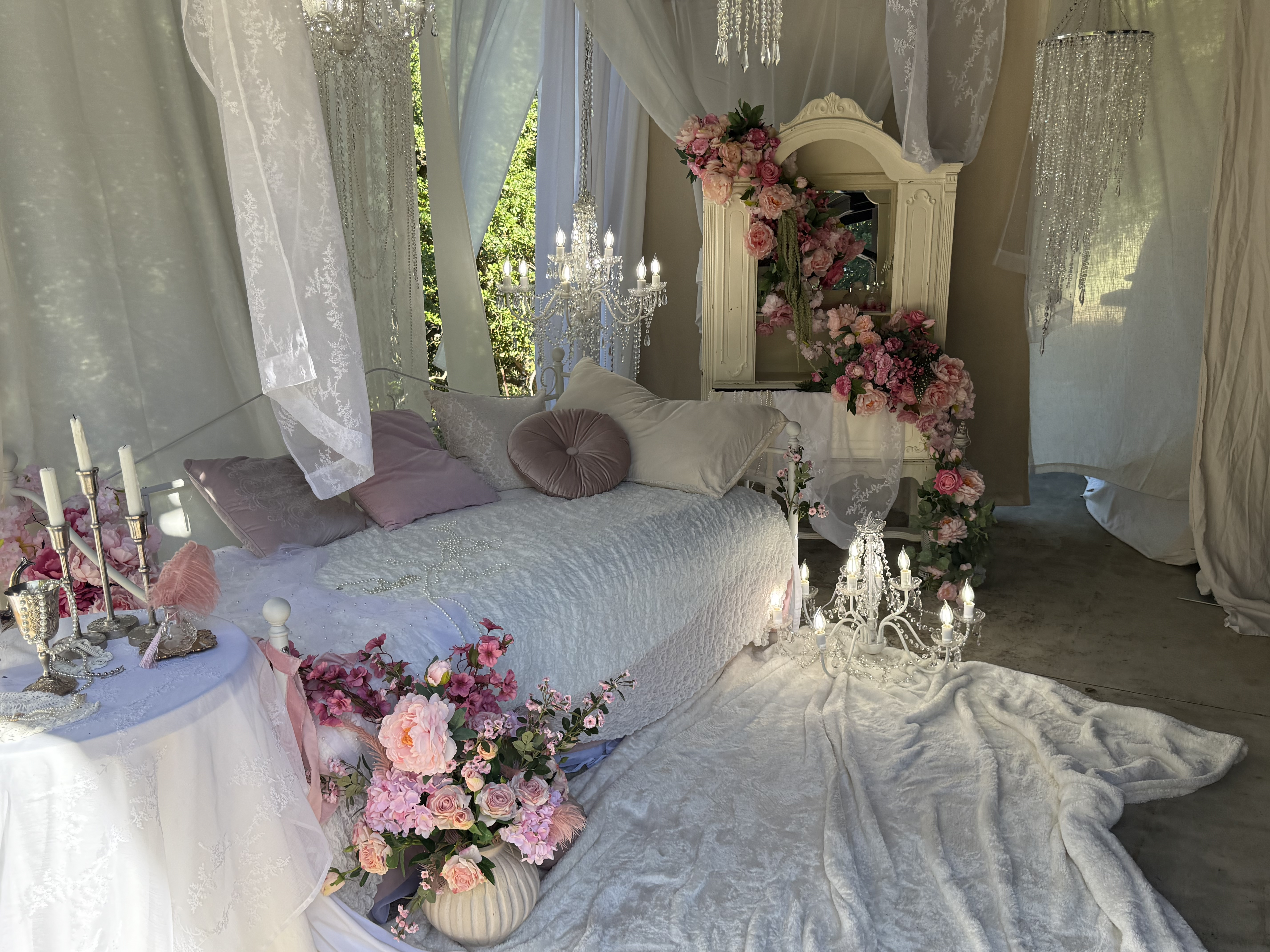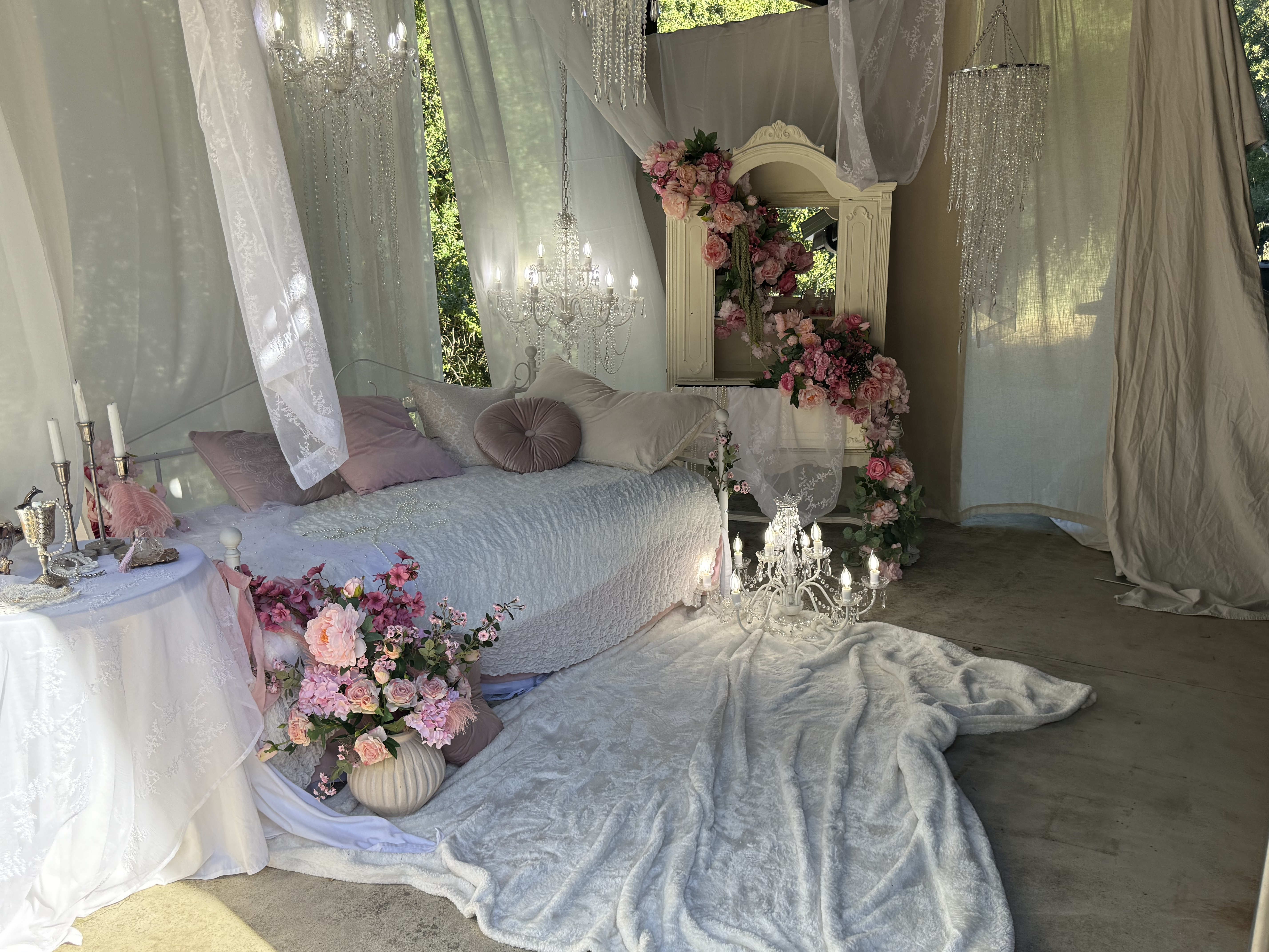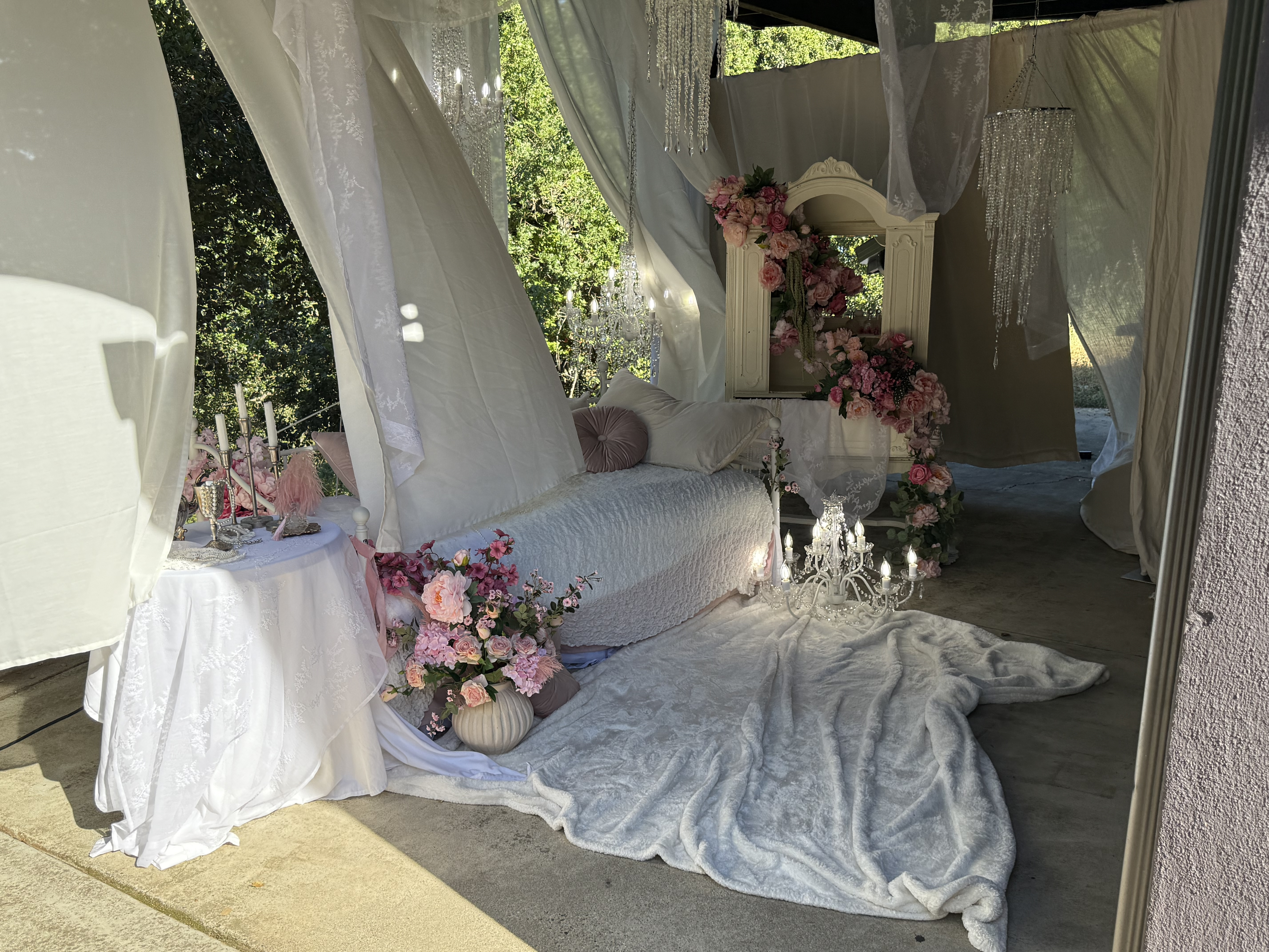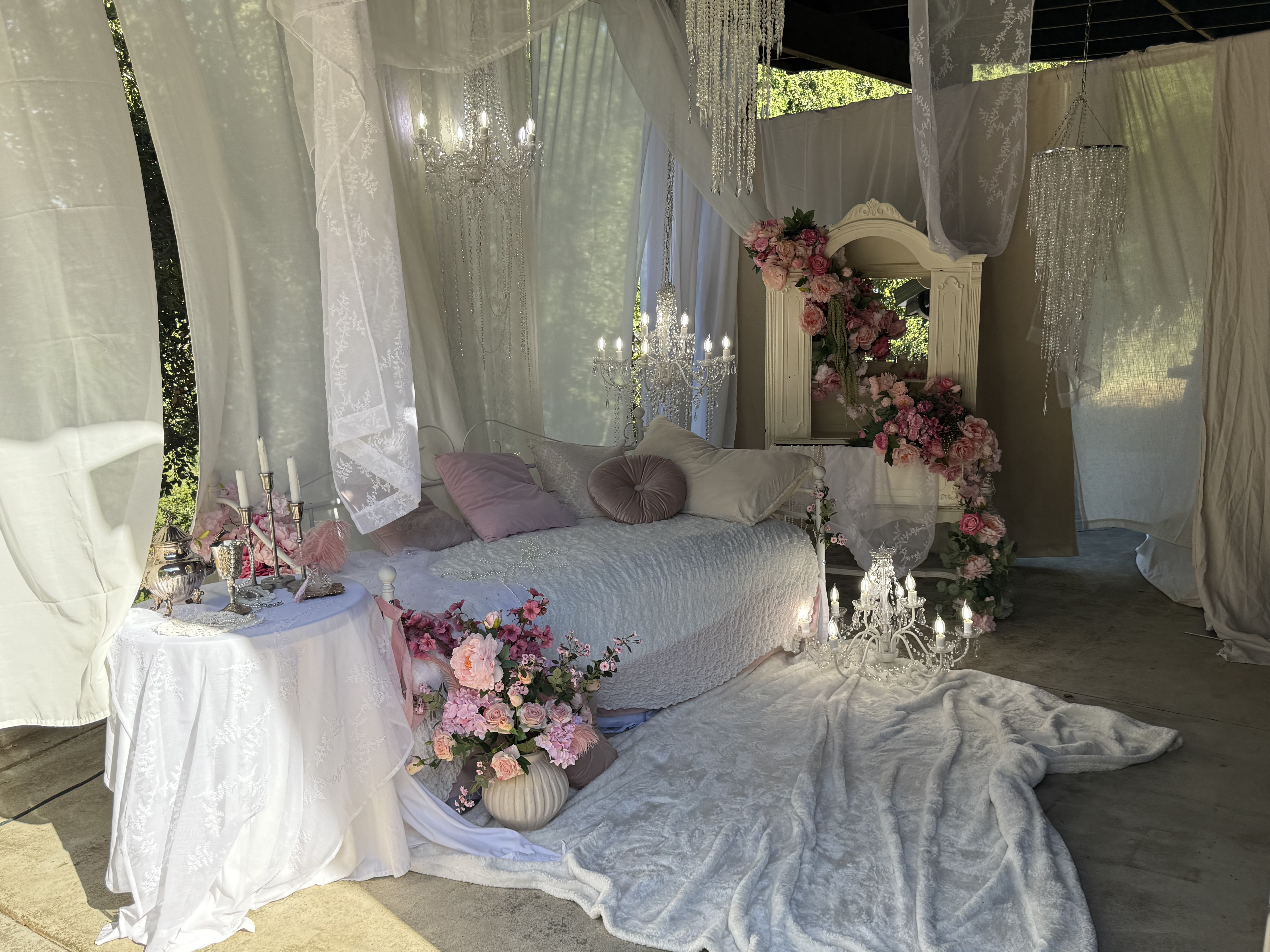 This outdoor set features sheer curtains and chandeliers, creating a feminine and romantic aesthetic. This location is great for intimate portraits, product shoots or content creation!