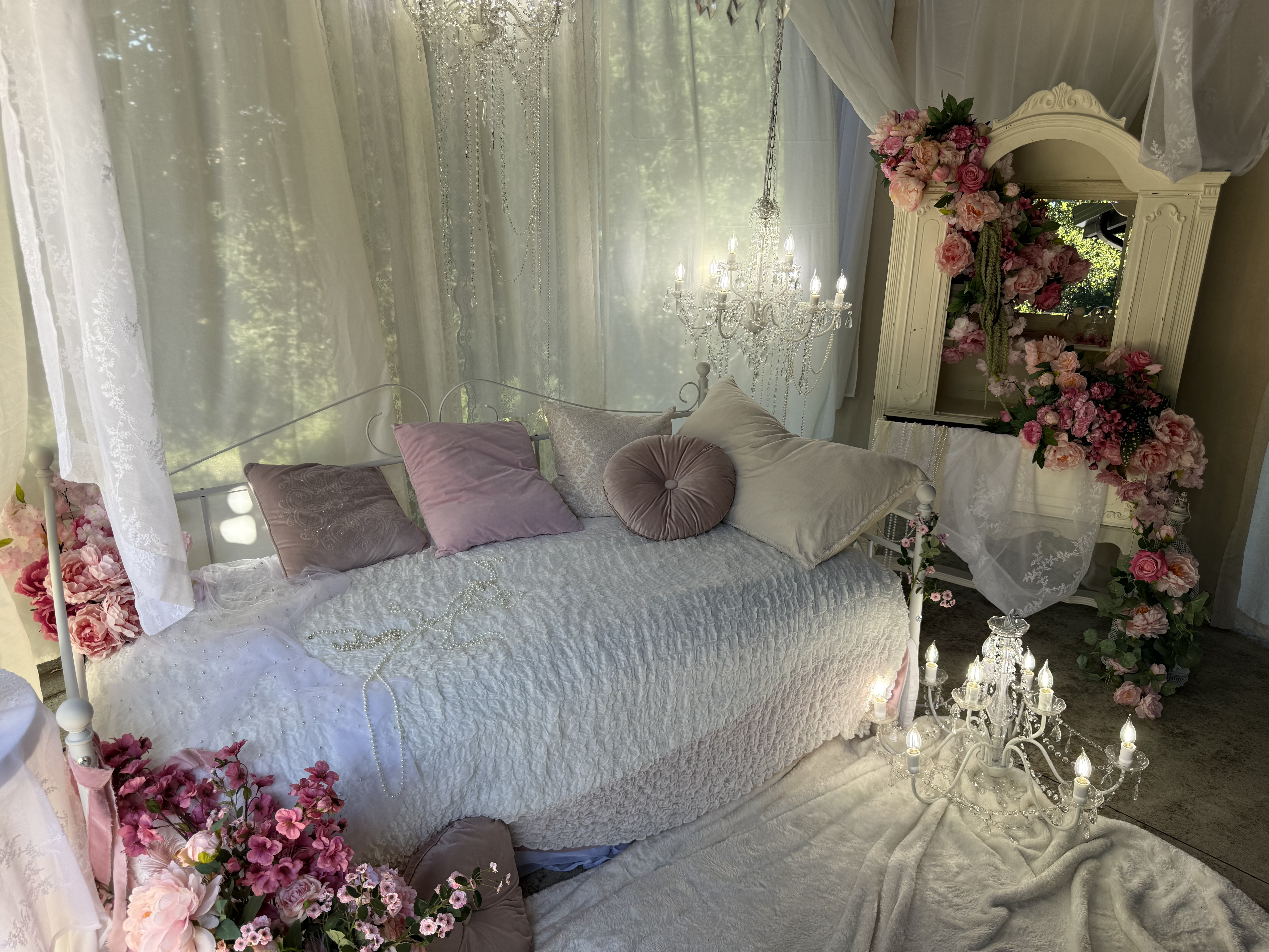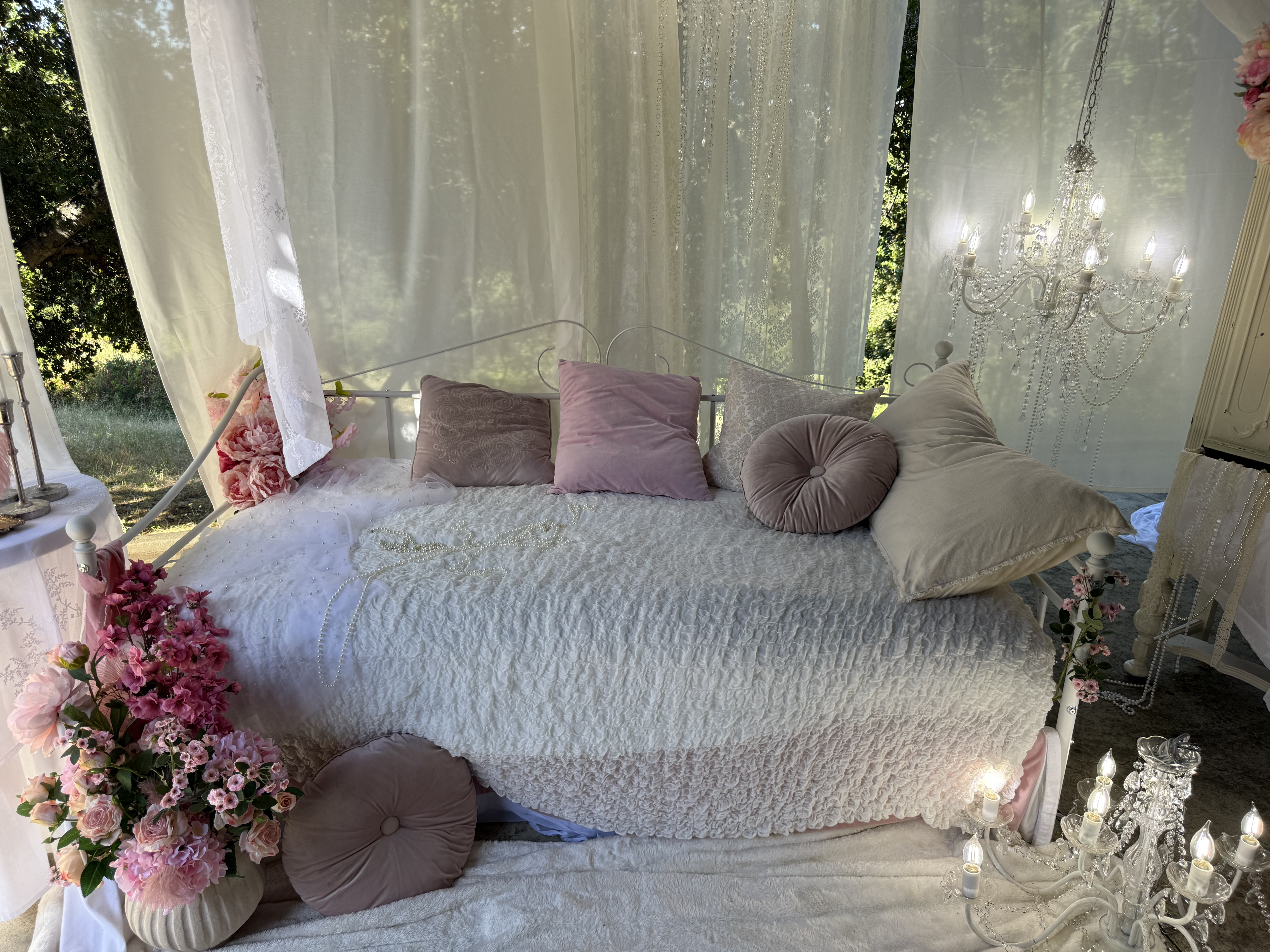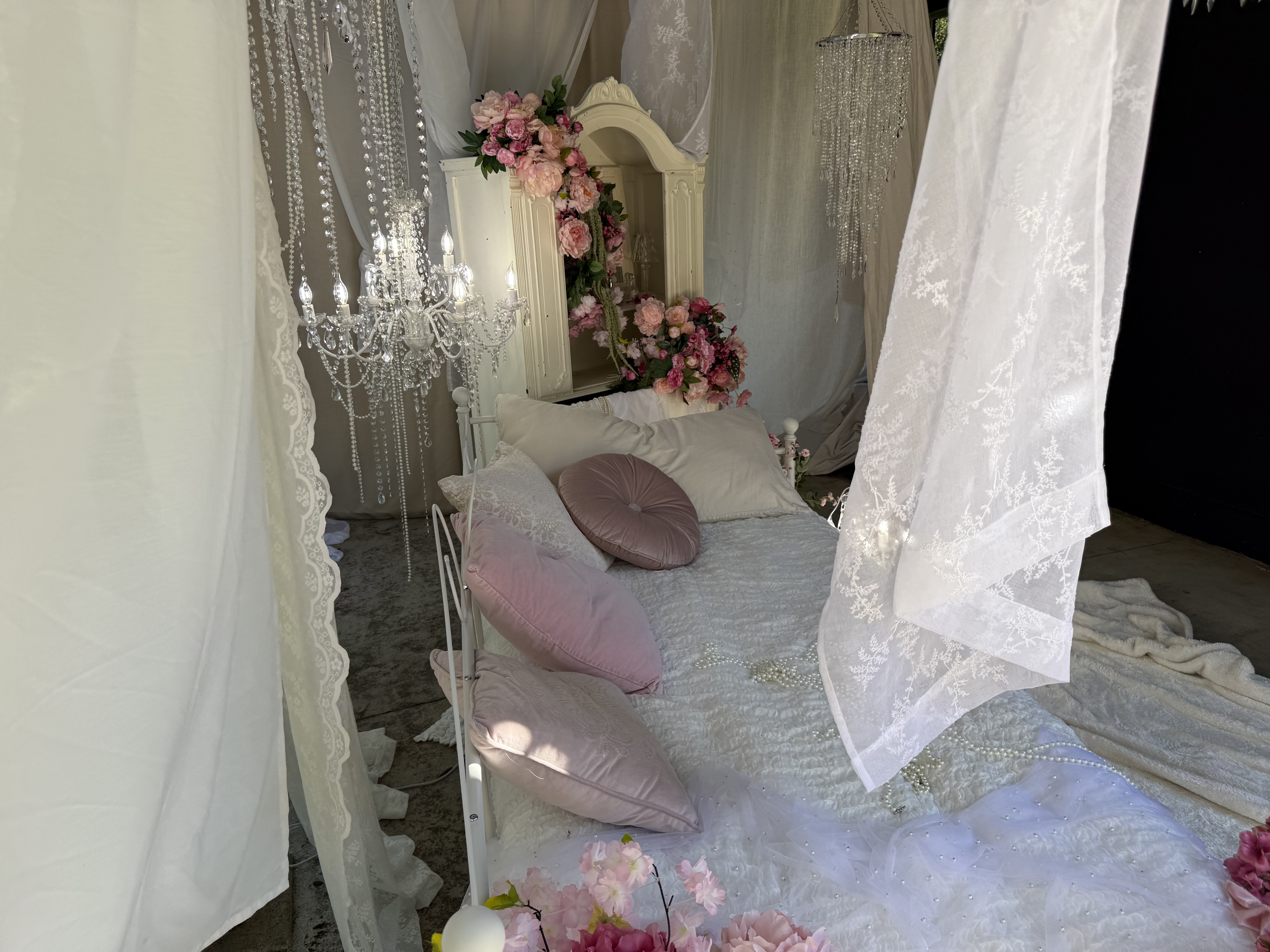 This outdoor set features sheer curtains and chandeliers, creating a feminine and romantic aesthetic. This location is great for intimate portraits, product shoots or content creation!