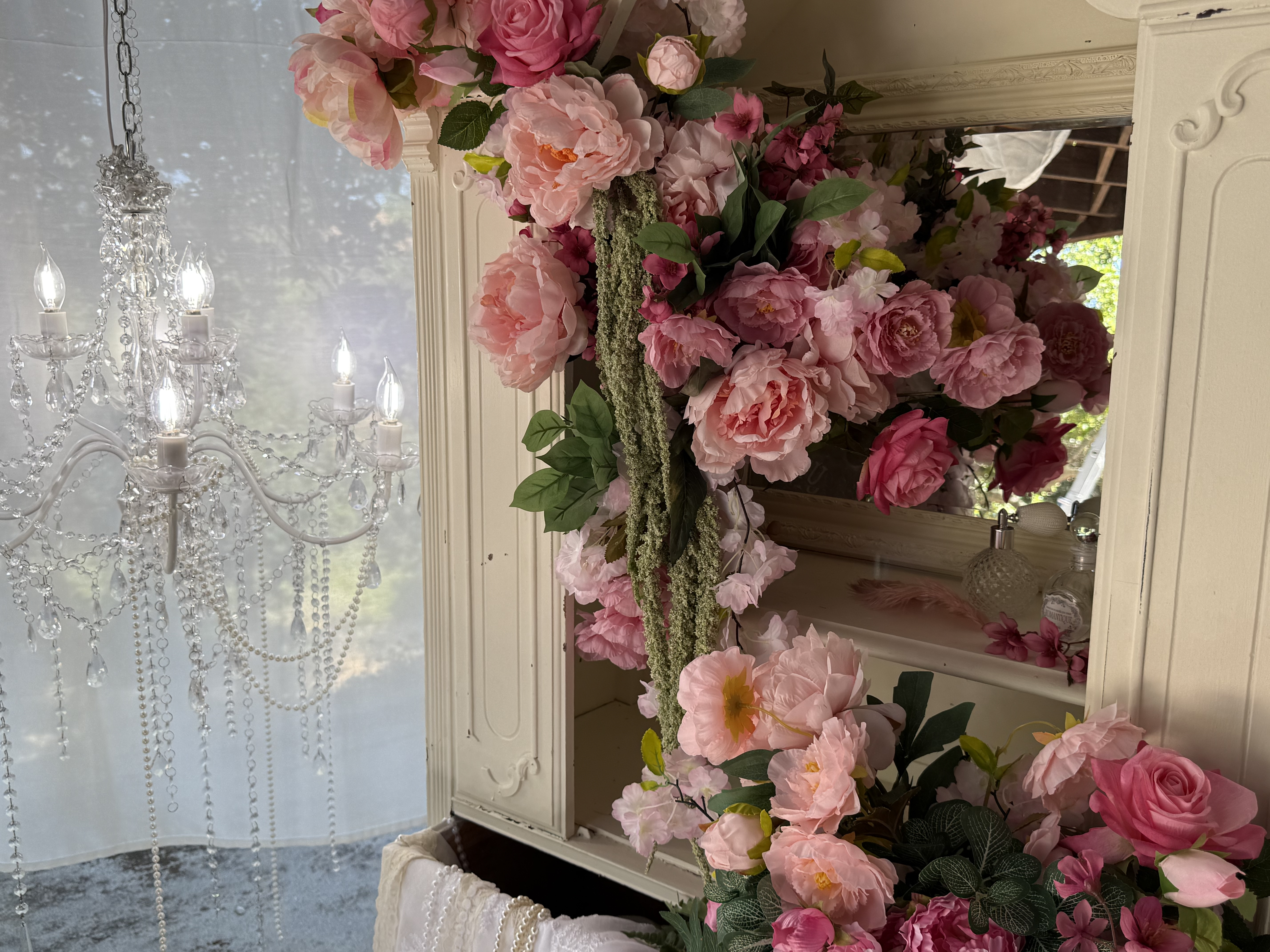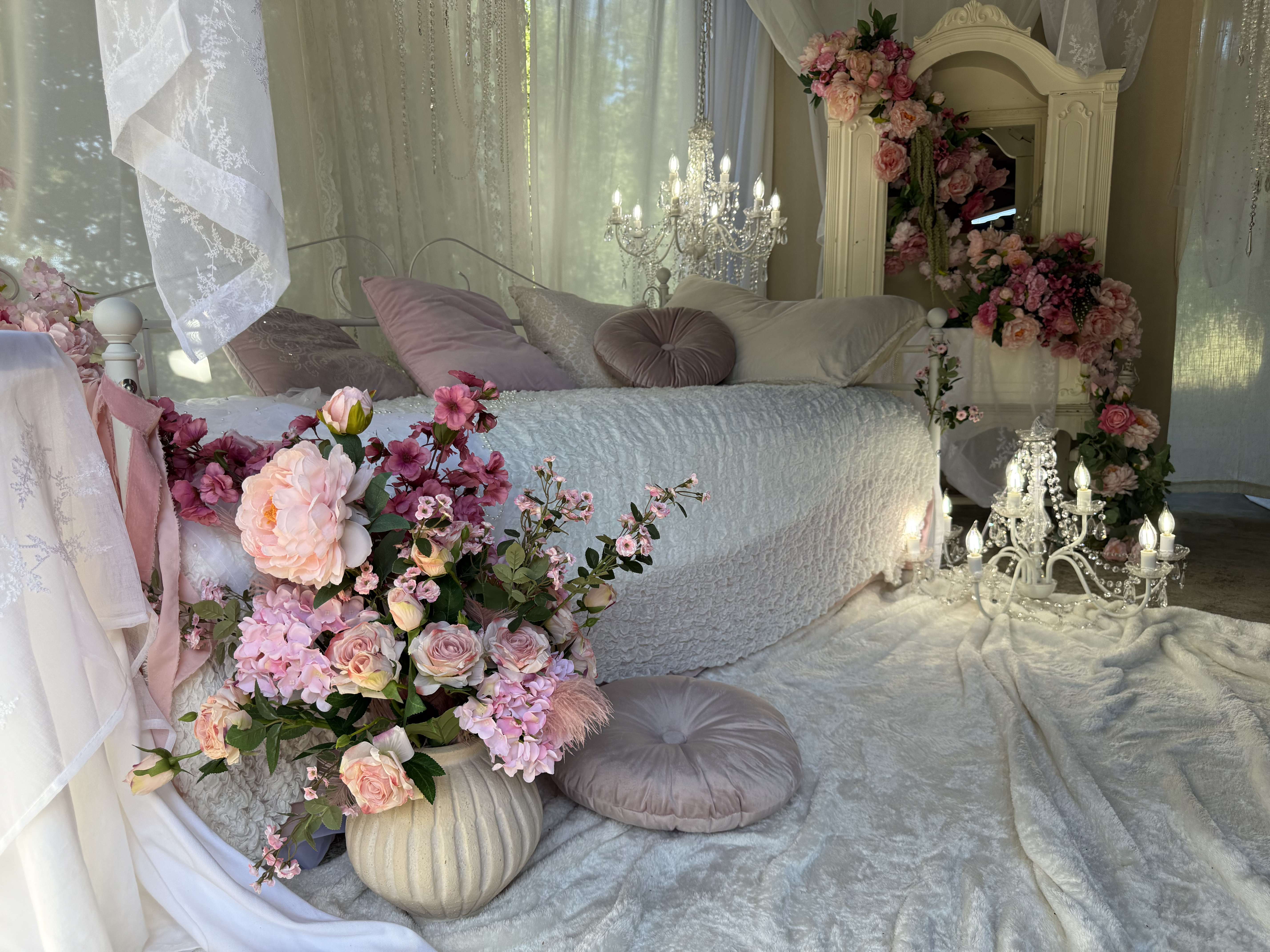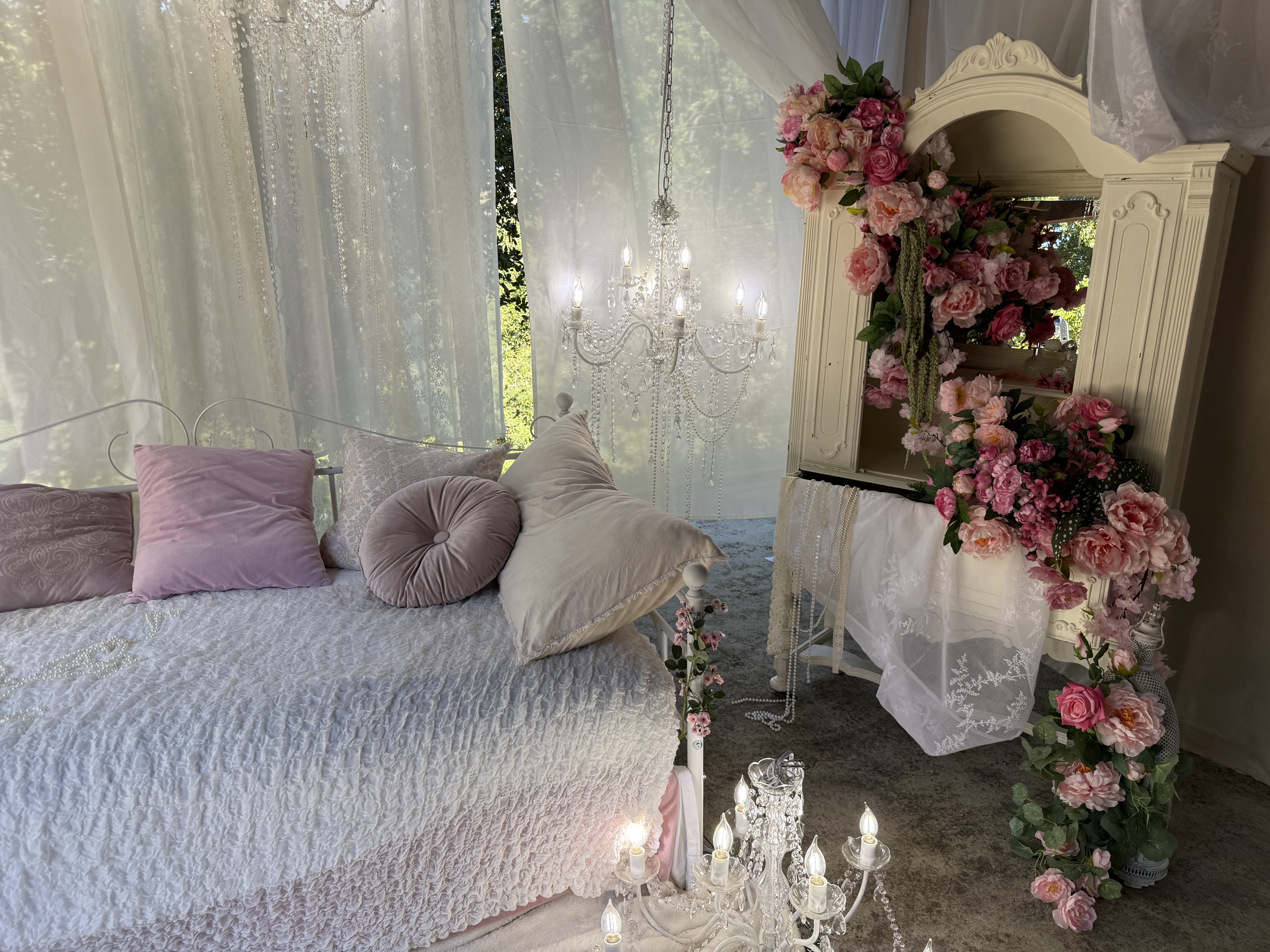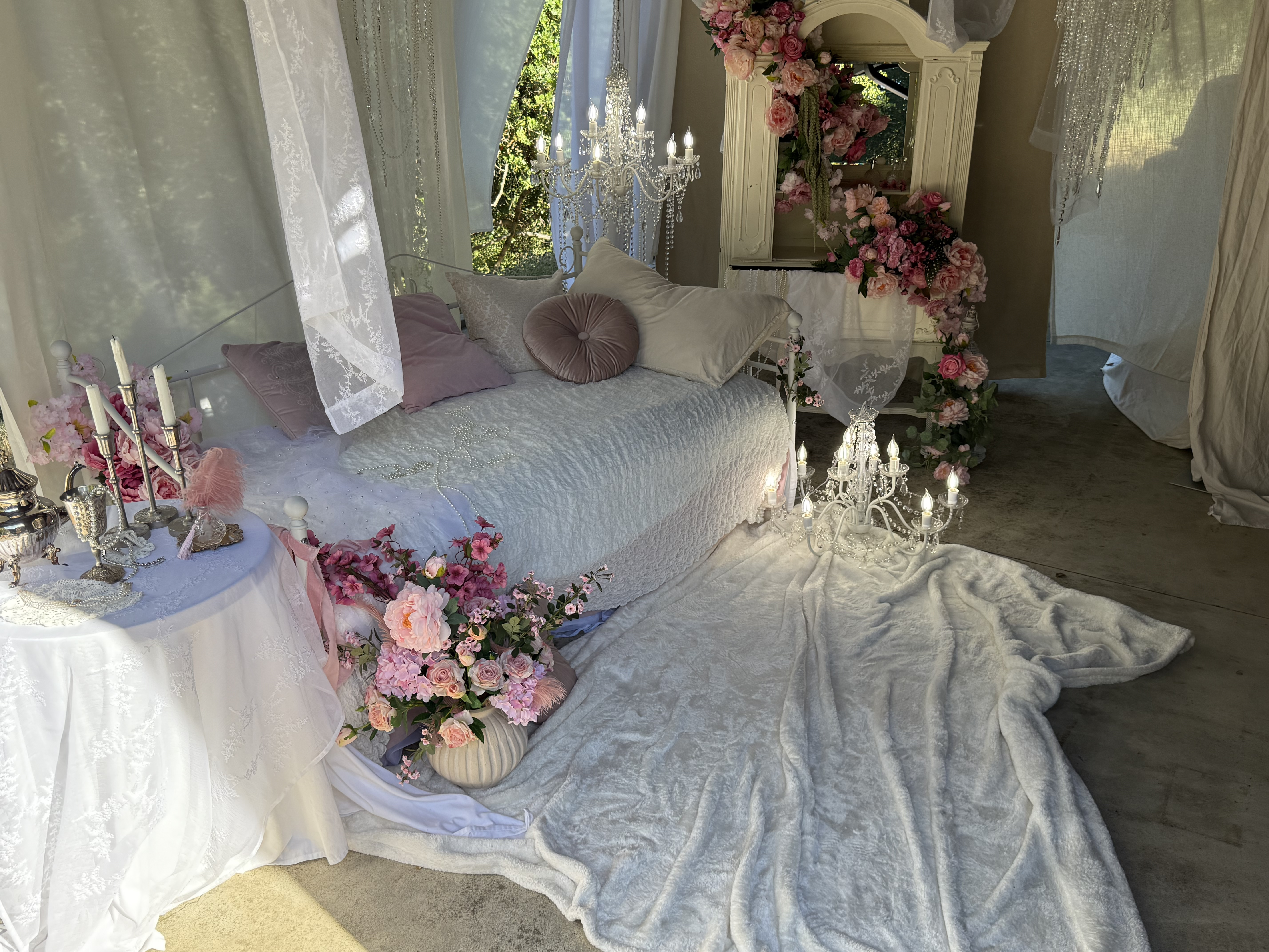 This outdoor set features sheer curtains and chandeliers, creating a feminine and romantic aesthetic. This location is great for intimate portraits, product shoots or content creation!