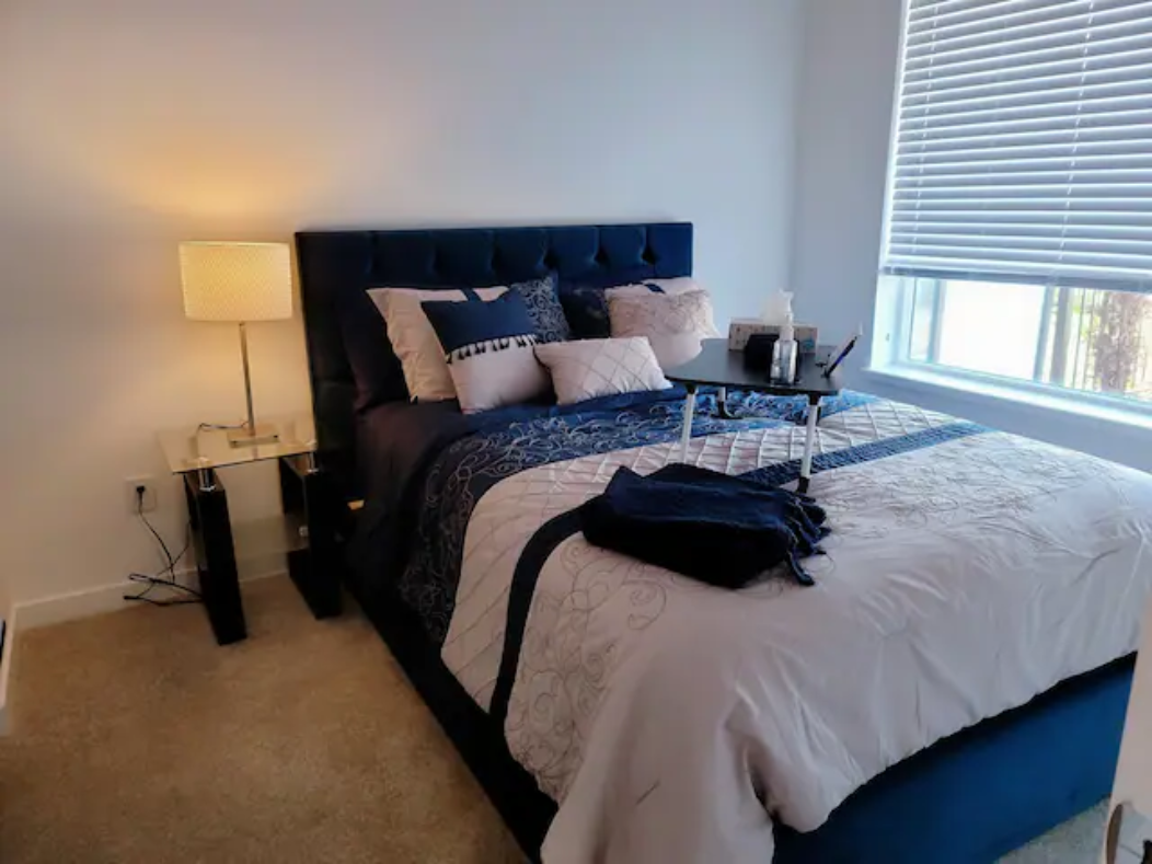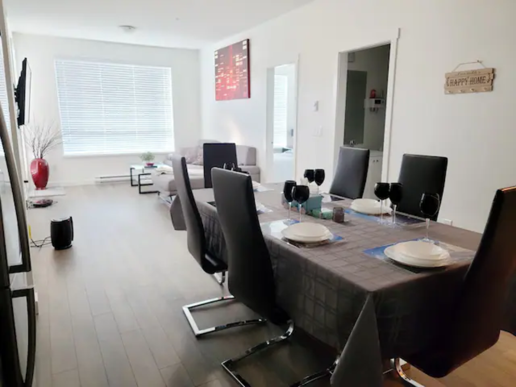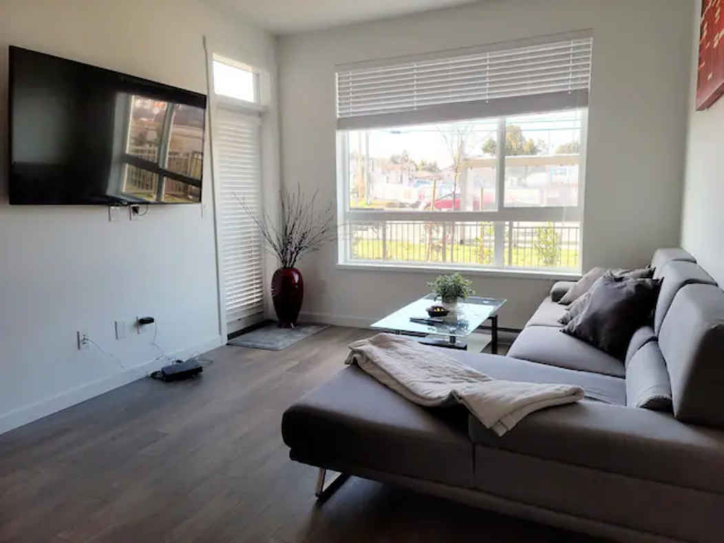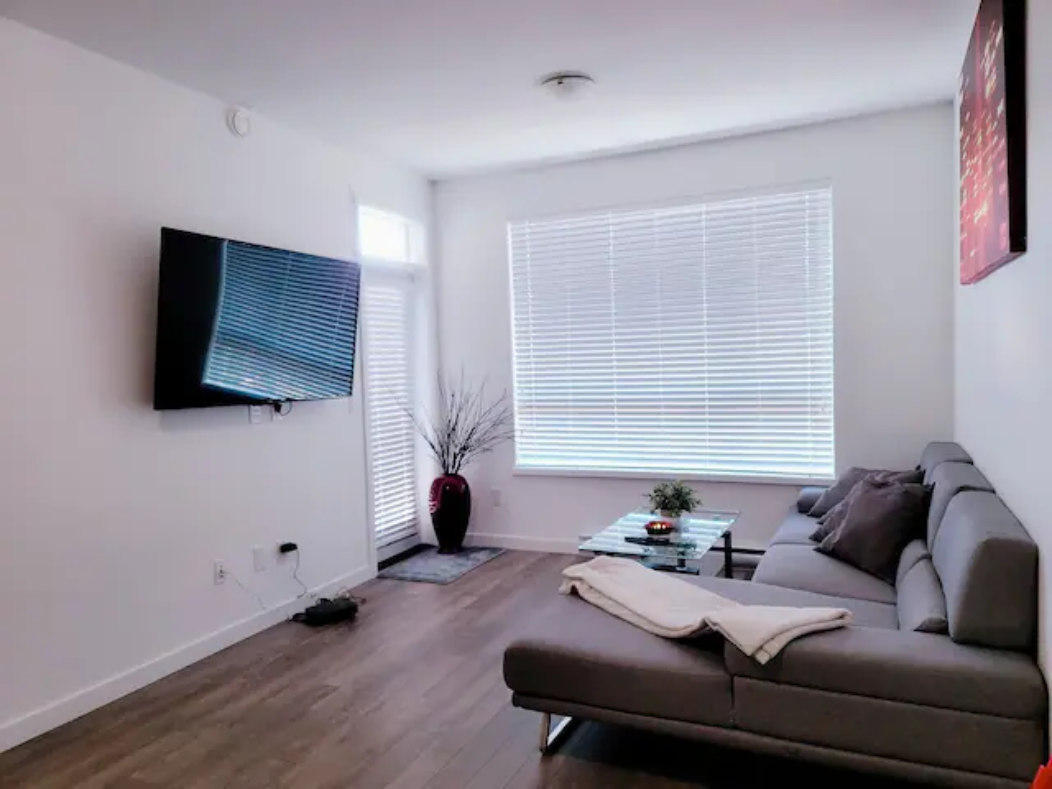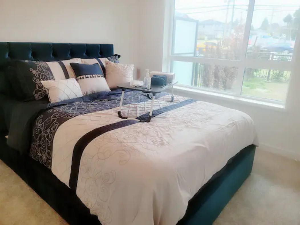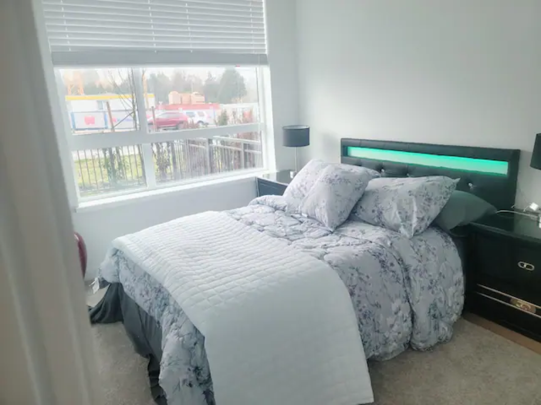 Newly build Condo (2021 December) has 2bed-2bath plus den(size of a 3rd bedroom) on 1st floor with a private patio followed by a garden which can also be used as a 2nd entrance to enter the suite. Right outside the backyard is a bus stop at 10 sec walk. The suite has 1 common washroom and 1 in-suite washroom with 2 sinks, stand-in showe and a hot tub. In Suite-laundry and fully furnished. 1 room has queen size bed and other room as double bed