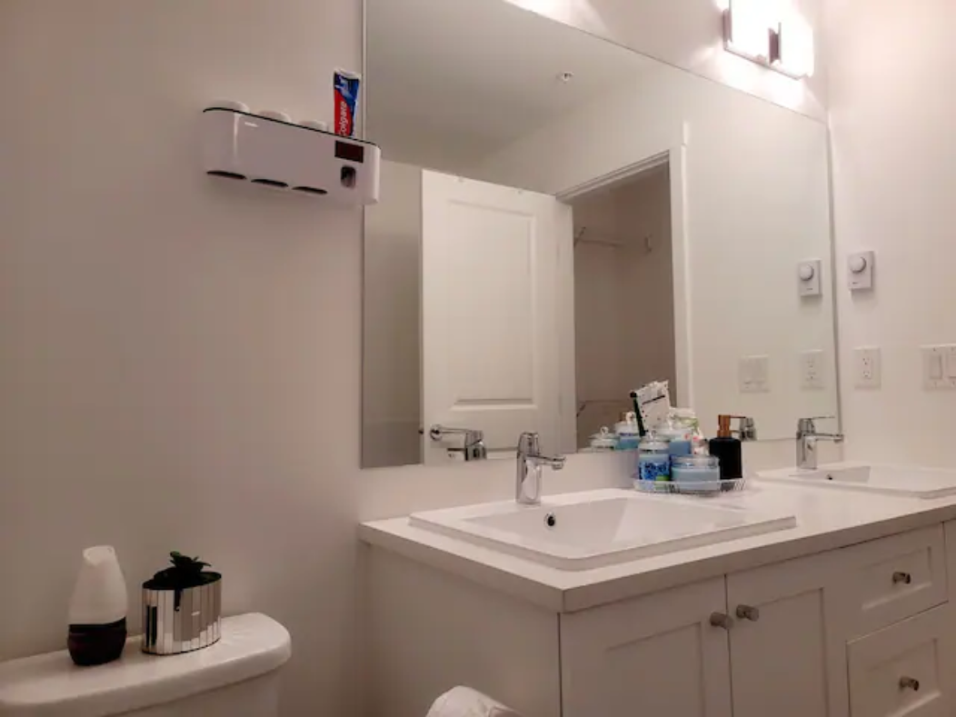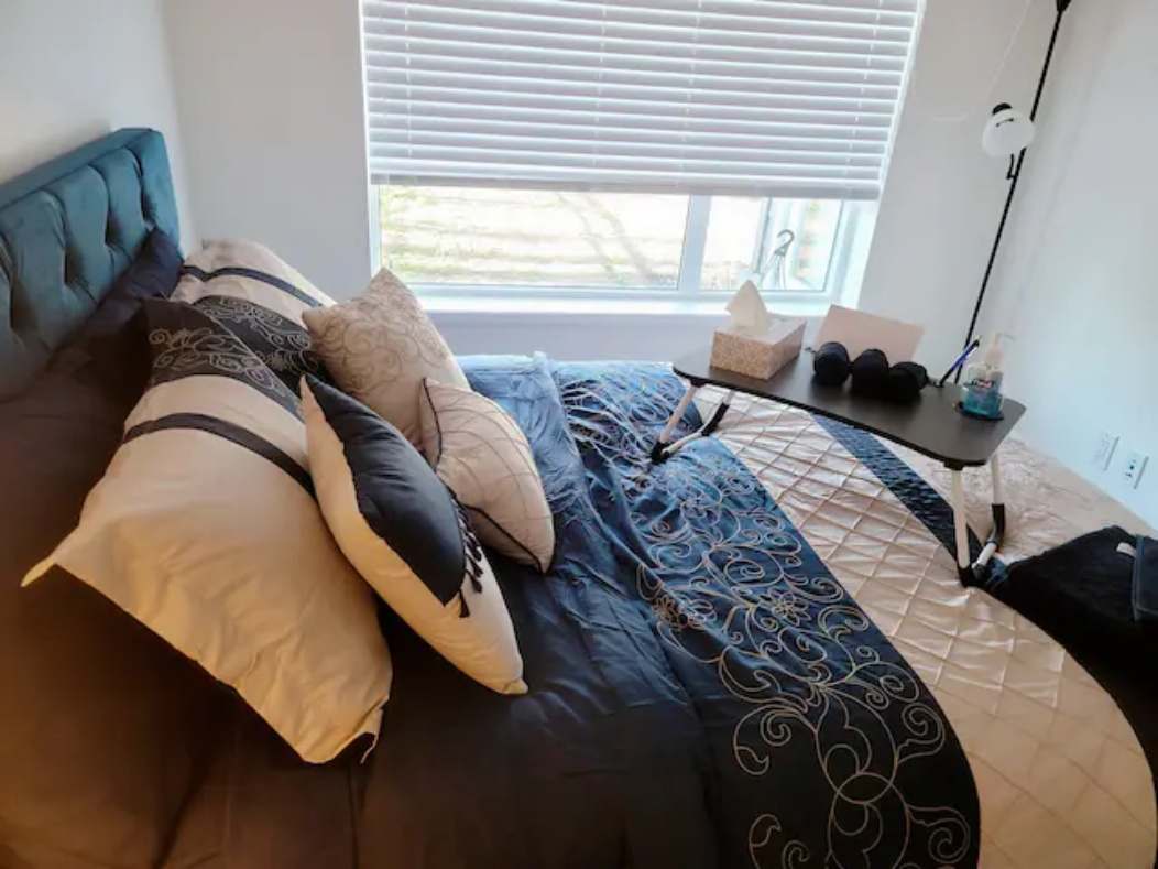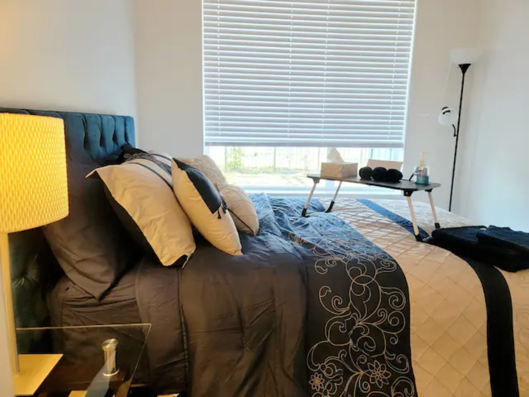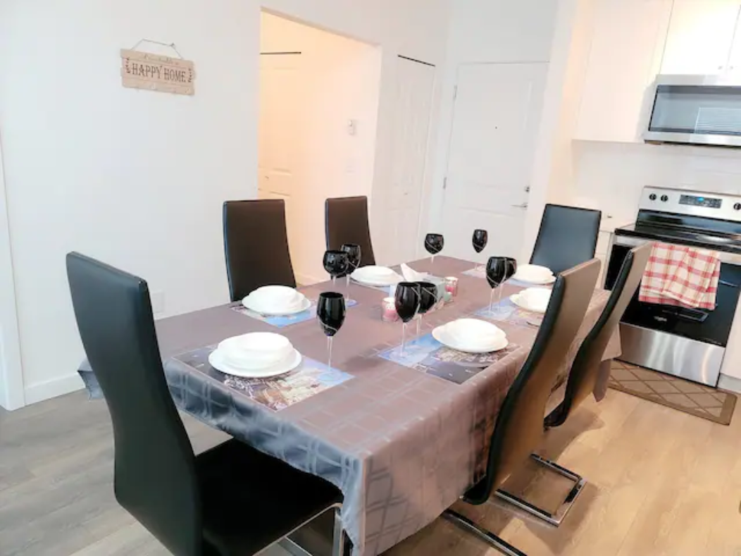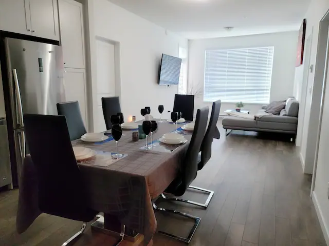 Newly build Condo (2021 December) has 2bed-2bath plus den(size of a 3rd bedroom) on 1st floor with a private patio followed by a garden which can also be used as a 2nd entrance to enter the suite. Right outside the backyard is a bus stop at 10 sec walk. The suite has 1 common washroom and 1 in-suite washroom with 2 sinks, stand-in showe and a hot tub. In Suite-laundry and fully furnished. 1 room has queen size bed and other room as double bed